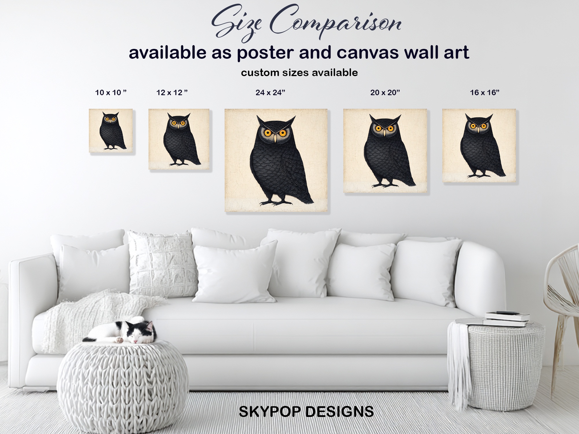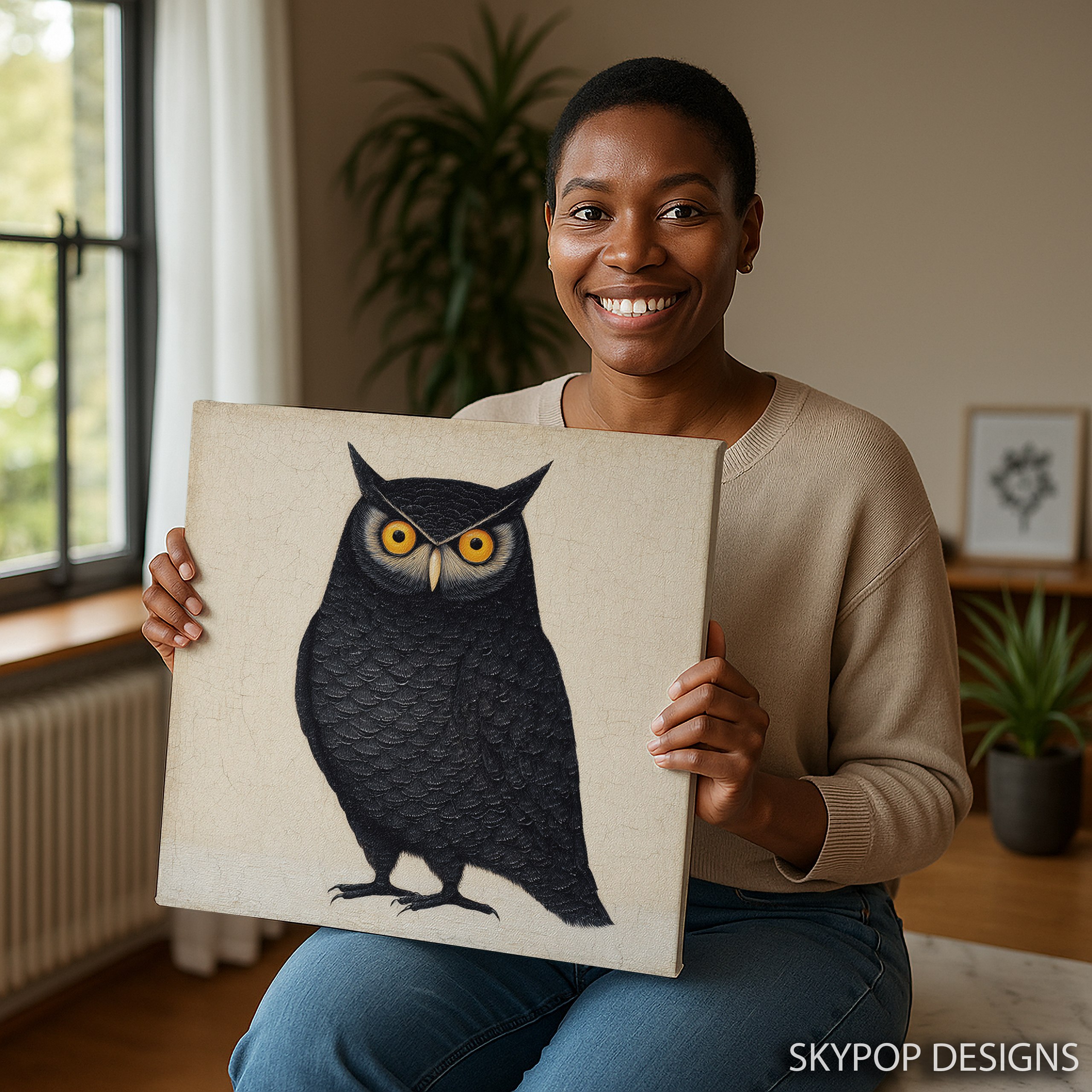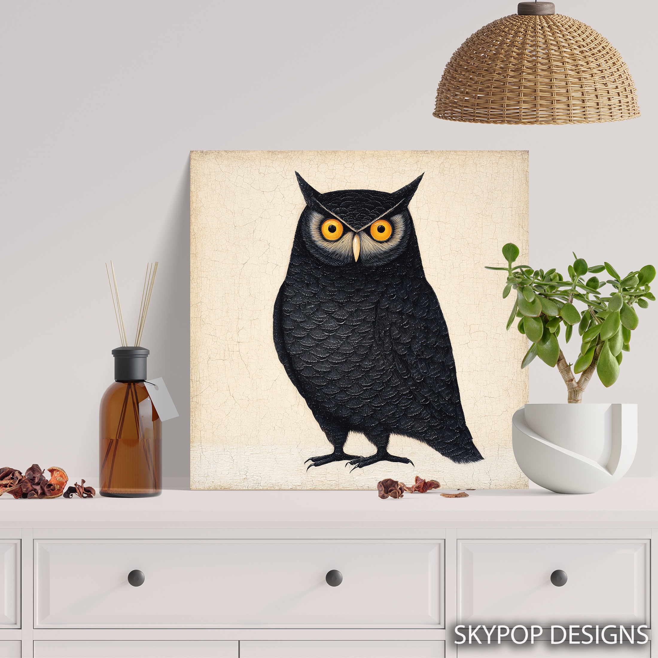 Elevate your space with this striking black owl canvas wall art, perfect for nature enthusiasts and modern decor lovers alike. This captivating poster features a majestic owl with piercing yellow eyes that demand attention and create an instant focal point in any room. The stark contrast between the owl’s jet-black feathers and its vibrant eyes makes this piece pop, ideal for contemporary living rooms or sleek office spaces. Transform your walls with this powerful yet elegant bird artwork that symbolizes wisdom and mystery. The minimalist design allows for versatile placement, complementing various decor styles from modern to rustic. This owl wall art serves as a perfect conversation starter, whether displayed in a cozy reading nook or as a statement piece in your bedroom. The high-quality canvas print ensures every intricate feather detail is captured, adding depth and texture to your walls. Great as a thoughtful housewarming gift or to refresh your own space, this owl poster adapts beautifully to different room sizes and color schemes. The neutral palette with a pop of yellow makes it easy to incorporate into existing decor while adding a touch of the wild to your urban jungle. Bring the allure of nighttime forest creatures into your home with this stunning owl canvas. Enhance your wall art collection today with this mesmerizing piece that blends nature’s beauty with contemporary design.
