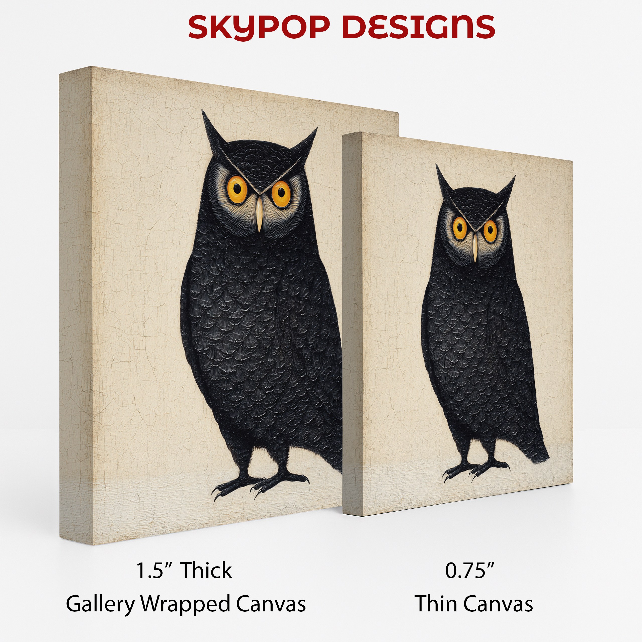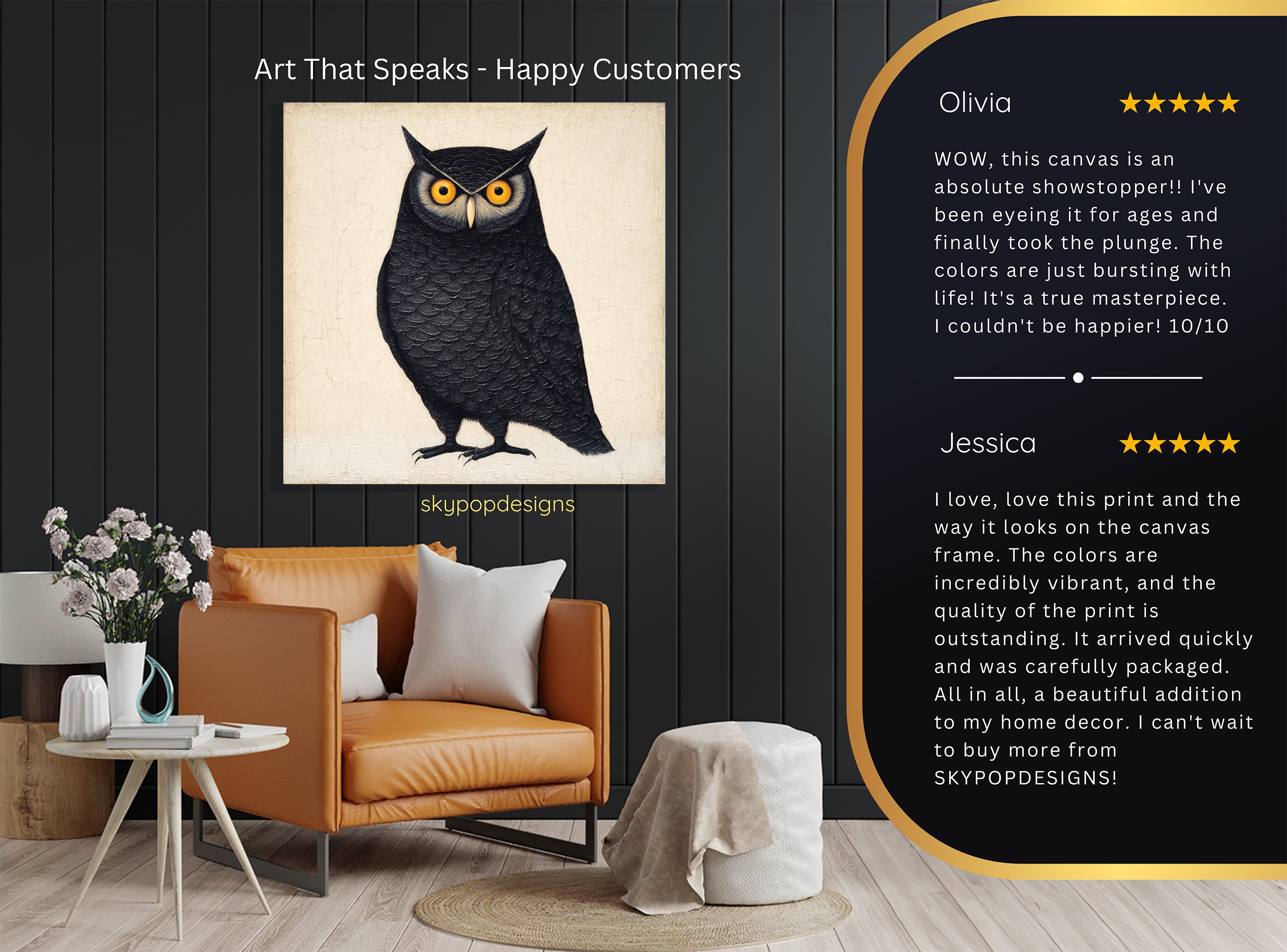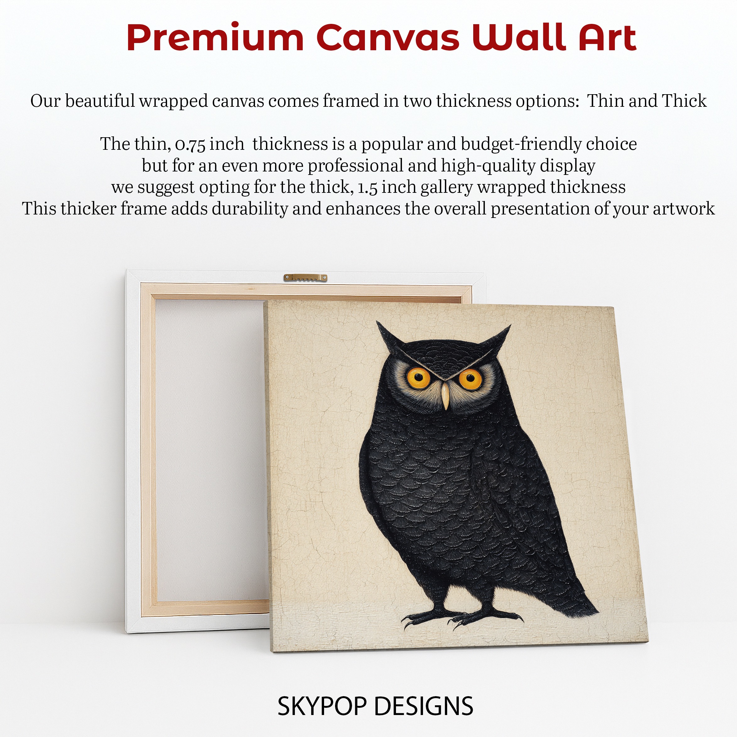 Elevate your space with this striking black owl canvas wall art, perfect for nature enthusiasts and modern decor lovers alike. This captivating poster features a majestic owl with piercing yellow eyes that demand attention and create an instant focal point in any room. The stark contrast between the owl’s jet-black feathers and its vibrant eyes makes this piece pop, ideal for contemporary living rooms or sleek office spaces. Transform your walls with this powerful yet elegant bird artwork that symbolizes wisdom and mystery. The minimalist design allows for versatile placement, complementing various decor styles from modern to rustic. This owl wall art serves as a perfect conversation starter, whether displayed in a cozy reading nook or as a statement piece in your bedroom. The high-quality canvas print ensures every intricate feather detail is captured, adding depth and texture to your walls. Great as a thoughtful housewarming gift or to refresh your own space, this owl poster adapts beautifully to different room sizes and color schemes. The neutral palette with a pop of yellow makes it easy to incorporate into existing decor while adding a touch of the wild to your urban jungle. Bring the allure of nighttime forest creatures into your home with this stunning owl canvas. Enhance your wall art collection today with this mesmerizing piece that blends nature’s beauty with contemporary design.