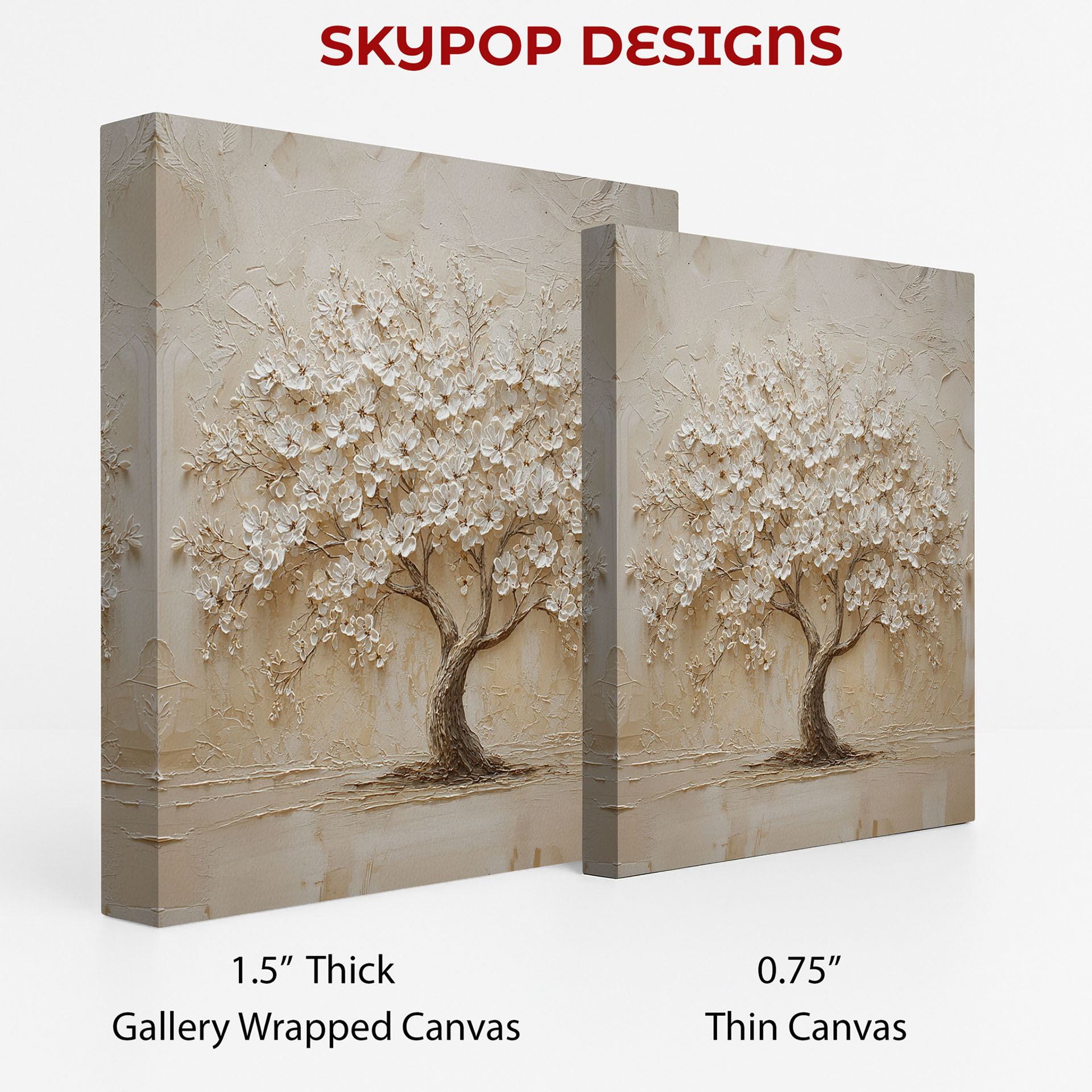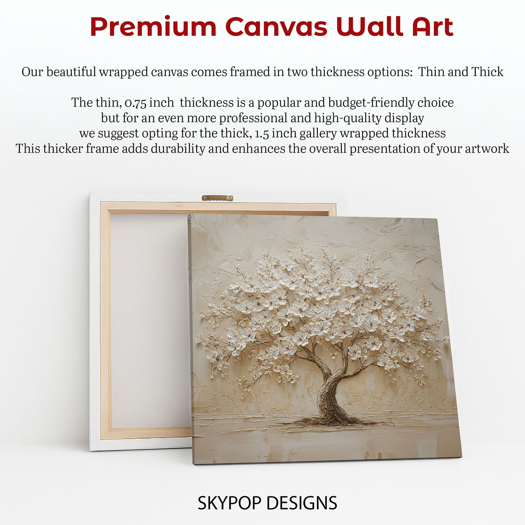 Elevate your home with this stunning textured blossom tree canvas wall art, a captivating piece that brings natural elegance into your space. This poster or canvas wall art features a thick impasto technique, creating a striking three-dimensional effect of delicate white blossoms against a warm beige background. The contemporary style of this wall art makes it a perfect addition to modern and minimalist decor, instantly transforming any room. Its neutral color palette of beige, white, and subtle gold tones allows it to seamlessly integrate with various interior styles, enhancing both living rooms and tranquil bedrooms. The intricate details of the blossom tree are beautifully rendered, offering a sense of serenity and organic beauty. Ideal for entryway decor, this striking artwork welcomes guests with its timeless appeal and textured depth. This versatile poster works wonderfully in dining rooms, adding a refined touch to your gatherings. The subtle golden accents within the blossoms add a hint of luxury, making it a sophisticated choice for any home. High-quality canvas printing ensures the rich texture and delicate details are preserved, creating a lasting impression. Celebrate the beauty of nature with this unique blossom tree canvas wall art, a perfect gift for housewarmings or birthdays. Add this captivating floral wall art to your collection and inspire a sense of peace and sophisticated style throughout your home. Transform your space with this artful representation of nature’s delicate beauty today.