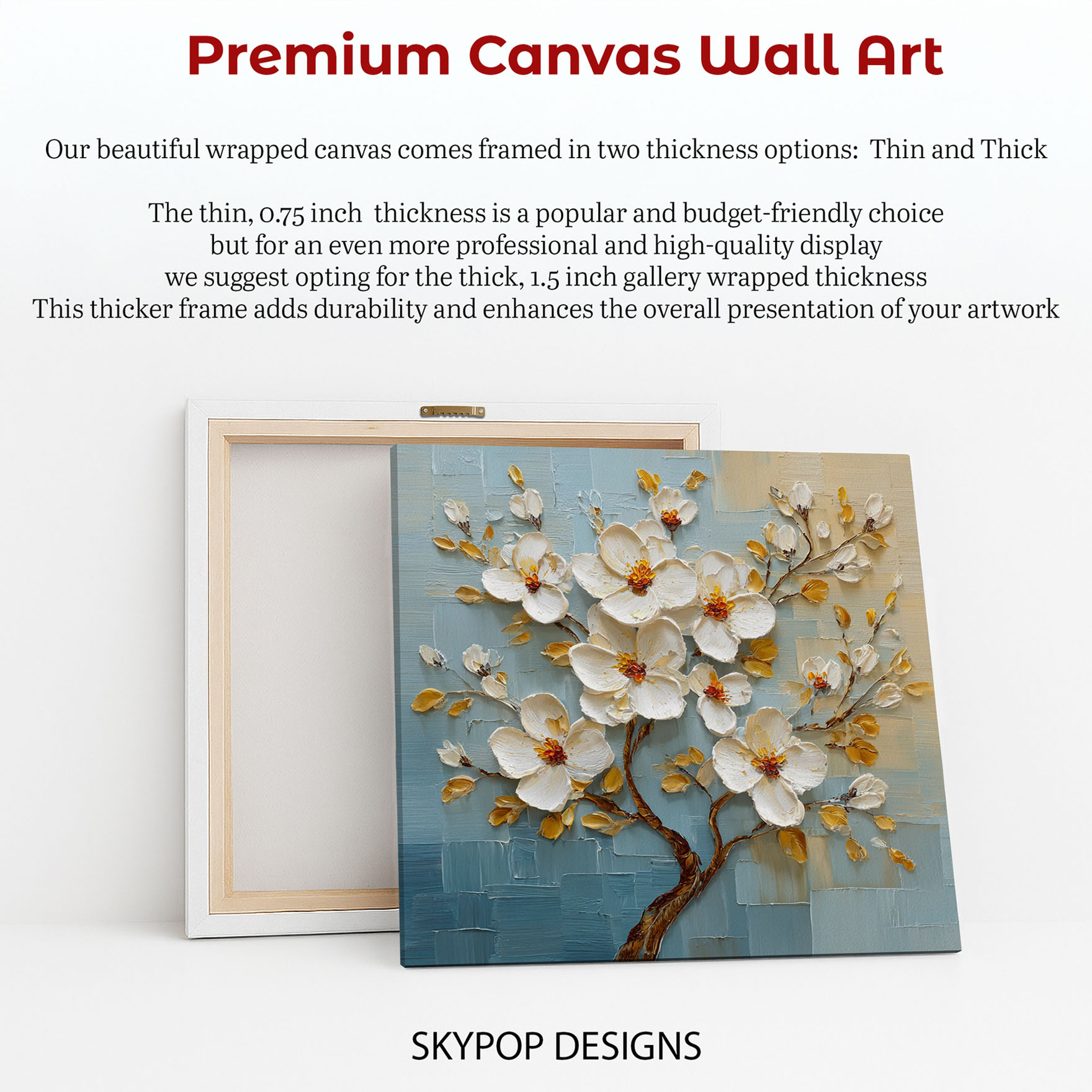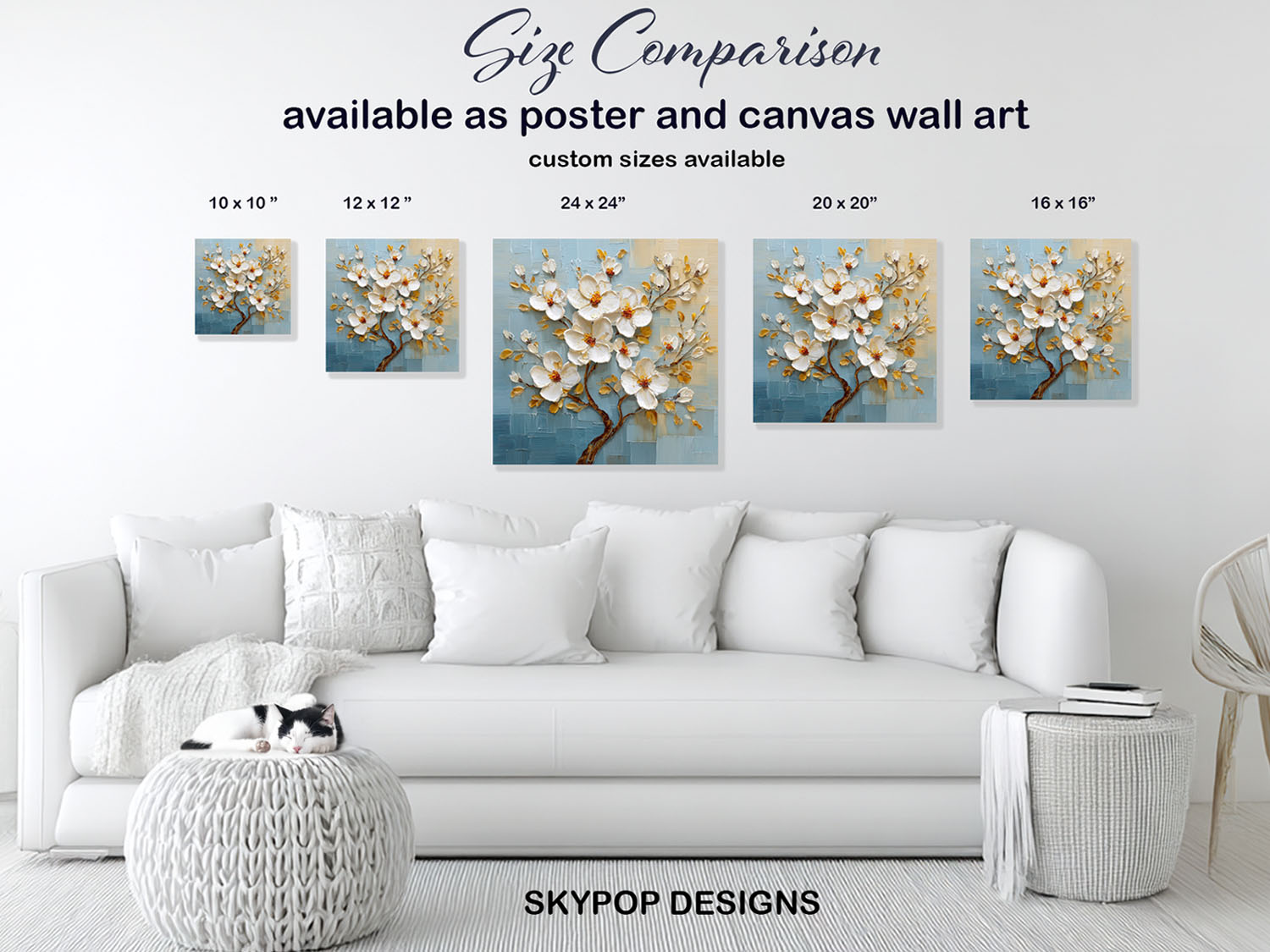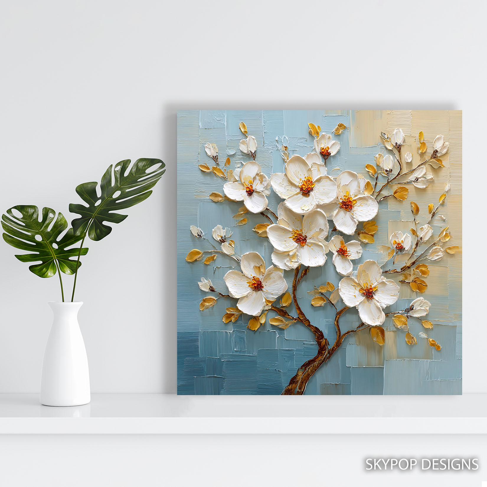 Transform your home with this stunning Blossom Tree of Life canvas wall art, featuring delicate white blossoms on a textured blue background. This eye-catching poster or canvas wall art is perfect for elevating your modern living room wall decor or creating a serene bedroom atmosphere. The vibrant white flowers and golden accents pop against the calming blue hues, bringing a sense of peace and natural beauty to your space. Ideal for Scandinavian and Bohemian interiors, this floral artwork adds a touch of organic elegance and warmth. The textured brushstrokes create a captivating, almost sculptural effect, making this canvas wall art a true statement piece. It’s perfect for creating an inviting entryway or a sophisticated dining room setting. This versatile poster or canvas wall art is also a wonderful gift for housewarmings, birthdays, or holidays, bringing joy and aesthetic appeal to any recipient’s home. The high-quality printing ensures every detail of the textured petals and branches is rendered with precision, offering lasting visual delight. Whether you seek modern bedroom art or sophisticated wall decor, this piece offers both beauty and tranquility. Enhance your home’s ambiance with this captivating floral canvas art that celebrates the simple elegance of nature. Add this exquisite blossom artwork to your collection today and bring a touch of timeless beauty to your walls.
