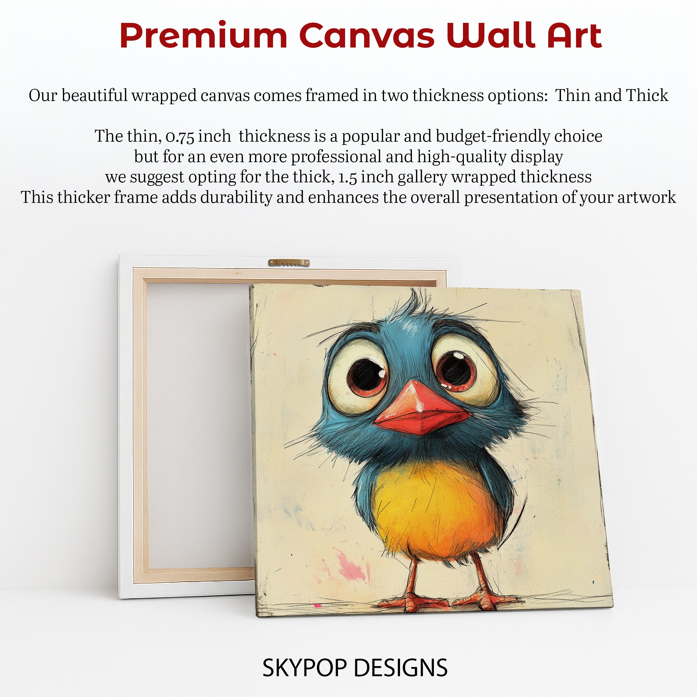 Bring a burst of whimsy to your walls with this adorable blue bird canvas art! This eye-catching poster features a charmingly exaggerated cartoon bird with big, expressive eyes and vibrant colors that instantly grab attention. Perfect for adding a playful touch to modern nurseries or bringing a pop of color to Scandinavian-inspired living rooms. The bird’s fluffy blue feathers, bright yellow belly, and striking red beak create a delightful contrast that’s sure to make anyone smile. This contemporary animal art print works wonderfully in children’s bedrooms, inspiring imagination and creativity. The bird’s quirky expression and ruffled appearance give it tons of personality, making it a great conversation starter in any space. Ideal for bohemian decor lovers looking to add a touch of eccentricity to their walls. The high-quality canvas captures every brushstroke and detail, from the bird’s wispy feathers to its comically large eyes. Whether you’re decorating a cozy reading nook or brightening up a minimalist office, this versatile wall art adapts beautifully to various interior styles. It’s a fantastic gift for bird lovers, new parents, or anyone who appreciates fun, contemporary design. Liven up your space with this charming blue bird artwork – it’s guaranteed to bring a smile to your face every day!
