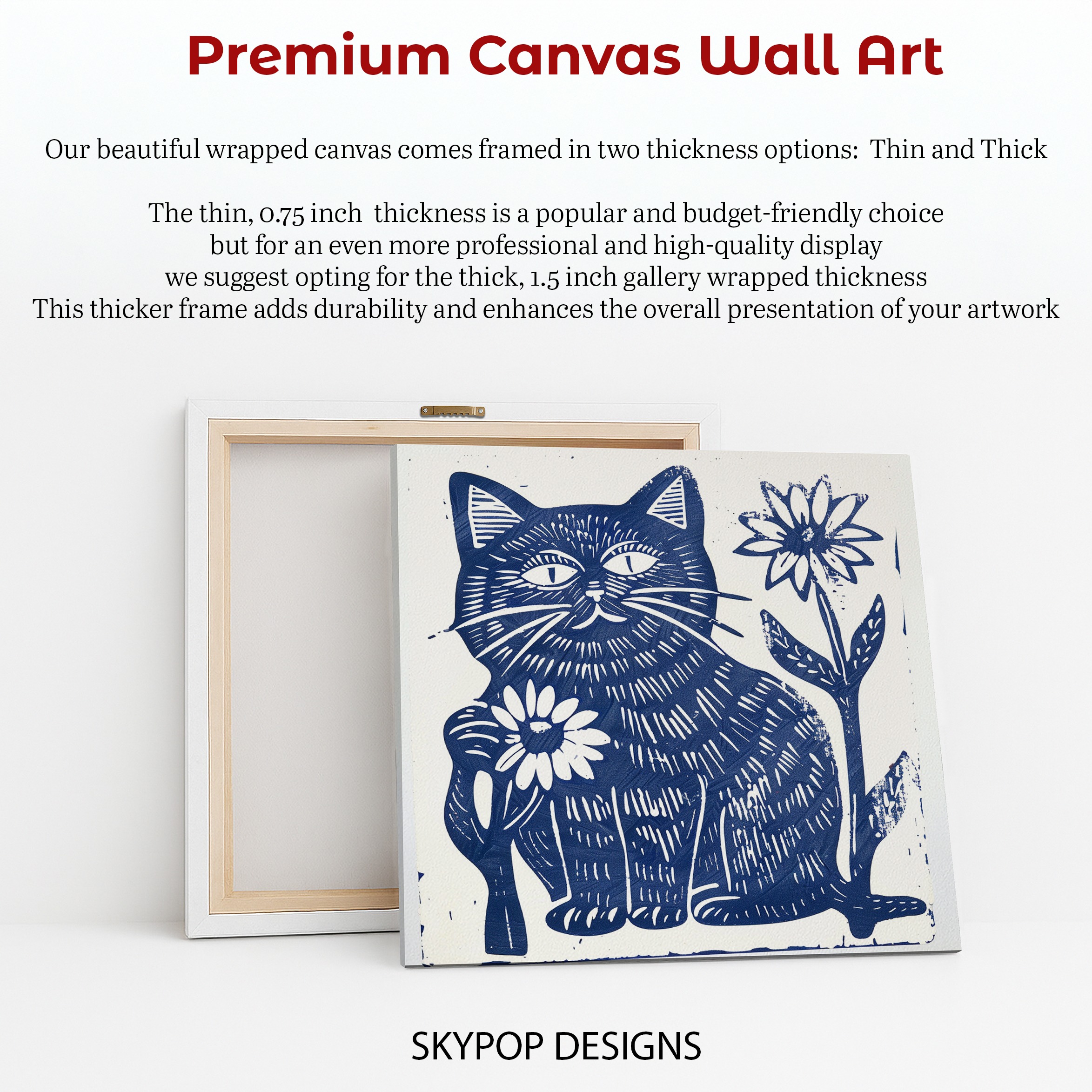 Bring a touch of whimsy to your walls with this charming blue cat canvas wall art. This striking poster features a stylized feline surrounded by delicate flowers, creating a captivating focal point for any room. The bold blue and white color scheme adds a contemporary pop to your decor while maintaining a rustic, handcrafted feel. Perfect for cat lovers and art enthusiasts alike, this canvas wall art transforms living rooms, bedrooms, or home offices with its unique blend of nature and animal themes. The intricate linework and textured appearance give depth to the piece, making it a standout in both modern and bohemian interiors. Ideal for creating a calming atmosphere in a children’s room or adding character to a minimalist space. The versatile design works well as a standalone statement or as part of a gallery wall. This high-quality print captures every detail of the original artwork, from the cat’s expressive eyes to the delicate flower petals. Whether you’re looking for a thoughtful housewarming gift or wanting to refresh your own space, this blue cat wall art offers a perfect blend of playfulness and sophistication. Elevate your home decor today with this eye-catching piece that celebrates the beauty of nature and the charm of our feline friends.