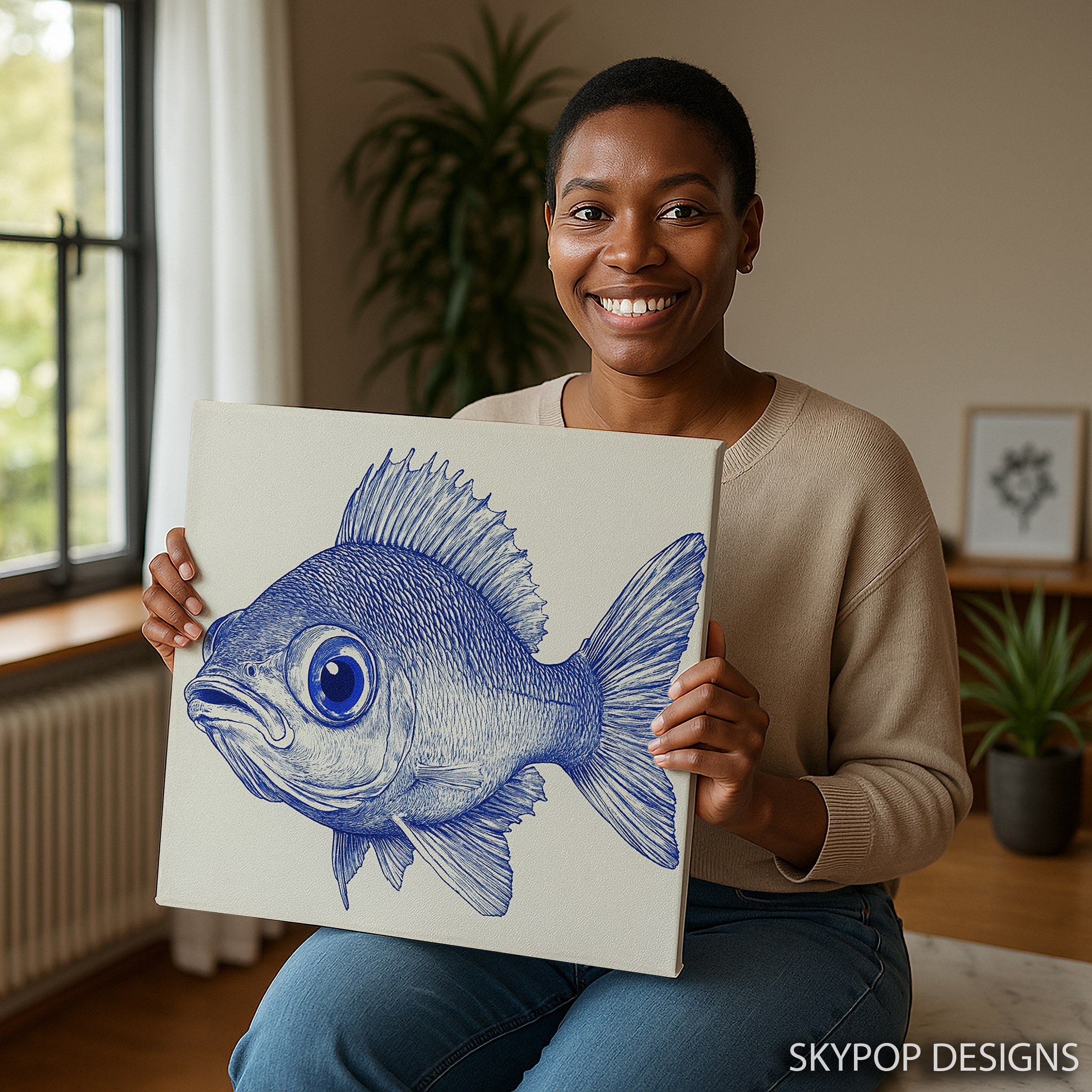 Dive into tranquility with this striking blue fish canvas wall art, perfect for bringing a touch of underwater wonder to your home. This captivating poster features an intricate, hand-drawn style fish illustration in vibrant shades of blue against a crisp white background. The large, expressive eye and detailed fin structure create a mesmerizing focal point that draws viewers in. Ideal for modern coastal decor, this piece effortlessly enhances bathrooms, offices, or living rooms with its calming aquatic theme. The minimalist color palette of blue and white offers versatility, complementing a wide range of interior styles while adding a pop of color. As a canvas print, the textured surface brings depth and dimension to the artwork, making it a standout piece in any room. This fish wall art serves as an excellent conversation starter and adds a serene, ocean-inspired atmosphere to your space. Whether you’re a marine life enthusiast or simply love unique wall decor, this blue fish artwork brings a slice of the sea into your home. Transform your bedroom into a relaxing oasis or elevate your bathroom’s ambiance with this eye-catching fish poster. High-quality printing ensures every scale and fin detail is captured, creating a striking piece that looks great from any angle. Add a splash of ocean-inspired charm to your walls and bring the calming presence of marine life into your daily environment with this contemporary fish wall art.