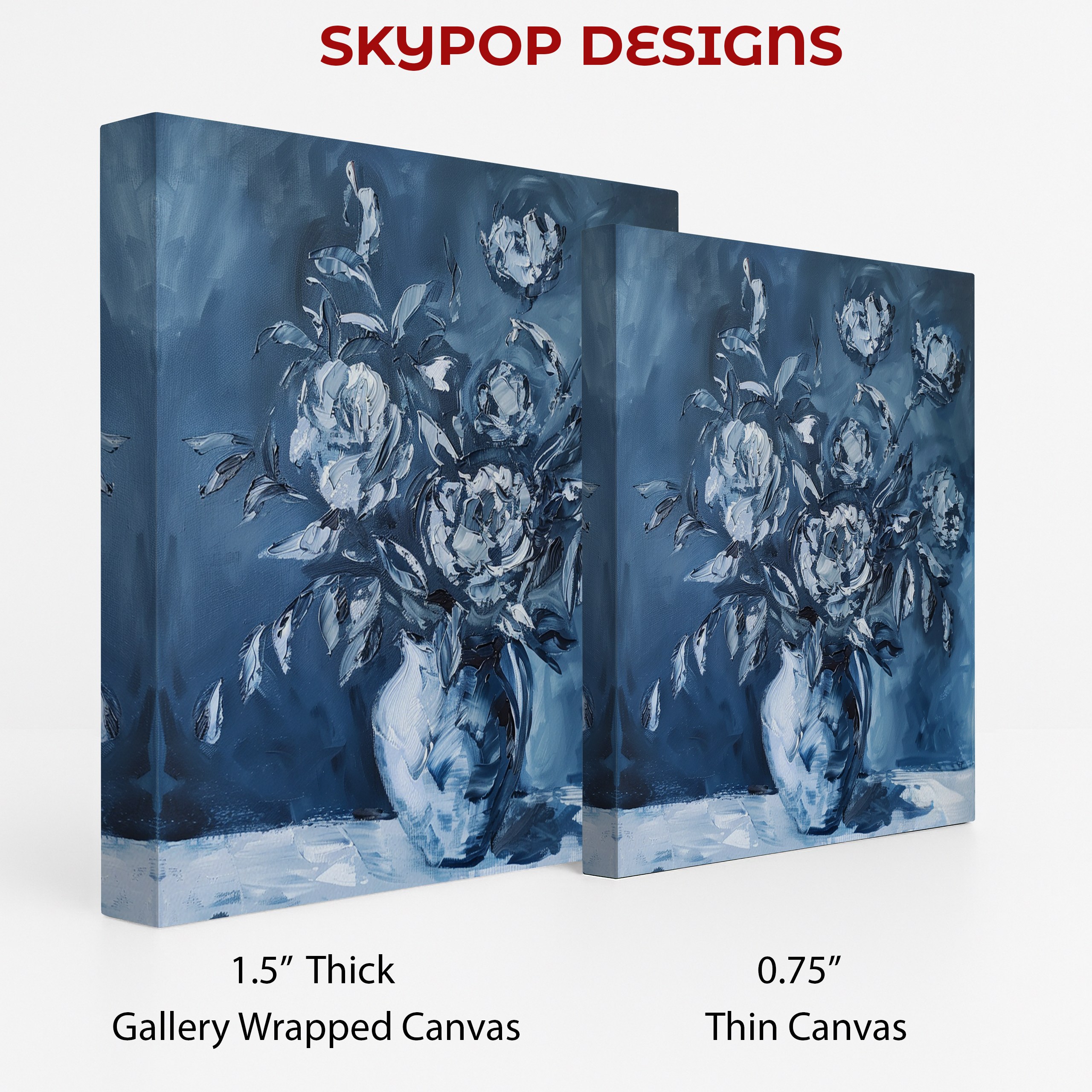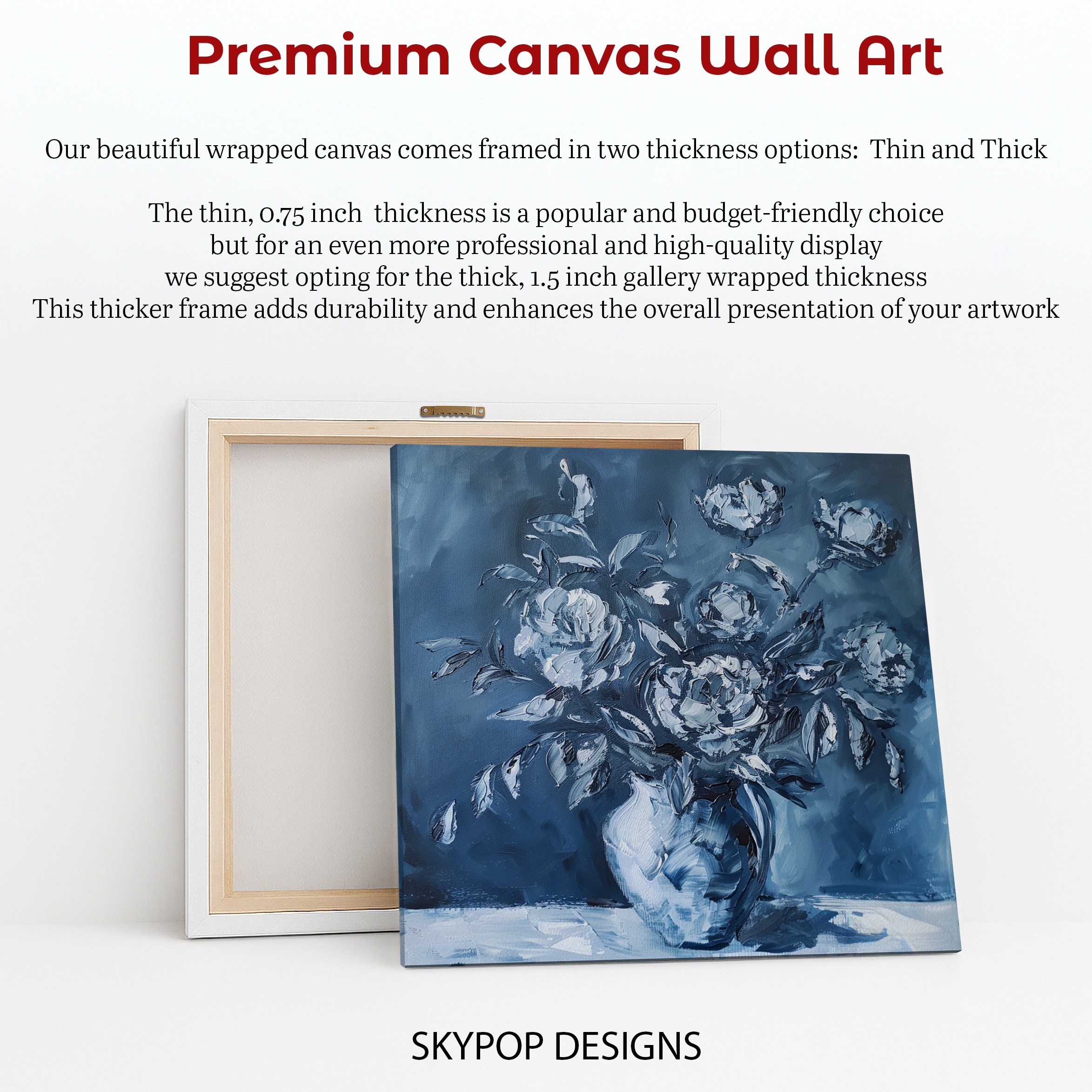 Transform your space with this stunning blue floral canvas wall art, capturing the essence of a serene still life. This captivating poster or canvas print showcases a delicate bouquet of white flowers arranged in a soft blue vase, painted with expressive brushstrokes that bring the scene to life. Perfect for adding a touch of elegance to your French country living room or creating a calming atmosphere in a shabby chic bedroom. The monochromatic blue palette, ranging from light sky blues to deep navy tones, evokes a sense of tranquility and depth. This versatile wall art complements rustic decor styles while adding a contemporary twist to traditional spaces. Ideal for enhancing dining room ambiance or creating a spa-like feel in your bathroom. The impressionistic style adds texture and movement, making this piece a conversation starter. Whether you’re looking for a housewarming gift or wanting to refresh your own space, this blue floral art adapts beautifully to various interior designs. The high-quality canvas ensures every brushstroke is captured in vivid detail, bringing gallery-worthy art into your home. Elevate your walls with this timeless floral composition that celebrates the beauty of simplicity and nature. Transform your room today with this eye-catching blue and white floral canvas art that’s sure to inspire and delight.