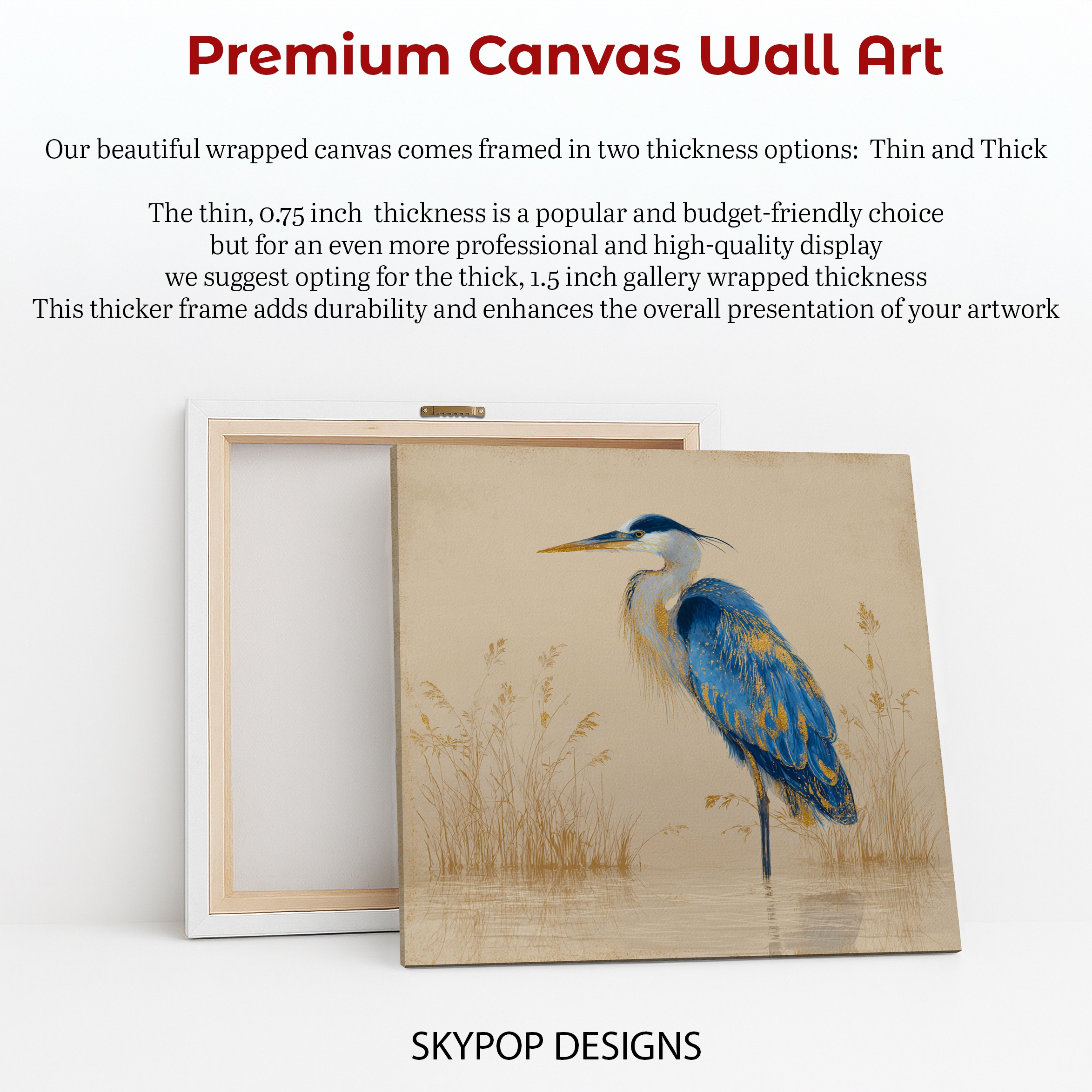 Bring the serene beauty of nature into your home with this stunning blue heron canvas wall art. This captivating poster showcases a majestic heron standing tall in shallow waters, its elegant form perfectly captured in vibrant blues and golds. The striking contrast between the bird’s blue plumage and the soft beige background creates a focal point that instantly draws the eye. Perfect for coastal-inspired living rooms or modern bathrooms, this canvas art adds a touch of tranquility to any space. The detailed feathers and graceful silhouette of the heron make this piece ideal for nature enthusiasts and bird lovers alike. Whether displayed as a standalone statement or part of a gallery wall, this versatile artwork complements a variety of decor styles from minimalist to contemporary. The golden accents throughout the heron’s feathers add a subtle shimmer, elevating the overall aesthetic of your room. This high-quality canvas print is designed to maintain its vibrancy for years, making it a lasting addition to your home decor. Transform your bedroom into a peaceful retreat or add a calming presence to your office with this beautiful heron wall art. Celebrate the beauty of wildlife and bring a piece of nature indoors with this eye-catching canvas. Elevate your space today with this timeless and elegant blue heron artwork.