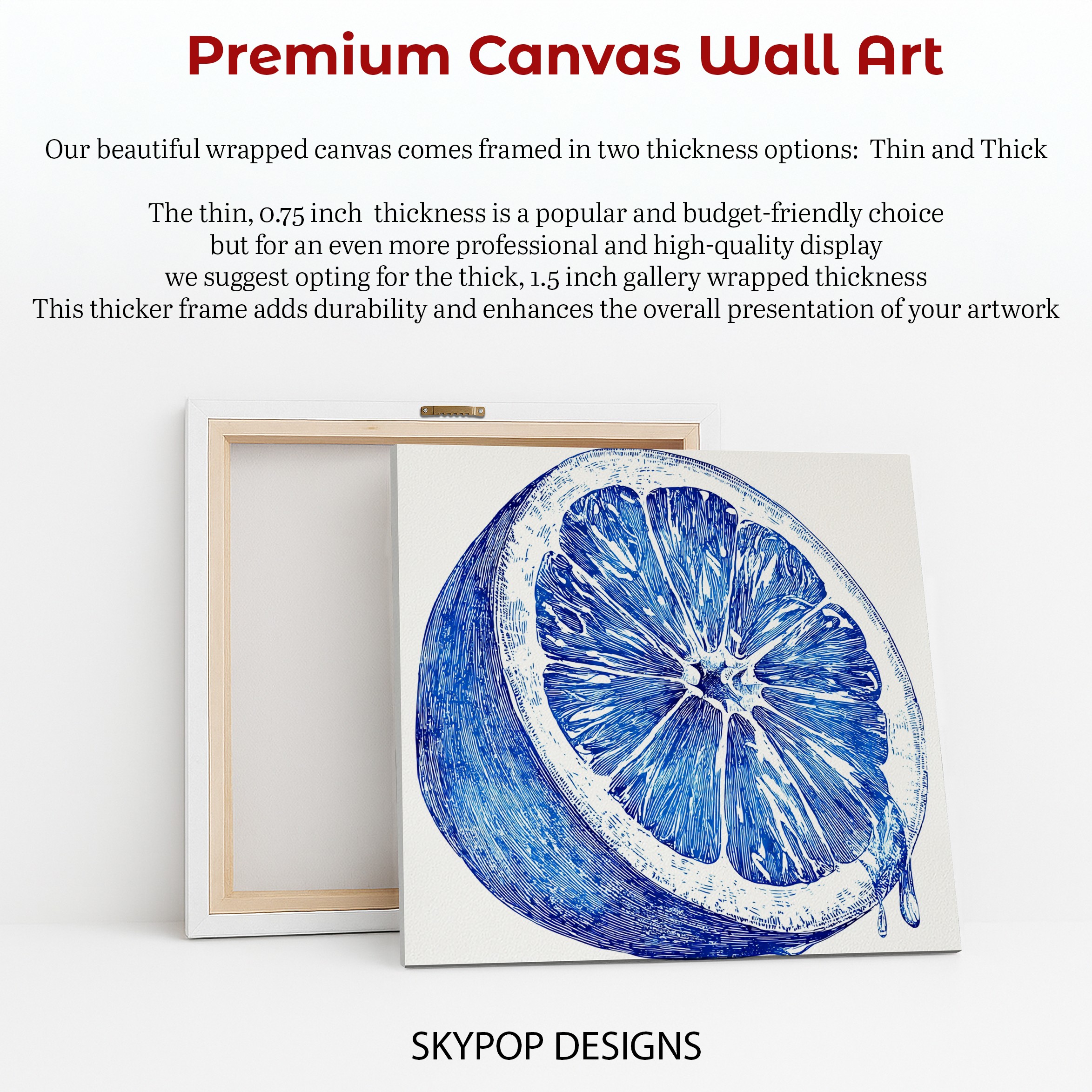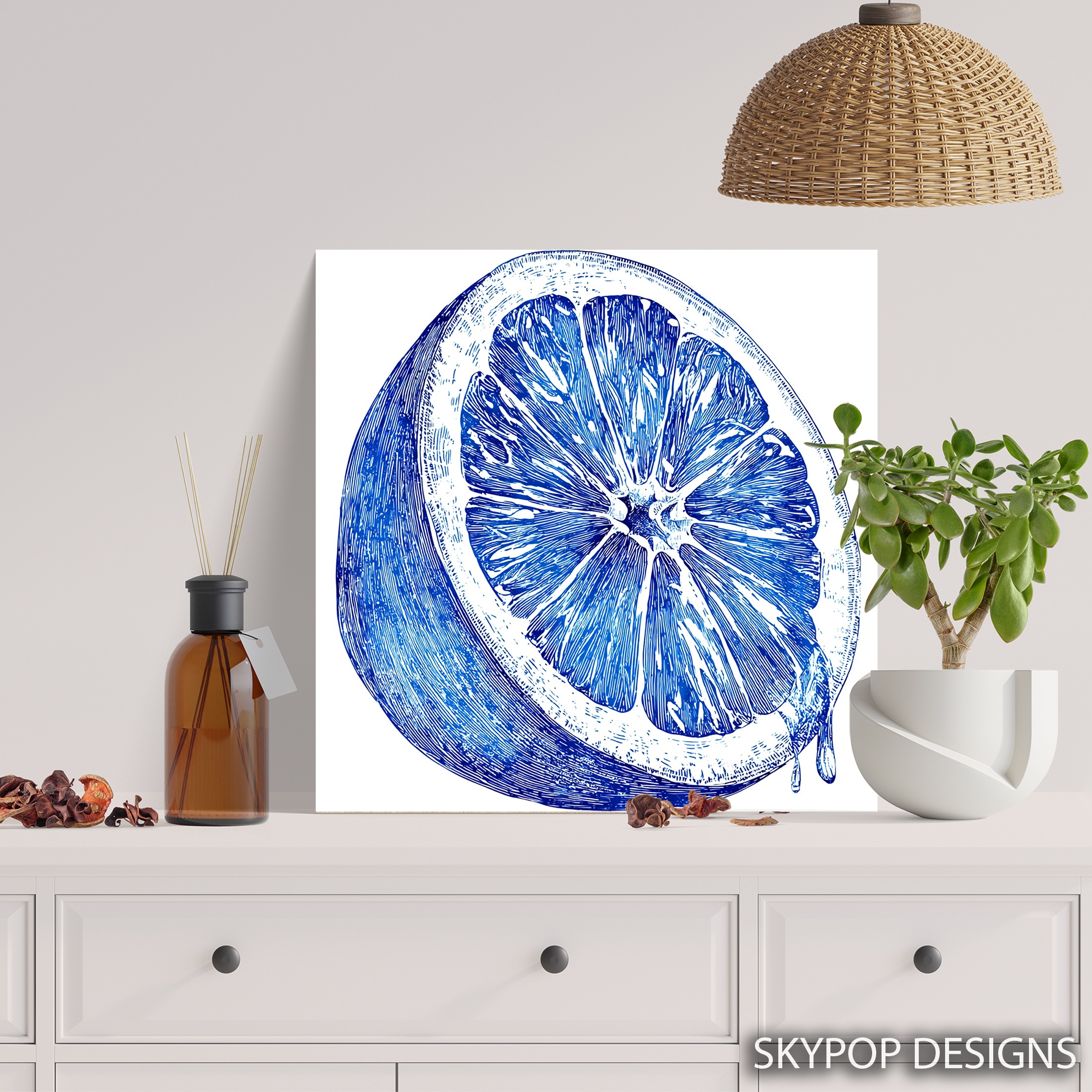 Elevate your space with this striking blue lemon slice canvas wall art, perfect for adding a refreshing pop of color to any room. This contemporary poster transforms a simple citrus fruit into a captivating piece of modern decor, ideal for kitchens, dining rooms, or even bathrooms craving a splash of vibrant energy. The bold blue hue against a crisp white background creates a stunning contrast that instantly draws the eye and brightens your space. This minimalist design works beautifully in Scandinavian-inspired interiors, adding a touch of whimsy without overwhelming the clean aesthetic. The intricate details of the lemon’s segments and pulp are rendered in mesmerizing blue lines, showcasing the natural beauty of this everyday fruit in an unexpected way. Whether you’re looking to liven up a stark office wall or create a focal point in your kitchen, this versatile canvas art adapts effortlessly to various decor styles. The cool blue tones evoke a sense of calm and freshness, making it a perfect addition to spaces where you want to feel energized and inspired. Available in multiple sizes, this eye-catching lemon slice art is sure to become a conversation starter and a beloved piece in your home. Transform your walls today with this unique blend of nature-inspired art and contemporary design that celebrates the extraordinary in the ordinary.