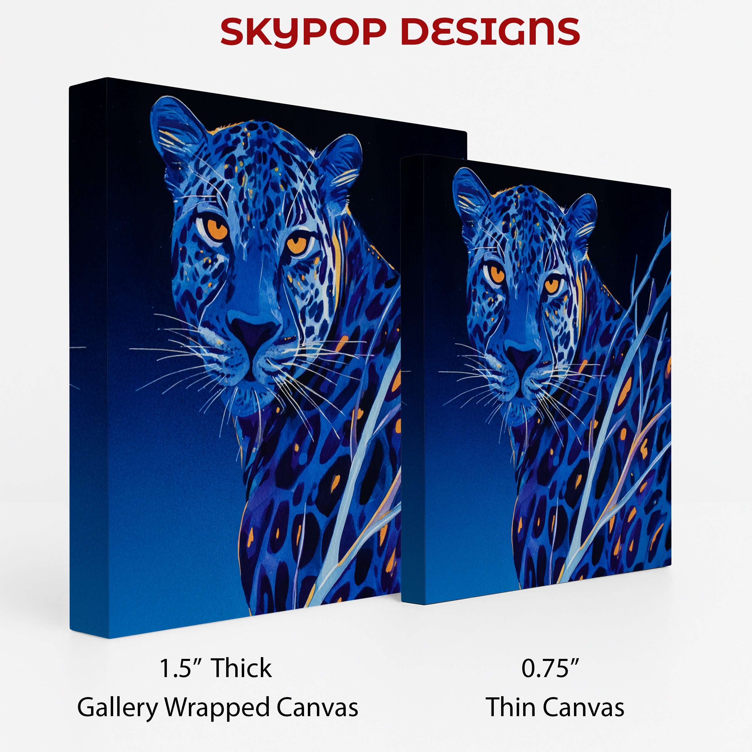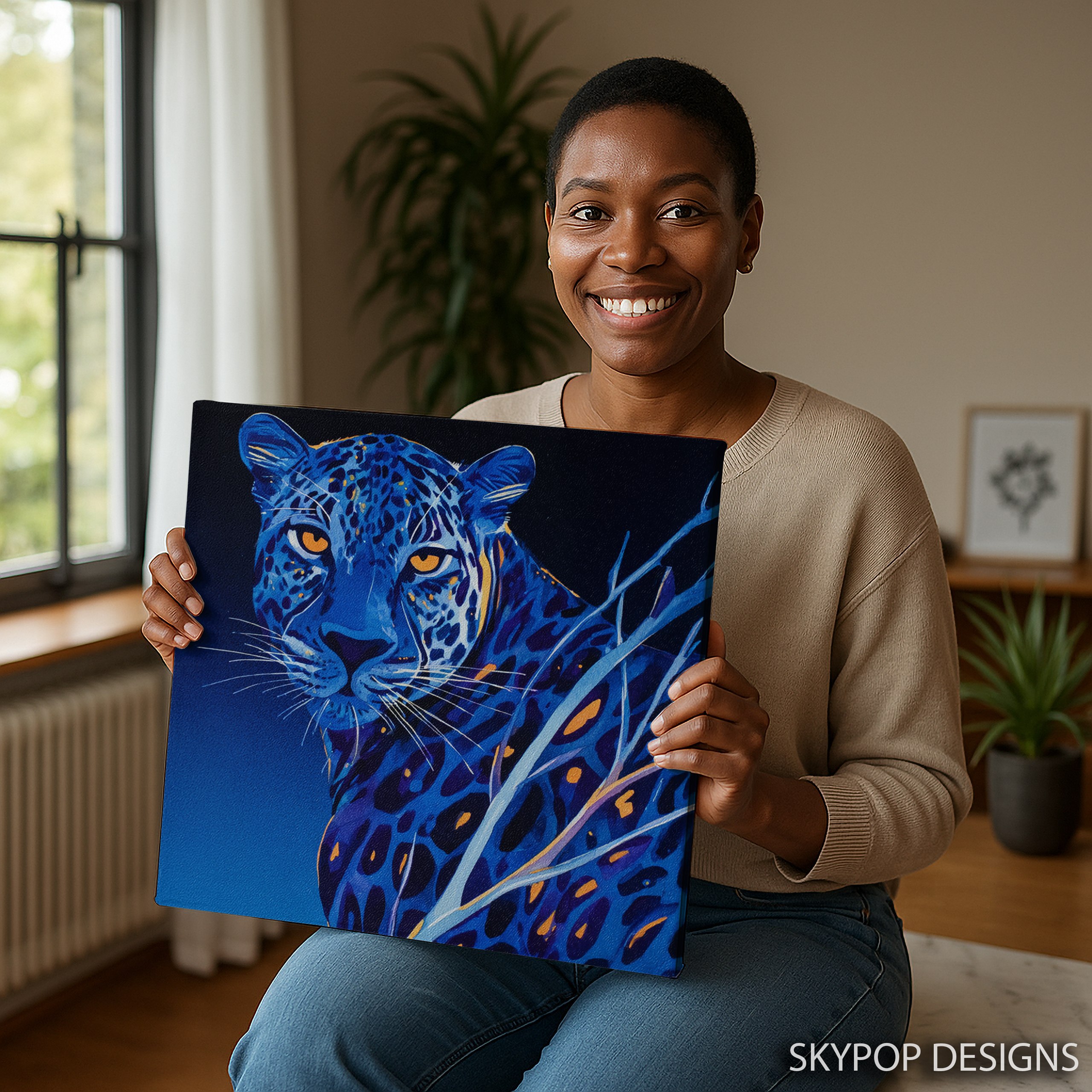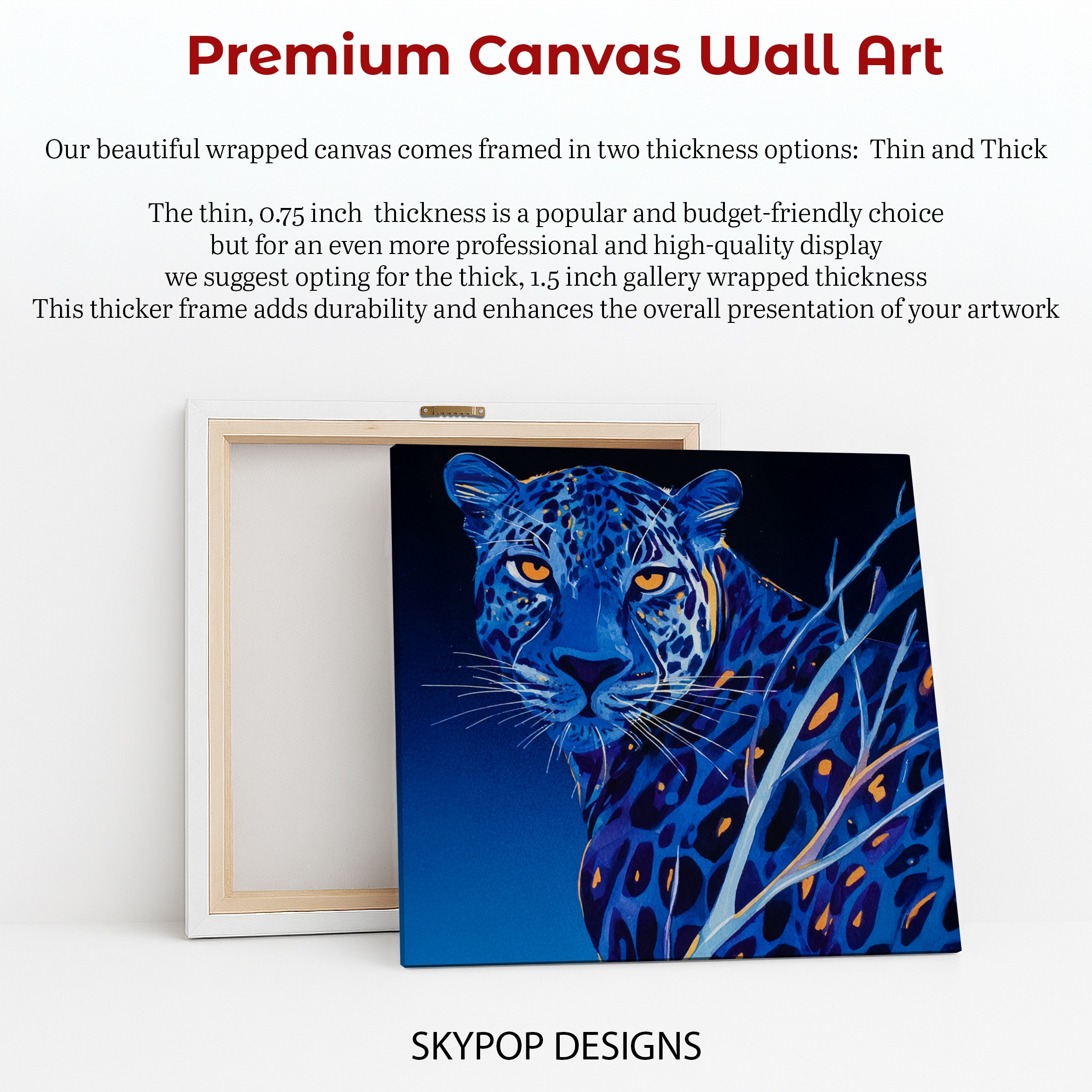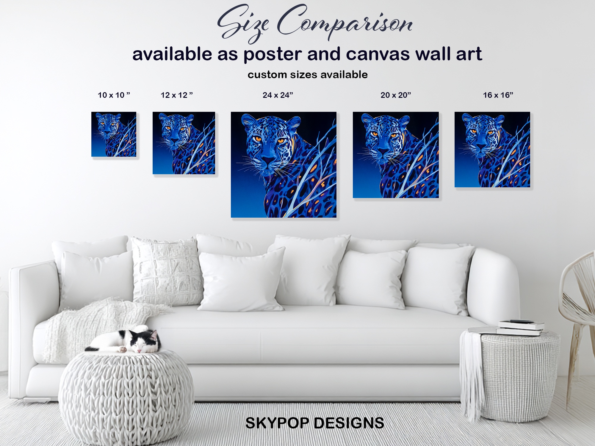 Transform your space with this striking blue leopard canvas wall art that commands attention and adds a vibrant pop of color to any room. This contemporary animal poster features a mesmerizing electric blue leopard with piercing orange eyes, creating a stunning contrast that immediately draws the eye. Perfect for modern living rooms or bohemian bedrooms, this unique wall art brings a touch of wild elegance to your decor. The vivid blue hues evoke a sense of calm and depth, while the orange accents add warmth and energy to the composition. Ideal for animal lovers and art enthusiasts alike, this leopard canvas art makes a bold statement in minimalist spaces or complements eclectic design schemes. The intricate details of the leopard’s spots and whiskers showcase the high-quality printing, ensuring this piece remains captivating from every angle. Whether displayed as a standalone showpiece or part of a gallery wall, this blue leopard poster adds personality and style to home offices, game rooms, or living areas. The versatile size options make it easy to find the perfect fit for your space, while the durable canvas material ensures long-lasting beauty. Elevate your home decor with this eye-catching leopard wall art that combines the allure of the wild with contemporary artistic flair. Make a statement and bring the beauty of nature indoors with this unforgettable blue leopard canvas today.