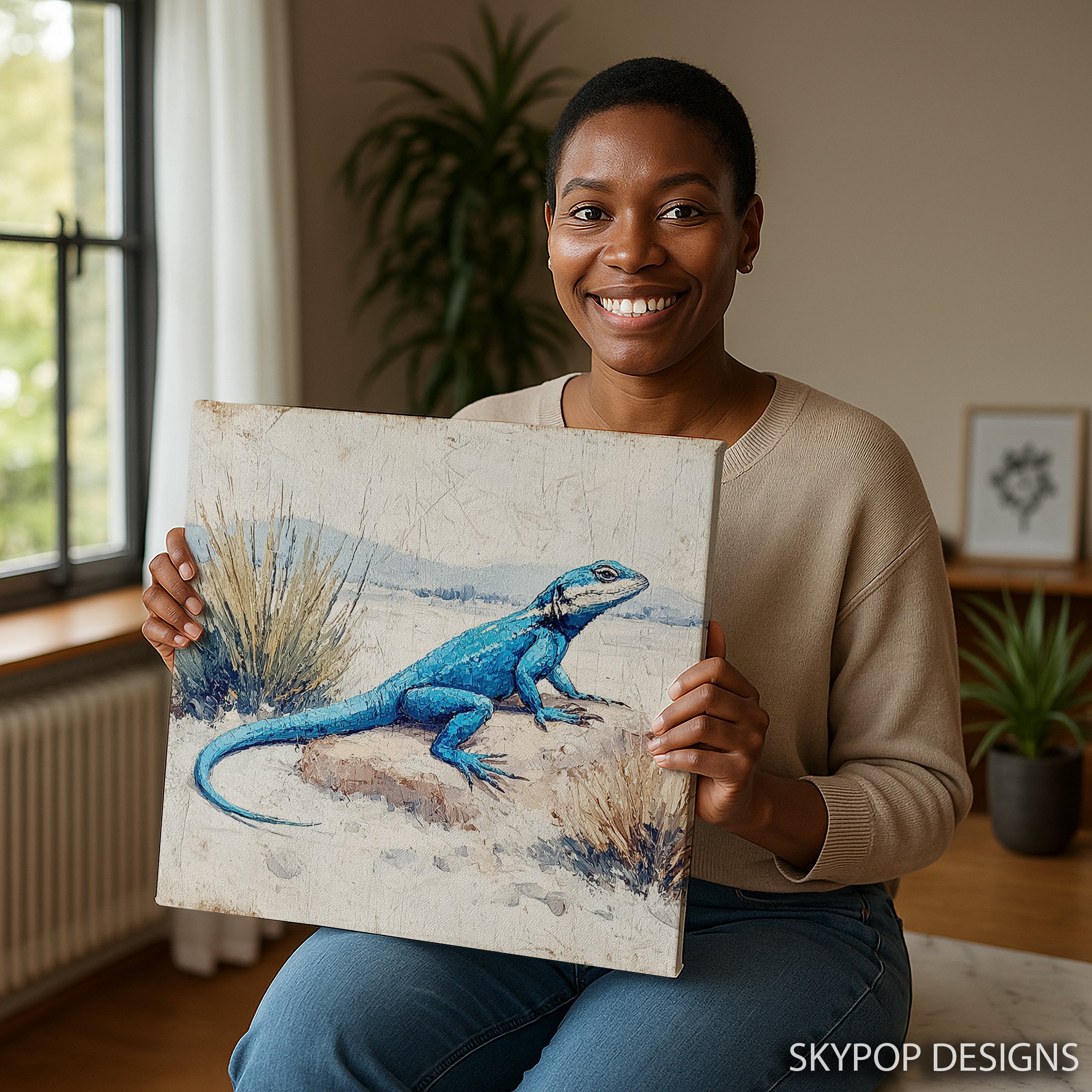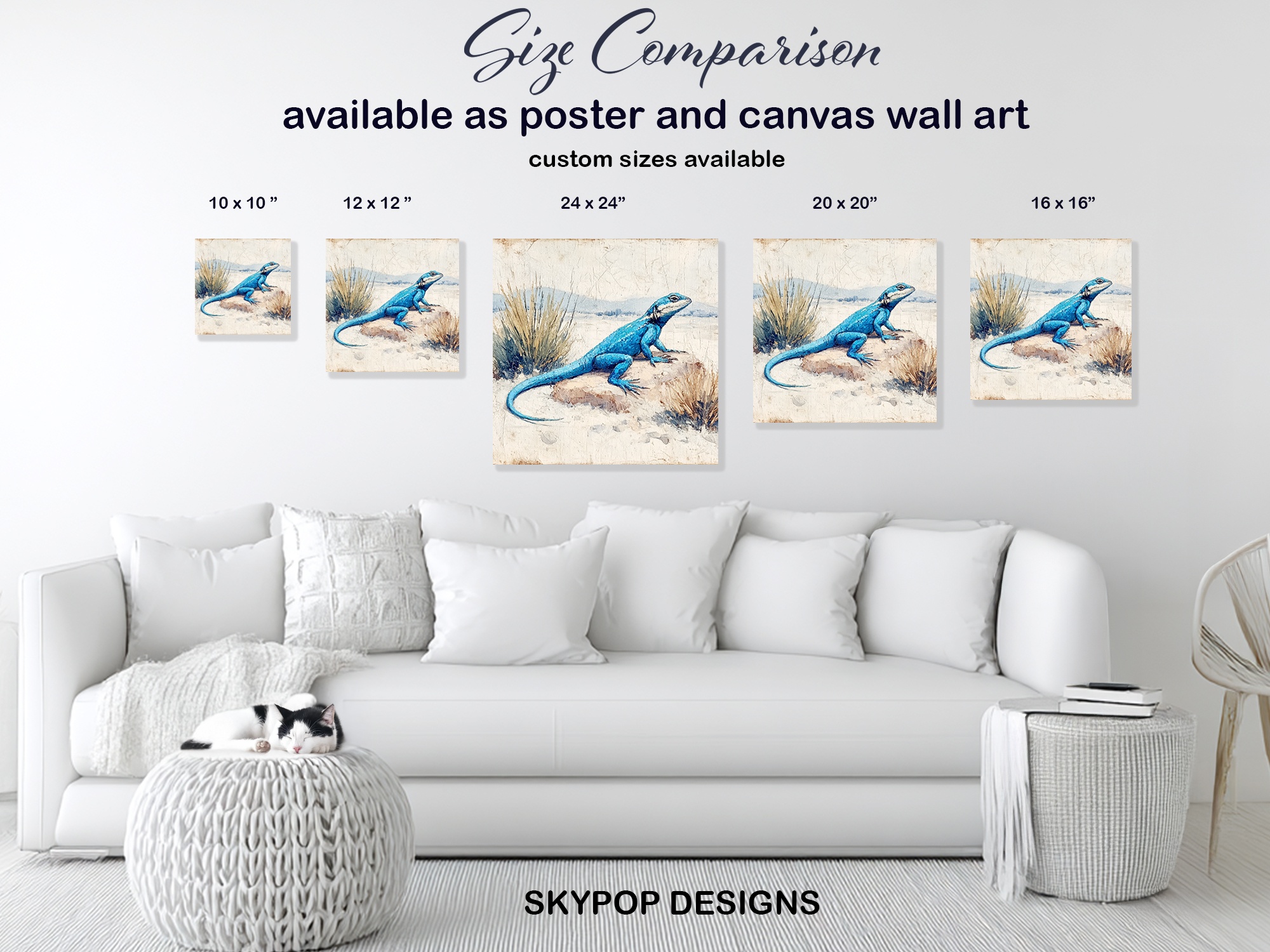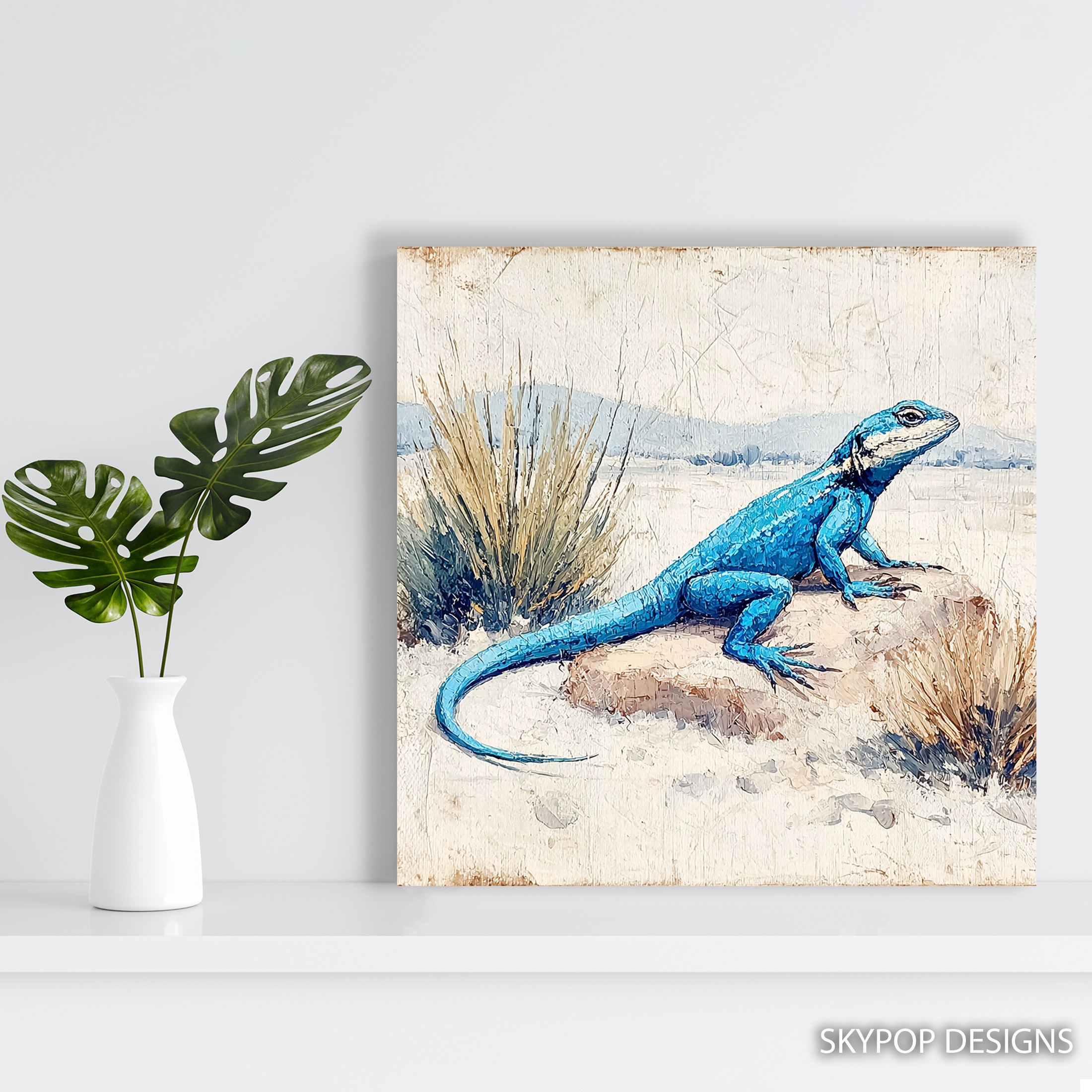 Bring the vibrant energy of desert wildlife into your home with this striking blue lizard canvas wall art. This eye-catching poster features a vivid turquoise lizard perched on a sun-bleached rock, set against a minimalist desert landscape. Perfect for modern living room wall decor or as a bold statement piece in a coastal-inspired bedroom, this canvas art instantly transforms any space with its unique color palette and contemporary style. The lizard’s electric blue hue pops dramatically against the neutral background, creating a focal point that draws the eye and sparks conversation. Ideal for nature enthusiasts and those looking to add a touch of the exotic to their interiors, this wall art brings a sense of adventure and serenity to your home. The high-quality printing captures every scale and texture, making the lizard appear almost lifelike on your wall. Whether displayed in a sleek office, a tranquil bathroom, or as part of a gallery wall, this versatile piece adapts beautifully to various decor styles. Gift it to a reptile lover or use it to elevate your own space with a touch of desert charm. The blend of vibrant color and minimalist design makes this lizard art a standout addition to any room, inspiring a sense of calm and connection to nature. Transform your living space today with this captivating blue lizard wall art that’s sure to become a cherished centerpiece in your home decor collection.