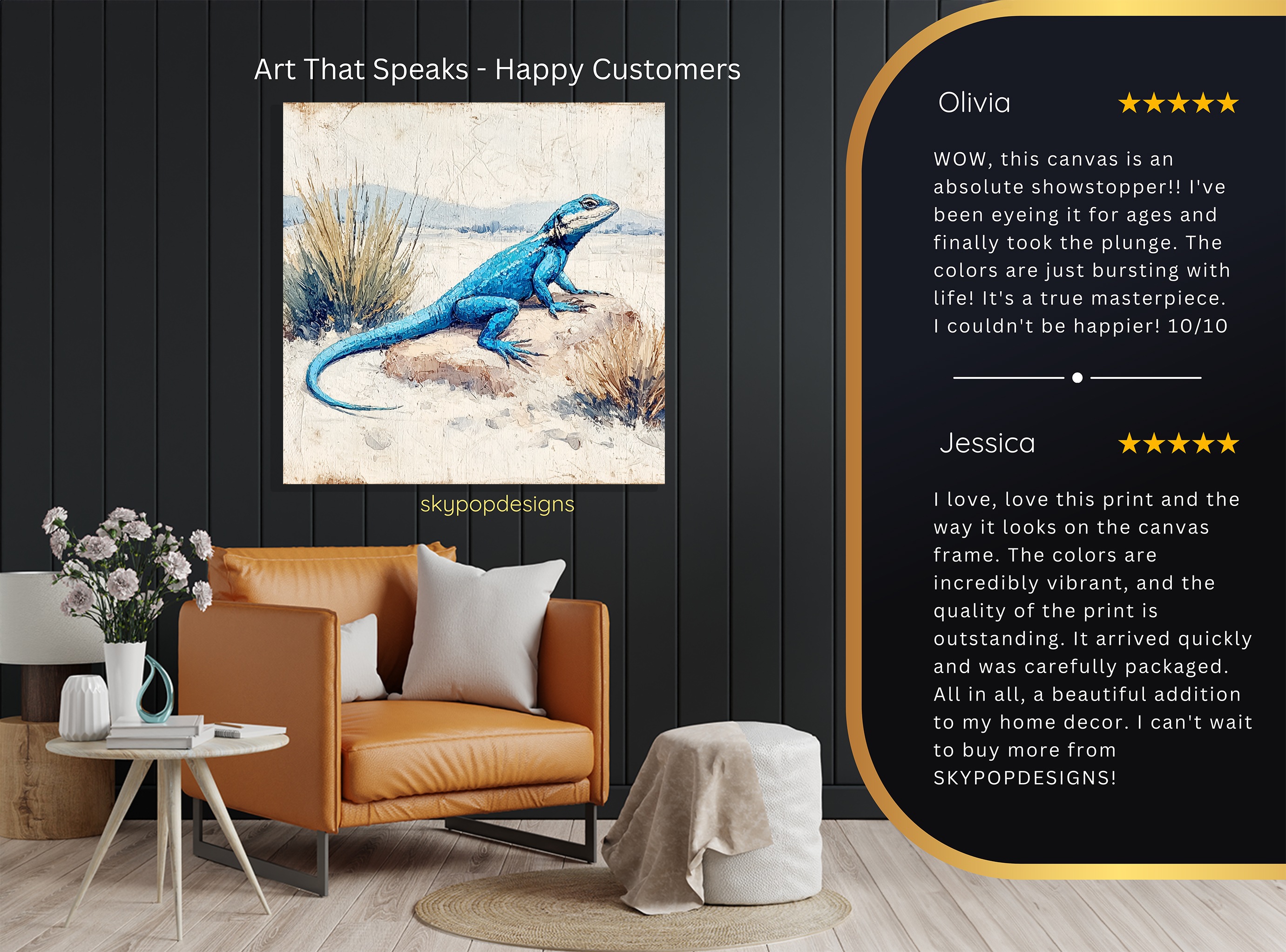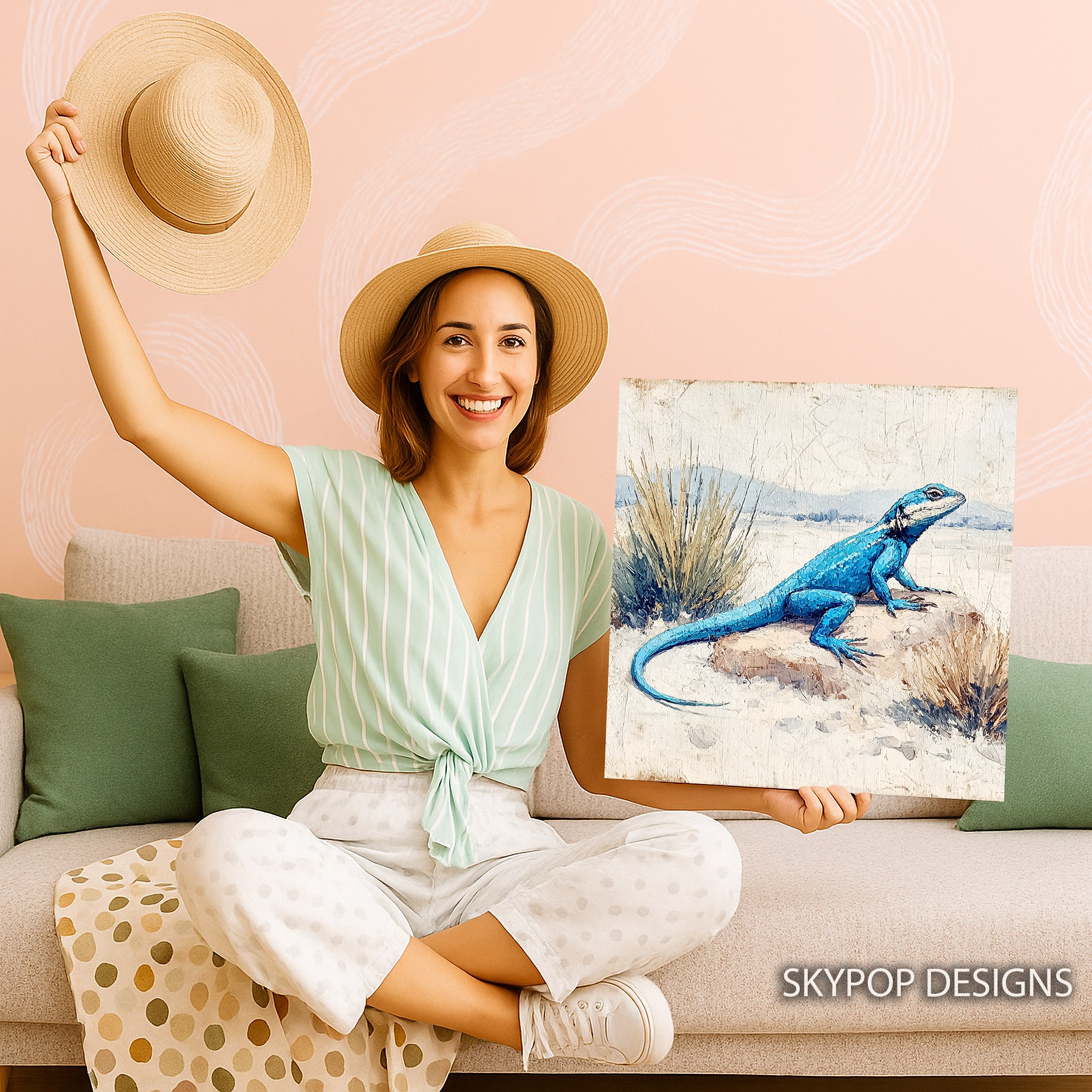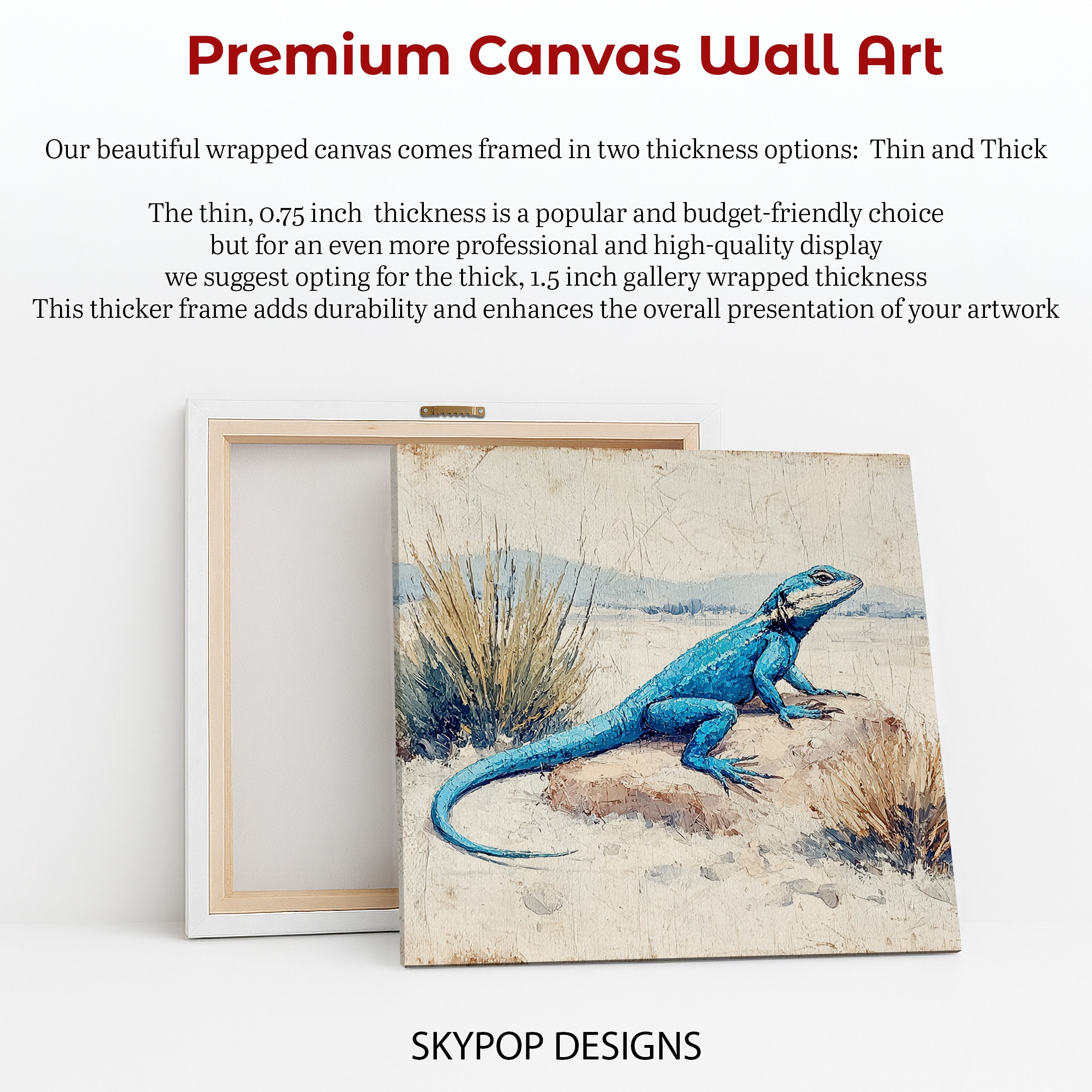 Bring the vibrant energy of desert wildlife into your home with this striking blue lizard canvas wall art. This eye-catching poster features a vivid turquoise lizard perched on a sun-bleached rock, set against a minimalist desert landscape. Perfect for modern living room wall decor or as a bold statement piece in a coastal-inspired bedroom, this canvas art instantly transforms any space with its unique color palette and contemporary style. The lizard’s electric blue hue pops dramatically against the neutral background, creating a focal point that draws the eye and sparks conversation. Ideal for nature enthusiasts and those looking to add a touch of the exotic to their interiors, this wall art brings a sense of adventure and serenity to your home. The high-quality printing captures every scale and texture, making the lizard appear almost lifelike on your wall. Whether displayed in a sleek office, a tranquil bathroom, or as part of a gallery wall, this versatile piece adapts beautifully to various decor styles. Gift it to a reptile lover or use it to elevate your own space with a touch of desert charm. The blend of vibrant color and minimalist design makes this lizard art a standout addition to any room, inspiring a sense of calm and connection to nature. Transform your living space today with this captivating blue lizard wall art that’s sure to become a cherished centerpiece in your home decor collection.