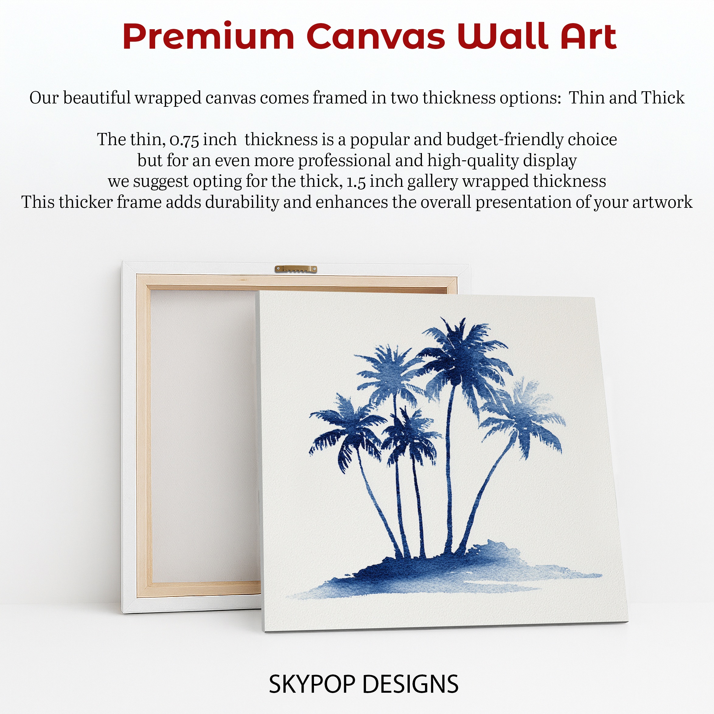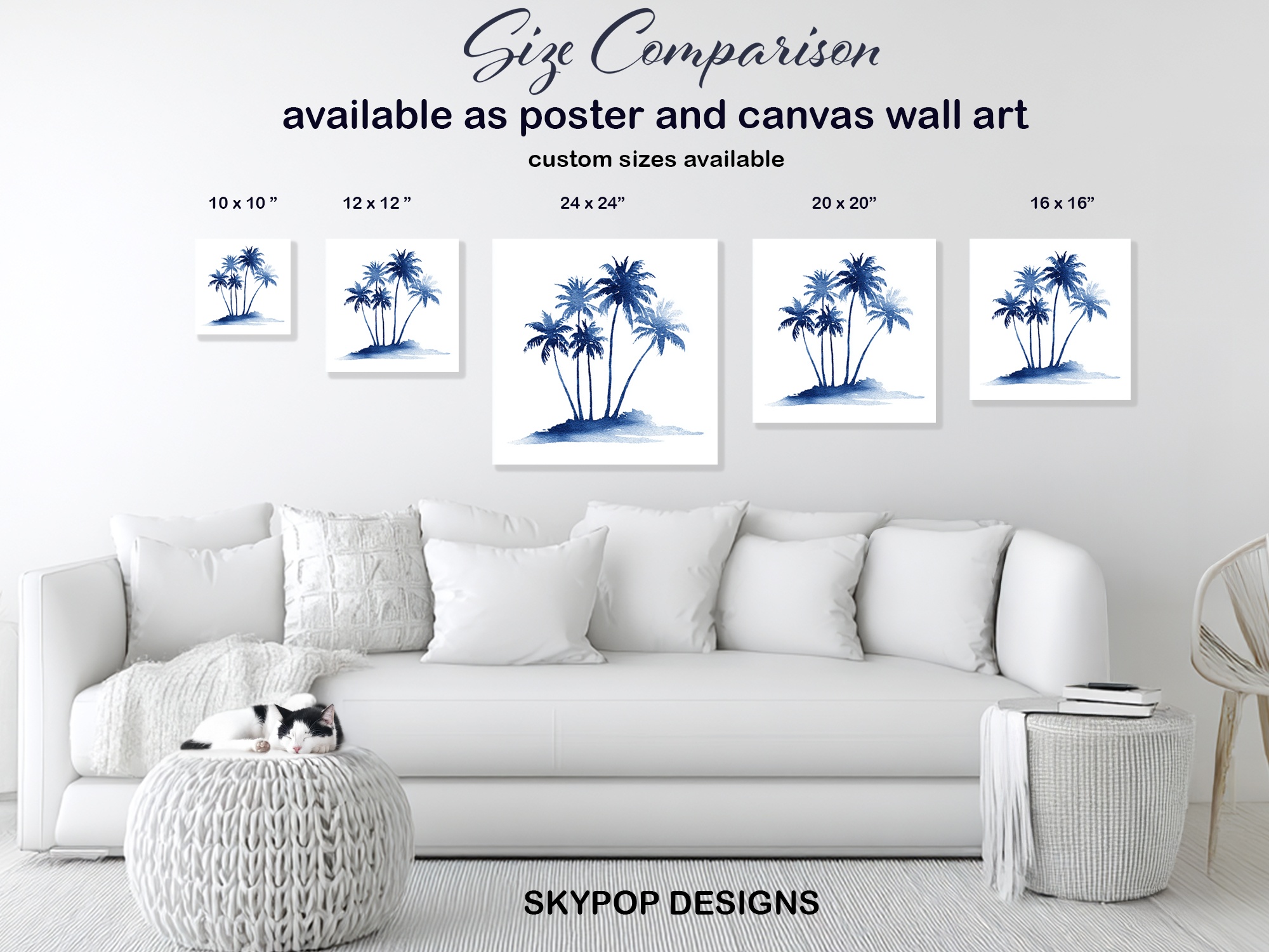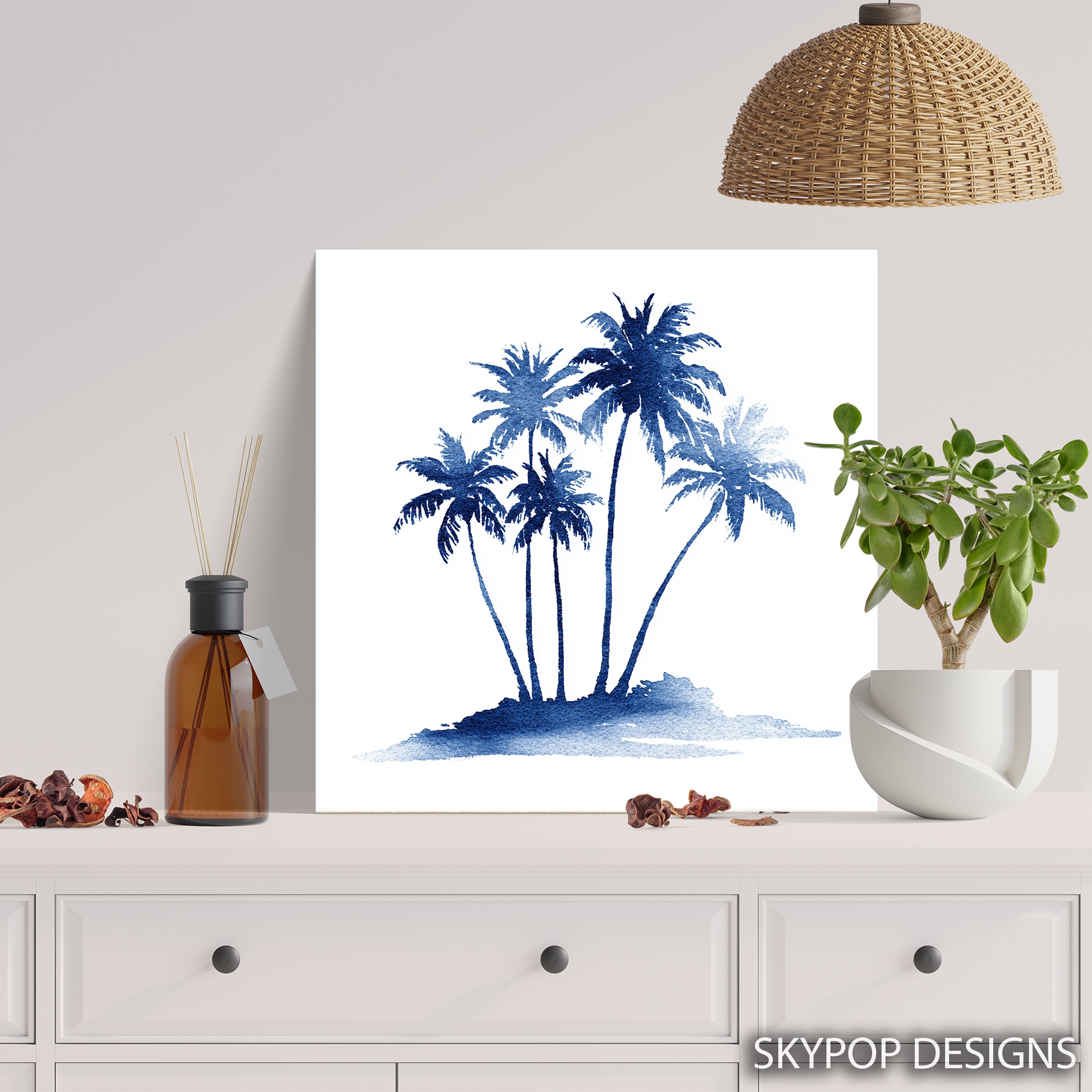 Transform your space with this striking blue palm trees canvas wall art, perfect for bringing a touch of tropical serenity to any room. The minimalist watercolor style creates a calming yet eye-catching focal point that instantly elevates your decor. This versatile poster or canvas print seamlessly blends nature-inspired art with contemporary design, making it ideal for modern living rooms or coastal-themed bedrooms. The monochromatic blue palette evokes a sense of tranquility and ocean vibes, perfect for creating a relaxing atmosphere in your home or office. The delicate brushstrokes and varying shades of blue add depth and texture to the composition, ensuring this wall art remains captivating from every angle. Suitable for minimalist decor enthusiasts, this piece adds a sophisticated touch to clean, uncluttered spaces while maintaining a fresh, modern appeal. The simple yet elegant design makes it a perfect choice for bathroom decor or as a calming addition to a home office. High-quality printing captures every subtle detail of the watercolor technique, from the palm fronds to the gentle shadows. Whether you’re looking to enhance your coastal-inspired interior or bring a taste of the tropics to an urban space, this blue palm trees artwork is a versatile choice. Elevate your home’s atmosphere with this unique blend of nature art and contemporary style that celebrates serene, beachy vibes. Transform your walls and create a peaceful oasis in your home today with this stunning blue palm trees canvas art.