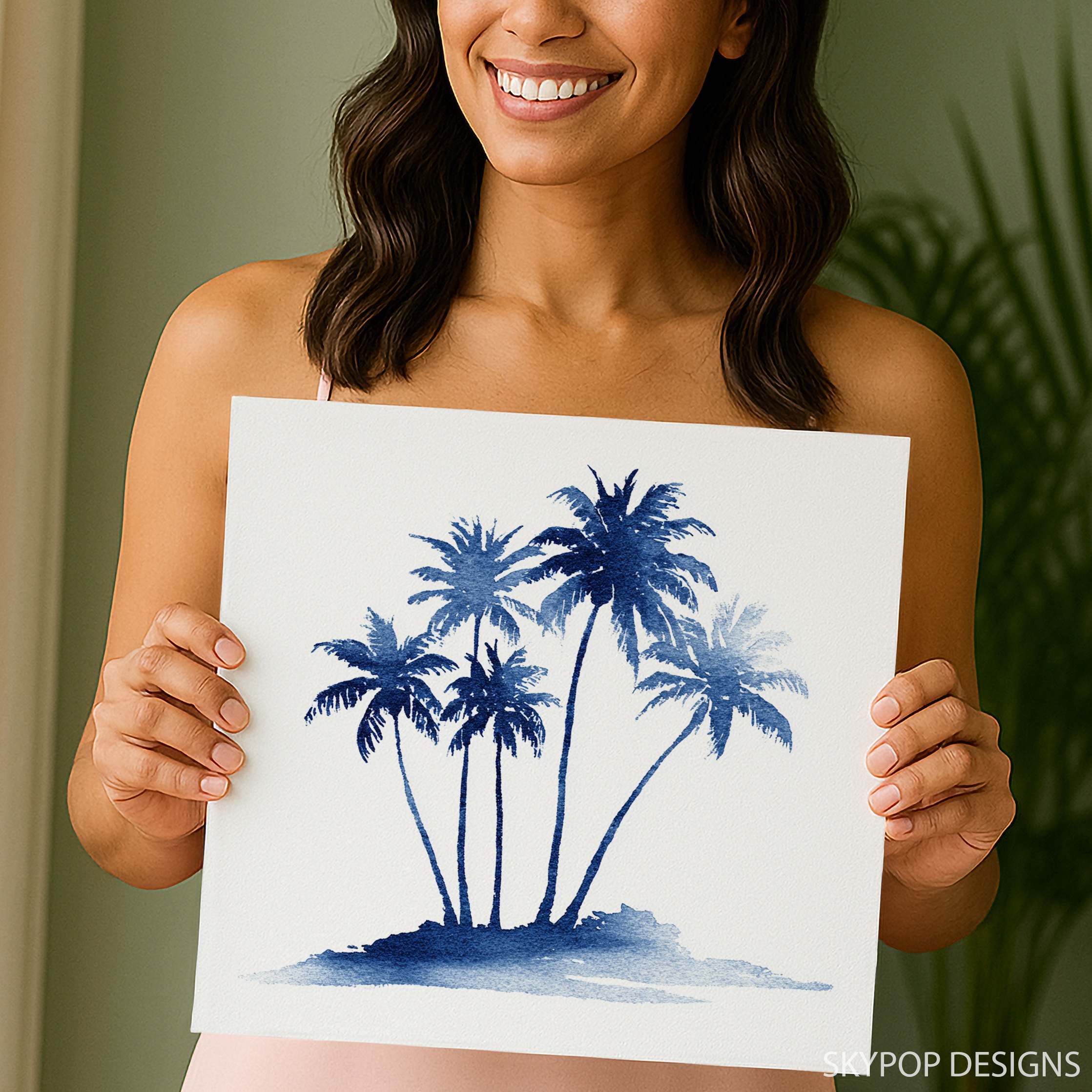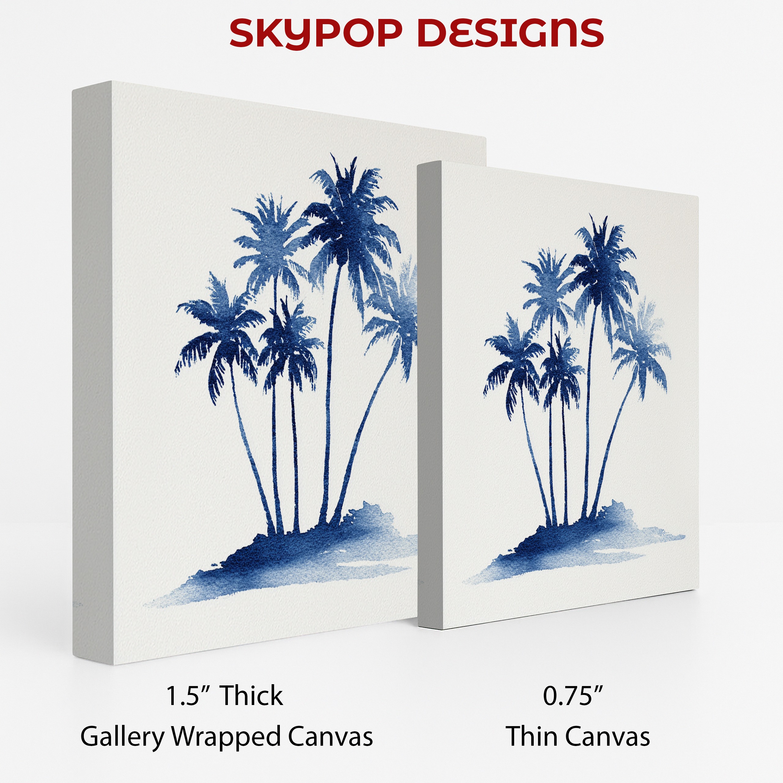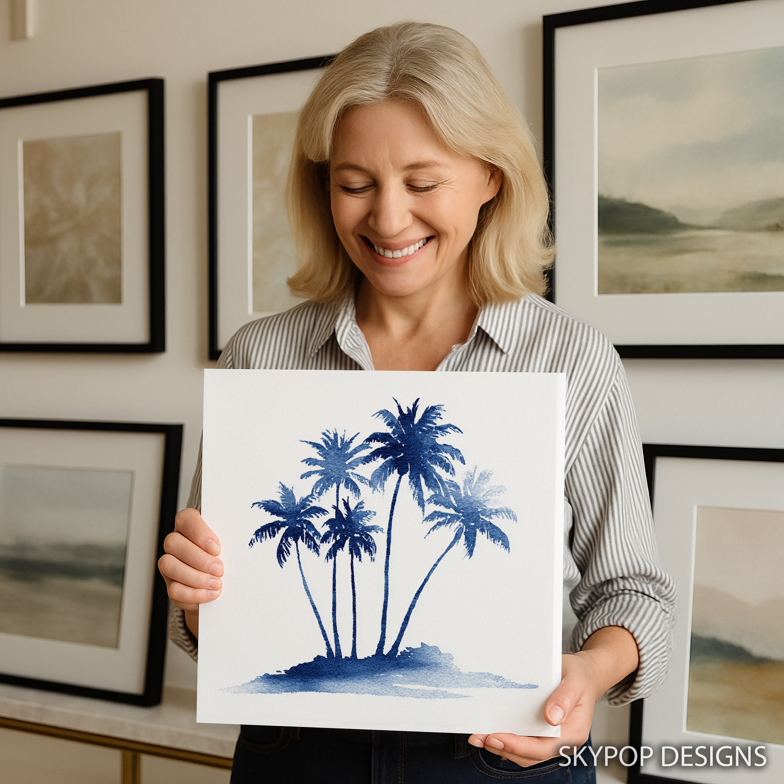 Transform your space with this striking blue palm trees canvas wall art, perfect for bringing a touch of tropical serenity to any room. The minimalist watercolor style creates a calming yet eye-catching focal point that instantly elevates your decor. This versatile poster or canvas print seamlessly blends nature-inspired art with contemporary design, making it ideal for modern living rooms or coastal-themed bedrooms. The monochromatic blue palette evokes a sense of tranquility and ocean vibes, perfect for creating a relaxing atmosphere in your home or office. The delicate brushstrokes and varying shades of blue add depth and texture to the composition, ensuring this wall art remains captivating from every angle. Suitable for minimalist decor enthusiasts, this piece adds a sophisticated touch to clean, uncluttered spaces while maintaining a fresh, modern appeal. The simple yet elegant design makes it a perfect choice for bathroom decor or as a calming addition to a home office. High-quality printing captures every subtle detail of the watercolor technique, from the palm fronds to the gentle shadows. Whether you’re looking to enhance your coastal-inspired interior or bring a taste of the tropics to an urban space, this blue palm trees artwork is a versatile choice. Elevate your home’s atmosphere with this unique blend of nature art and contemporary style that celebrates serene, beachy vibes. Transform your walls and create a peaceful oasis in your home today with this stunning blue palm trees canvas art.