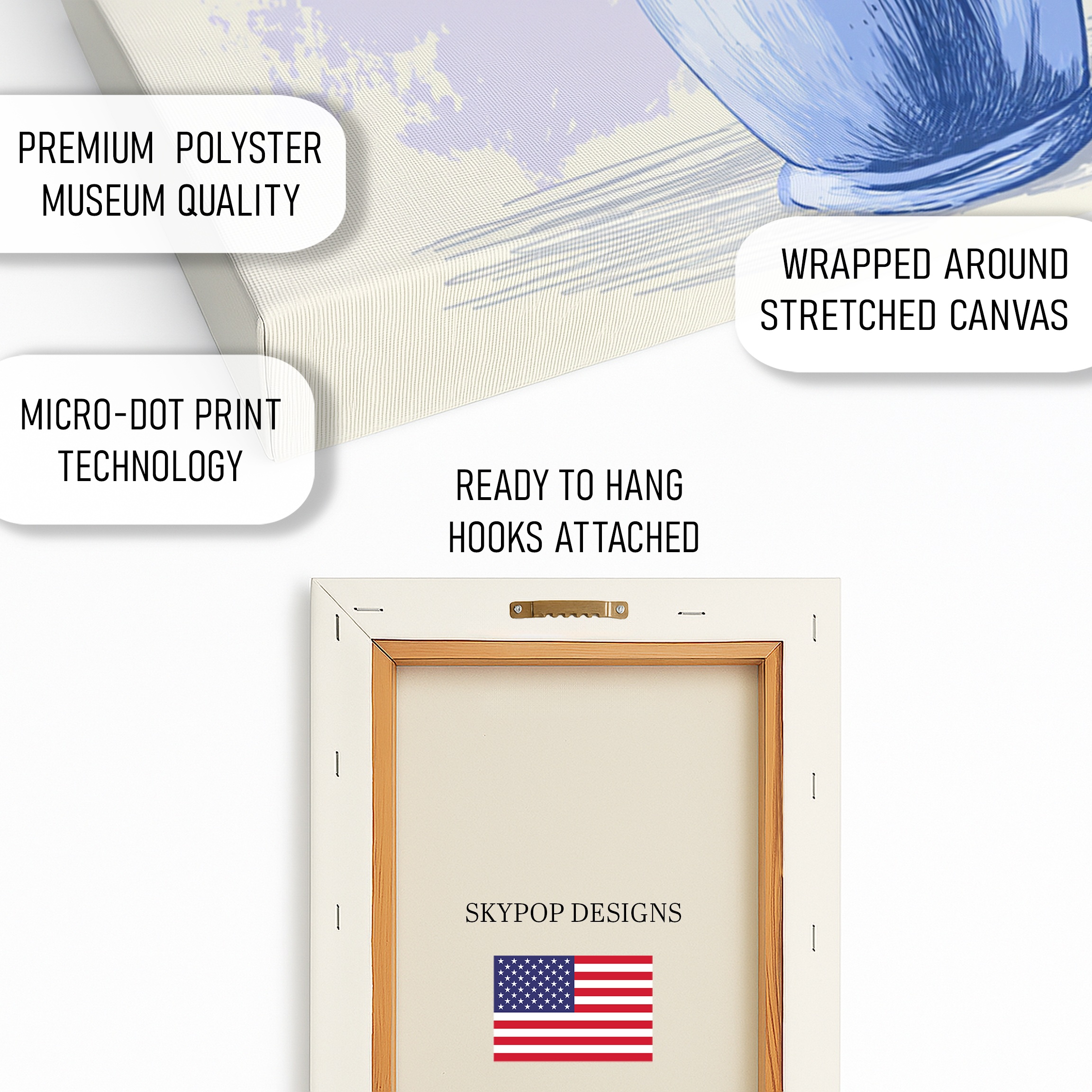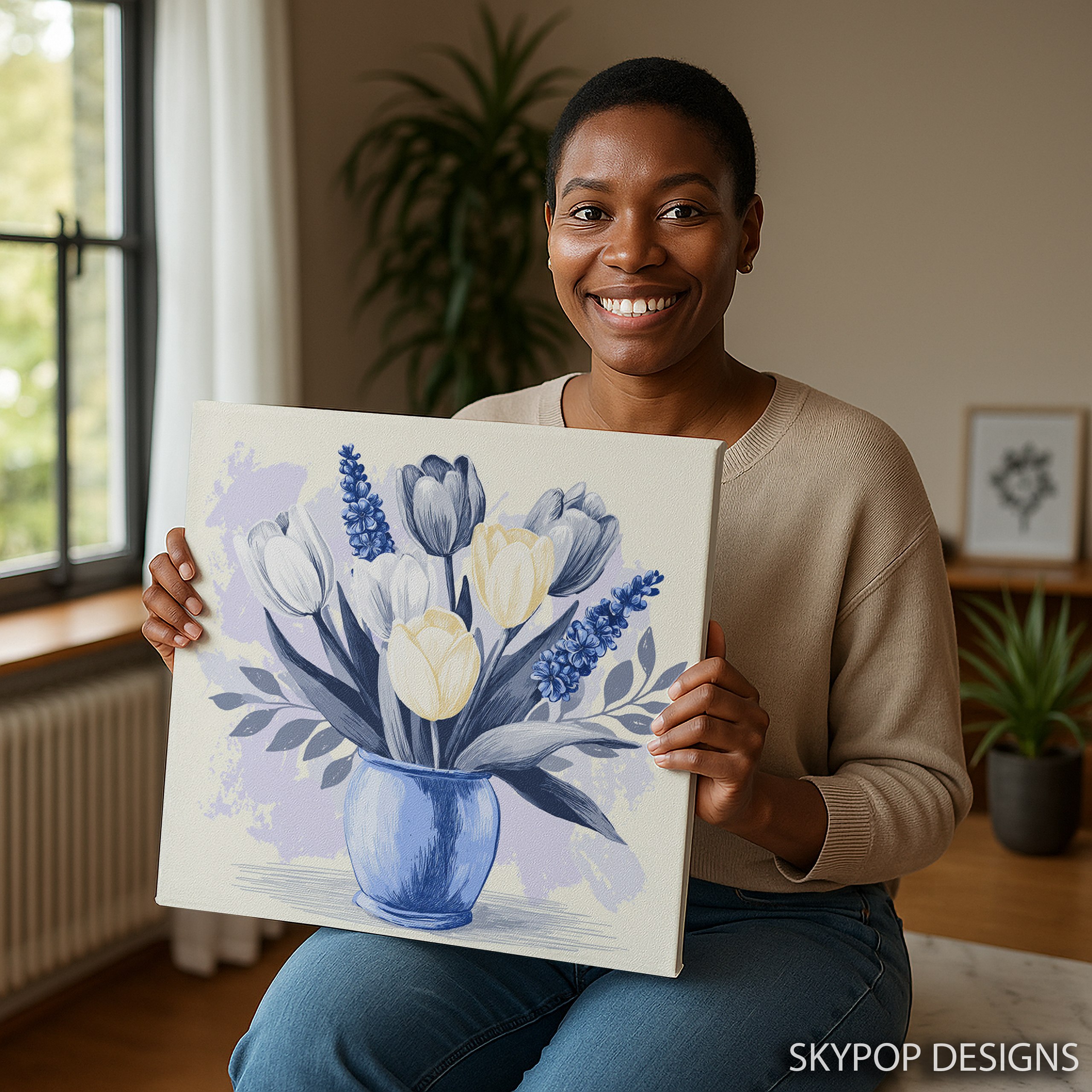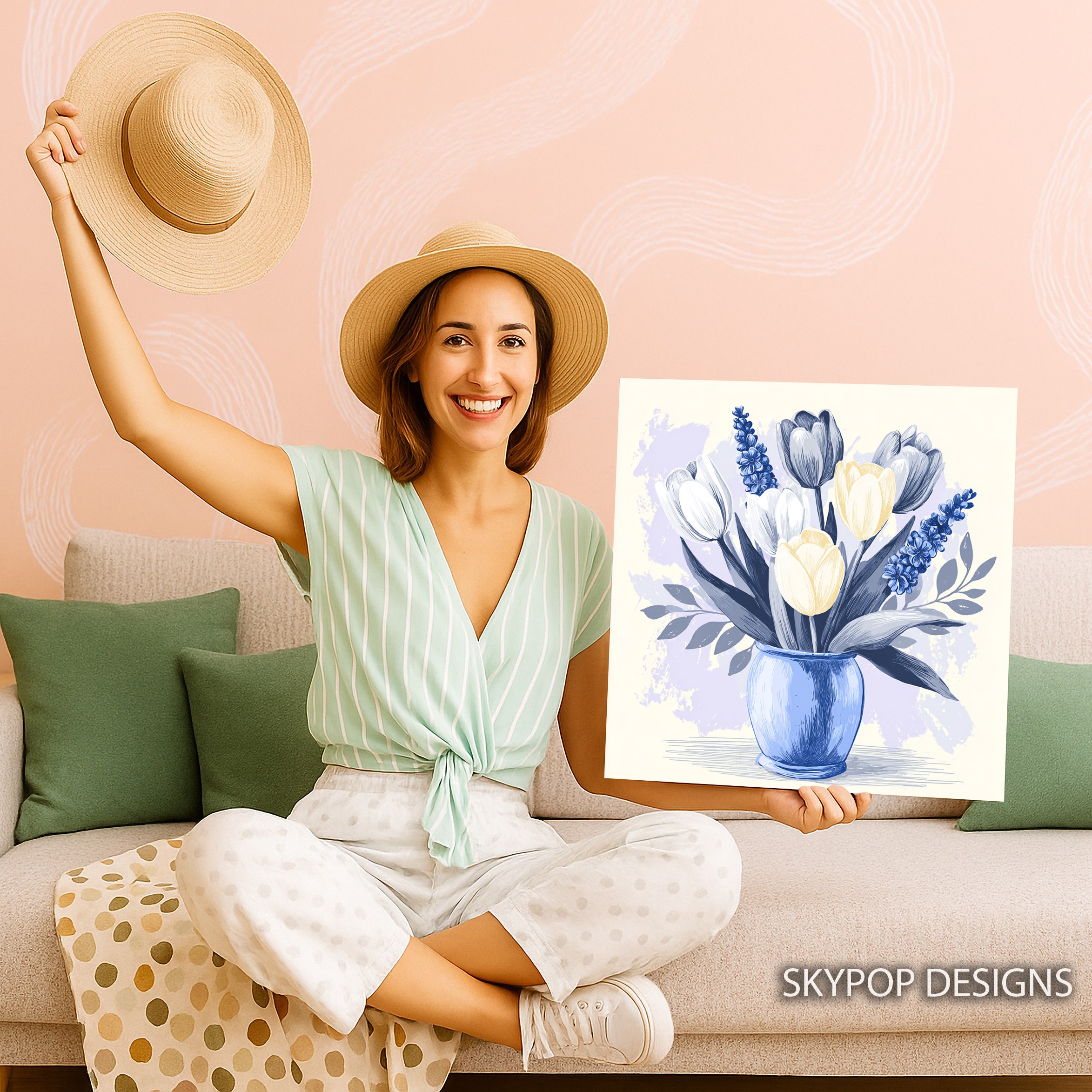 Bring a breath of fresh spring into your home with this stunning blue tulip bouquet canvas wall art. This contemporary floral poster captures the essence of modern simplicity with its elegant composition of tulips and delicate blue flowers in a light blue vase. Perfect for elevating your living room, bedroom, or office decor, this nature-inspired artwork adds a touch of serenity and sophistication to any space. The cool blue tones mixed with soft whites and gentle yellows create a calming atmosphere, ideal for those seeking a tranquil environment. This versatile canvas print complements both minimalist and Scandinavian interior styles, making it a versatile choice for various room settings. The artful arrangement of flowers against a subtle background draws the eye and becomes an instant focal point. Whether you’re looking to refresh your dining room or add a pop of color to a neutral space, this tulip art poster offers the perfect blend of natural beauty and modern design. Crafted with high-quality printing techniques, every petal and leaf is rendered in vivid detail, ensuring this piece remains a timeless addition to your wall art collection. Transform your home decor today with this captivating blue tulip bouquet artwork that celebrates the simple elegance of nature.