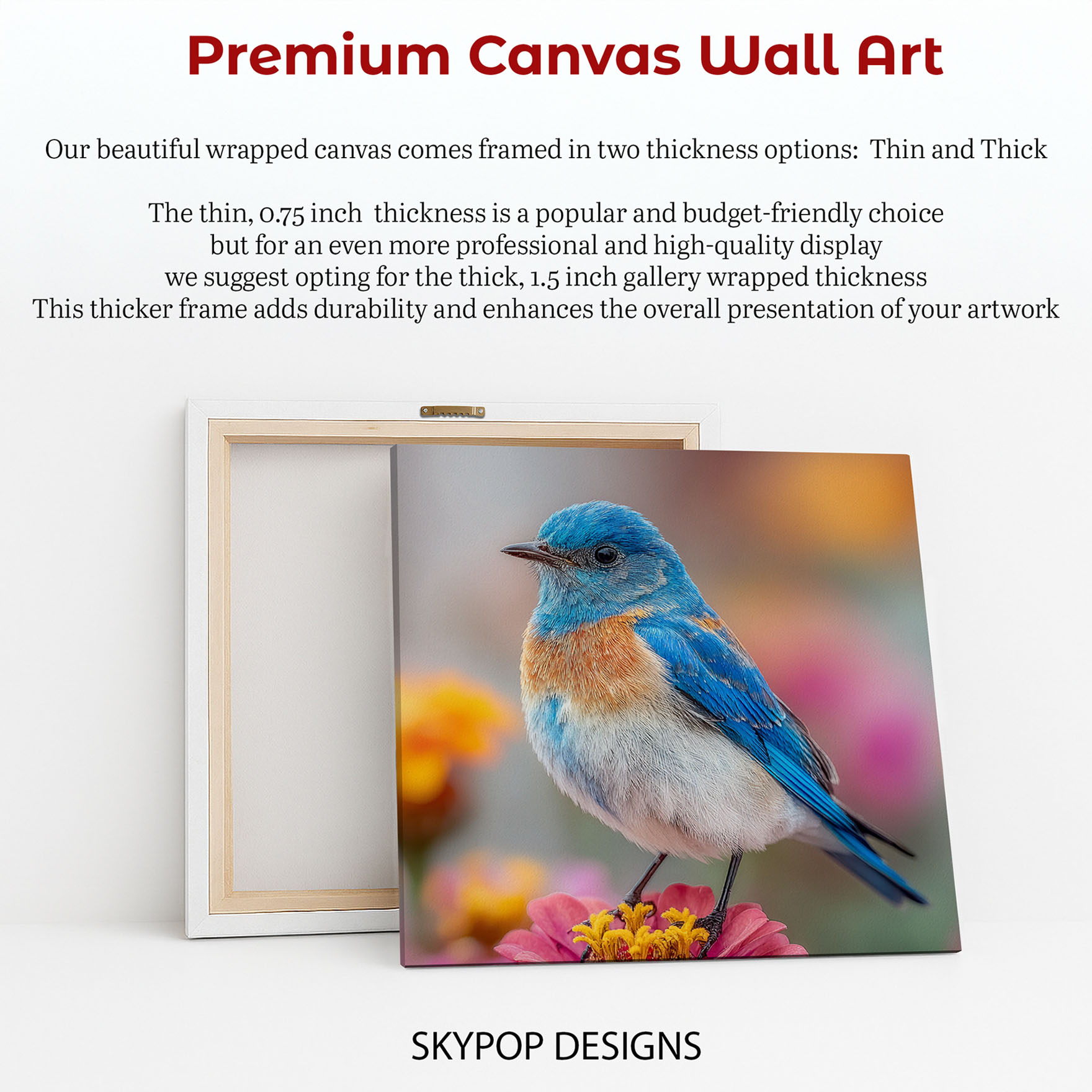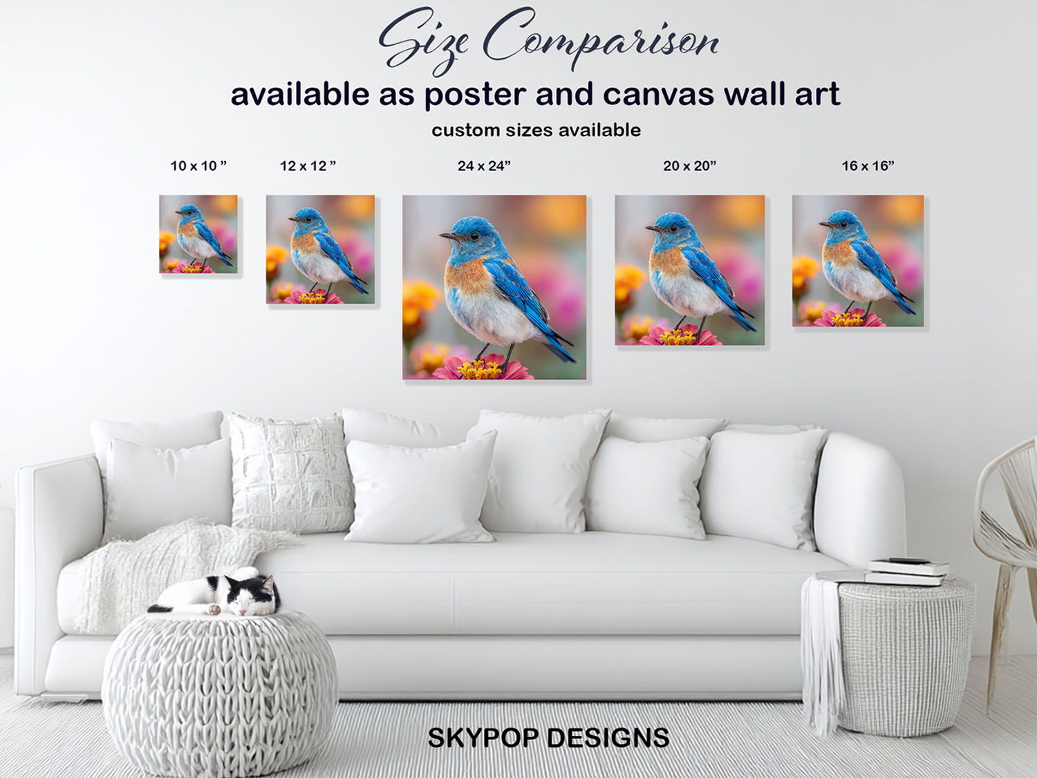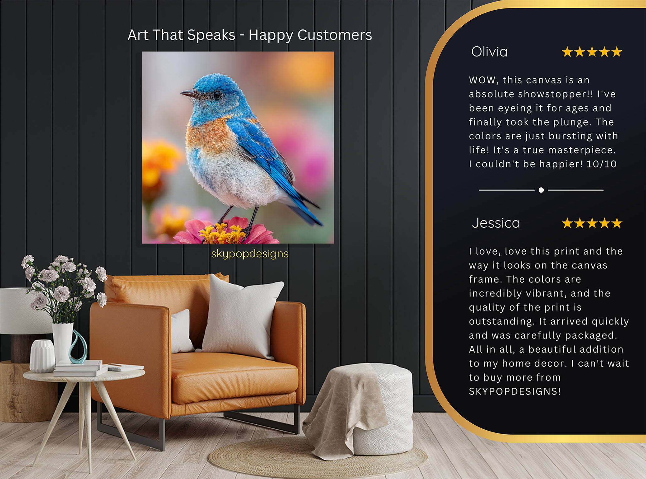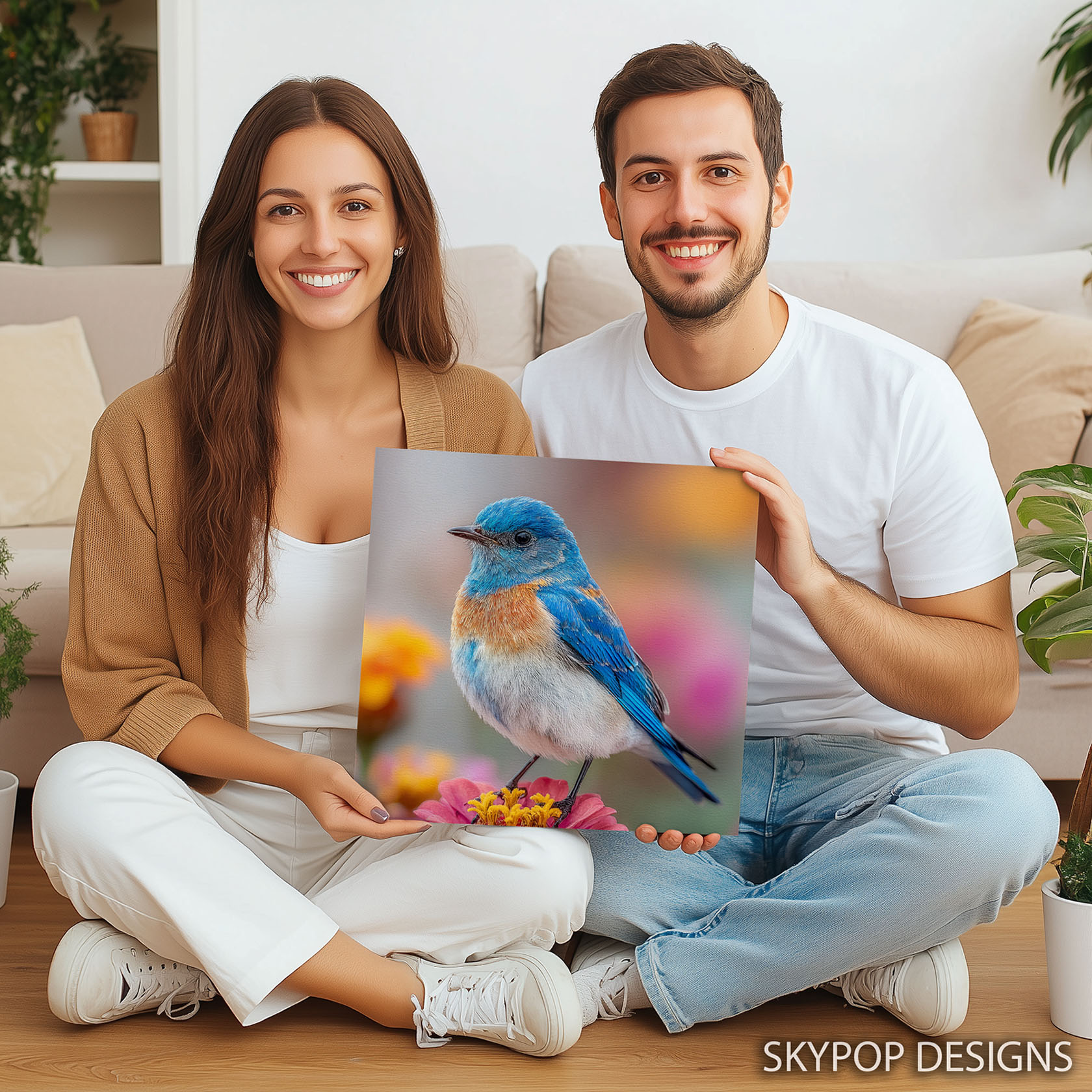 Bring the beauty of nature indoors with this stunning Eastern Bluebird canvas wall art. This vibrant poster or canvas showcases a captivating bluebird perched delicately on a colorful flower, instantly transforming any living room or bedroom into a tranquil oasis. The striking blue of the bird’s plumage contrasts beautifully with the soft pink and yellow hues of the surrounding blossoms, creating a visually appealing piece that enhances any decor style, from modern to farmhouse. Ideal for offices or sunrooms, this nature art inspires peace and brings a touch of the outdoors in. The detailed rendering of the feathers and floral elements makes this canvas wall art a true work of art, perfect for elevating your home’s aesthetic. Its versatile color palette complements a range of interiors, adding a pop of natural color and serenity. This eye-catching artwork is perfect for bird lovers and those seeking a cheerful addition to their wall art collection. As a thoughtful housewarming gift or a birthday surprise, this bluebird print offers lasting beauty and joy. High-quality printing ensures rich colors and sharp details, making this poster a standout piece. Embrace the calming influence of nature with this exquisite bird art and create a more vibrant and welcoming atmosphere. Elevate your space with this beautiful Bluebird On Flower canvas art today.