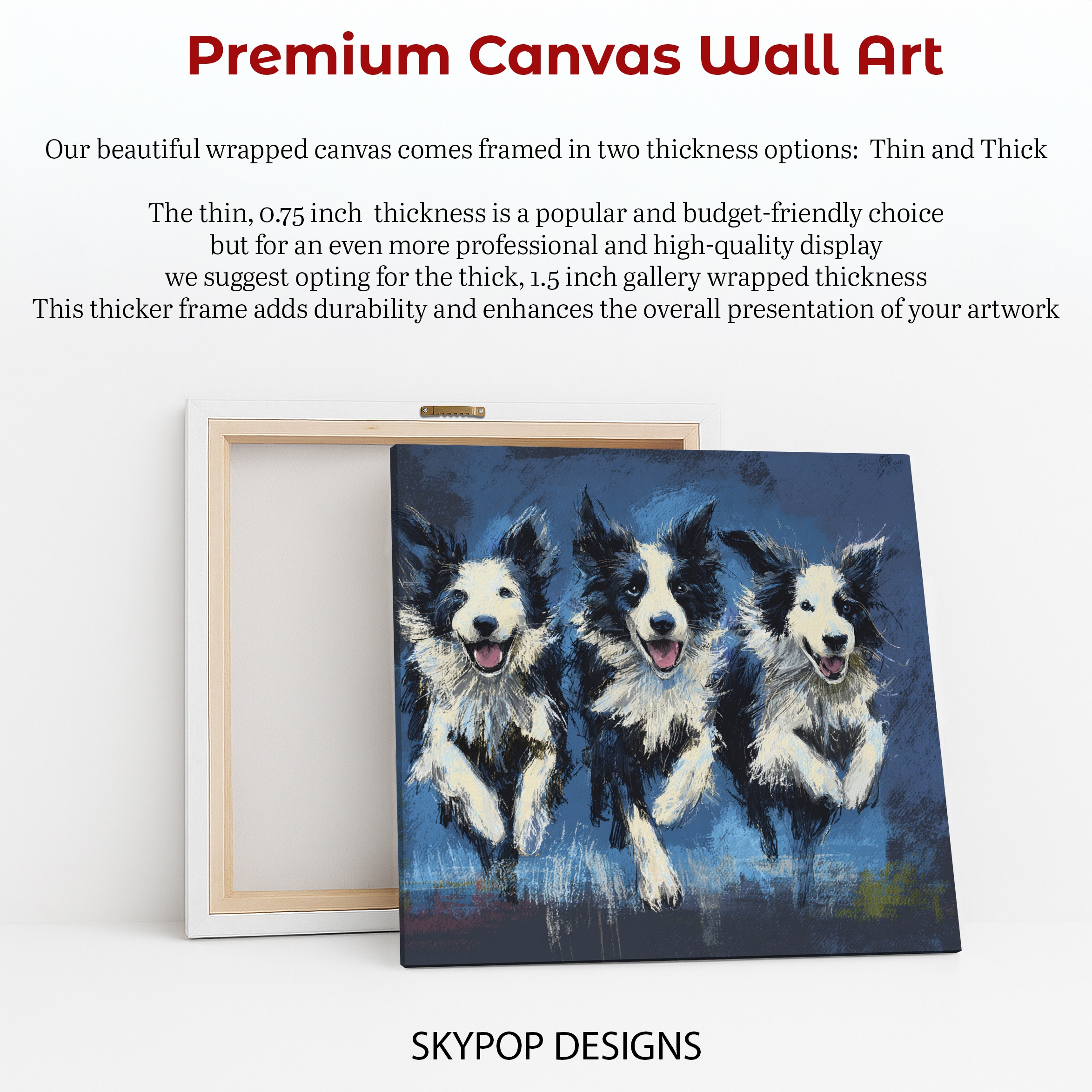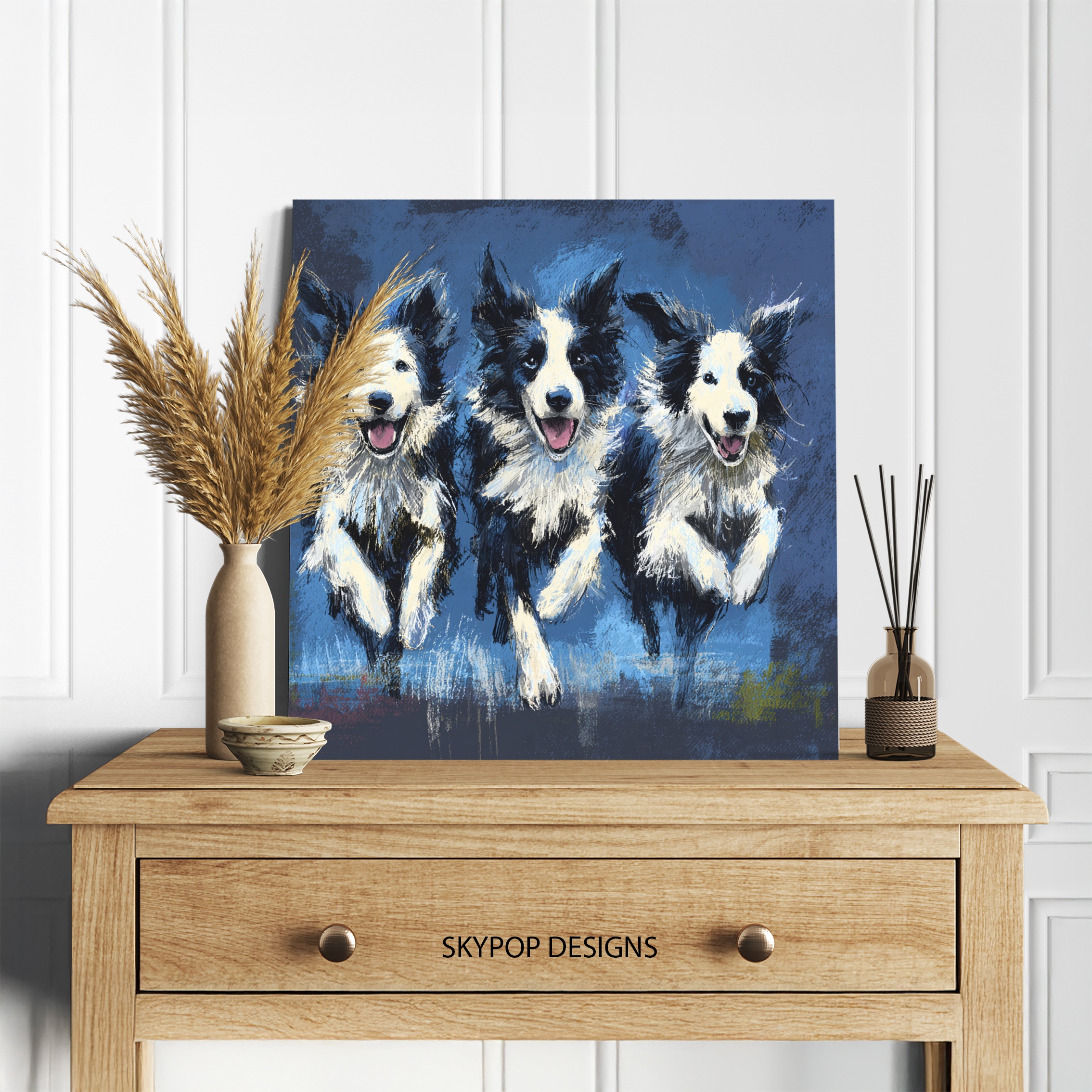 Bring the energy and charm of Border Collies into your home with this captivating canvas wall art featuring three playful pups. This striking poster showcases the intelligence and vivacity of these beloved herding dogs, making it a perfect addition to any dog lover’s decor. The vibrant blue background creates a stunning contrast against the black and white fur of the Border Collies, instantly drawing the eye and adding a pop of color to your space. Ideal for modern farmhouse or rustic interiors, this canvas art celebrates the spirit of working dogs while maintaining a contemporary edge. The expressive faces and alert postures of the dogs capture their keen personalities, bringing life and movement to any room. Whether displayed in a cozy living room, a child’s bedroom, or a home office, this Border Collie wall art sparks joy and conversation. The dynamic composition of the three dogs side-by-side creates a sense of companionship and teamwork, perfect for motivating spaces or family areas. High-quality printing ensures every detail of their fluffy coats and bright eyes is faithfully reproduced, making this piece a standout in your art collection. Gift this heartwarming canvas to the dog enthusiast in your life or use it to elevate your own home decor. Transform your walls with this charming tribute to man’s best friend and enjoy the warmth these furry friends bring to your daily life.
