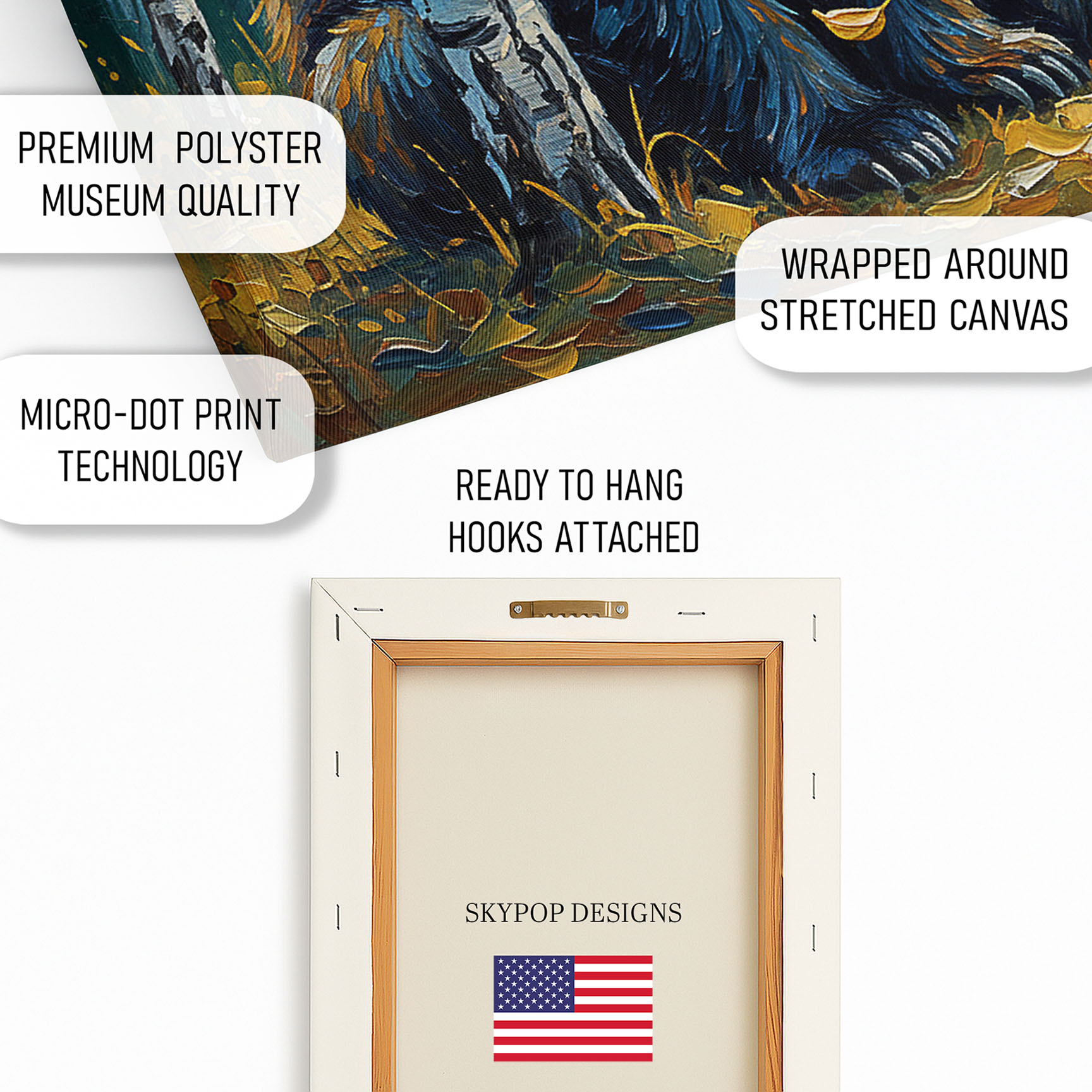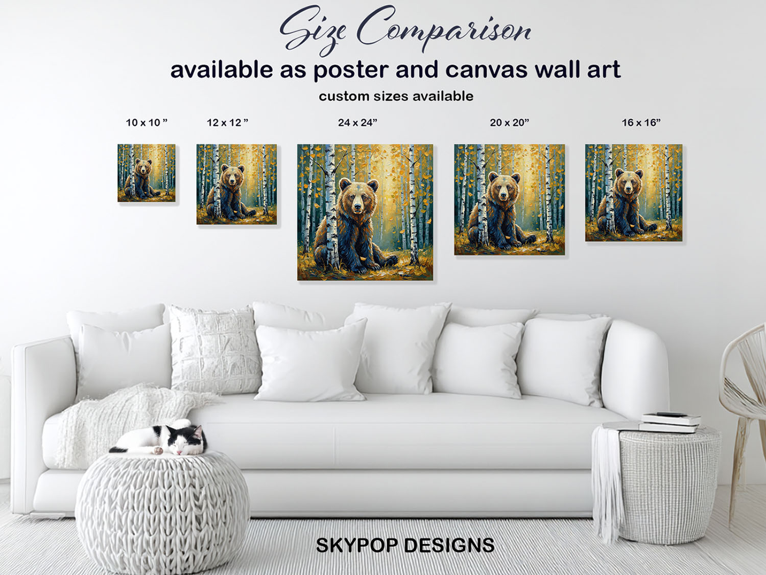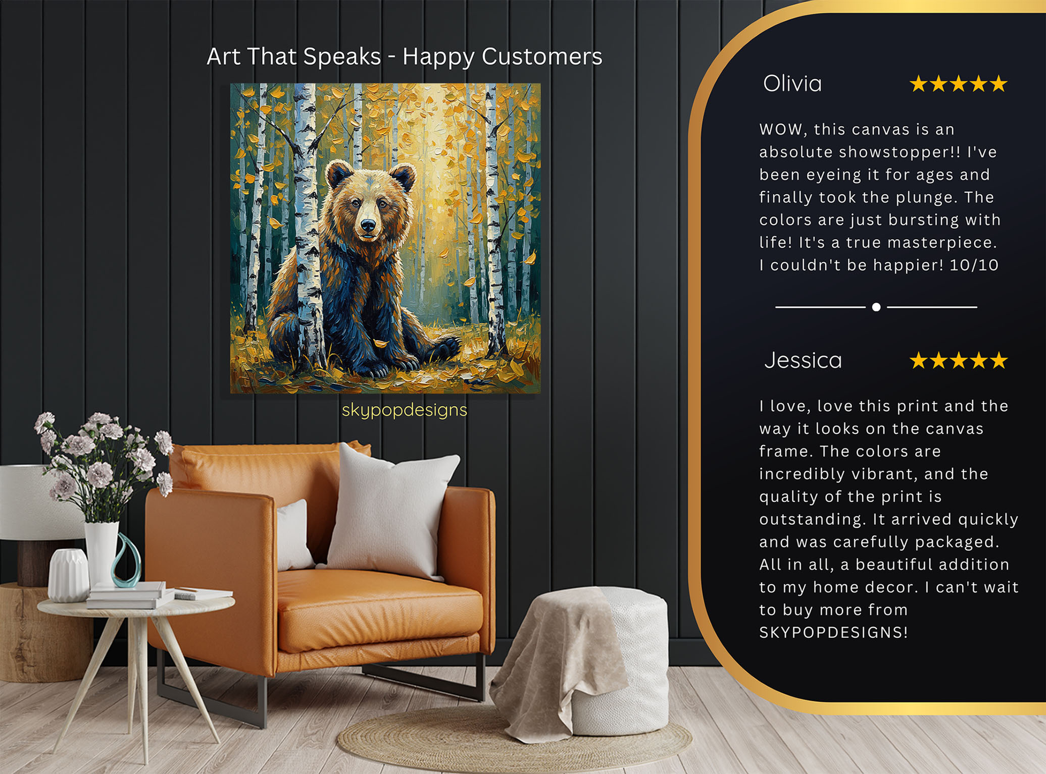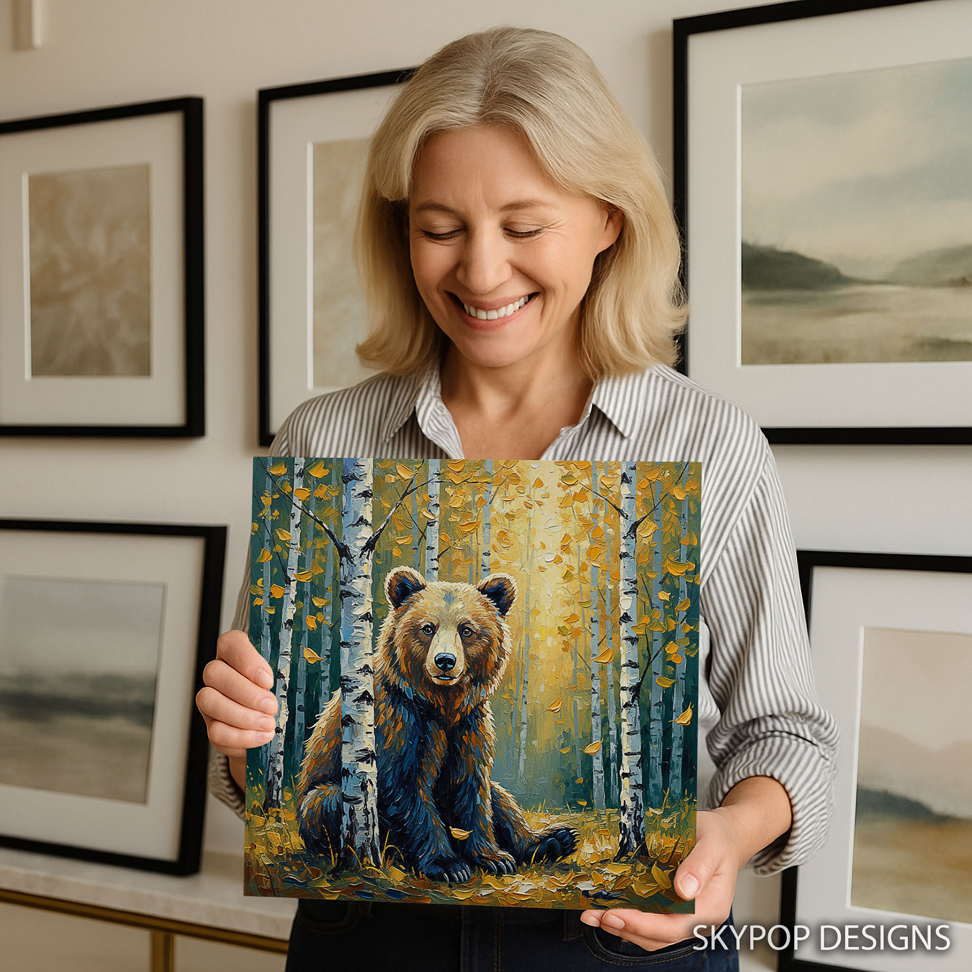 Bring the serene beauty of nature into your home with this captivating bear canvas wall art, showcasing a majestic brown bear amidst a vibrant autumn forest. This striking poster or canvas wall art is perfect for transforming your living room decor or adding a touch of wilderness to your office space. The rich brown and yellow hues evoke a warm, inviting atmosphere, embodying the spirit of autumn and natural tranquility. Ideal for rustic and farmhouse decor styles, this animal art piece also complements contemporary settings with its bold strokes and impressive subject. The bear, a symbol of strength and resilience, is rendered with impressive detail, making this canvas wall art a true focal point. High-quality printing ensures the texture of the brushstrokes and the depth of color are beautifully preserved on this poster or canvas wall art. Whether displayed in a cozy bedroom, a welcoming entryway, or a private office, this artwork enhances any room with its captivating presence. This nature art makes a thoughtful housewarming gift or a perfect addition for any nature lover’s collection. The vivid colors and immersive scene create a stunning visual experience that will inspire and uplift your everyday. Elevate your wall decor with this magnificent bear canvas art, a piece that celebrates the wild outdoors and adds character to your home. Transform your space today with this unique and memorable wall art option.