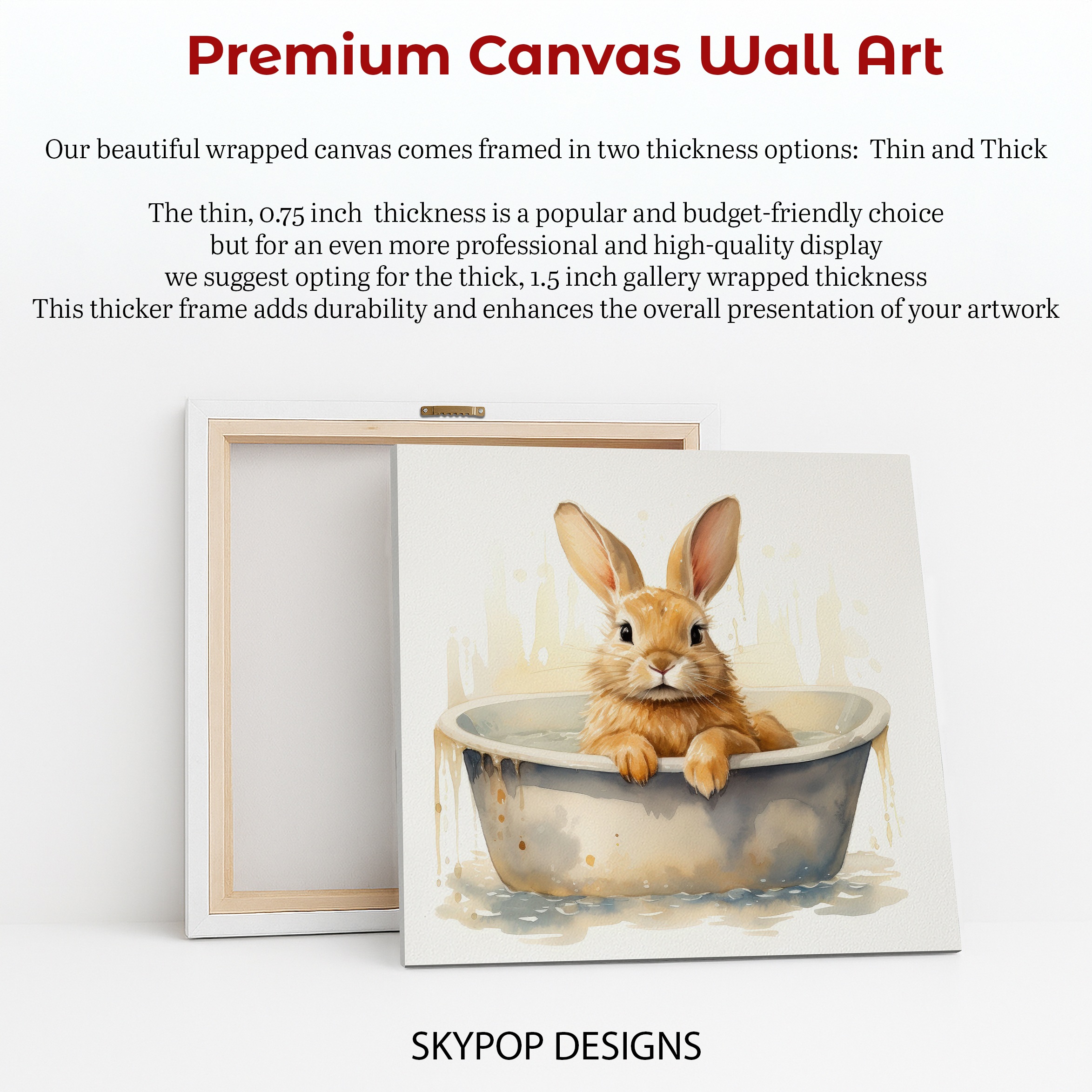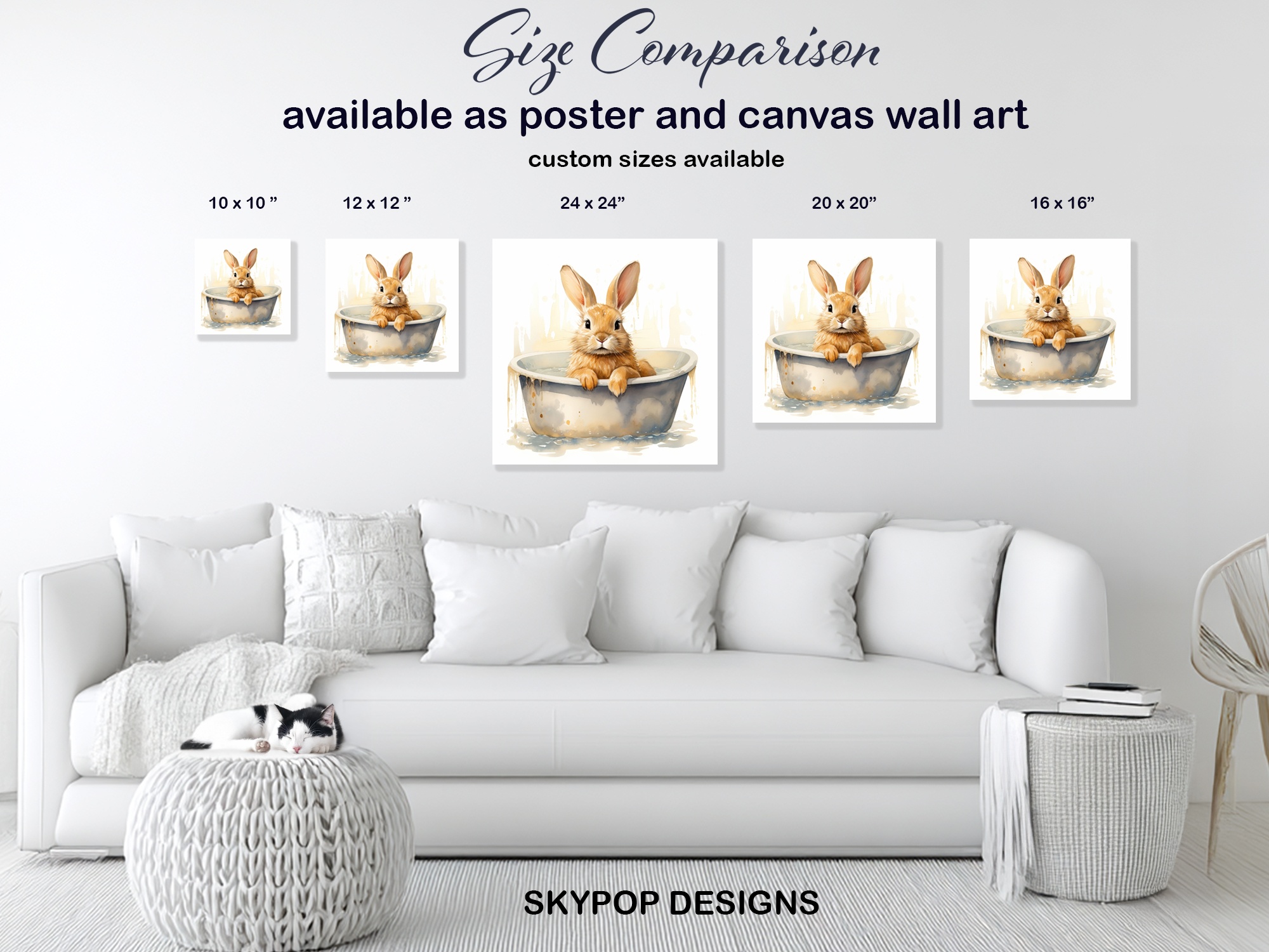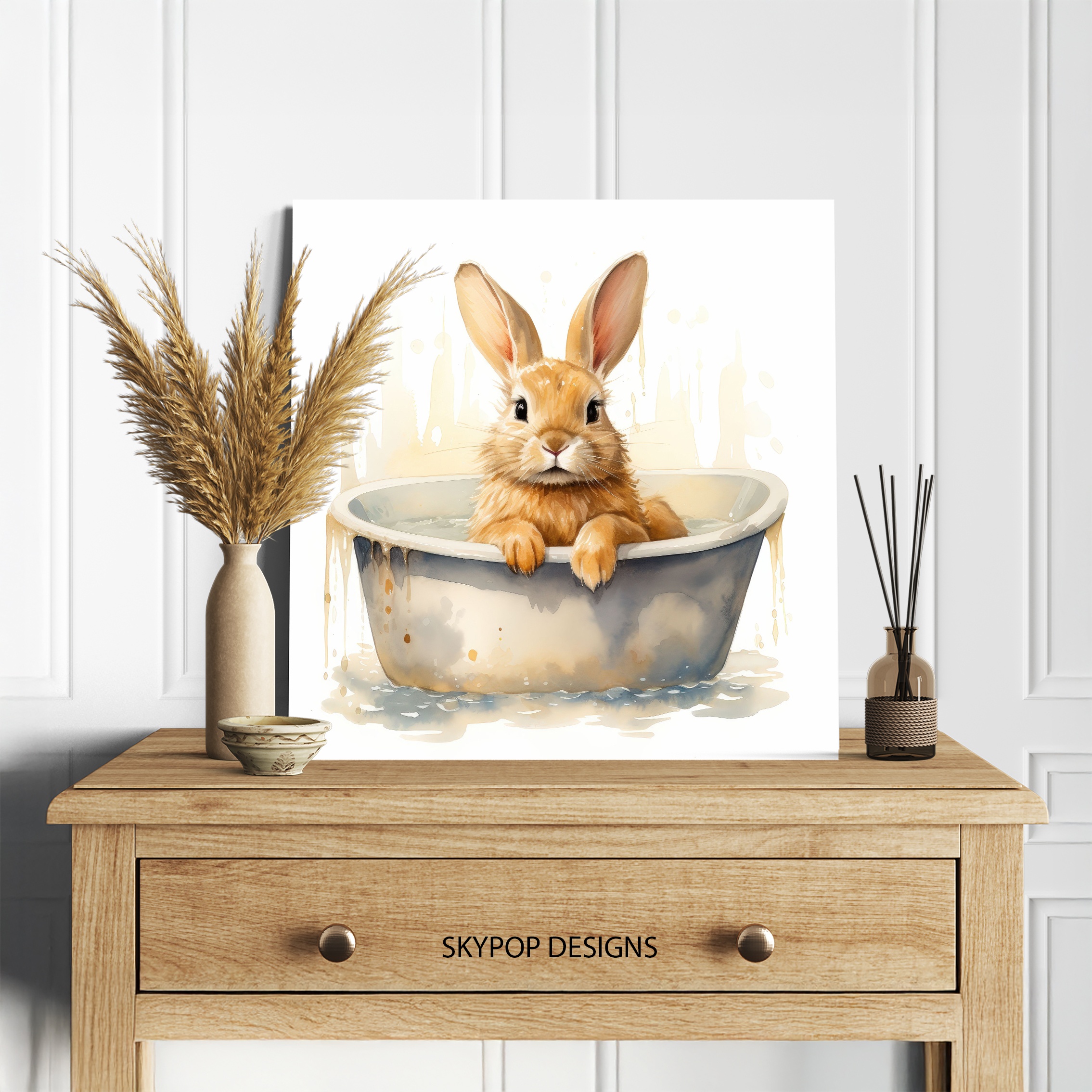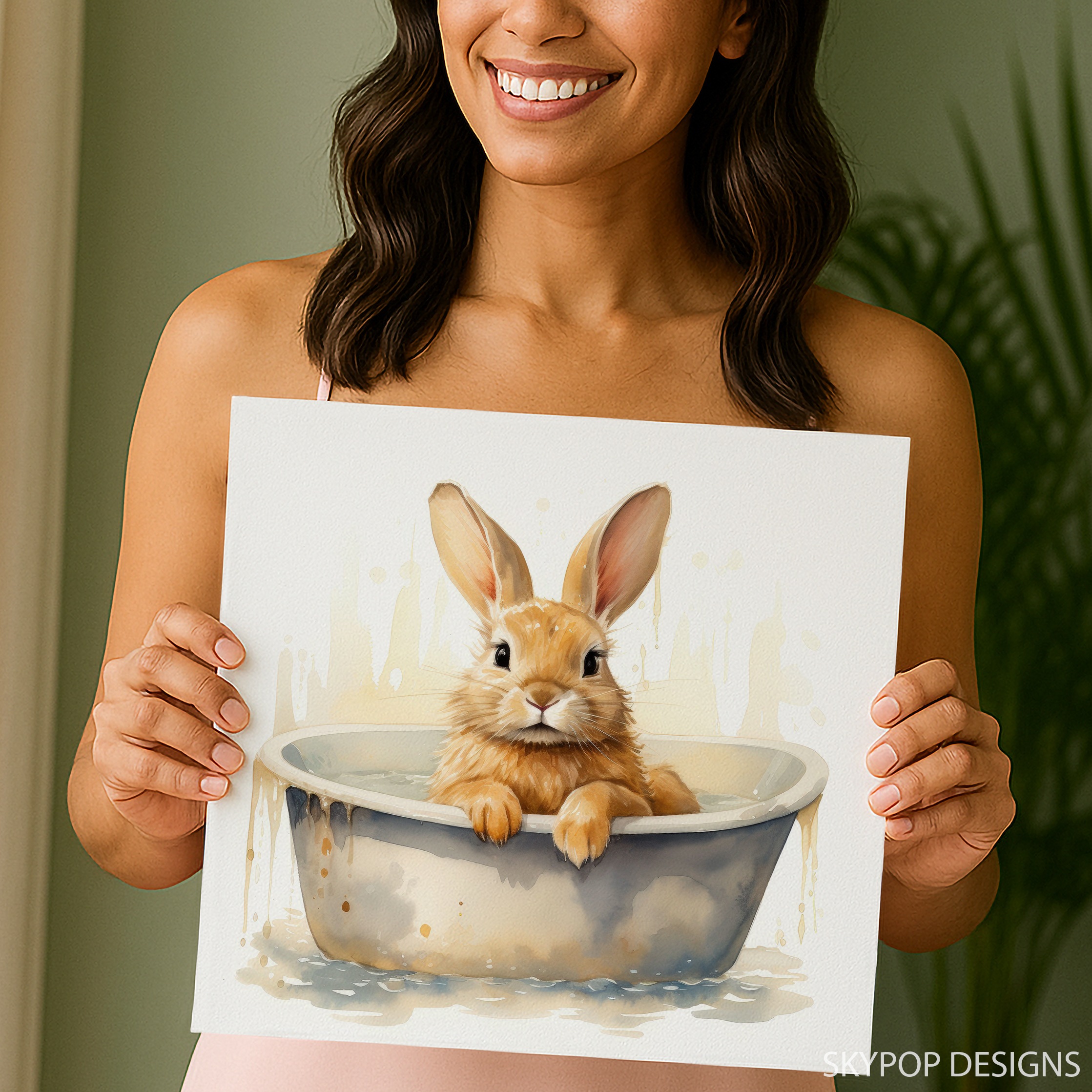 Keywords: Bunny Art, Watercolor Bunny, Animal Wall Art, Whimsical Decor, Bohemian Art, Farmhouse Art, Modern Art, Nursery Decor, Bathroom Art, Bedroom Art, Children’s Room Art, Multicolor Art, Beige Art, Brown Art, White Accents, Cute Bunny Art, Bunny Bathing, Watercolor Poster, Animal Lover Gift, Housewarming Gift, Birthday Gift, Easter Gift, Home Decor, Wall Decor, Canvas Art, Animal Print, Nature Art, Cute Animal Art, Playful Art, Cozy Decor