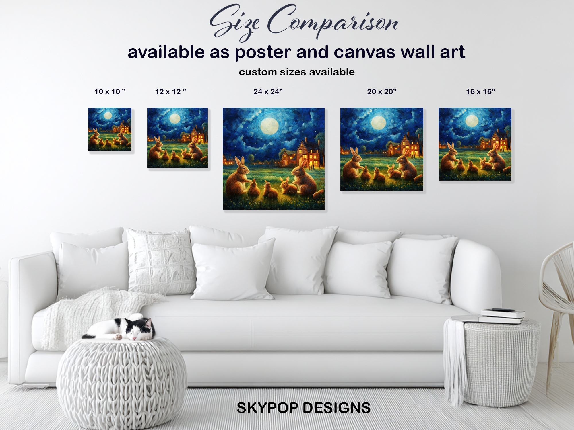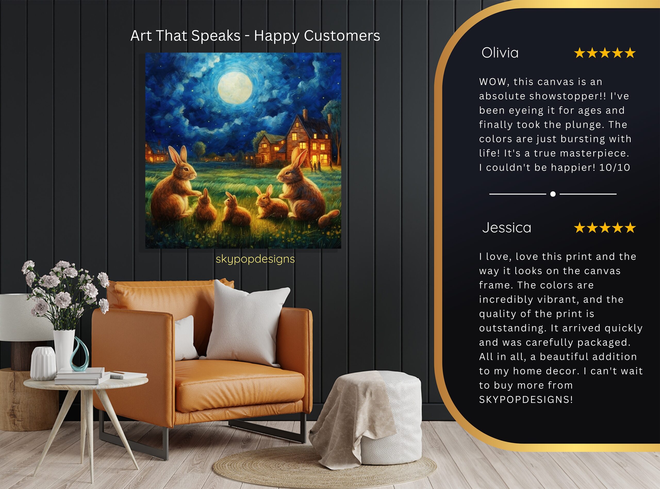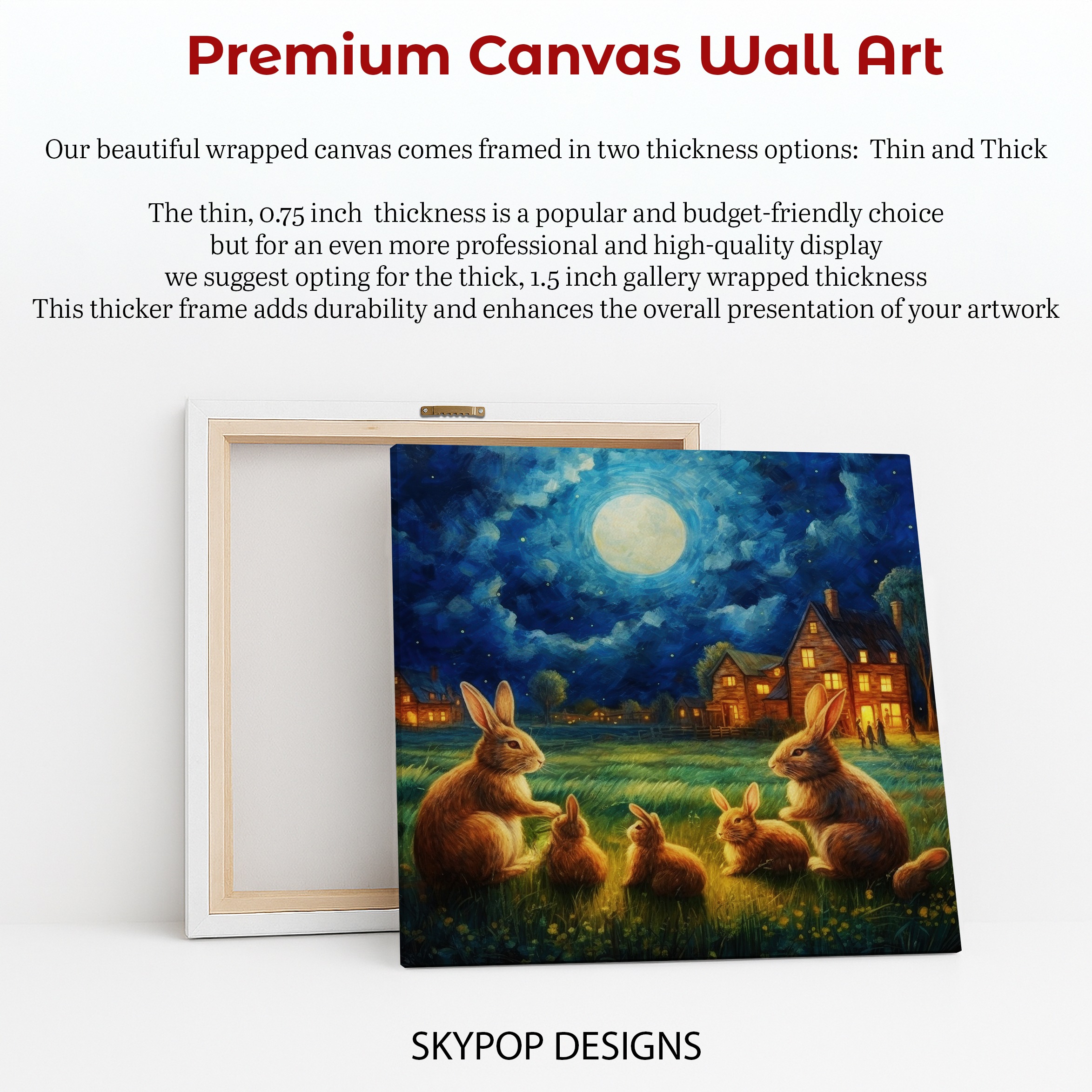 Keywords: Whimsical Art, Nature Art, Impressionism Art, Rustic Decor, Farmhouse Decor, Bunny Art, Moonlit Gathering, Canvas Wall Art, Blue Wall Art, Brown Wall Art, Yellow Wall Art, Multicolor Art, Living Room Art, Bedroom Art, Children’s Room Art, Entryway Decor, Animal Art, Woodland Creatures, Cozy Home Decor, Tranquil Scene, Peaceful Art, Gift for Her, Birthday Gift, Housewarming Gift, Home Decor Gift, Textured Art, Painterly Style, Enchanting Art, Magical Art, Nature’s Beauty