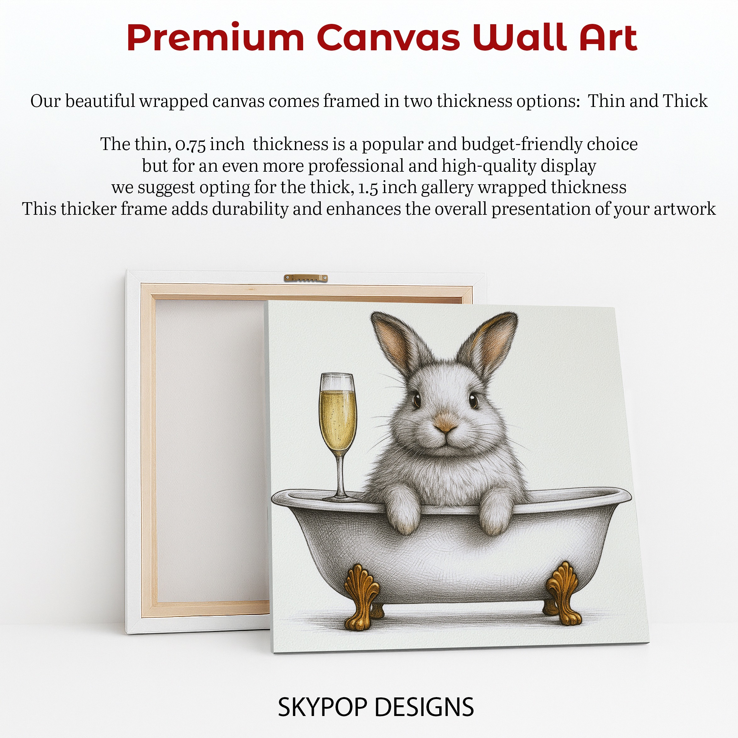 Add a touch of whimsy and luxury to your space with this delightful bunny champagne bath canvas wall art. This charming poster features an adorable white rabbit peeking out of a clawfoot bathtub, accompanied by a sparkling glass of champagne. Perfect for modern bathrooms or bedrooms, this unique wall art brings a smile to your face every day. The detailed pencil-like sketch creates a sophisticated yet playful atmosphere, ideal for contemporary home decor. The gold accents on the bathtub feet add a touch of glamour, making this piece a standout in minimalist interiors. Transform your living room or dining area with this conversation-starting artwork that combines animal cuteness with adult humor. The neutral color palette ensures this canvas art complements various decor styles, from sleek modern to cozy farmhouse. Elevate your wall decor with this versatile piece that works as a standalone statement or as part of a gallery wall. The high-quality printing captures every intricate detail, from the bunny’s fluffy fur to the bubbles in the champagne glass. Whether you’re looking for a housewarming gift or treating yourself, this bunny bath art brings joy and style to any room. Make your space more inviting and memorable with this unique blend of animal art and contemporary design. Order now to add a touch of whimsical elegance to your home!