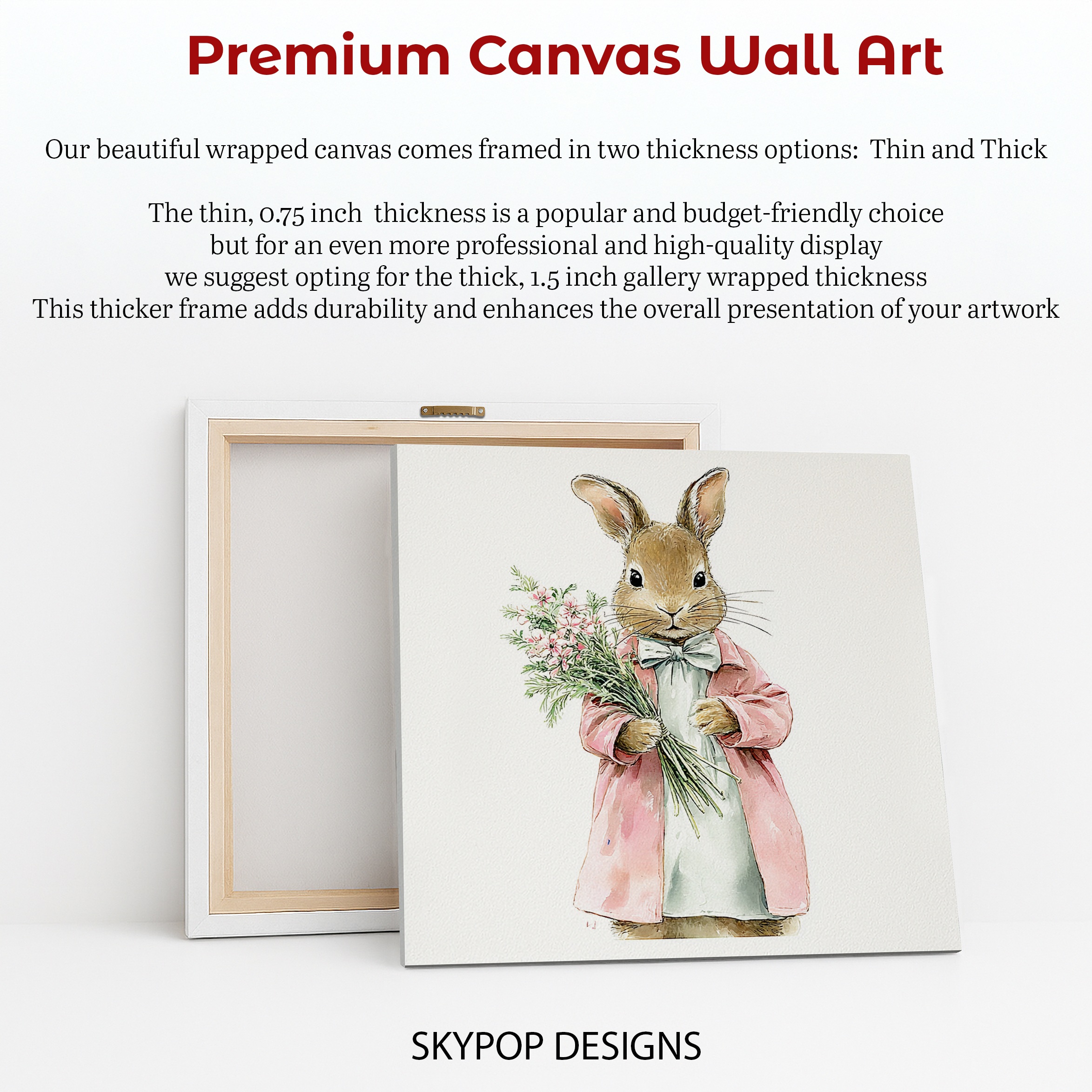 Add a touch of whimsy to your space with this adorable bunny canvas wall art. This charming poster features a cute rabbit dressed in a pink coat, holding a beautiful bouquet of spring flowers. Perfect for farmhouse or shabby chic decor, this nature-inspired piece brings a sense of warmth and nostalgia to any room. The soft color palette of pink, brown, and green creates a soothing atmosphere, ideal for nurseries or children’s bedrooms. This versatile canvas art works beautifully as a focal point in living rooms or as part of a gallery wall. The delicate watercolor style captures every detail, from the bunny’s fuzzy ears to the delicate petals of the flowers. This poster makes an excellent gift for baby showers, Easter celebrations, or anyone who loves bunnies and floral motifs. The high-quality printing ensures vibrant colors and crisp details that will last for years. Whether you’re decorating a country-style home or adding a touch of nature to a modern space, this bunny wall art brings joy and character to any interior. The sweet expression on the bunny’s face and its dapper bow tie add extra charm to this already delightful piece. Transform your room with this enchanting bunny artwork that celebrates the beauty of nature and the innocence of childhood. Elevate your home decor today with this irresistible bunny flower art that’s sure to make everyone smile.