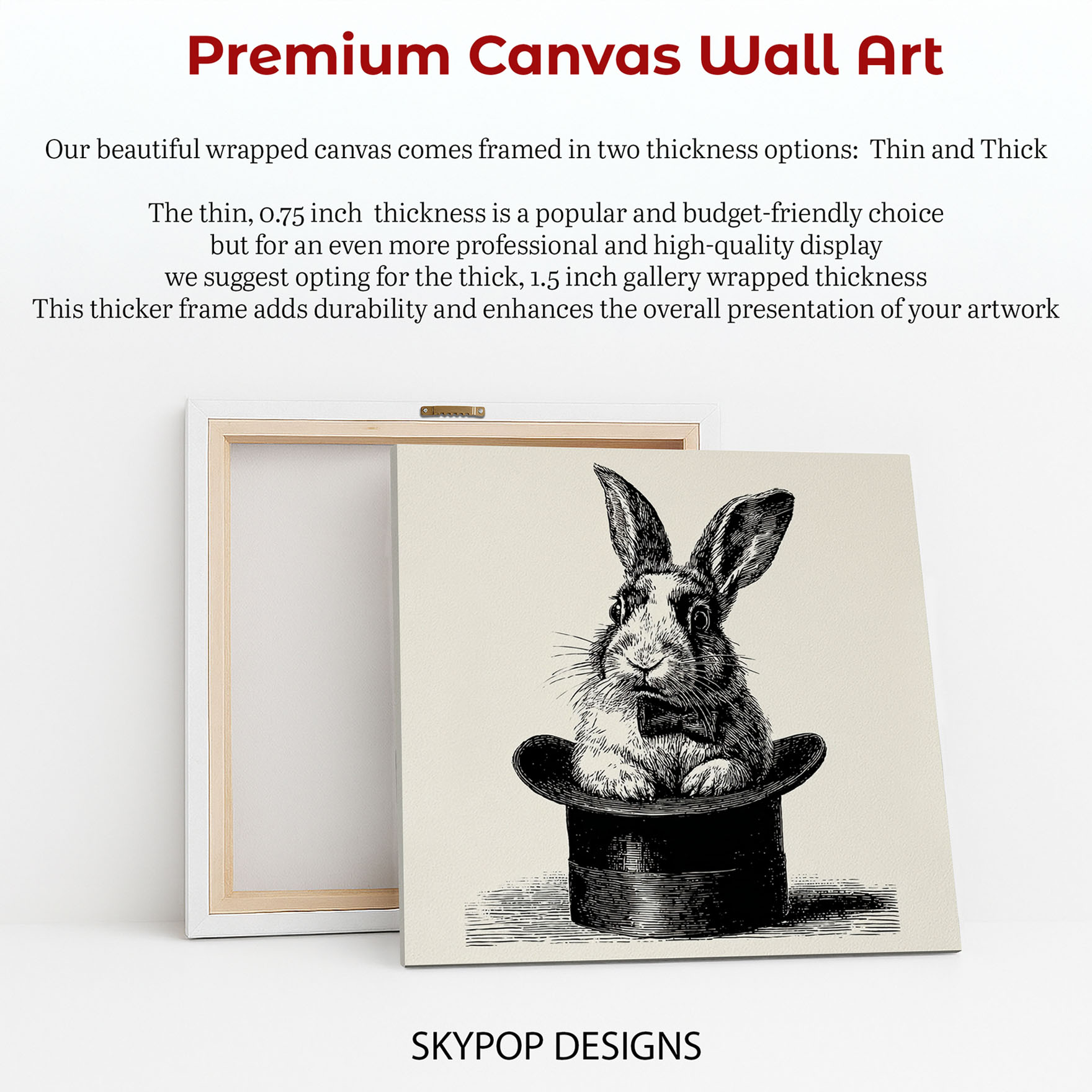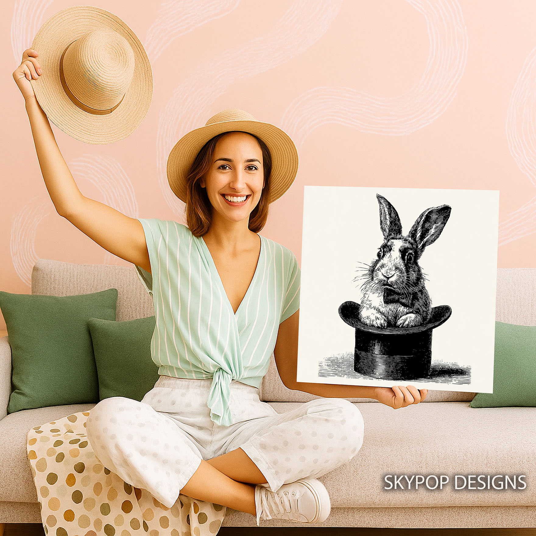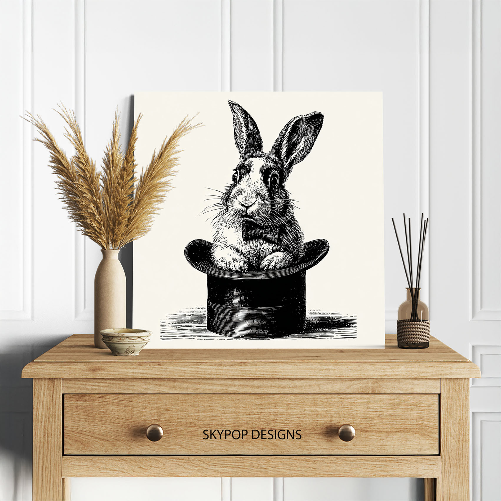 Bring a touch of vintage charm and whimsical wonder to your home with this delightful Bunny in a Hat canvas wall art. This striking poster or canvas wall art showcases a beautifully rendered bunny peeking out of a classic top hat, rendered in a detailed etching style. The black and white palette with soft beige undertones makes this animal art piece a versatile addition to any room, perfect for transforming your living room walls or adding a playful touch to a nursery or children’s room decor. Ideal for farmhouse, bohemian, or Victorian-inspired spaces, this bunny artwork adds personality and a hint of magic. Showcase this captivating canvas wall art in your entryway to greet guests with a smile or hang it in a cozy reading nook to inspire imaginative stories. The intricate linework and classic aesthetic evoke a sense of nostalgia, making this poster a unique statement piece. High-quality printing ensures every detail of the bunny’s fur and the hat’s texture is preserved, creating a truly immersive visual experience on your wall art. This bunny canvas art is a thoughtful housewarming gift or a lovely present for birthdays and holidays, bringing joy to art lovers of all ages. Elevate your home decor with this timeless animal artwork that celebrates the simple pleasures and evokes a sense of playful curiosity. Make your walls stand out with this charming Bunny in a Hat canvas wall art, a perfect blend of classic style and whimsical appeal. Transform your space today with this enchanting piece.