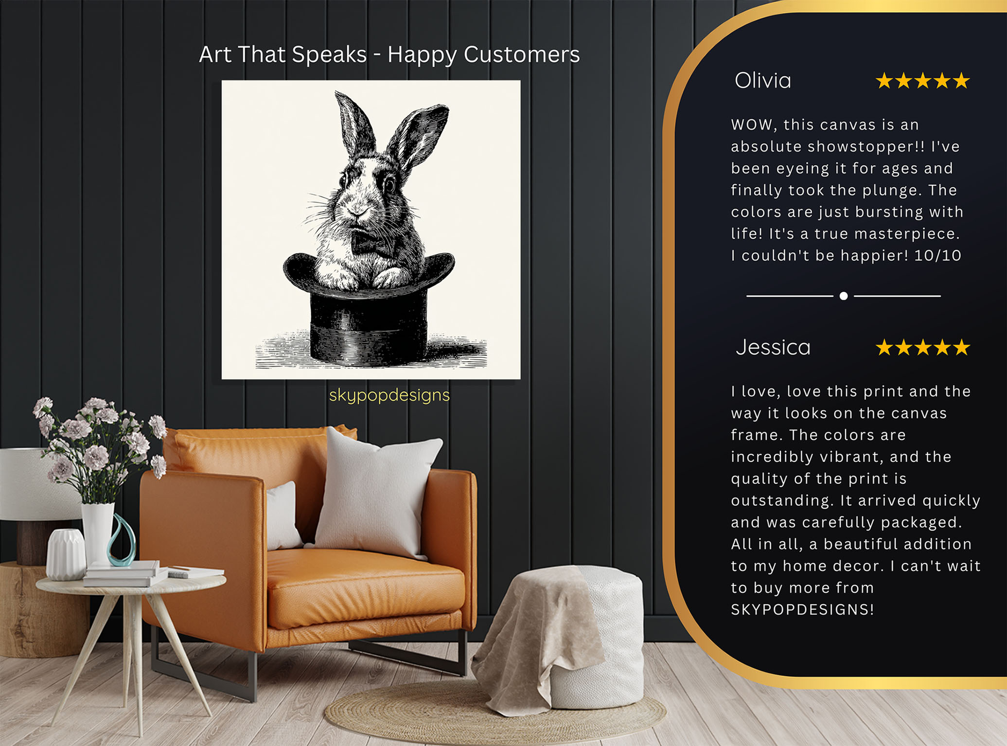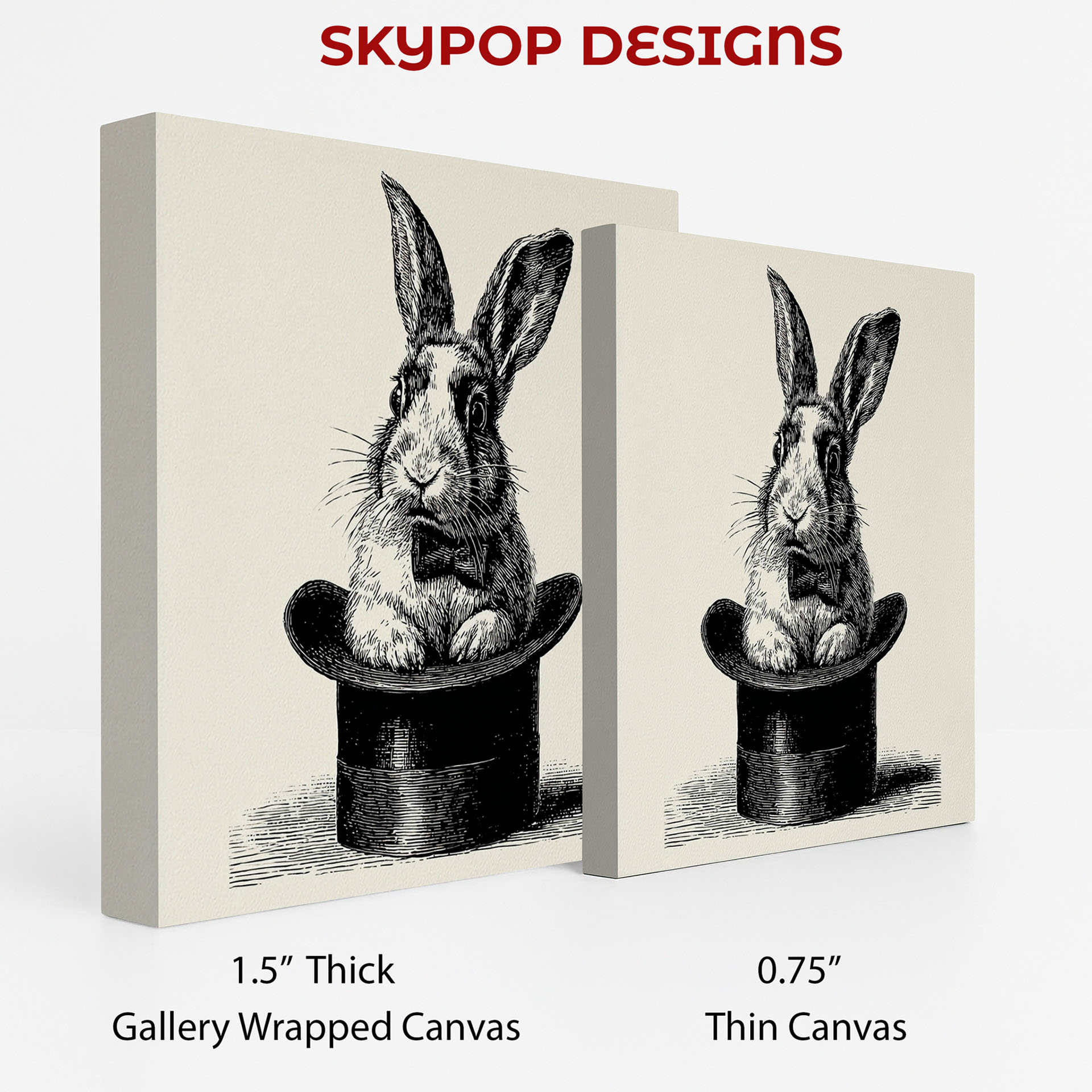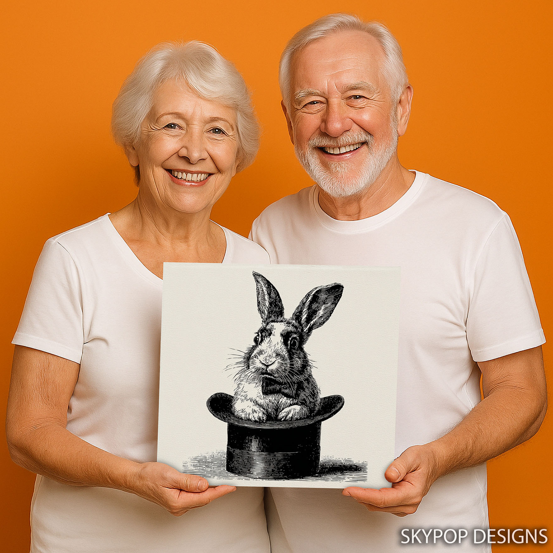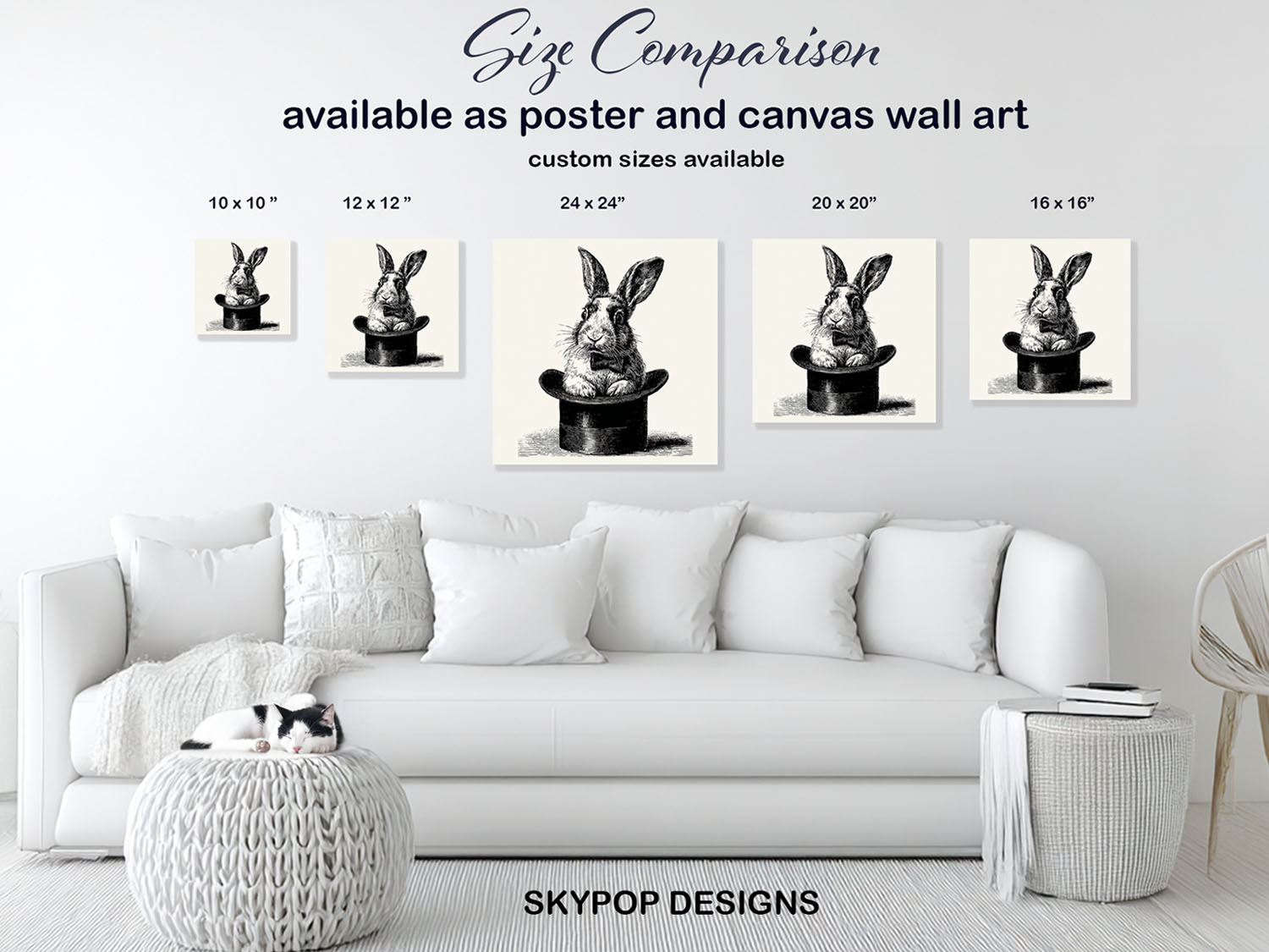 Bring a touch of vintage charm and whimsical wonder to your home with this delightful Bunny in a Hat canvas wall art. This striking poster or canvas wall art showcases a beautifully rendered bunny peeking out of a classic top hat, rendered in a detailed etching style. The black and white palette with soft beige undertones makes this animal art piece a versatile addition to any room, perfect for transforming your living room walls or adding a playful touch to a nursery or children’s room decor. Ideal for farmhouse, bohemian, or Victorian-inspired spaces, this bunny artwork adds personality and a hint of magic. Showcase this captivating canvas wall art in your entryway to greet guests with a smile or hang it in a cozy reading nook to inspire imaginative stories. The intricate linework and classic aesthetic evoke a sense of nostalgia, making this poster a unique statement piece. High-quality printing ensures every detail of the bunny’s fur and the hat’s texture is preserved, creating a truly immersive visual experience on your wall art. This bunny canvas art is a thoughtful housewarming gift or a lovely present for birthdays and holidays, bringing joy to art lovers of all ages. Elevate your home decor with this timeless animal artwork that celebrates the simple pleasures and evokes a sense of playful curiosity. Make your walls stand out with this charming Bunny in a Hat canvas wall art, a perfect blend of classic style and whimsical appeal. Transform your space today with this enchanting piece.