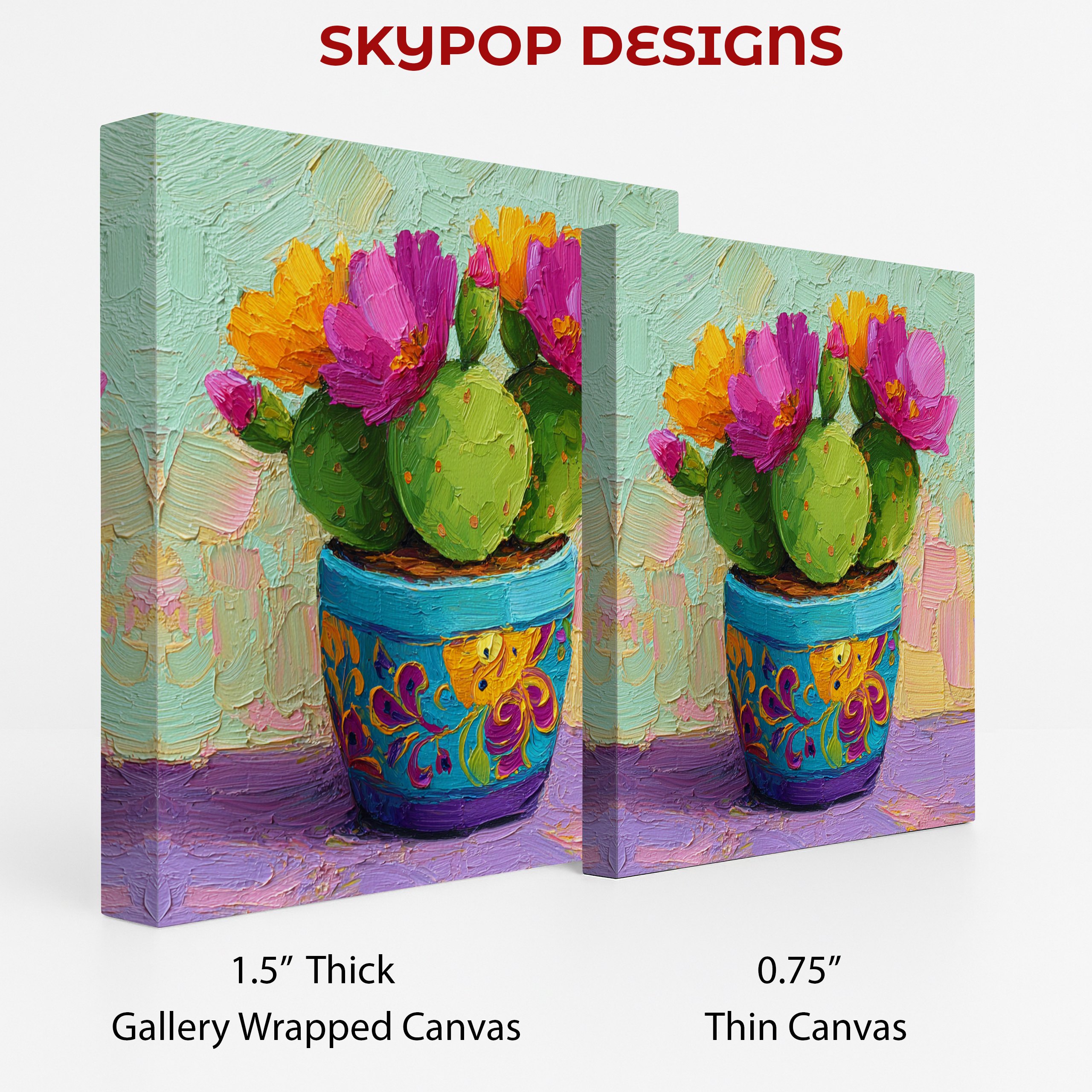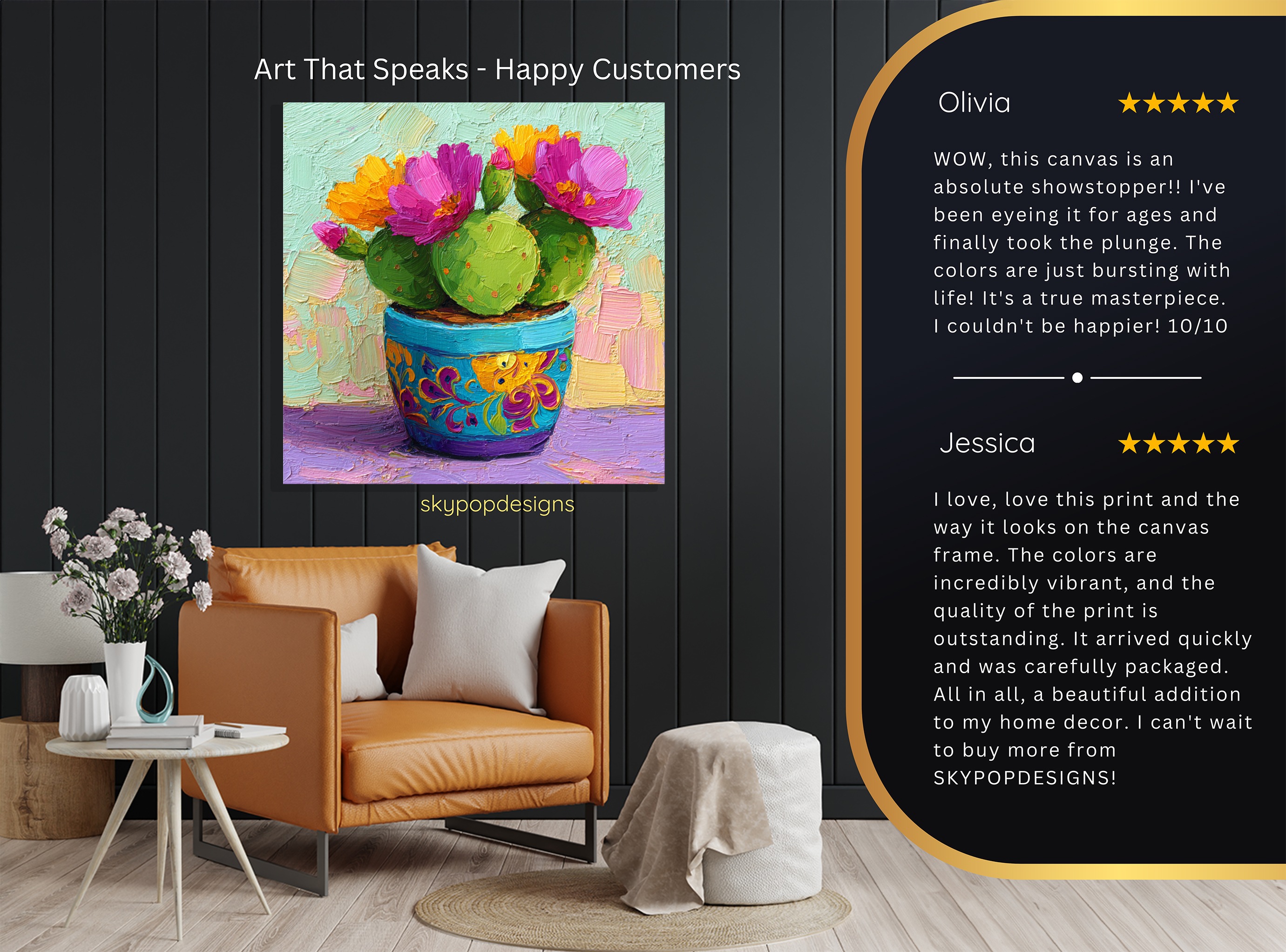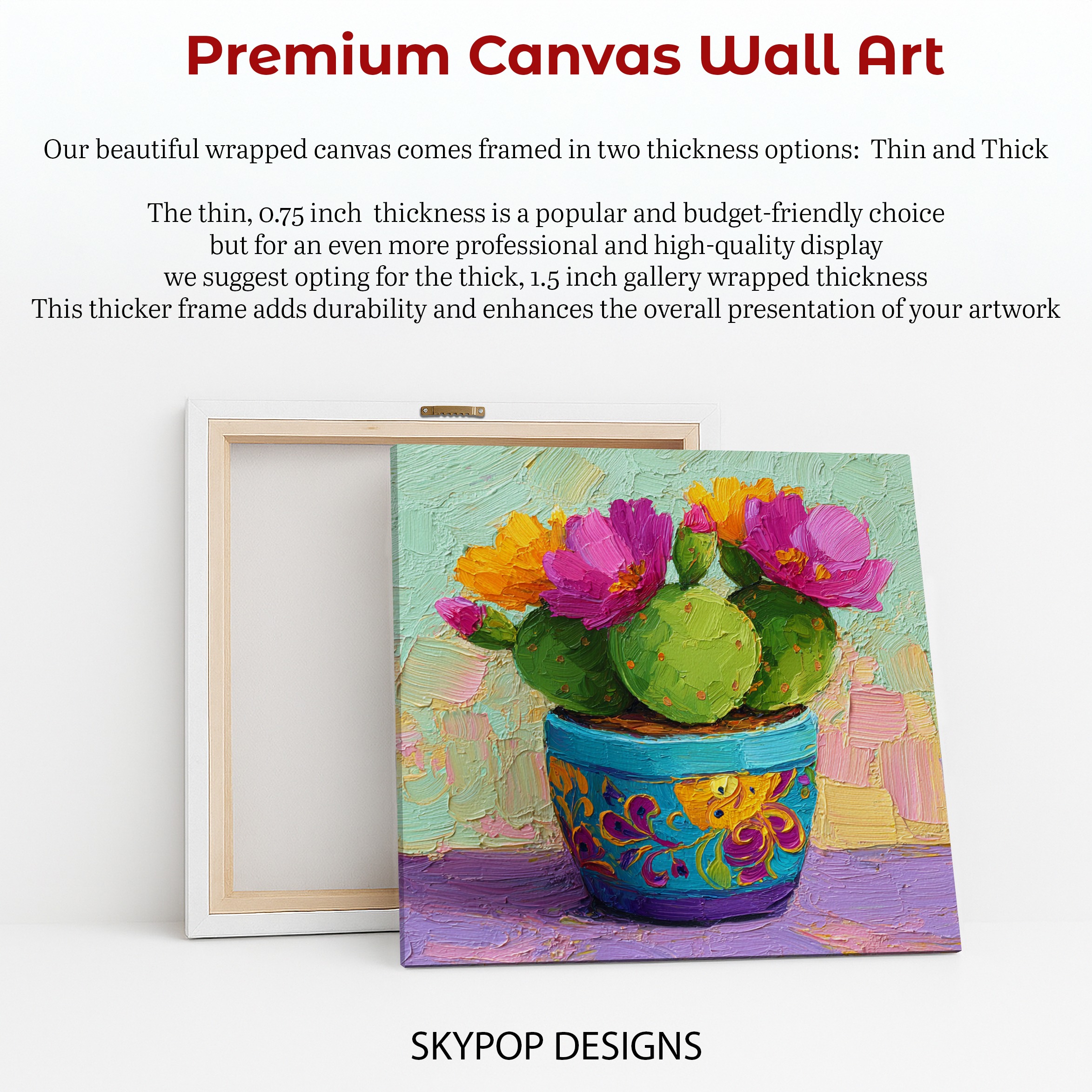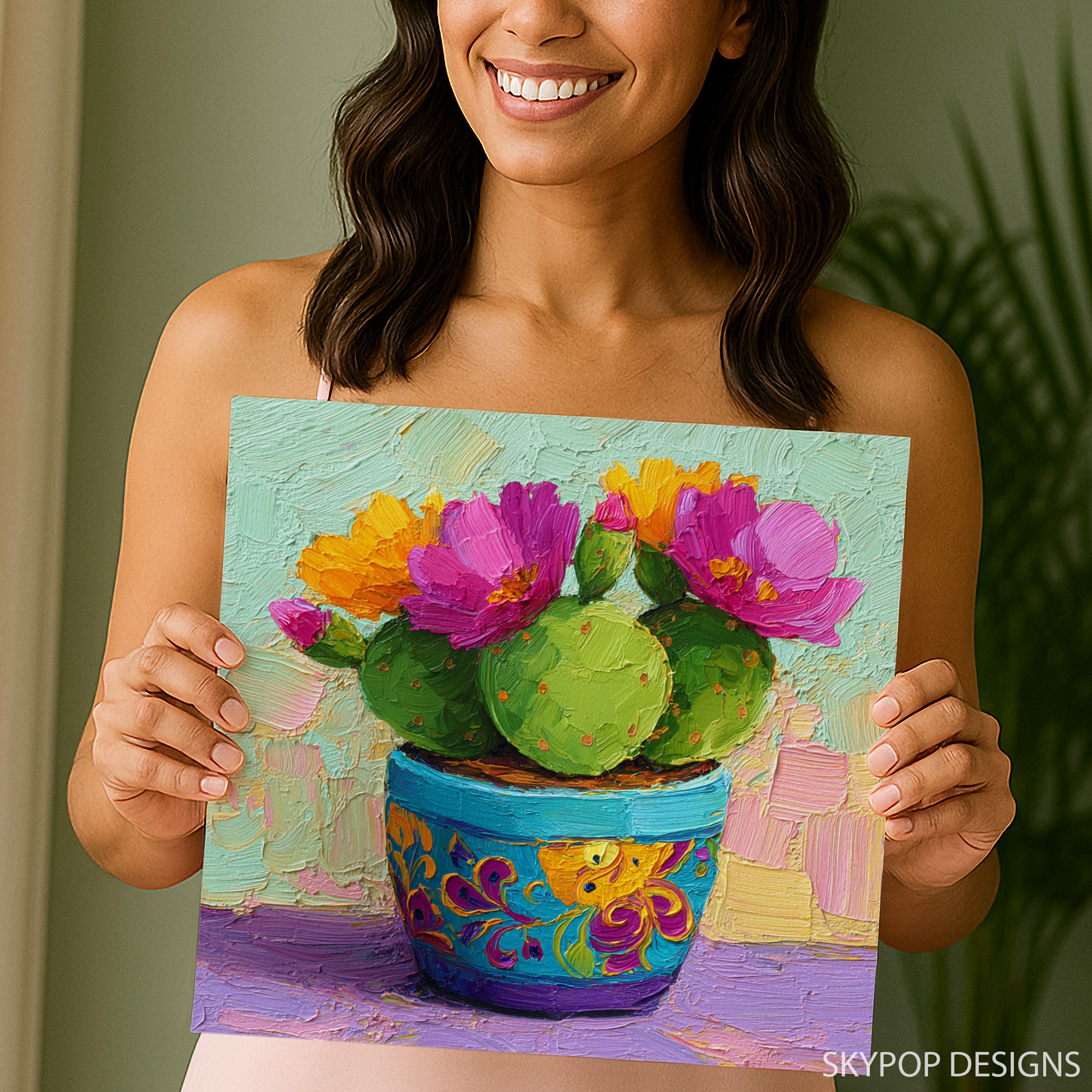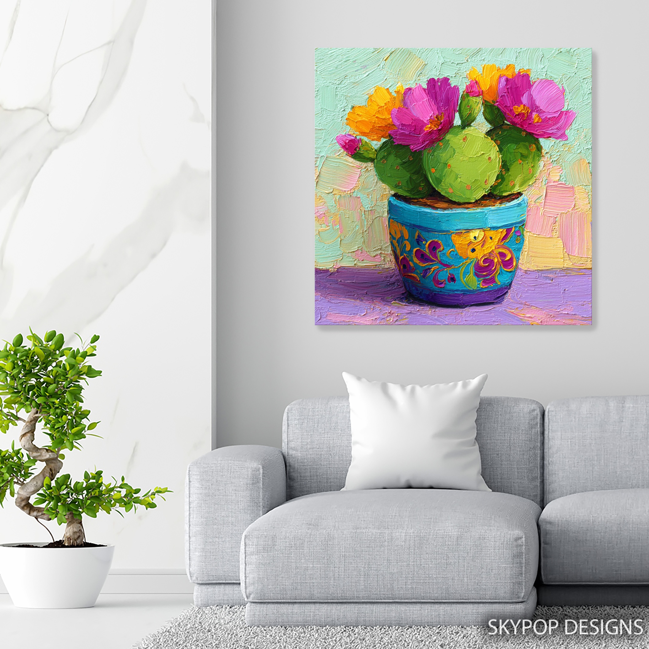 Brighten your space with this stunning cactus flower canvas wall art that bursts with vibrant colors and energy. This eye-catching poster transforms any room with its bold prickly pear cactus, adorned with lush pink and purple blooms that pop against a soothing pastel background. Perfect for modern living room wall decor or as a statement piece in a bohemian bedroom, this artwork brings the beauty of desert flora into your home. The textured brushstrokes and impasto technique give depth and dimension to the canvas, creating a captivating visual experience that draws the eye and sparks conversation. Ideal for nature lovers and color enthusiasts alike, this cactus art print adds a touch of whimsy and warmth to contemporary interiors. The bright turquoise pot with its intricate design complements the cactus, creating a harmonious composition that celebrates both natural and artistic beauty. Whether you’re looking to refresh your dining room, liven up your office, or add a pop of color to a neutral space, this versatile canvas wall art adapts beautifully to various decor styles. The high-quality printing ensures every detail of the original painting is captured, from the delicate cactus spines to the lush flower petals. Elevate your home decor today with this cheerful and inspiring piece that brings the spirit of the desert into your everyday life.