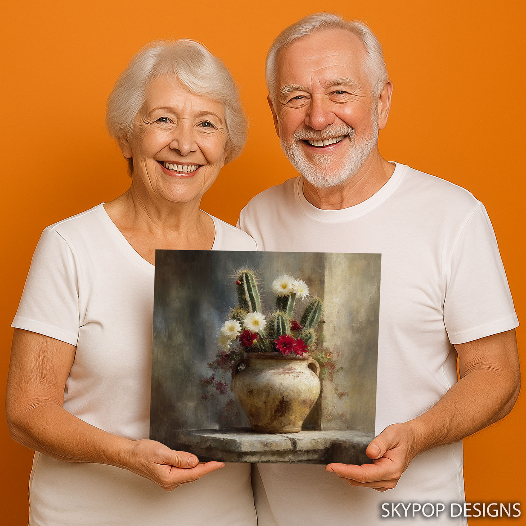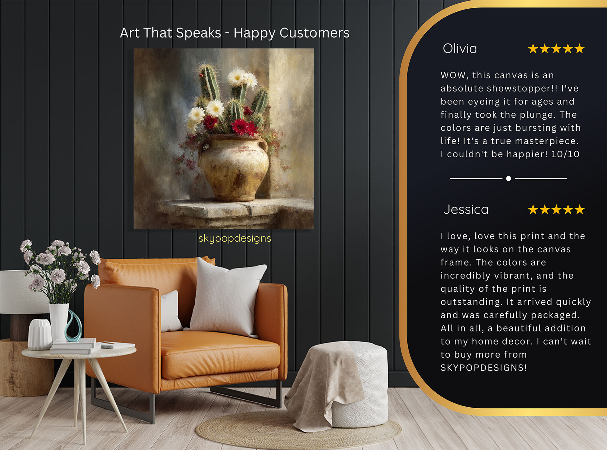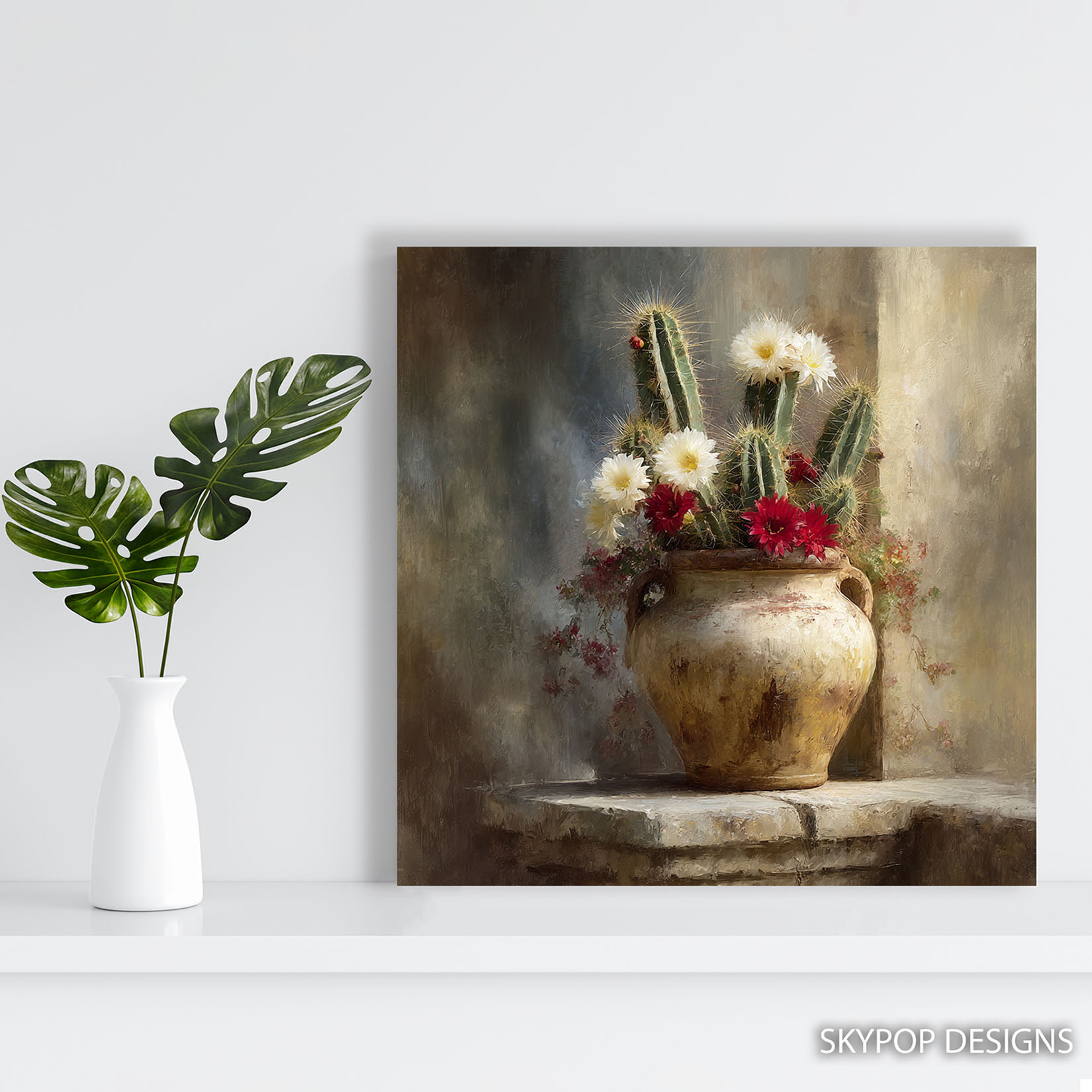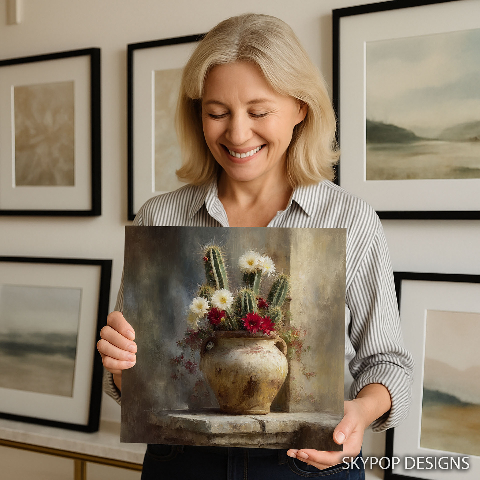 Elevate your home with this stunning cactus canvas wall art, a perfect representation of desert blooms in a classic vase. This poster or canvas wall art captures intricate details, bringing the beauty of nature indoors with vibrant red and white blossoms set against lush green cacti. The rustic Tuscan pot and textured background create a captivating focal point, ideal for enhancing living room decor or adding a touch of natural elegance to your dining room. This nature art piece is perfect for farmhouse and Tuscan-inspired interiors, offering a serene and grounded aesthetic. The contrast between the spiky cacti and delicate flowers symbolizes resilience and beauty, bringing a unique energy to any space. High-quality printing ensures the rich colors and detailed textures of this still life artwork are brilliantly preserved. This versatile canvas wall art is also an exquisite choice for entryways or sunrooms, inviting warmth and botanical charm. It makes a thoughtful housewarming gift or a special treat for holidays and birthdays. The blend of earthly tones and striking floral colors complements a variety of decor styles, from minimalist to grand. Transform your interior design with this breathtaking botanical artwork that celebrates the enduring spirit of the desert. Add a touch of sophisticated natural beauty to your wall art collection and inspire a sense of tranquil beauty every day with Desert Bloom Vase Art.