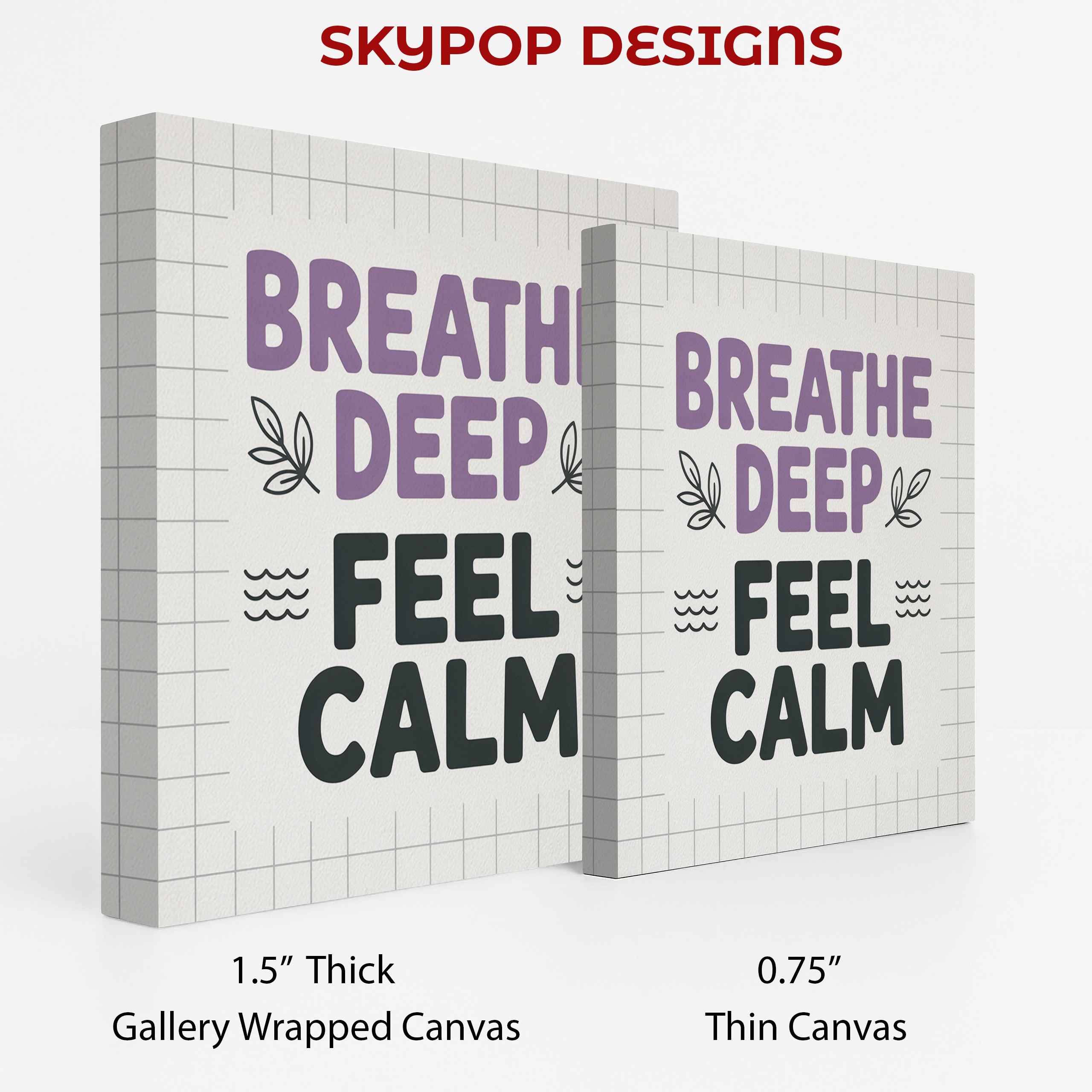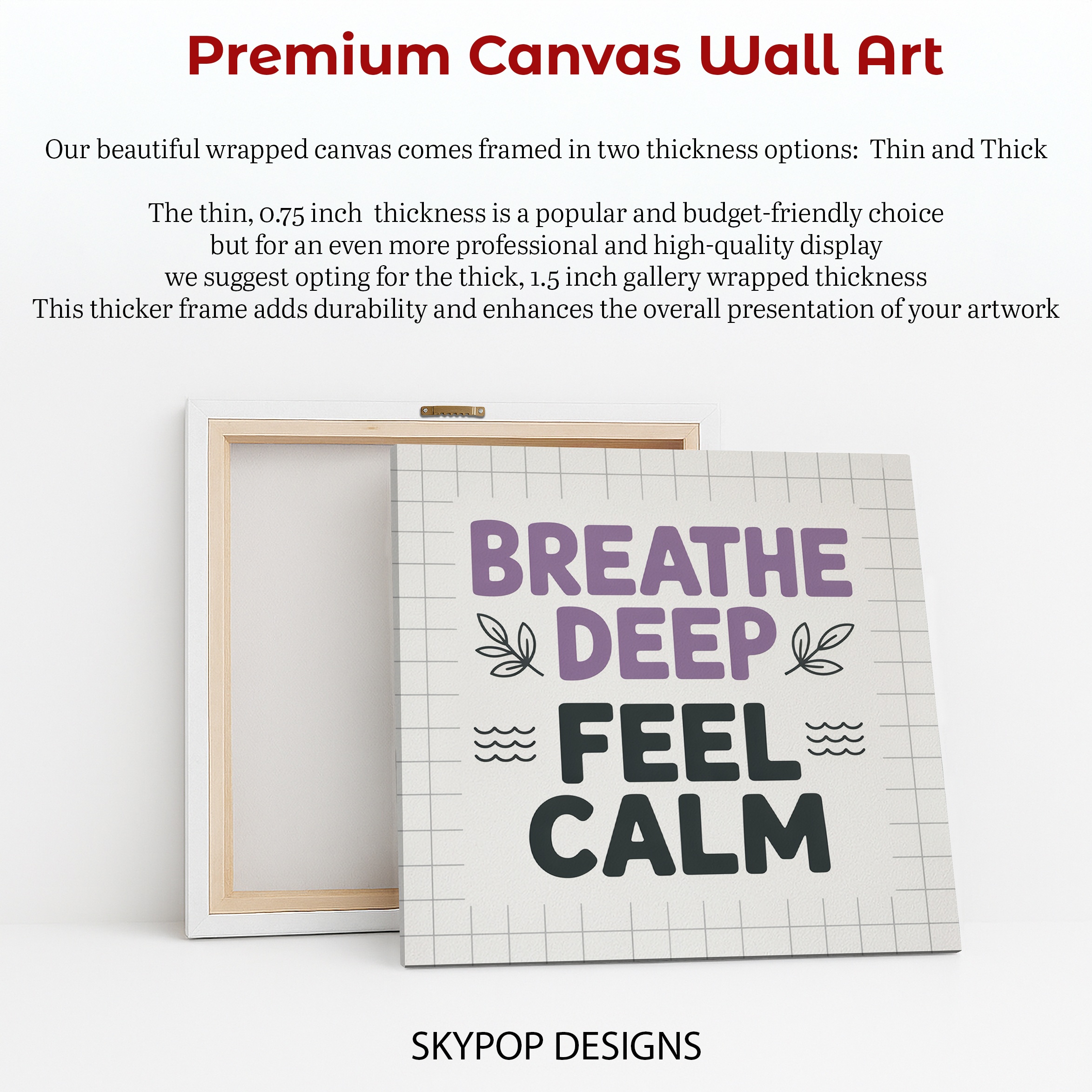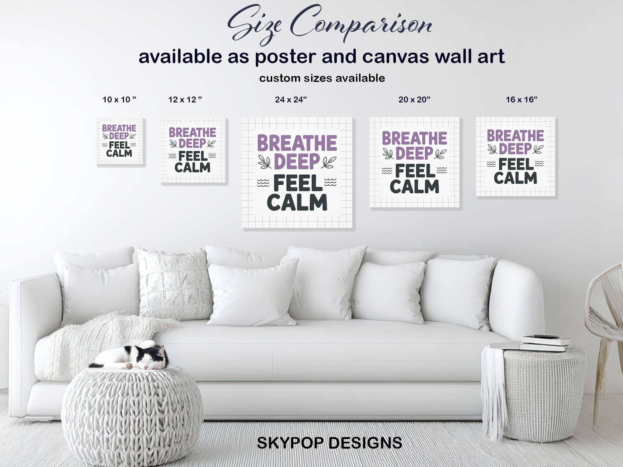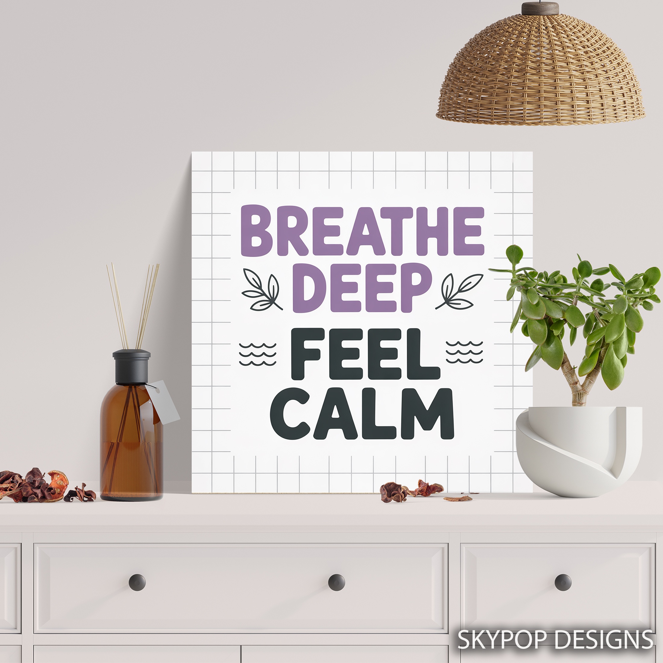 Transform your space with this soothing and inspirational canvas wall art featuring the motivational phrase “Breathe Deep Feel Calm.” This minimalist poster design combines clean typography with subtle natural elements to create a serene focal point for any room. Perfect for modern bedrooms, home offices, or yoga spaces, this contemporary wall art serves as a gentle reminder to pause and center yourself throughout the day. The soft purple hues of the main text evoke feelings of tranquility and relaxation, while the contrasting black “Feel Calm” grounds the composition. Delicate leaf motifs and wave-like elements add a touch of nature-inspired whimsy without overwhelming the clean aesthetic. Ideal for those embracing minimalist or Scandinavian decor styles, this versatile canvas art complements a wide range of interior designs. The simple yet powerful message makes it an excellent gift for friends dealing with stress or anxiety, or as a thoughtful housewarming present. Whether displayed in a cozy reading nook, above a desk, or in a calming bathroom setting, this artwork encourages mindfulness and self-care. The high-quality printing ensures crisp text and vibrant colors that will last for years. Elevate your daily routine and create a more peaceful atmosphere with this inspiring “Breathe Deep Feel Calm” wall art. Transform your living space into a serene retreat today.