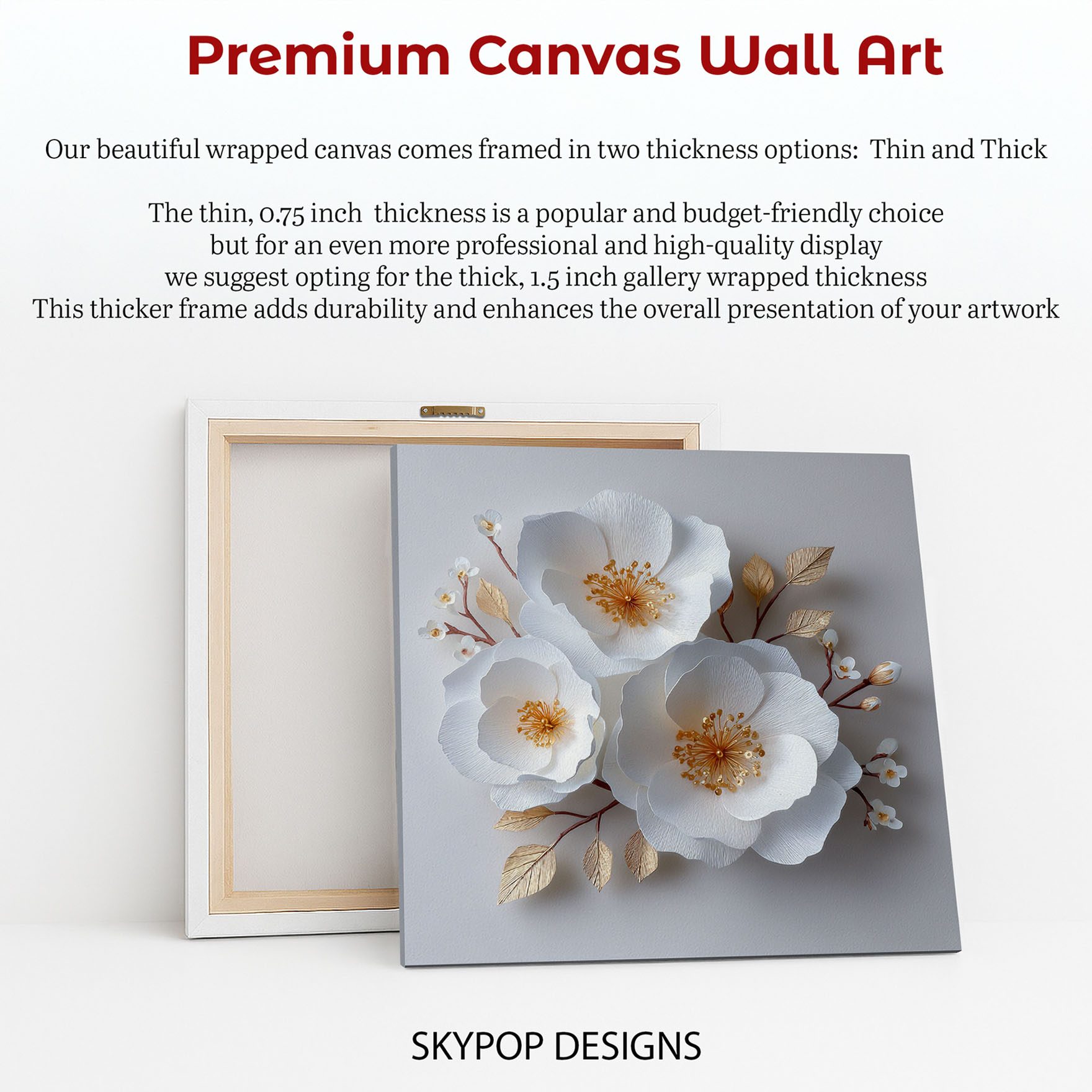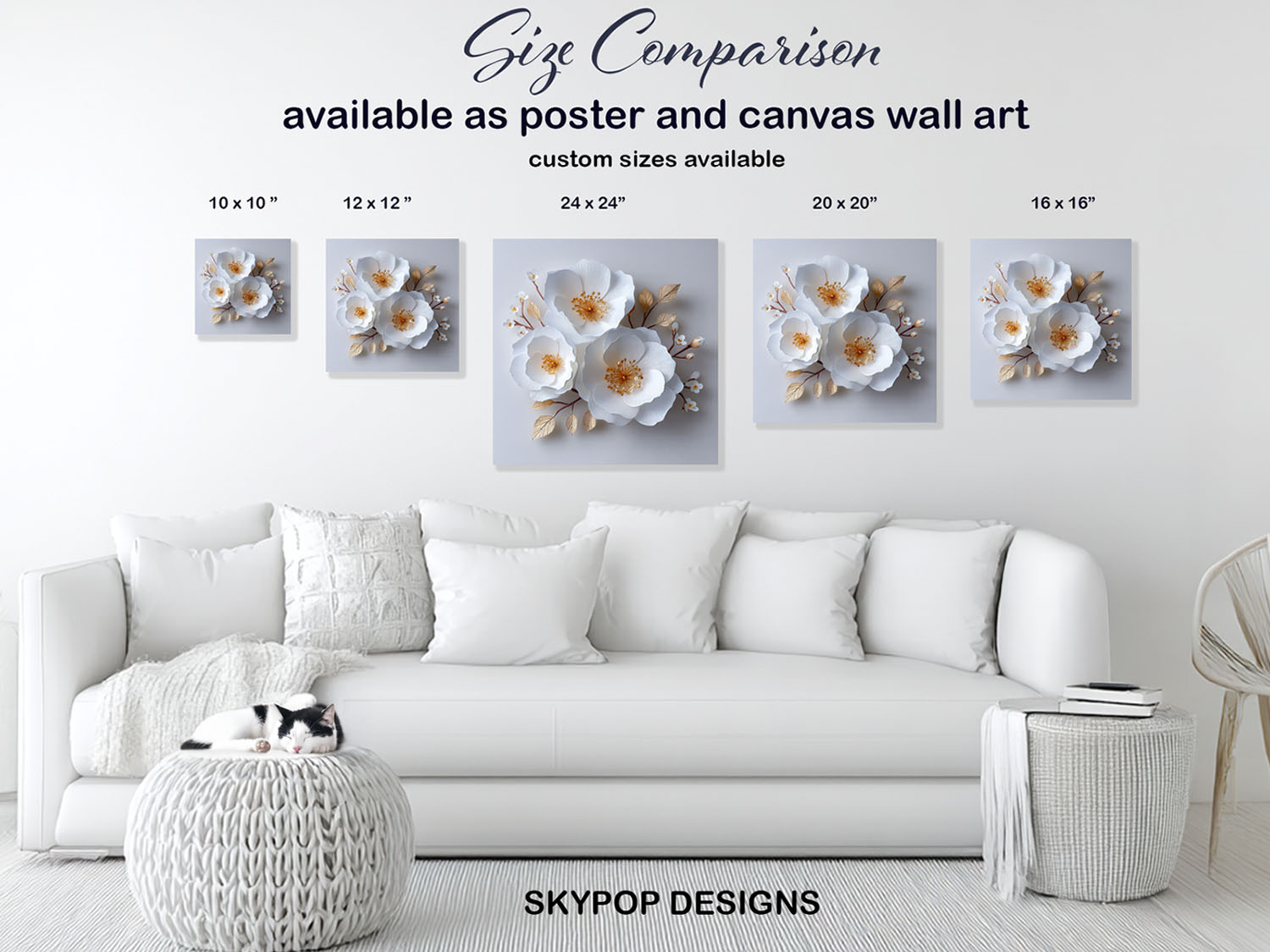 Elevate your home with this sophisticated white camellia canvas wall art, a stunning portrayal of botanical beauty. This poster or canvas wall art features delicate white camellia blooms with intricate gold accents, creating a luxurious and timeless focal point. The minimalist design and neutral color palette of white, gold, and beige make it a perfect addition to any modern living room wall decor or a serene bedroom setting. Ideal for minimalist and glam decor styles, this floral artwork brings a touch of understated elegance to an entryway or dining room. The striking contrast between the pure white petals and the radiant gold centers celebrates nature’s artistry, infusing your space with a sense of calm and refinement. High-quality printing ensures every detail of this still life art is captured with clarity, from the subtle texture of the petals to the shimmer of the gold elements. This versatile canvas wall art works beautifully in various settings, offering a sense of tranquility and style. It’s an ideal gift for housewarmings, birthdays, or holidays, bringing lasting beauty to any home. The sophisticated color scheme complements a wide range of interior designs, making this floral wall art a perfect choice for those seeking elegant and understated decor. Transform your space with this captivating camellia canvas art, a unique blend of nature and modern design. Enhance your walls with this striking floral poster that promises to inspire and delight every day. Embrace sophistication and timeless beauty in your home today.