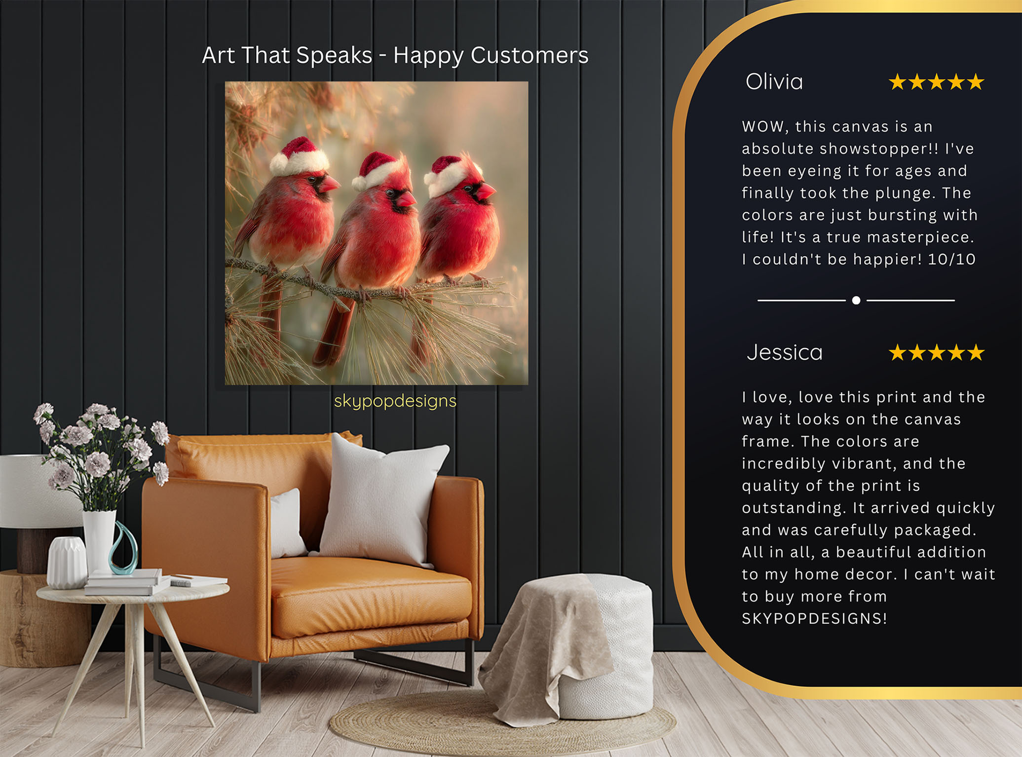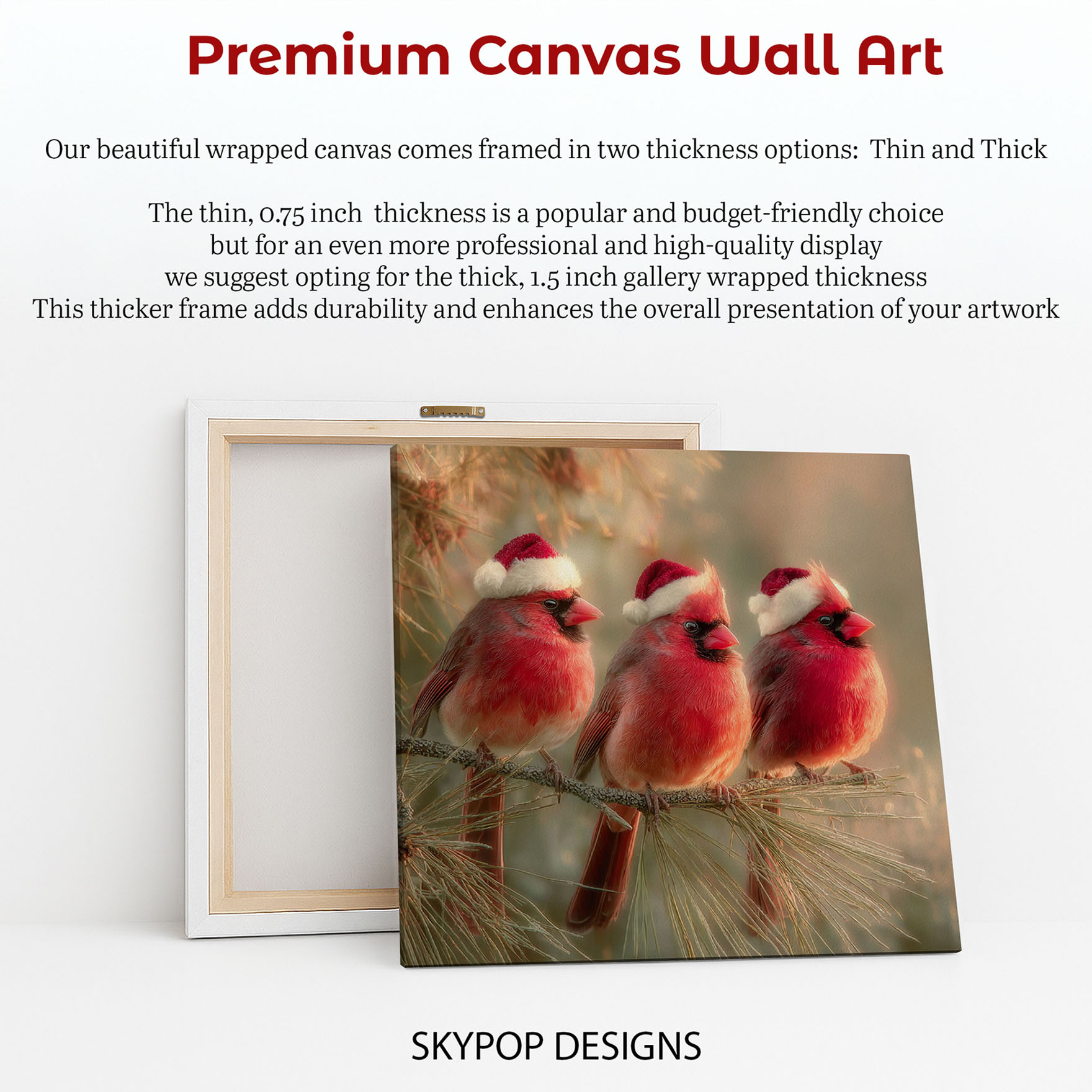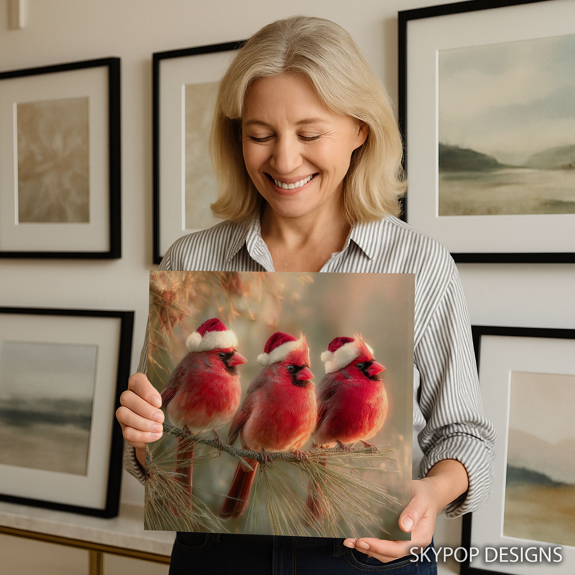 Bring the joy of the holidays into your home with this captivating cardinal canvas wall art, featuring three charming birds in festive Santa hats perched on a pine branch. This heartwarming poster or canvas wall art is perfect for transforming your living room into a cozy holiday retreat or adding a touch of winter wonder to your bedroom decor. The vibrant red of the cardinals, accented by the soft whites of their hats and the natural browns and greens of the pine, creates a striking and inviting color palette. Ideal for Bohemian or Scandinavian decor, this piece adds a whimsical and cheerful element to any space, making every day feel like Christmas. Showcase your love for nature and the holiday season with this stunning animal art, celebrating the beauty of these iconic winter birds. The detailed rendering of the cardinals’ feathers and the soft, dreamlike background make this canvas wall art a truly special addition to your holiday decorating. This versatile poster or canvas wall art is a perfect gift for bird lovers, holiday enthusiasts, or anyone looking to enhance their home with joyful wall decor. High-quality printing ensures this artwork retains its vivid colors and intricate details, providing lasting beauty for years to come. Whether adorning your entryway to greet guests or adding festive cheer to a children’s room, this piece sparks smiles and warm memories. Elevate your seasonal display or all-year-round decor with this enchanting cardinal canvas art that embodies the spirit of togetherness and festive celebration. Add this delightful piece to your wall art collection and let the festive spirit fill your home. This artwork is a beautiful reminder that the holidays can be cherished every day.