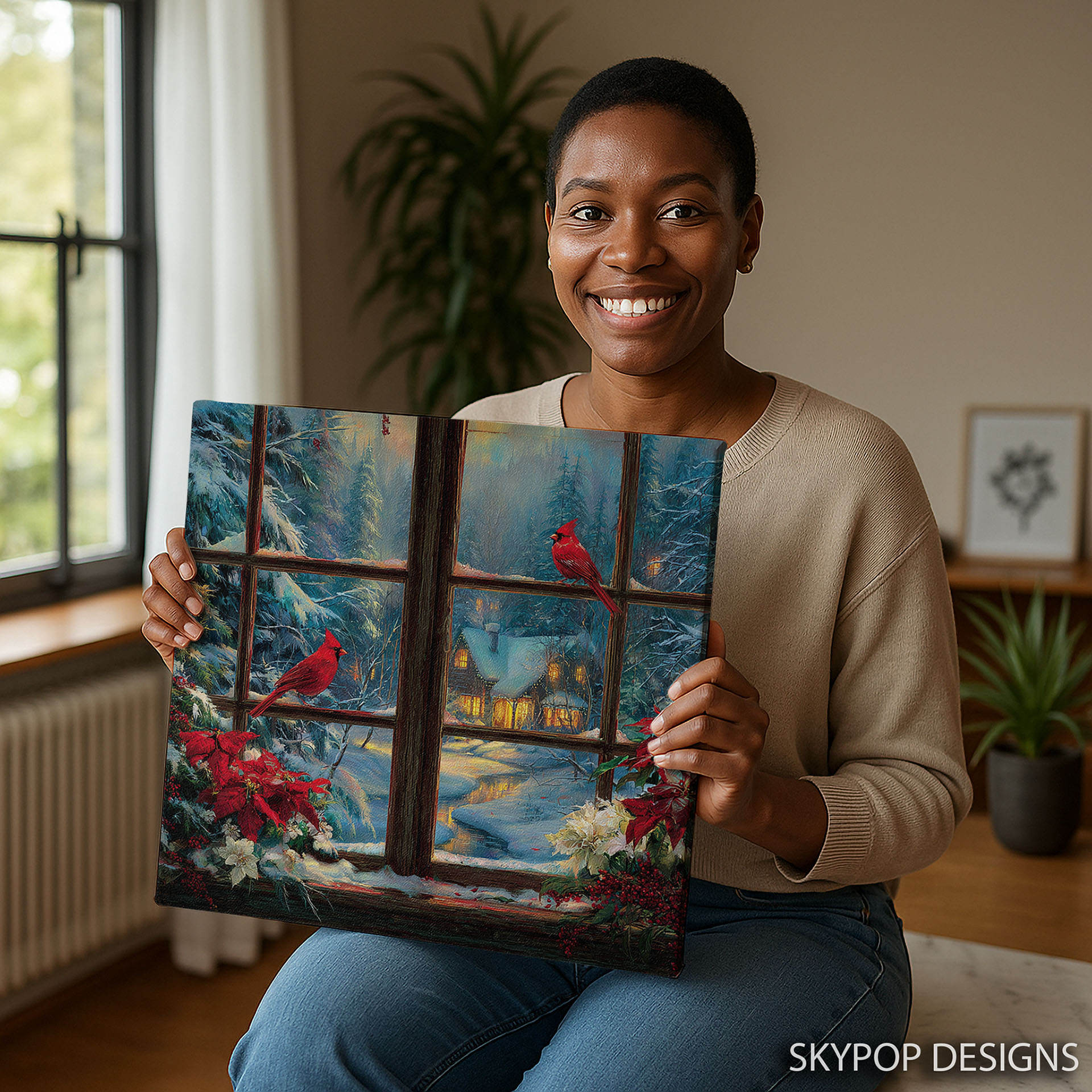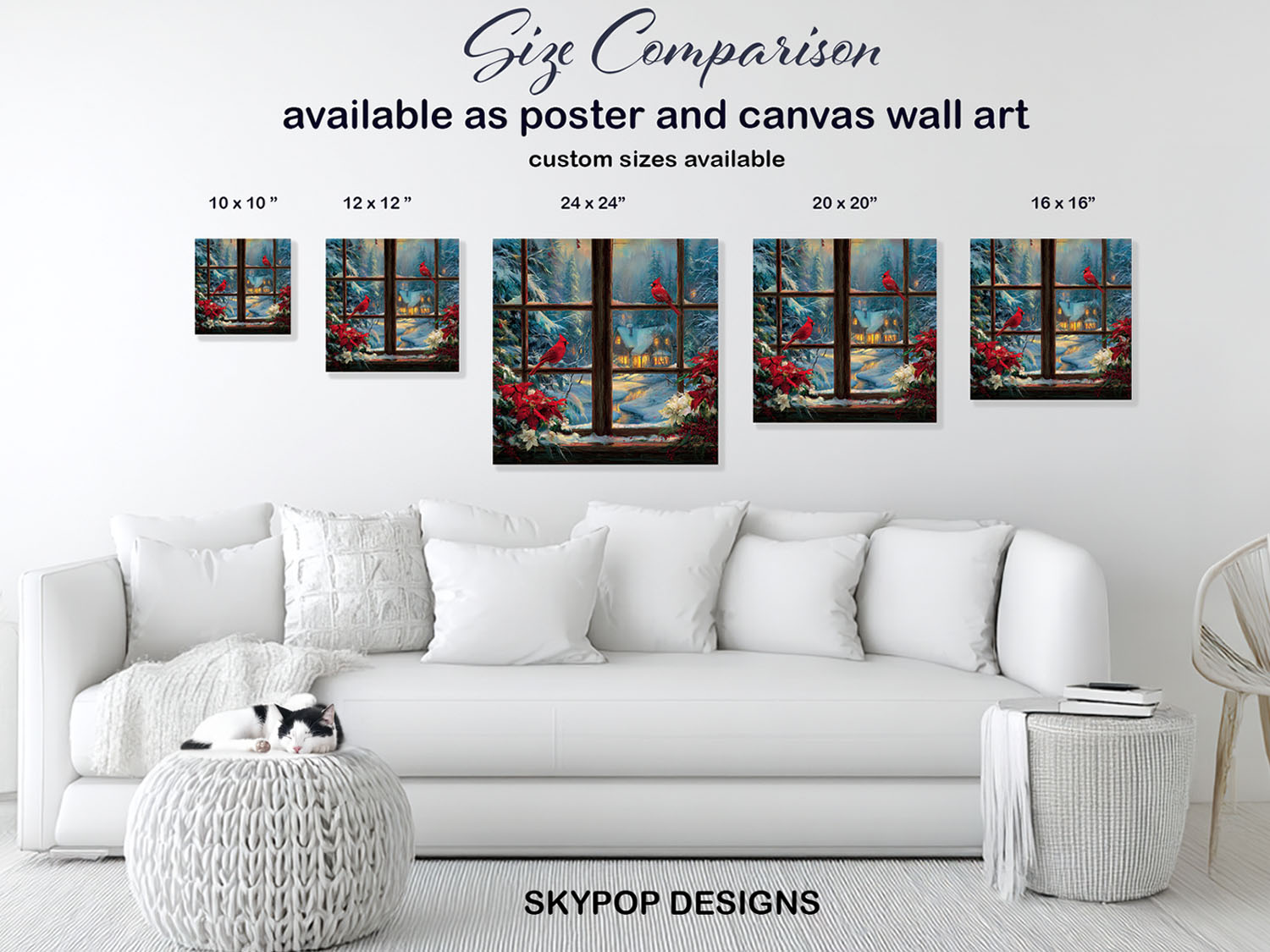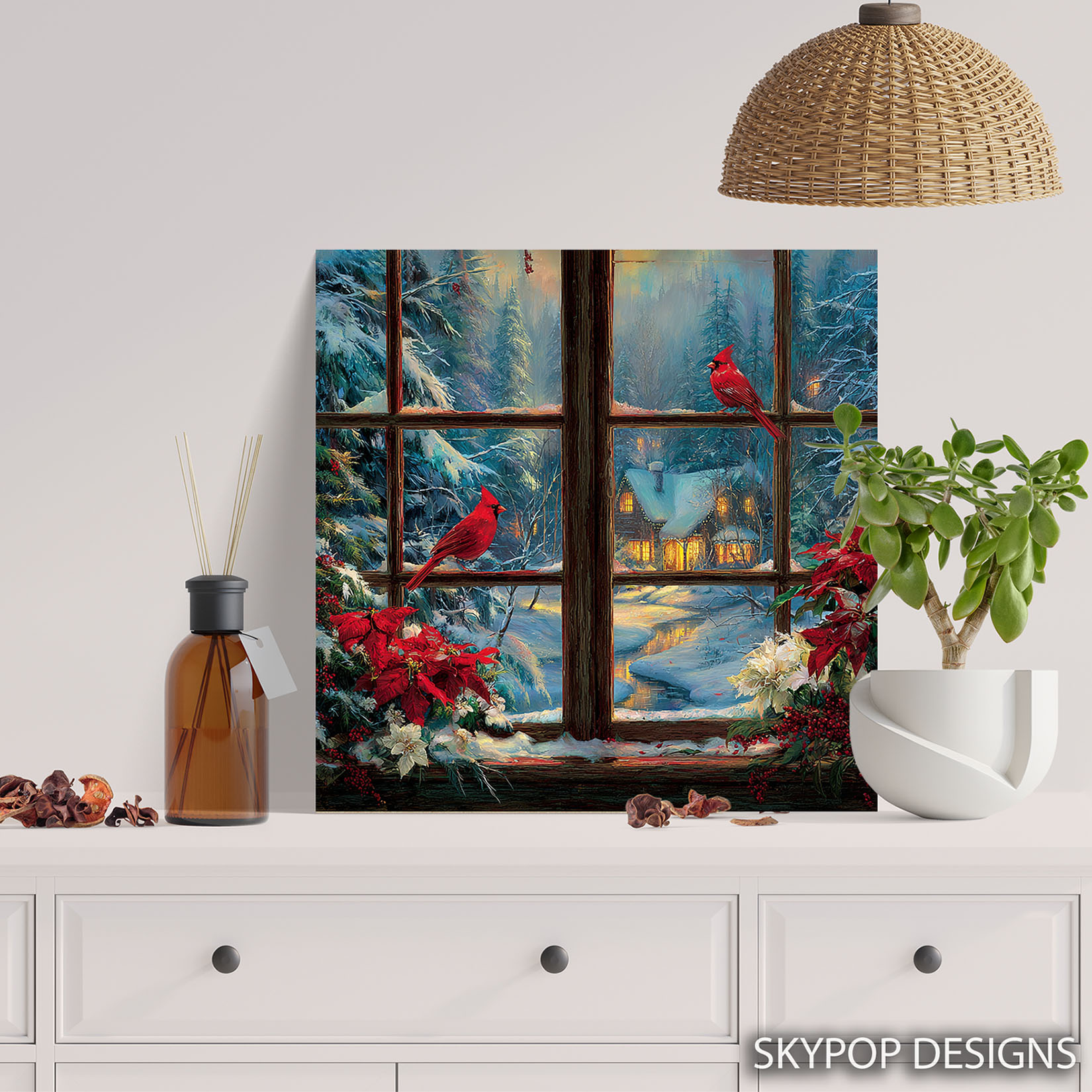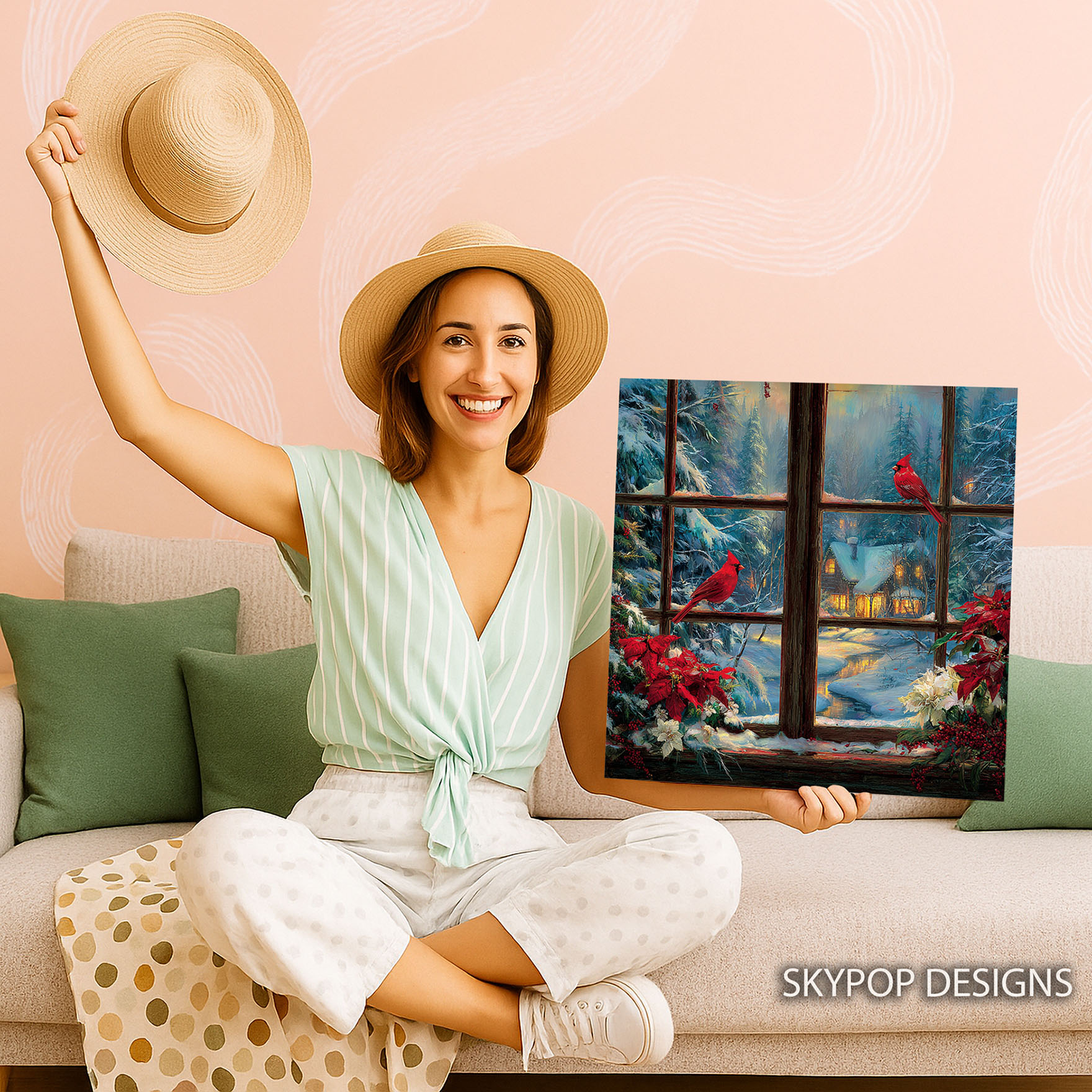 Transform your home with this stunning Cardinal canvas wall art, capturing a heartwarming winter scene viewed through a rustic window. This captivating poster or canvas wall art brings the beauty of nature indoors, featuring a bright red cardinal against a snowy landscape and a cozy cabin. The rich red of the poinsettias and cardinals pops against the cool blues and whites of the winter scene, creating a vibrant and inviting atmosphere. Ideal for traditional, rustic, or farmhouse decor styles, this artwork effortlessly elevates living room wall decor or adds charm to a cozy bedroom. The detailed depiction of the snow-covered trees, the illuminated cabin, and the graceful cardinal makes this piece a true work of art. Experience the magic of a winter’s evening with this stunning canvas wall art, perfect for bringing warmth and seasonal cheer to any space. This versatile wall art is also a wonderful gift for nature lovers, housewarmings, or holiday celebrations. Its high-quality printing ensures every brushstroke and detail is rendered with exceptional clarity, making it a treasured addition to your art collection. Create a focal point in your dining room or entryway with this eye-catching piece that evokes feelings of peace and tranquility. Enhance your home with the timeless beauty of this cardinal and winter cabin canvas wall art, a perfect blend of nature and cozy home vibes. Bring the outdoors in and celebrate the season with this breathtaking artwork. Elevate your space today and enjoy the inviting serenity of this beautiful window view.
