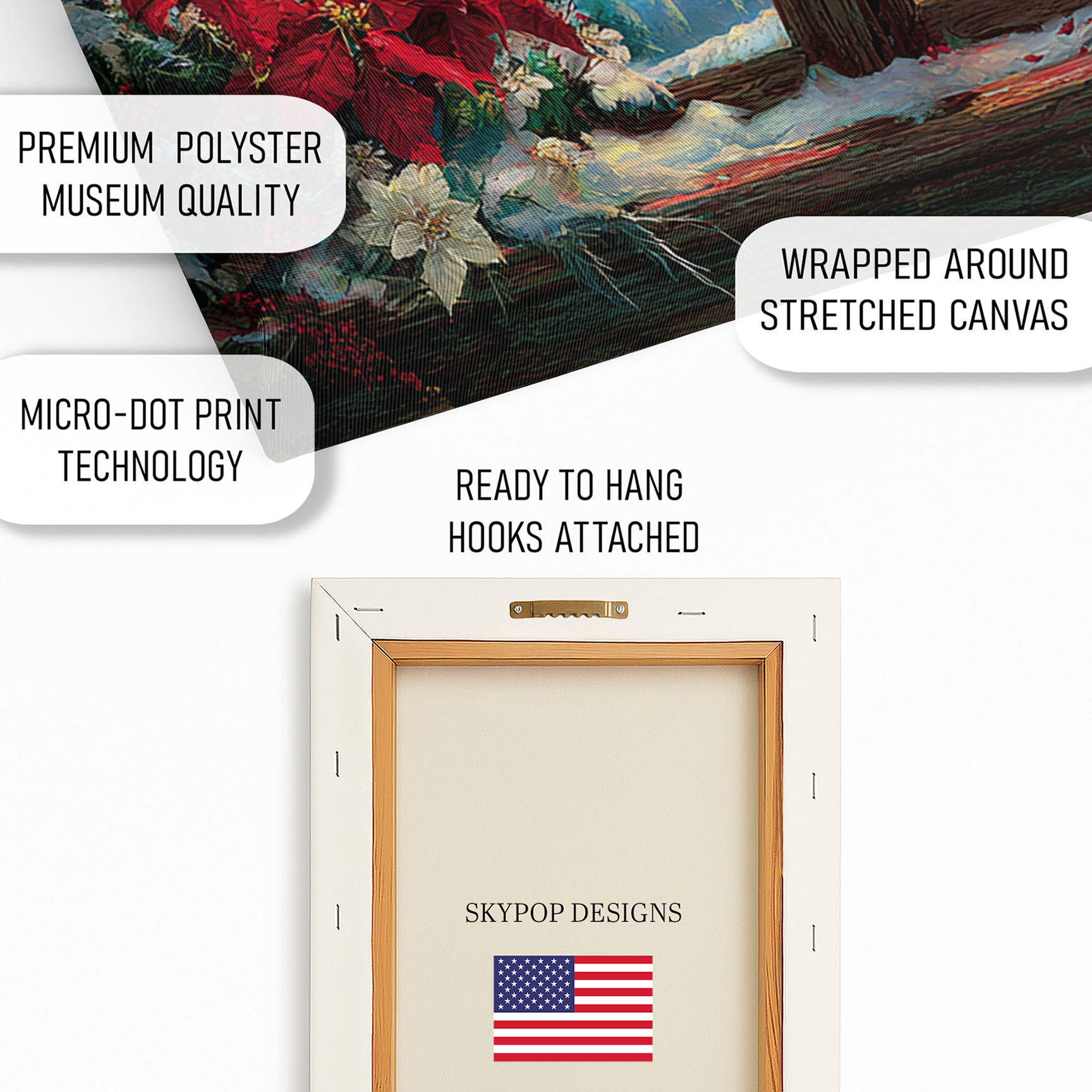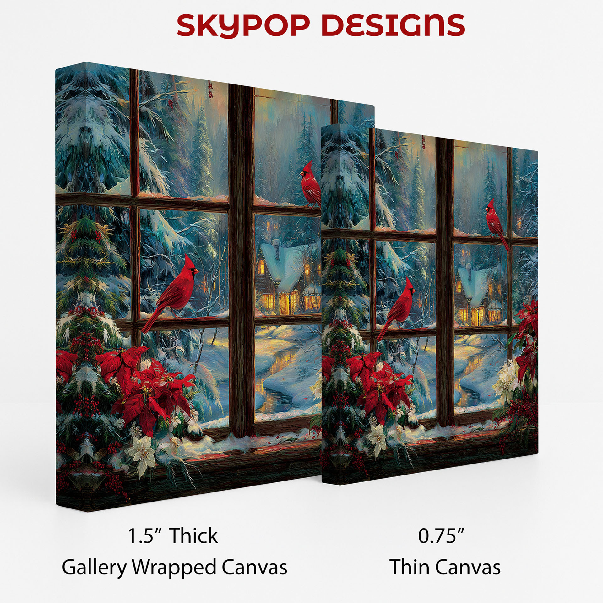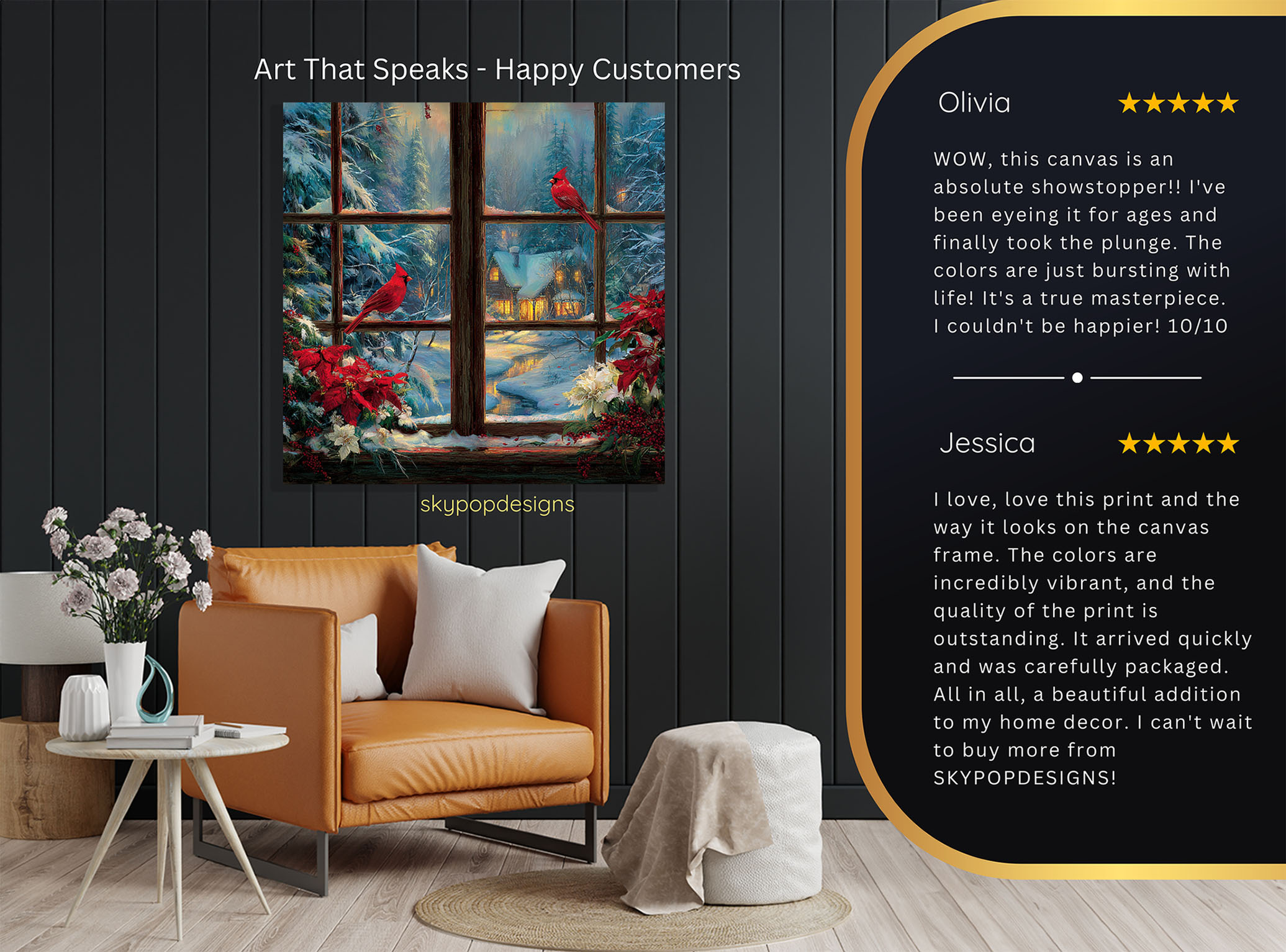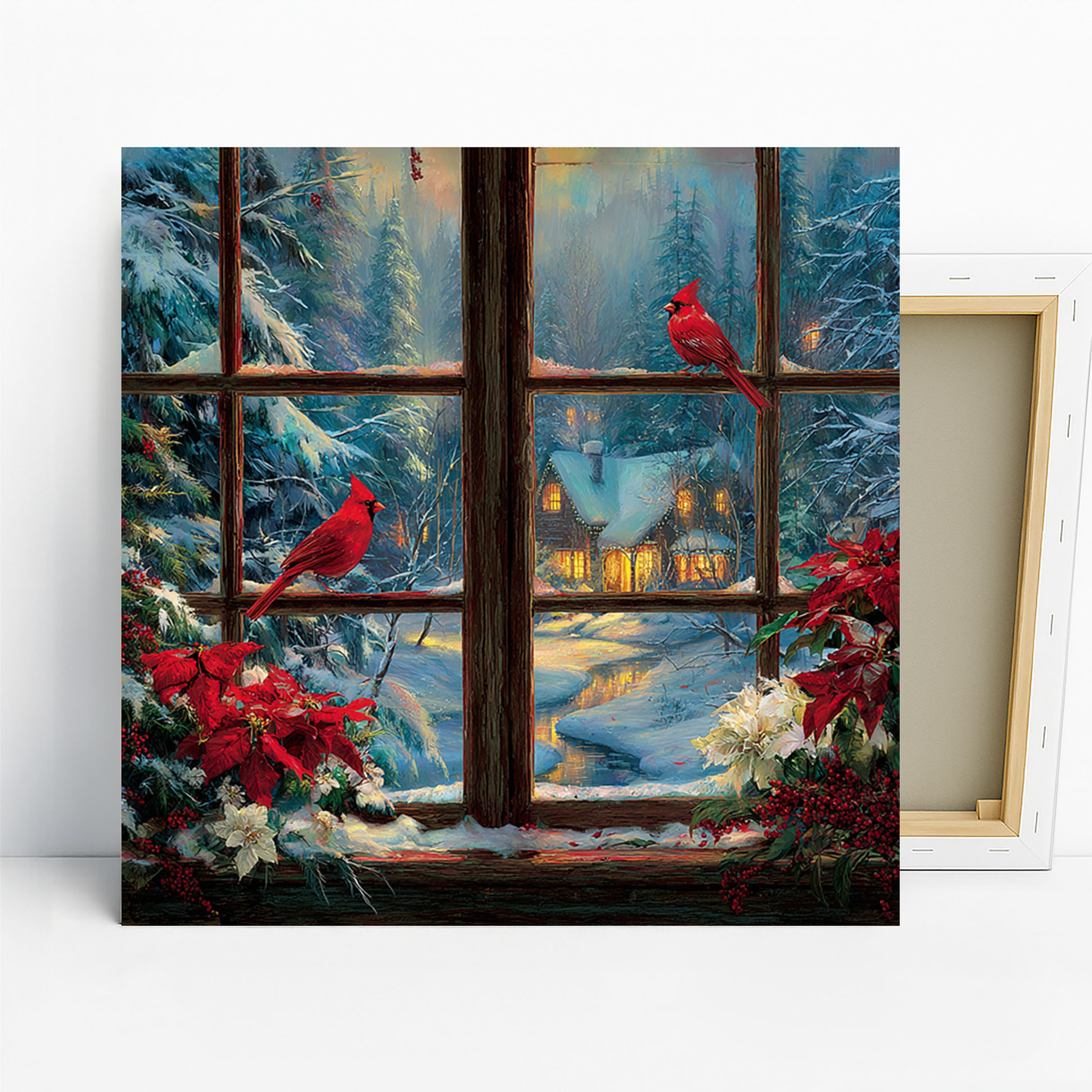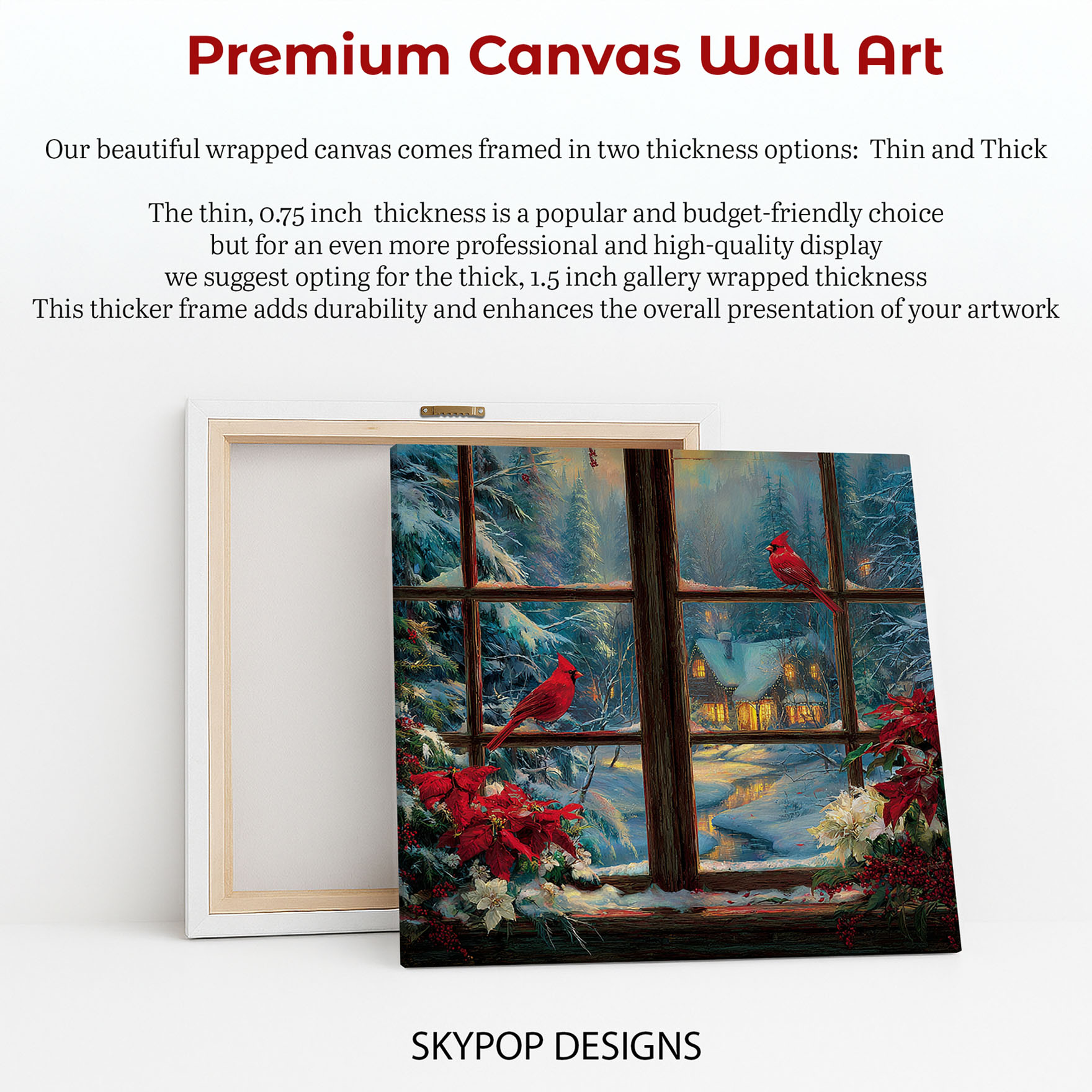 Transform your home with this stunning Cardinal canvas wall art, capturing a heartwarming winter scene viewed through a rustic window. This captivating poster or canvas wall art brings the beauty of nature indoors, featuring a bright red cardinal against a snowy landscape and a cozy cabin. The rich red of the poinsettias and cardinals pops against the cool blues and whites of the winter scene, creating a vibrant and inviting atmosphere. Ideal for traditional, rustic, or farmhouse decor styles, this artwork effortlessly elevates living room wall decor or adds charm to a cozy bedroom. The detailed depiction of the snow-covered trees, the illuminated cabin, and the graceful cardinal makes this piece a true work of art. Experience the magic of a winter’s evening with this stunning canvas wall art, perfect for bringing warmth and seasonal cheer to any space. This versatile wall art is also a wonderful gift for nature lovers, housewarmings, or holiday celebrations. Its high-quality printing ensures every brushstroke and detail is rendered with exceptional clarity, making it a treasured addition to your art collection. Create a focal point in your dining room or entryway with this eye-catching piece that evokes feelings of peace and tranquility. Enhance your home with the timeless beauty of this cardinal and winter cabin canvas wall art, a perfect blend of nature and cozy home vibes. Bring the outdoors in and celebrate the season with this breathtaking artwork. Elevate your space today and enjoy the inviting serenity of this beautiful window view.