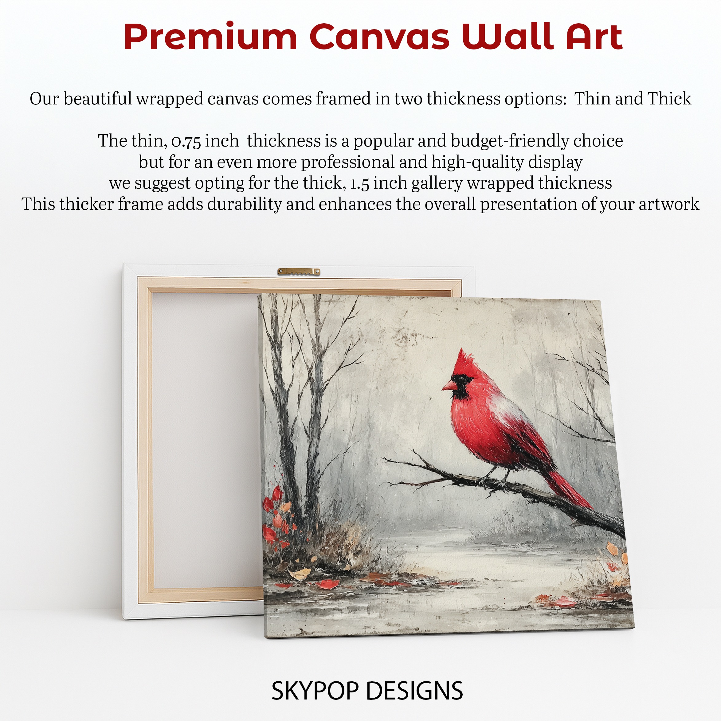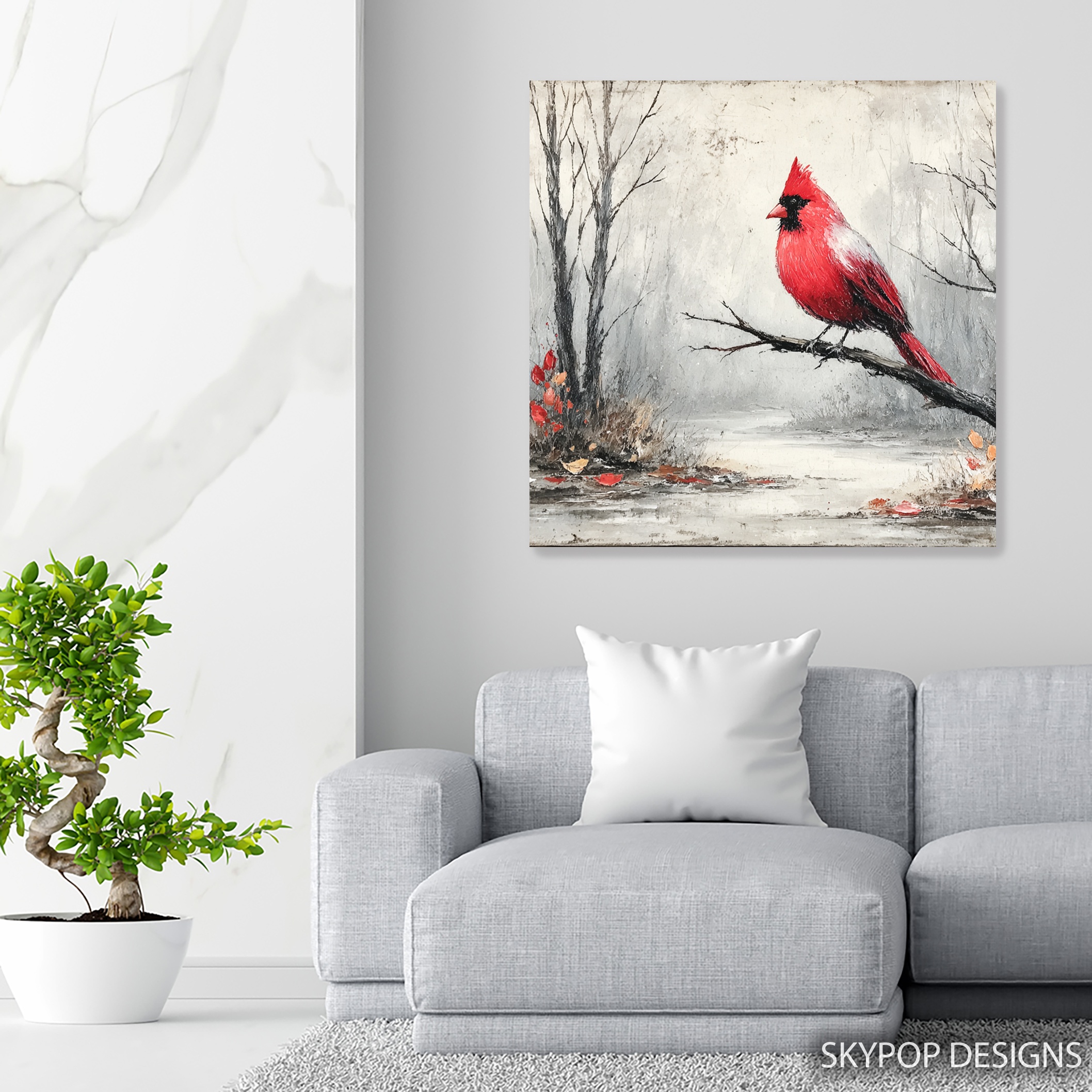 Bring the beauty of nature indoors with this striking cardinal canvas wall art. This stunning poster captures a vibrant red cardinal perched on a bare branch against a serene winter backdrop. Perfect for adding a pop of color to modern living rooms or cozy bedrooms, this eye-catching piece instantly transforms any space. The contrast between the bird’s brilliant red feathers and the muted gray tones of the winter landscape creates a captivating focal point. Ideal for rustic or contemporary decor styles, this canvas wall art celebrates the quiet beauty of winter and wildlife. The delicate details of the cardinal’s feathers and the misty atmosphere showcase high-quality printing techniques that bring this scene to life. Whether displayed as a standalone statement piece or part of a nature-inspired gallery wall, this artwork adds warmth and character to minimalist spaces. The cardinal, often associated with hope and renewal, makes this poster a thoughtful gift for new homeowners or anyone needing a touch of inspiration. Versatile in size and style, this canvas art adapts beautifully to various room settings, from a serene office to a welcoming dining area. Elevate your home decor with this timeless piece that bridges the gap between rustic charm and modern aesthetics. Transform your walls and bring a slice of winter wonder into your daily life with this captivating cardinal art.