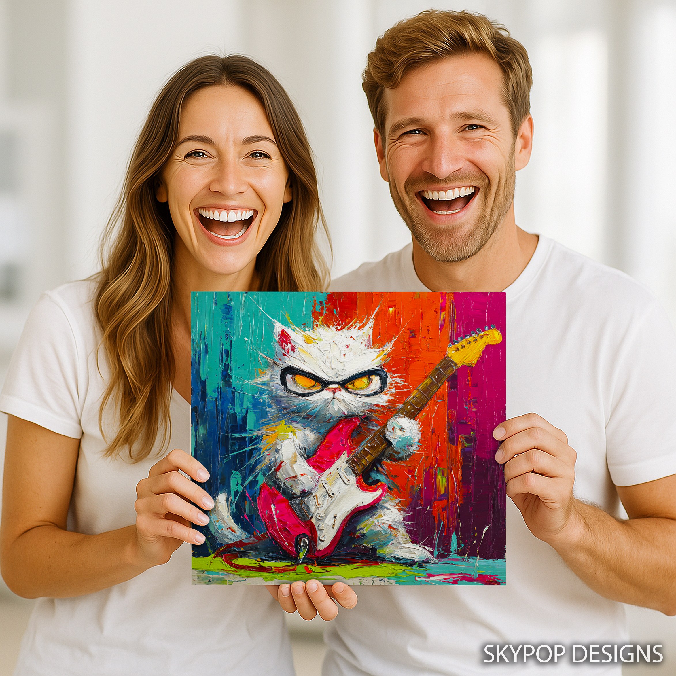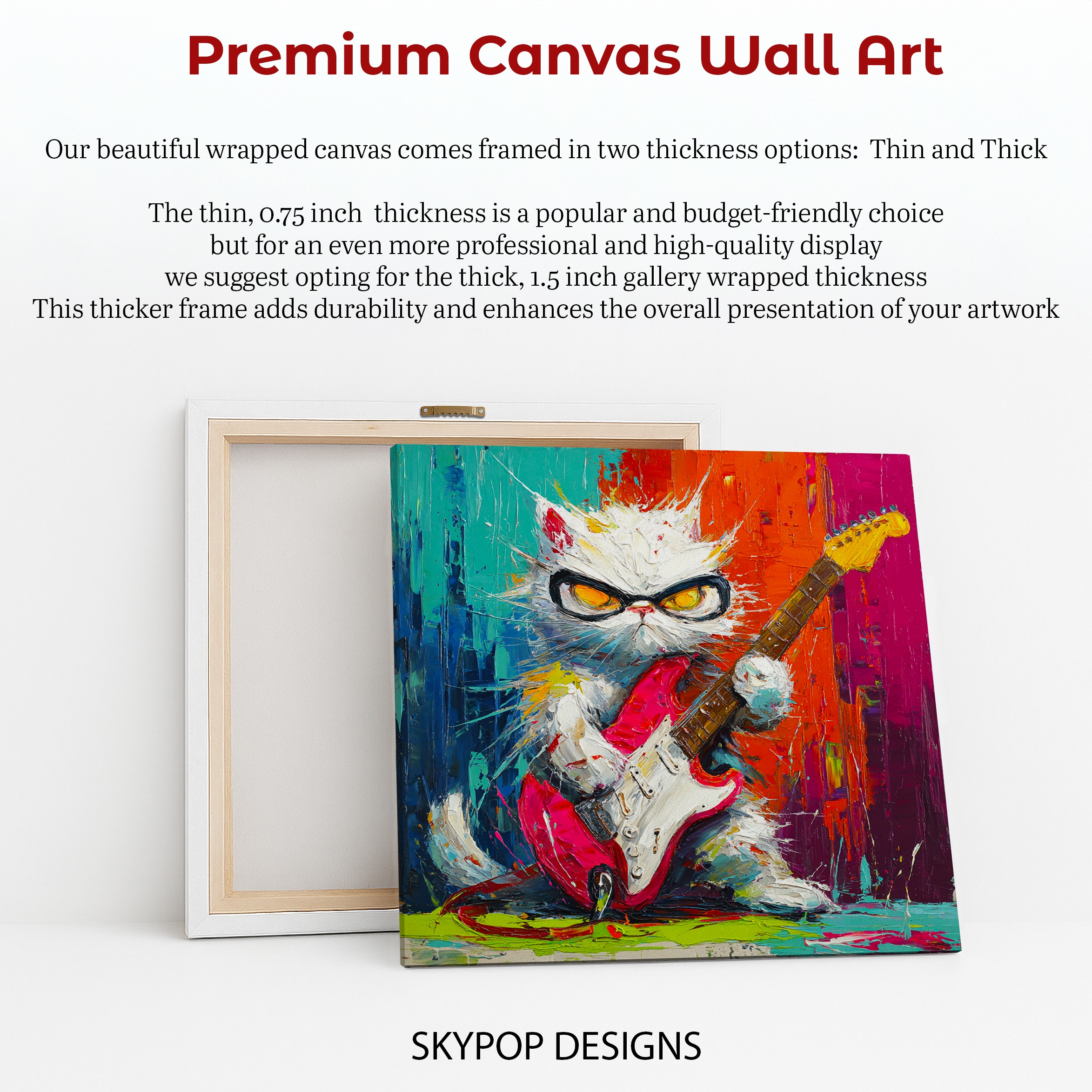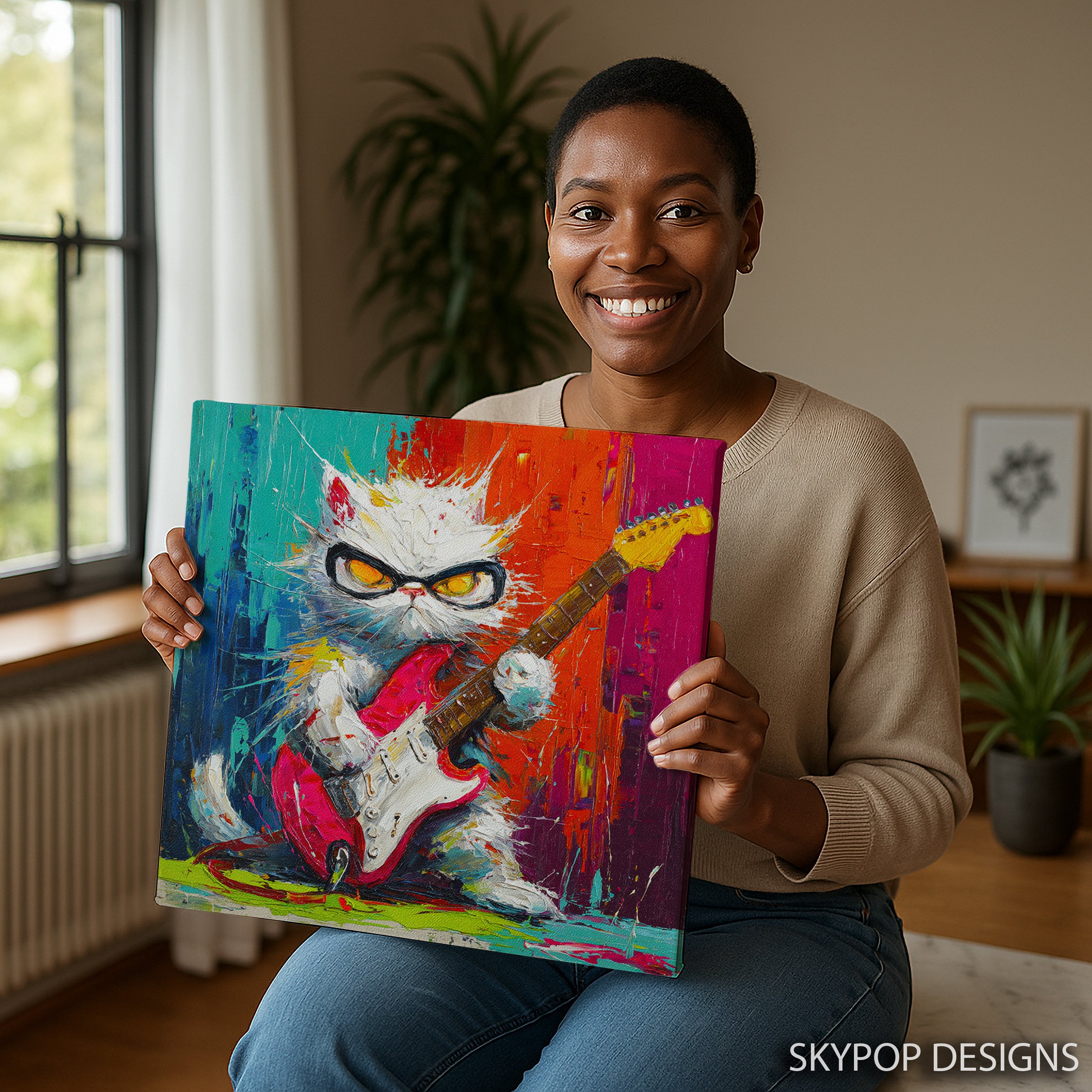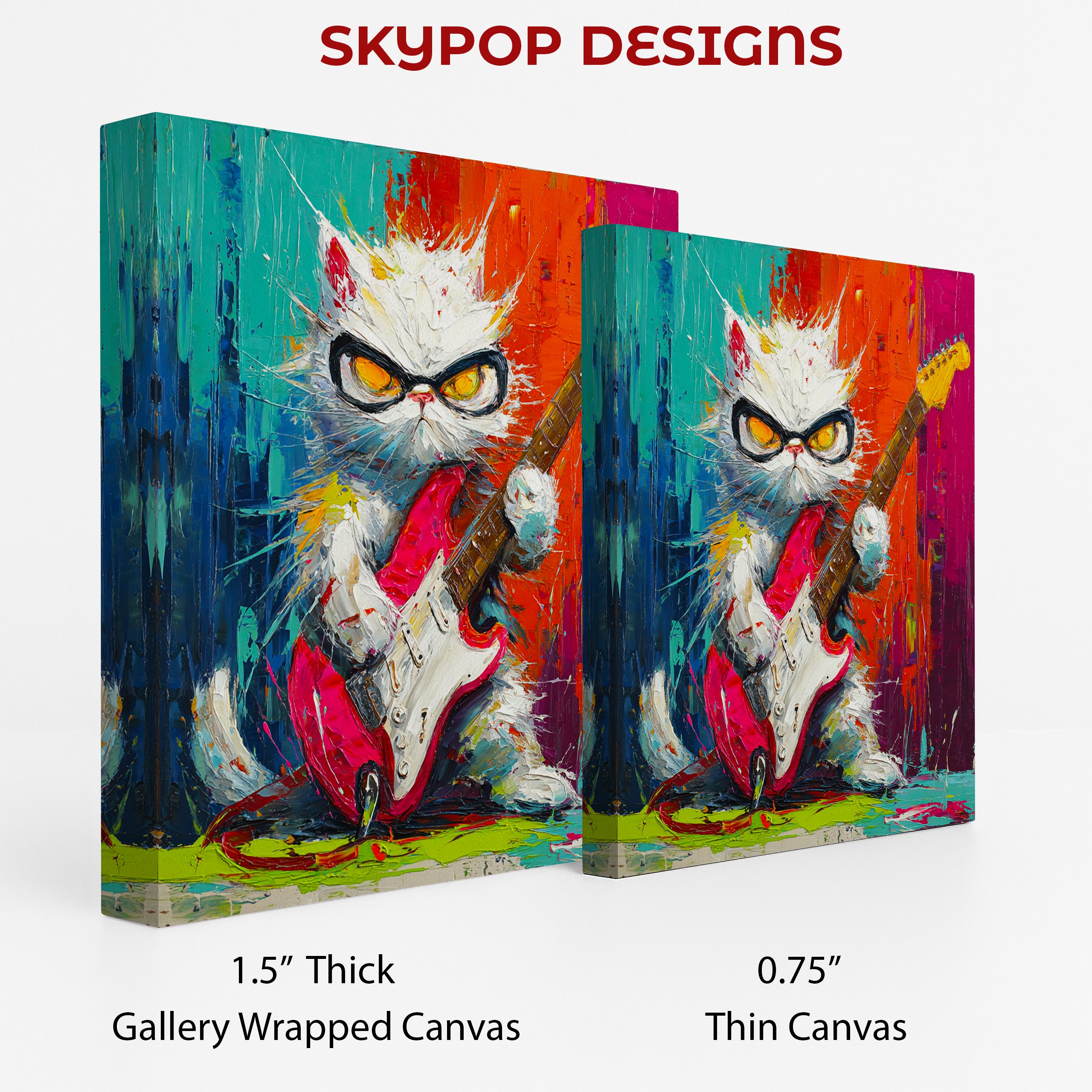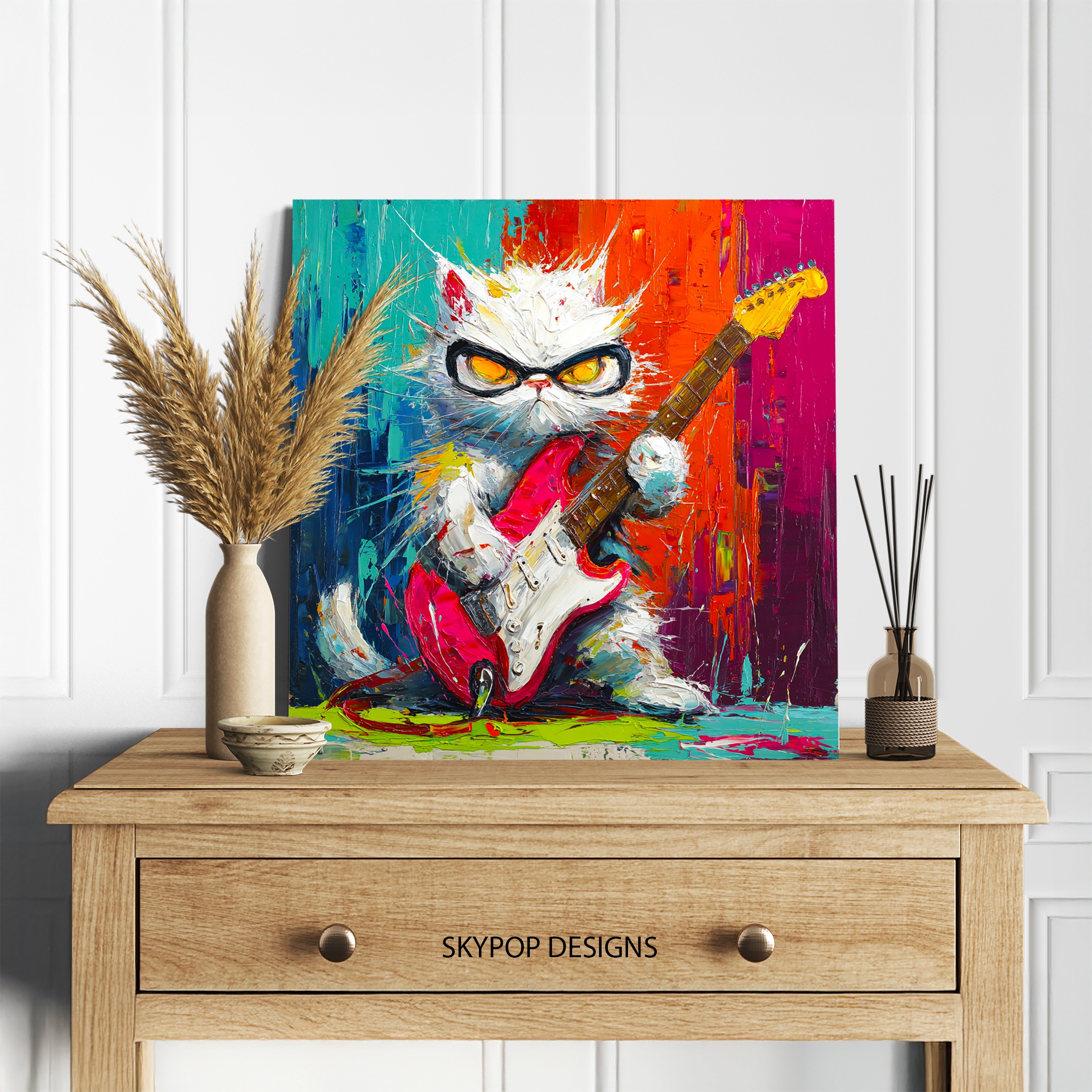 Unleash the power of music with this electrifying cat canvas wall art that’s sure to be the talk of any room. This vibrant poster features a cool white cat rocking out with a red electric guitar, set against a backdrop of explosive colors. Perfect for music lovers and cat enthusiasts alike, this modern wall decor adds a punch of personality to your living room, game room, or home office. The bold brushstrokes and vivid color palette create a dynamic energy that instantly livens up any space. Ideal for contemporary or bohemian interiors, this eye-catching piece celebrates the spirit of rock ‘n’ roll with a whimsical twist. The cat’s fierce expression and stylish shades give it attitude, while the splattered paint effect adds an urban, street art vibe. This versatile canvas art works great as a focal point in a music-themed room or as a quirky addition to a children’s bedroom. The high-quality printing ensures every detail pops, from the guitar strings to the cat’s expressive eyes. Whether you’re a seasoned musician or just love unique home decor, this playful cat artwork is sure to strike a chord. Transform your walls and infuse your space with creativity and fun. Add this rockin’ cat canvas to your art collection and amp up your home’s style today!