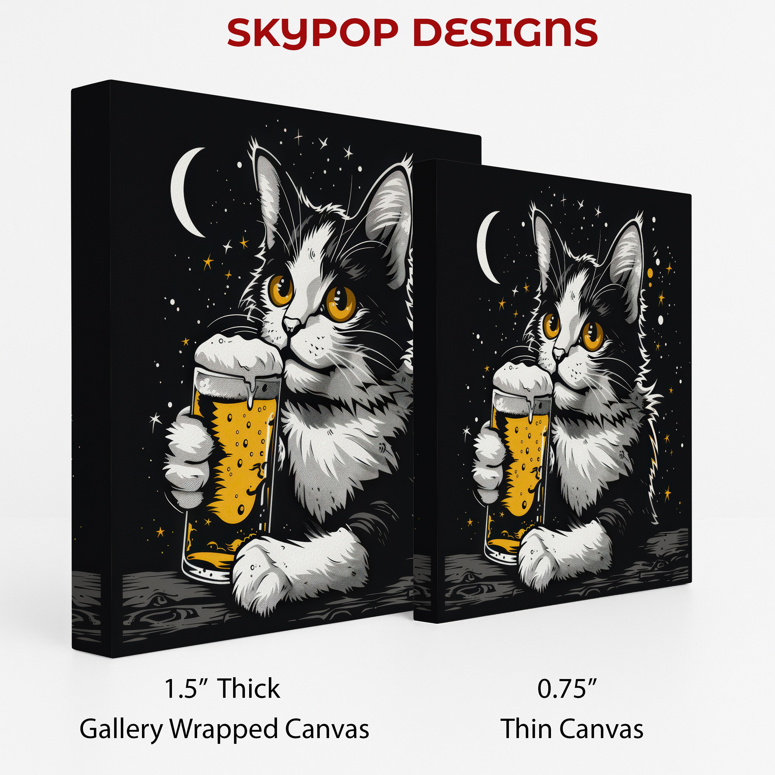 Transform your space with this captivating cat canvas wall art, featuring a stylish cat enjoying a refreshing beer under the starry night sky. The bold lines and striking black and white palette with pops of yellow create a humorous and eye-catching focal point. This unique poster or canvas wall art is perfect for modern living rooms, game rooms, or any space that needs a touch of personality. The whimsical yet modern design elevates any decor style, from contemporary to minimalist. The image of a cat with a beer evokes a sense of leisure and good times, making it ideal for bar areas or kitchens. High-quality printing ensures the vibrant details of the cat’s fur and the frothy beer shine through. This versatile artwork adds a cool and playful vibe to your home. It is a great gift for cat lovers, beer enthusiasts, or anyone looking to add a unique piece of wall decor. Elevate your home’s atmosphere with this fun and quirky blend of pop art and animal art. Make this memorable cat artwork the centerpiece of your collection today.