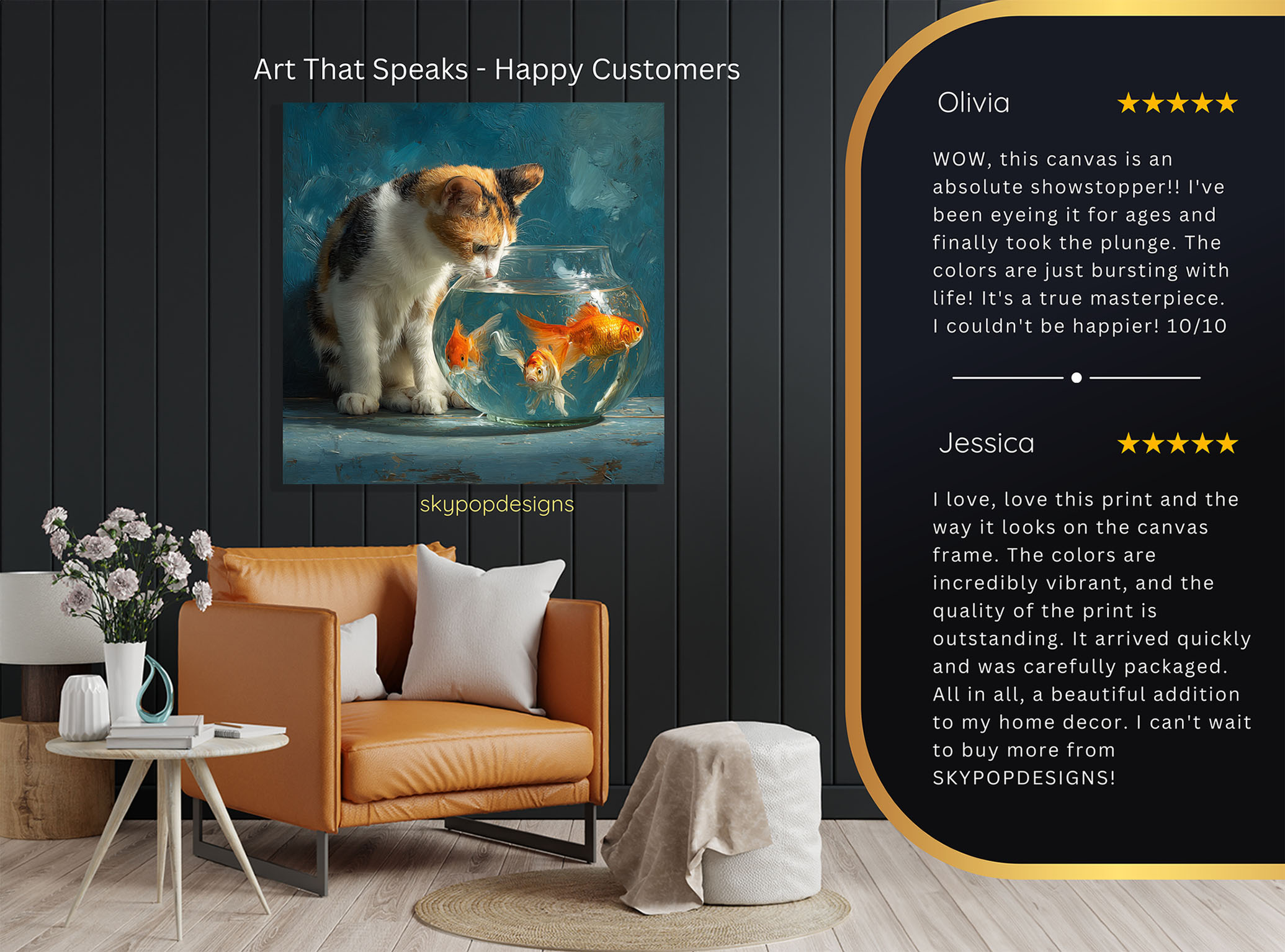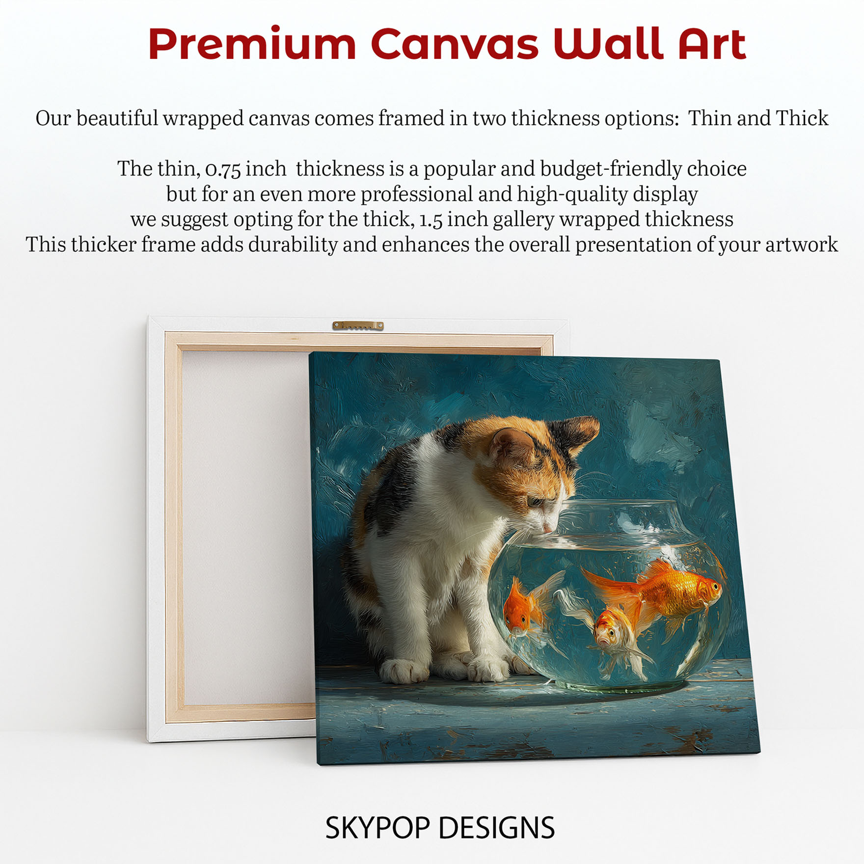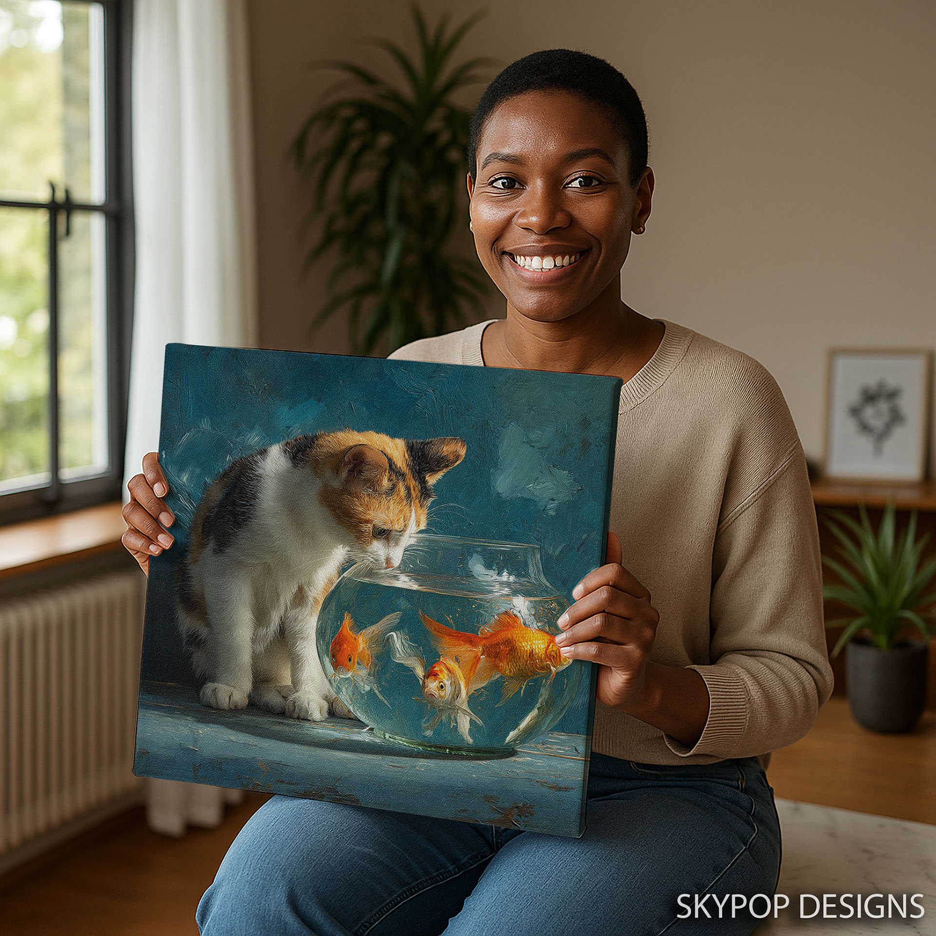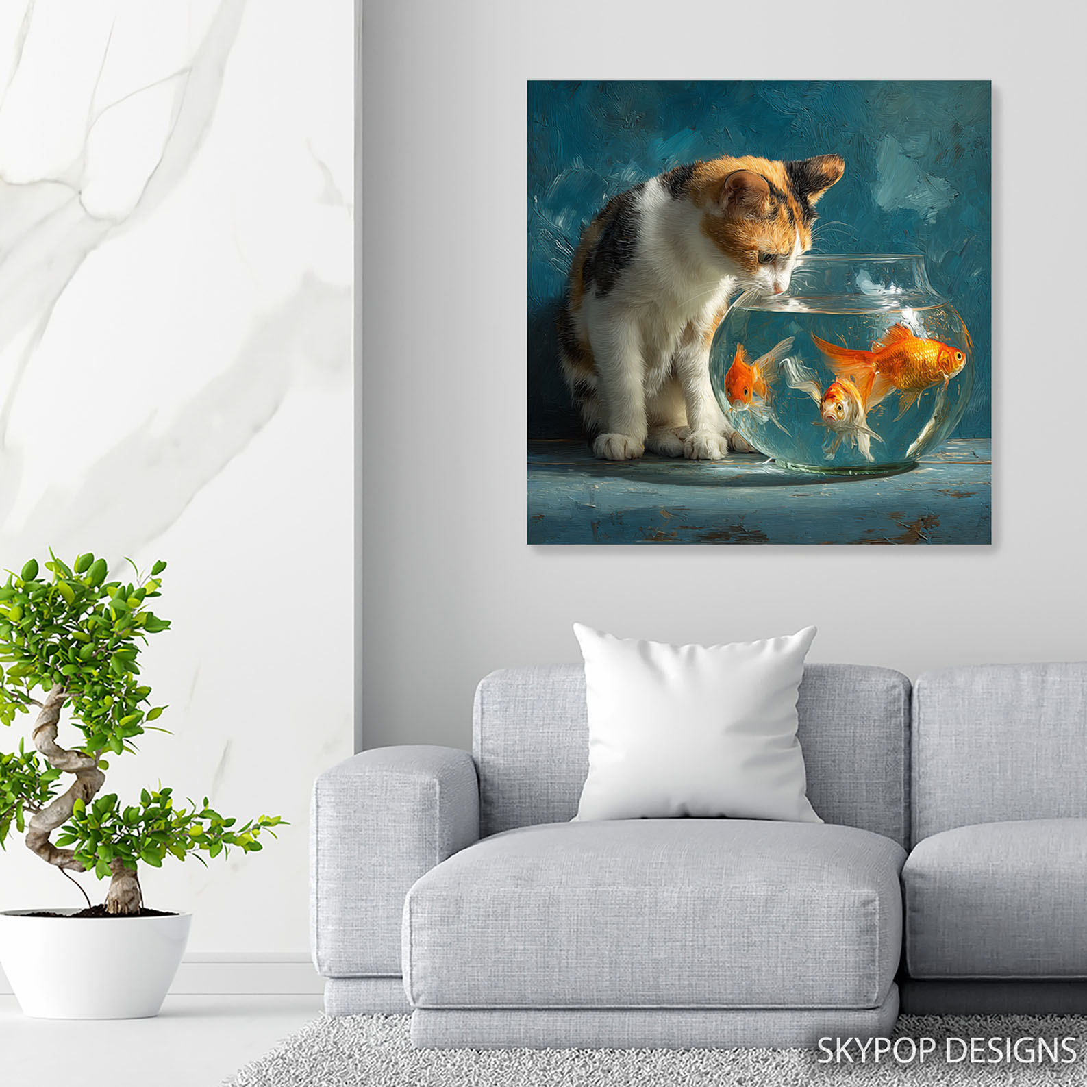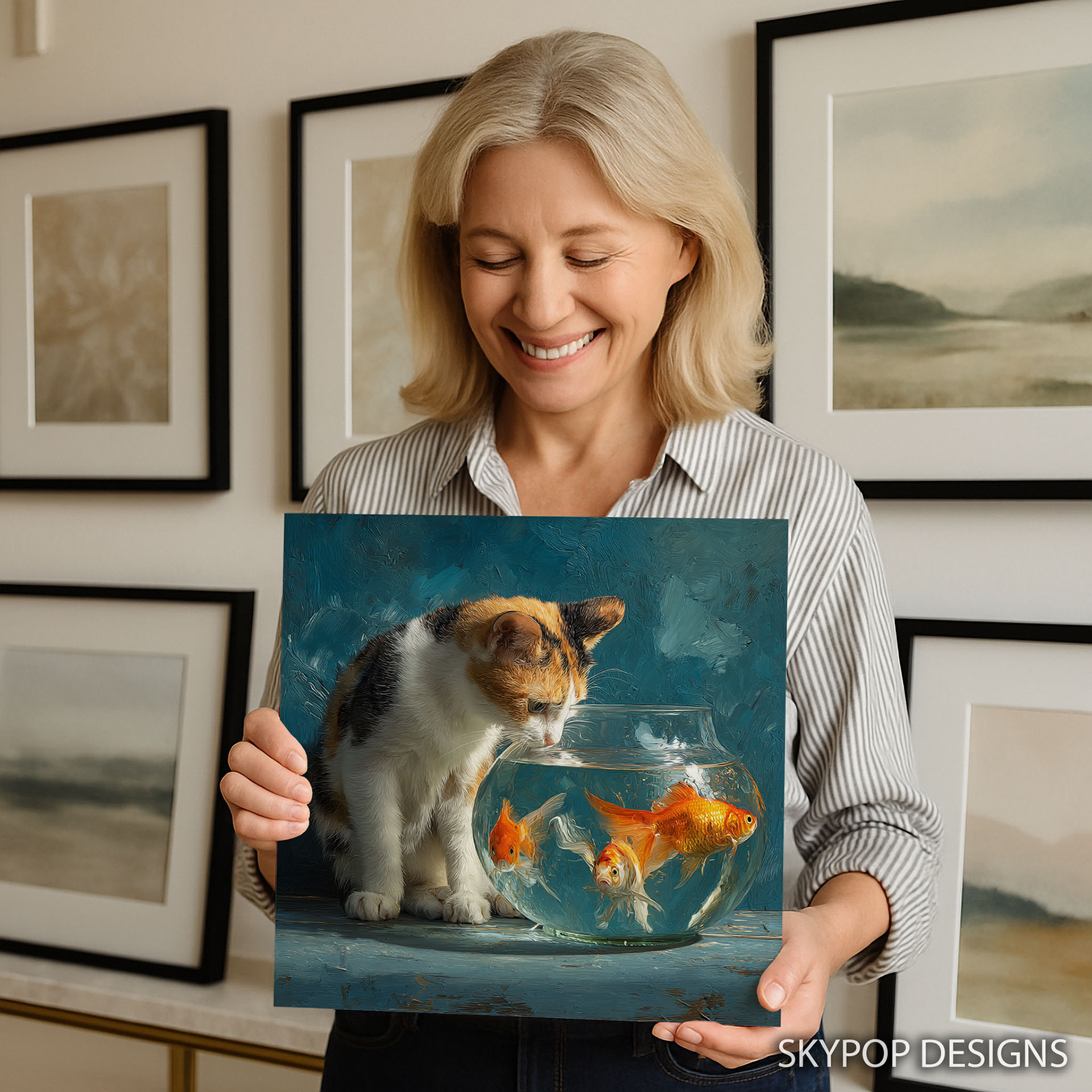 Capture the charm and curiosity of everyday life with this captivating cat and goldfish wall art, a perfect addition to any animal lover’s collection.