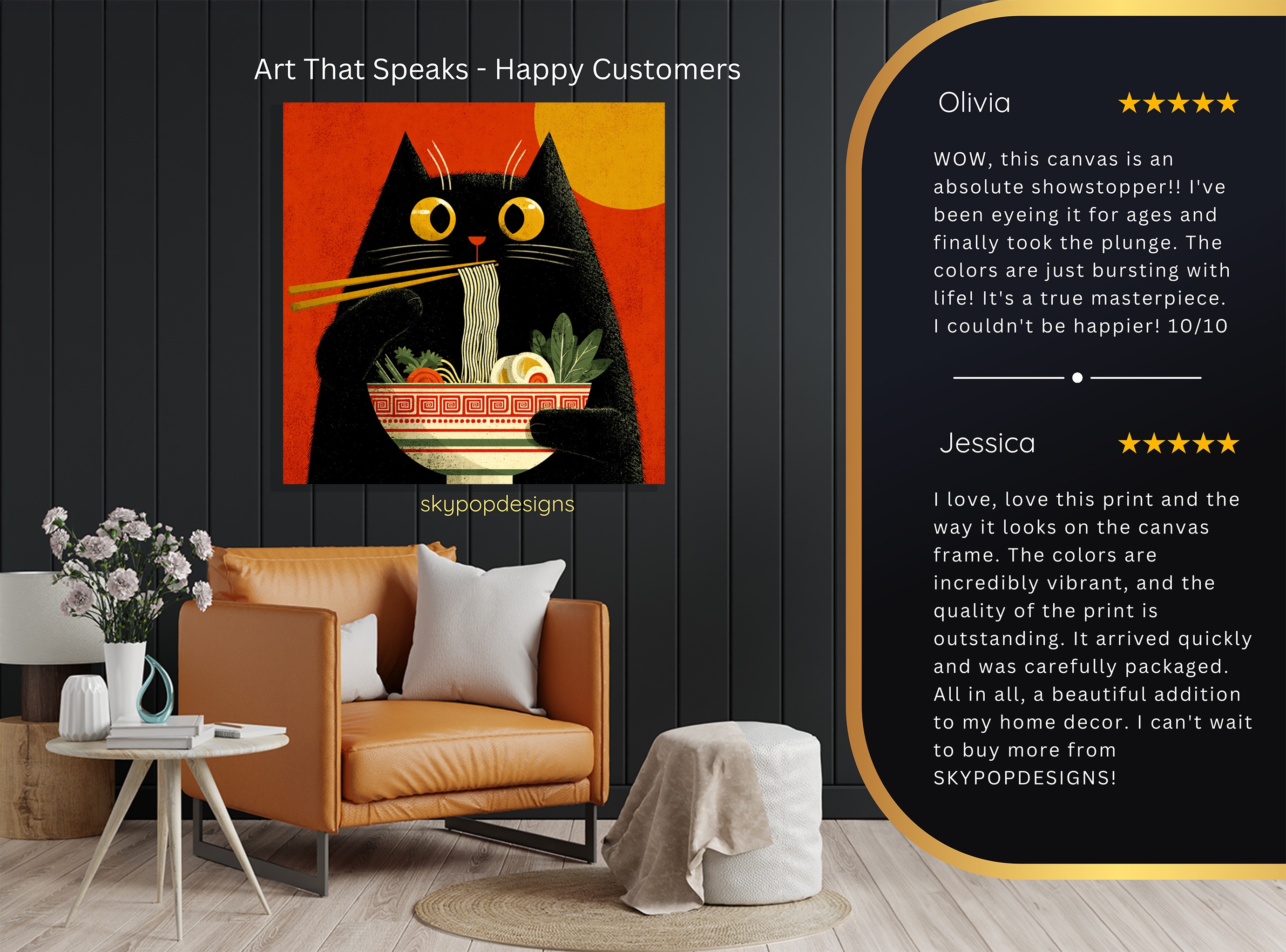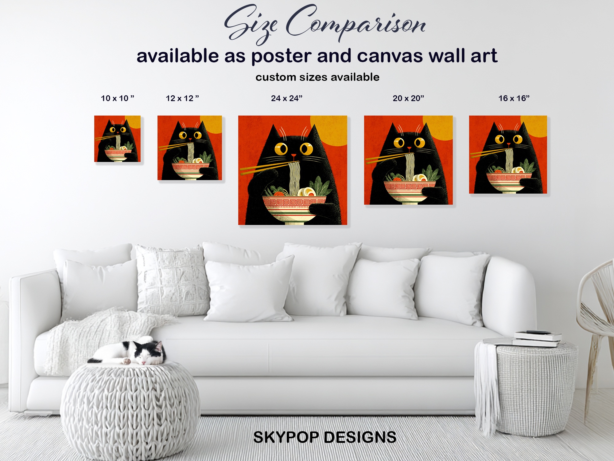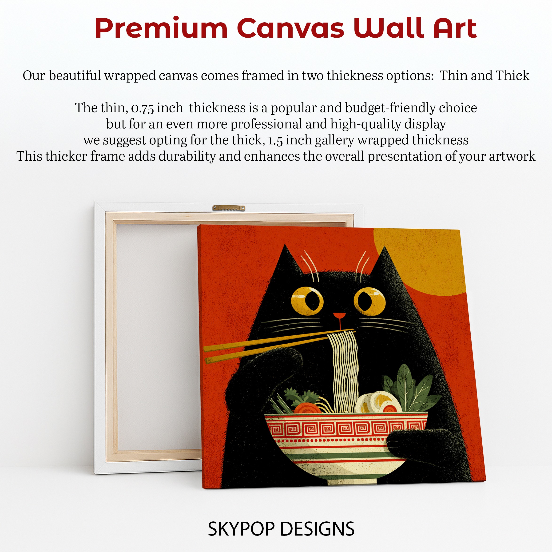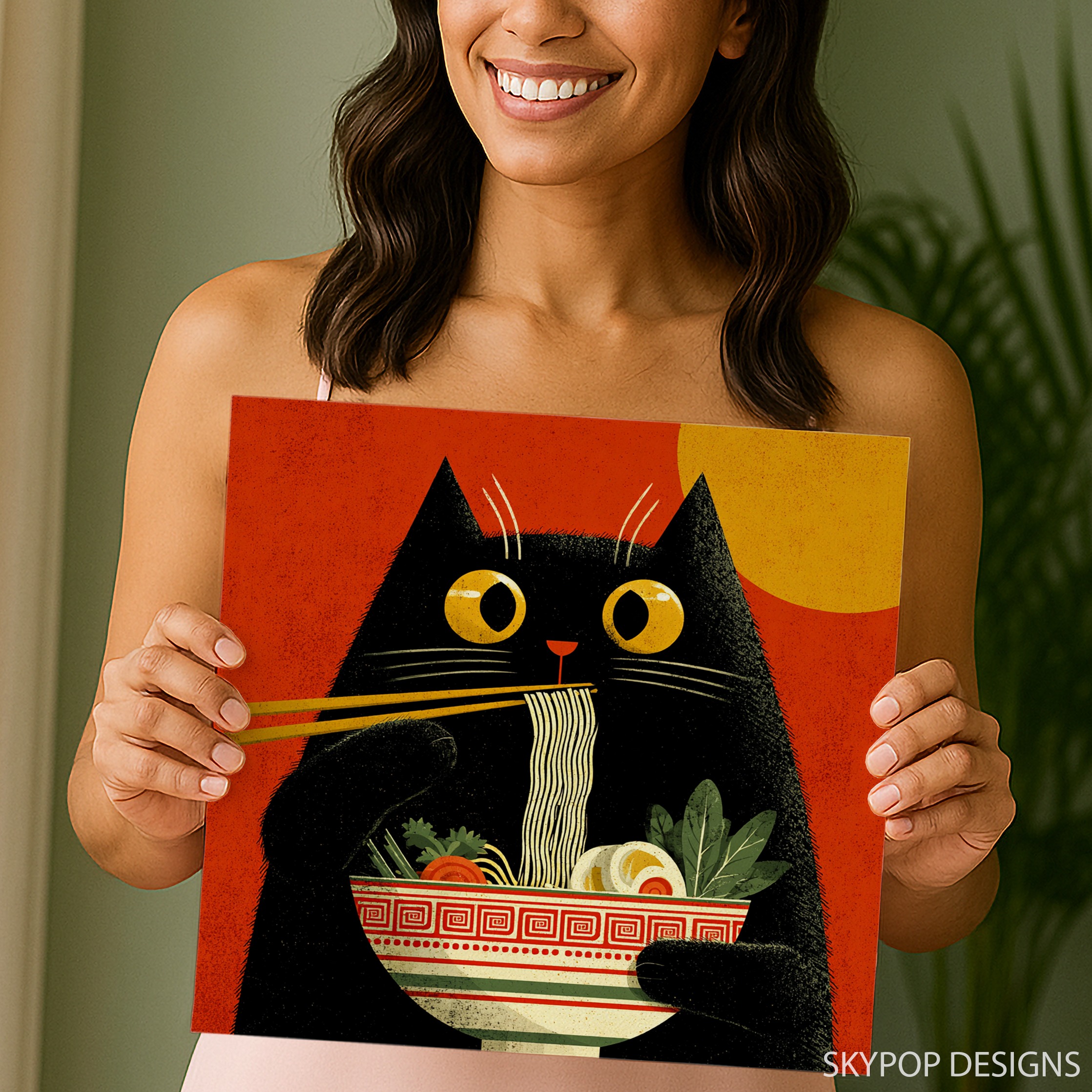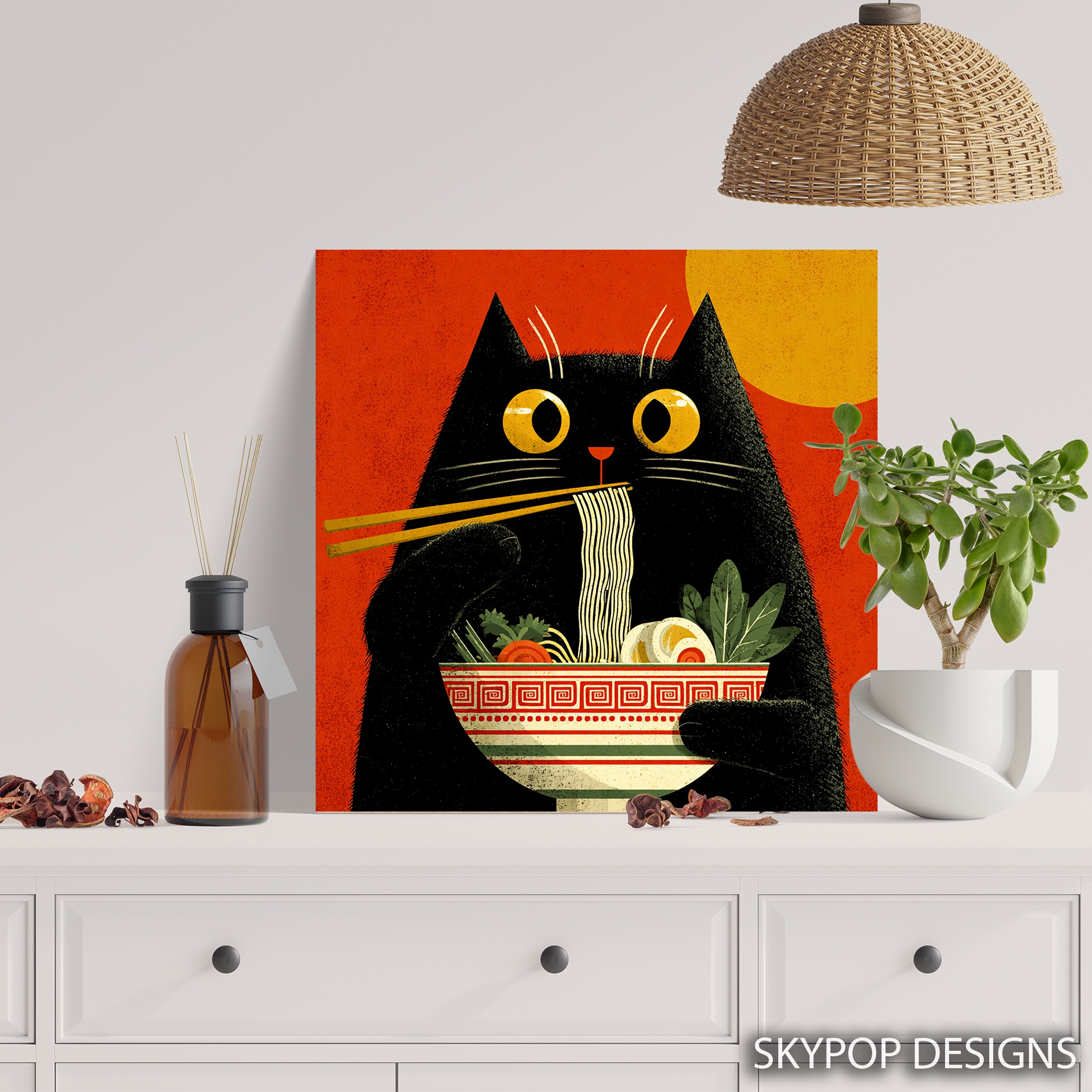 Spice up your space with this quirky cat noodle canvas wall art that’s sure to make you smile! This eye-catching poster features a charming black cat with big yellow eyes slurping up a bowl of noodles. Perfect for adding a touch of whimsy to your kitchen or dining room, this modern wall art combines cute animal art with a fun food theme. The bold red background and geometric yellow sun create a striking contrast against the cat’s sleek black fur, making this piece pop on any wall. Ideal for contemporary decor lovers, this canvas art brings personality and humor to minimalist spaces. The stylized design and vibrant colors make it a great conversation starter for your home office or living room. This versatile artwork works well in various room sizes, from cozy apartments to spacious lofts. Give your space an instant mood boost with this playful cat wall art that celebrates the joy of good food and feline friends. The high-quality print captures every detail, from the cat’s whiskers to the steam rising from the noodle bowl. Whether you’re a cat lover, foodie, or just someone who appreciates unique wall decor, this canvas poster is sure to delight. Transform your space today with this adorable and appetite-inducing cat noodle art that’s both trendy and timeless.