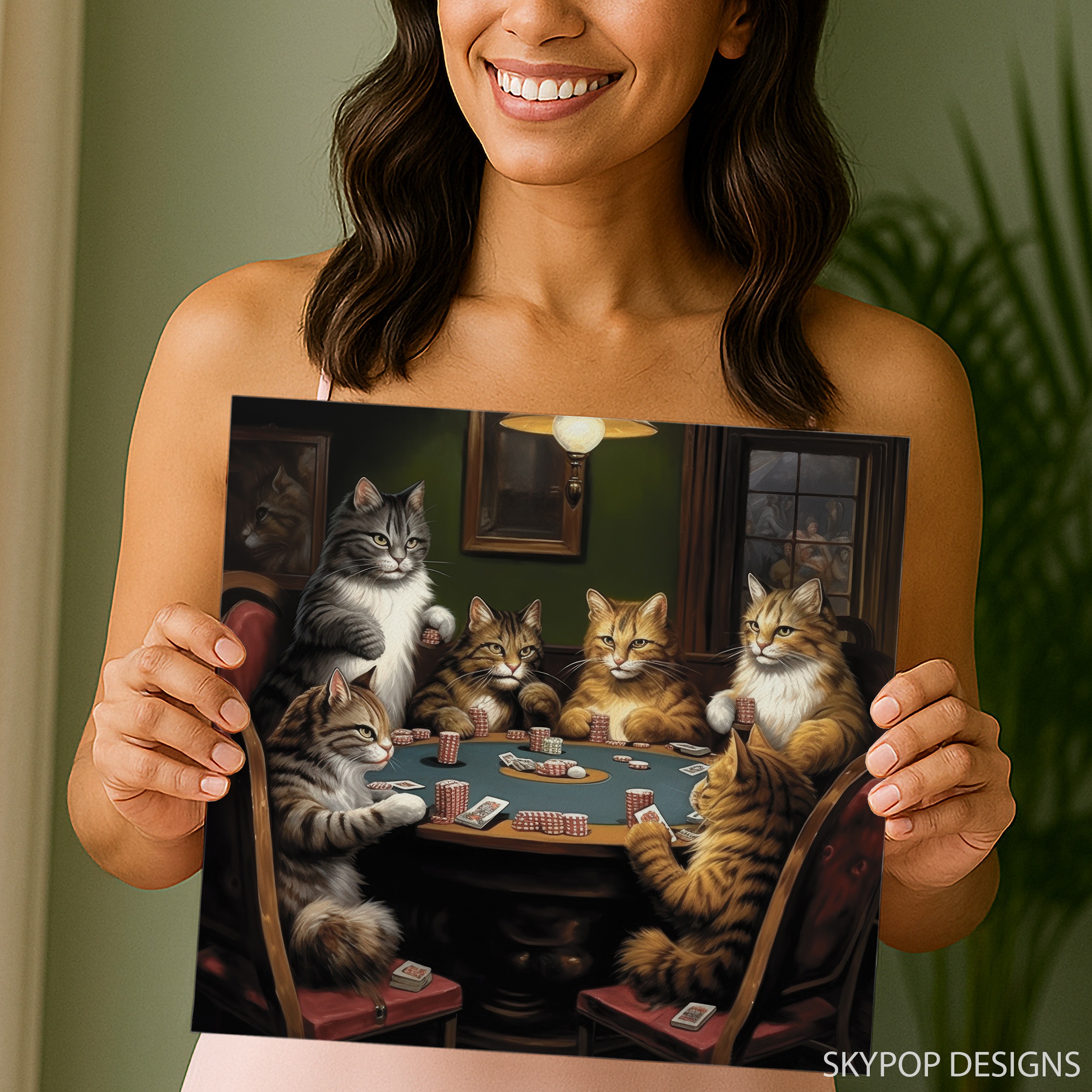 Transform your space with this captivating cats playing poker canvas wall art, a unique piece that brings a touch of whimsical charm to any room. This striking poster features a group of anthropomorphic cats engaged in a lively poker game, perfect for adding personality to your living room or game room. The rich color palette, dominated by warm browns and deep greens with accents of gold, creates an inviting and sophisticated atmosphere. This animal art is ideal for contemporary and eclectic decor styles, offering a conversation starter that’s both humorous and visually appealing. The detailed portrayal of the cats, each with distinct expressions and actions, makes this a truly engaging canvas print. Enhance your home with this fun and quirky wall art, a great gift for cat lovers or anyone who enjoys a bit of playful sophistication in their decor. The vibrant, yet classic rendering makes this poster suitable for a modern office or a stylish entryway. Elevate your home’s aesthetic with this unique blend of pop art and animal-themed decor, celebrating life’s amusing moments. This high-quality canvas wall art is designed to inspire joy and add character to your walls. Add this playful poker night artwork to your collection and let the good times roll in your home.
