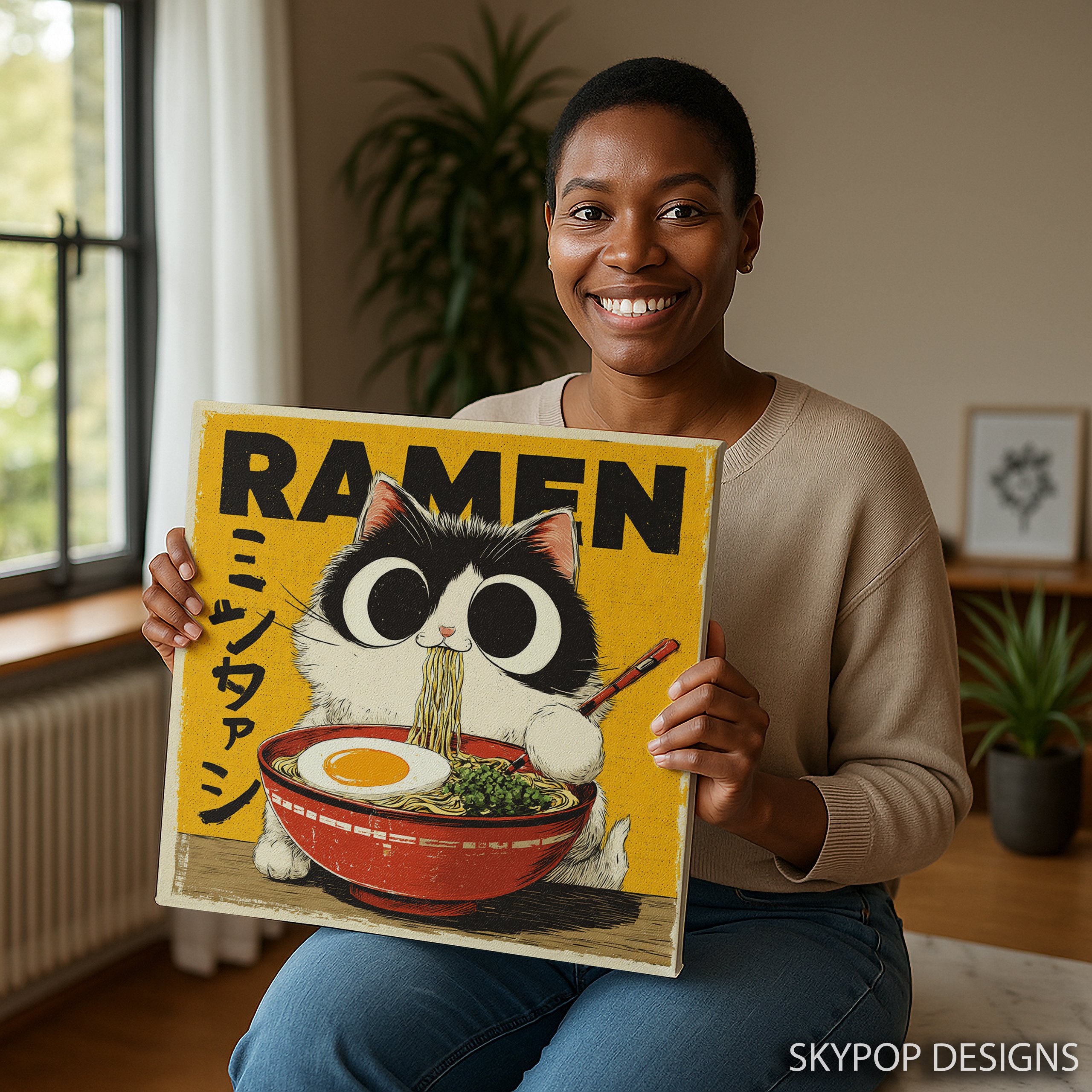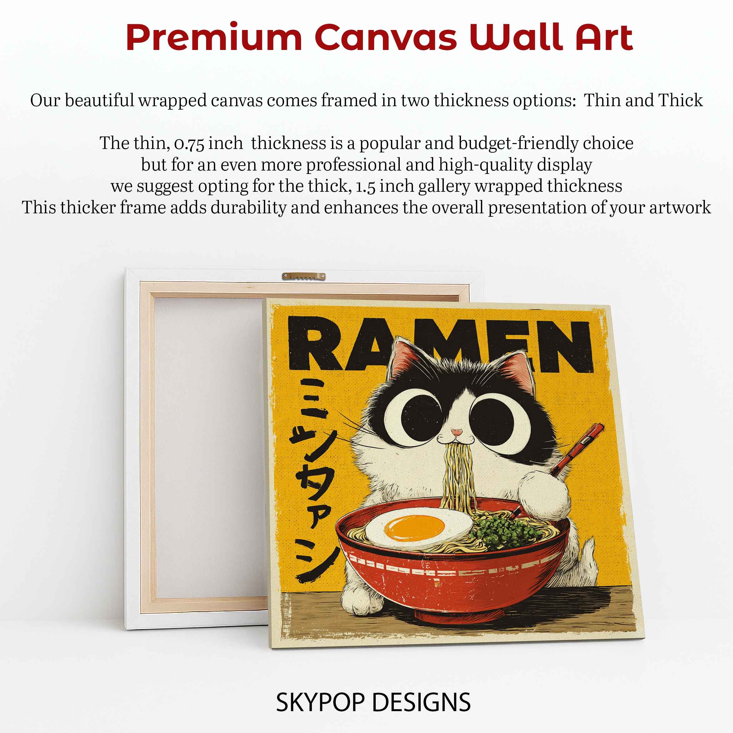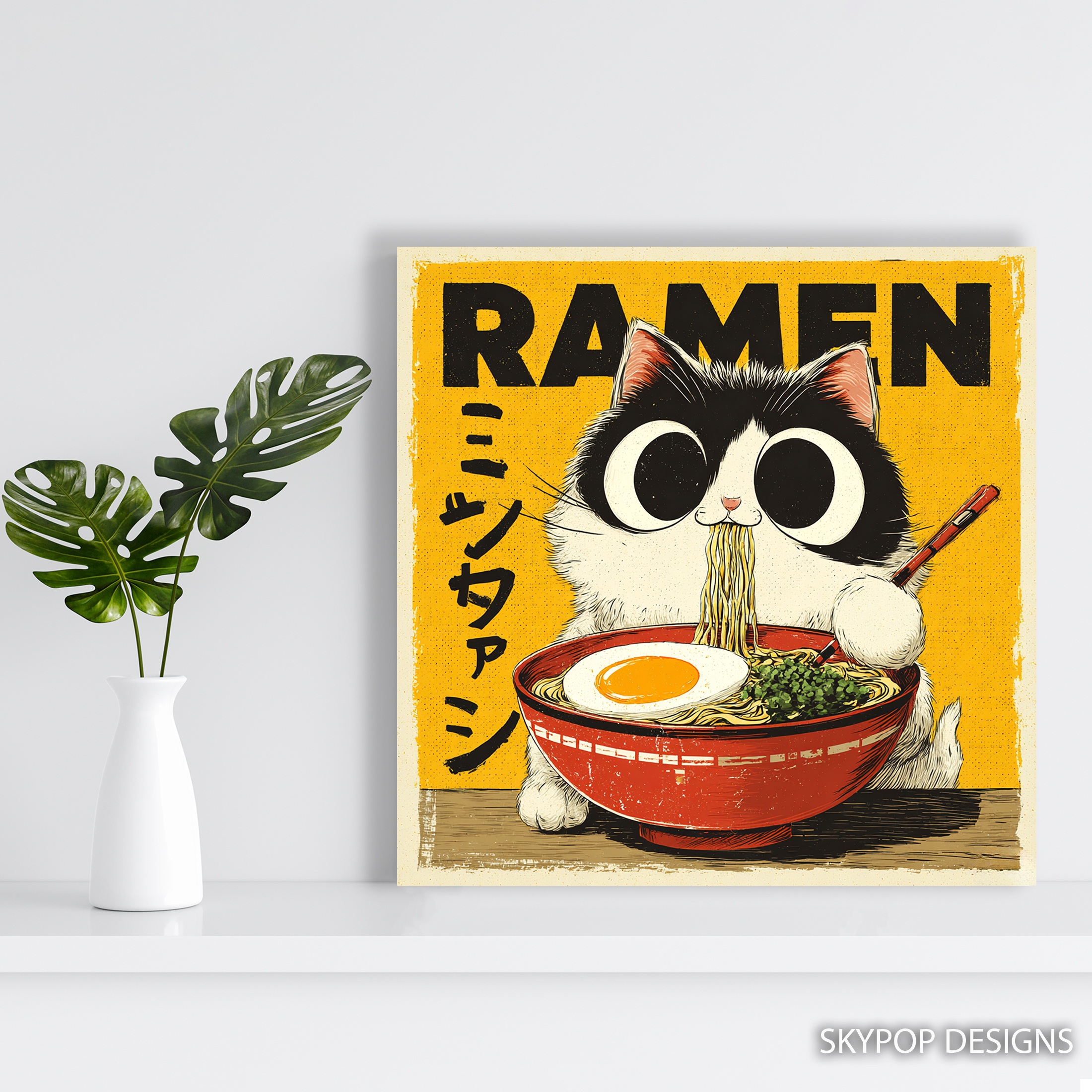 Bring a burst of quirky charm to your space with this eye-catching ramen cat canvas wall art. This vibrant poster features an adorable wide-eyed cat slurping up noodles from a big red bowl of ramen, set against a bold yellow background. Perfect for adding a playful touch to modern kitchens or contemporary dining rooms, this whimsical piece combines pop art style with Japanese-inspired cuisine. The striking color palette of red, yellow, and black creates a dynamic visual impact that instantly draws attention and livens up any wall. Ideal for food lovers, cat enthusiasts, or anyone looking to inject some fun into their decor, this canvas art serves up a delightful blend of humor and artistic flair. The large, expressive eyes of the cat and the detailed illustration of the ramen bowl make this piece a conversation starter in home offices or living rooms. High-quality printing ensures every whisker and noodle strand is captured in crisp detail, whether you choose it as a poster or stretched canvas. This versatile artwork adapts well to various interior styles, from minimalist modern to eclectic Asian-inspired spaces. Give your walls a tasty upgrade with this unique cat and ramen themed wall art that celebrates the joy of food and feline charm. Transform your room’s atmosphere with this pop art cat poster that’s sure to make you smile every time you see it.