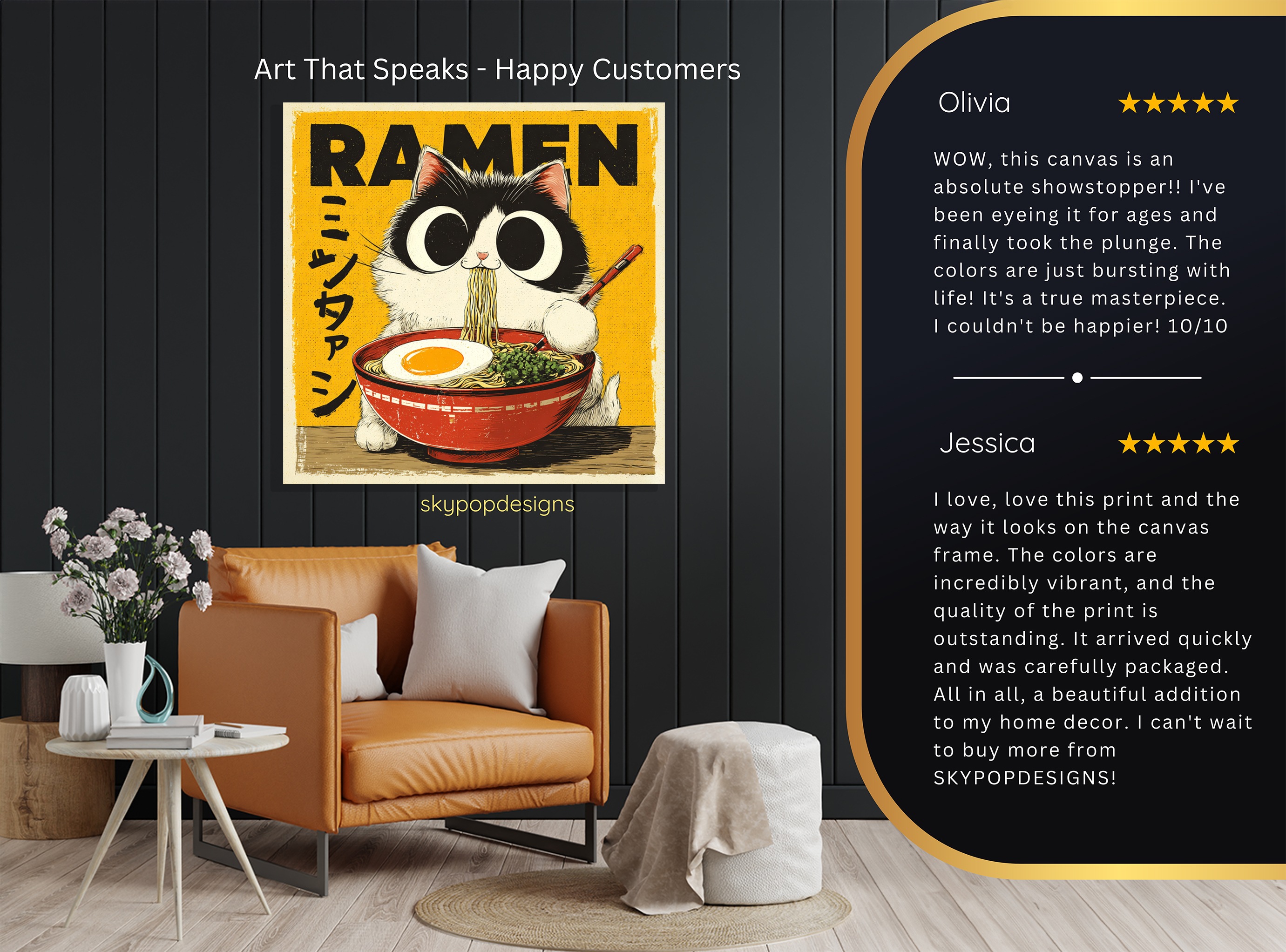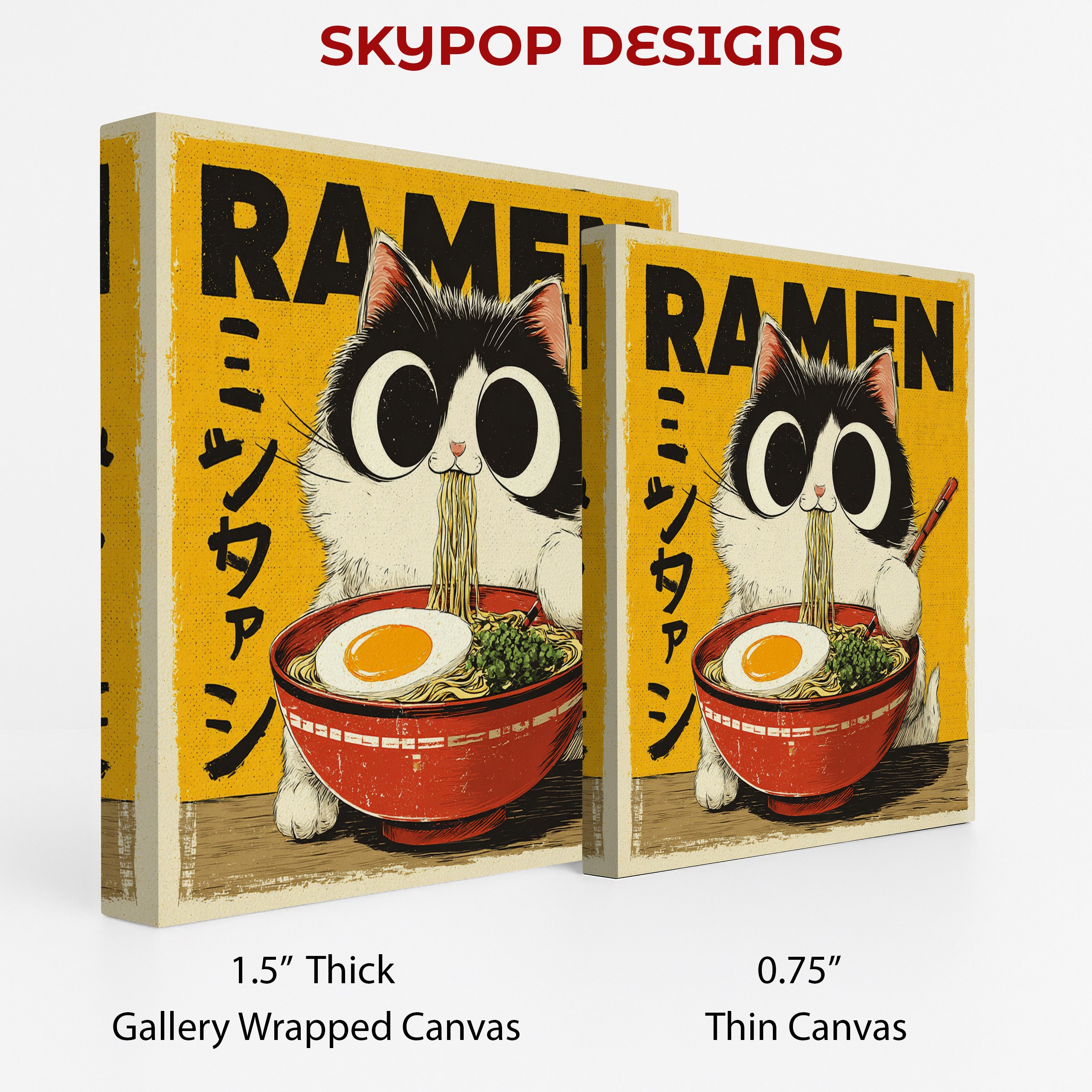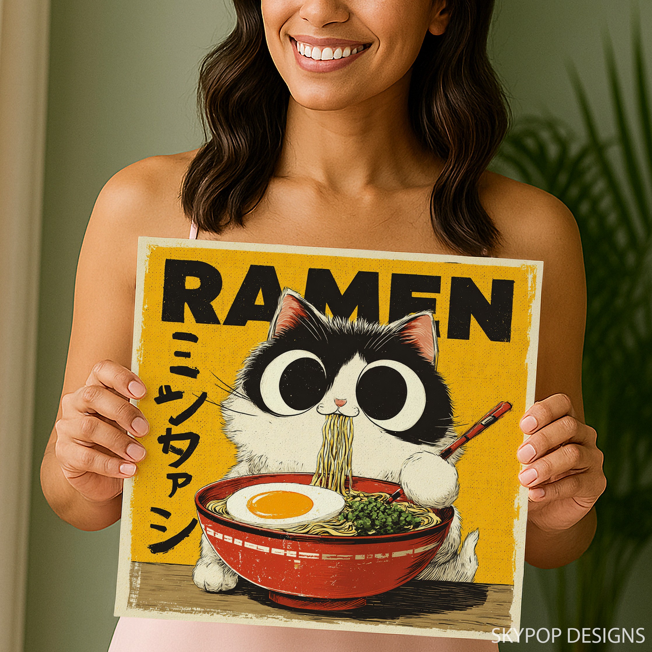 Bring a burst of quirky charm to your space with this eye-catching ramen cat canvas wall art. This vibrant poster features an adorable wide-eyed cat slurping up noodles from a big red bowl of ramen, set against a bold yellow background. Perfect for adding a playful touch to modern kitchens or contemporary dining rooms, this whimsical piece combines pop art style with Japanese-inspired cuisine. The striking color palette of red, yellow, and black creates a dynamic visual impact that instantly draws attention and livens up any wall. Ideal for food lovers, cat enthusiasts, or anyone looking to inject some fun into their decor, this canvas art serves up a delightful blend of humor and artistic flair. The large, expressive eyes of the cat and the detailed illustration of the ramen bowl make this piece a conversation starter in home offices or living rooms. High-quality printing ensures every whisker and noodle strand is captured in crisp detail, whether you choose it as a poster or stretched canvas. This versatile artwork adapts well to various interior styles, from minimalist modern to eclectic Asian-inspired spaces. Give your walls a tasty upgrade with this unique cat and ramen themed wall art that celebrates the joy of food and feline charm. Transform your room’s atmosphere with this pop art cat poster that’s sure to make you smile every time you see it.