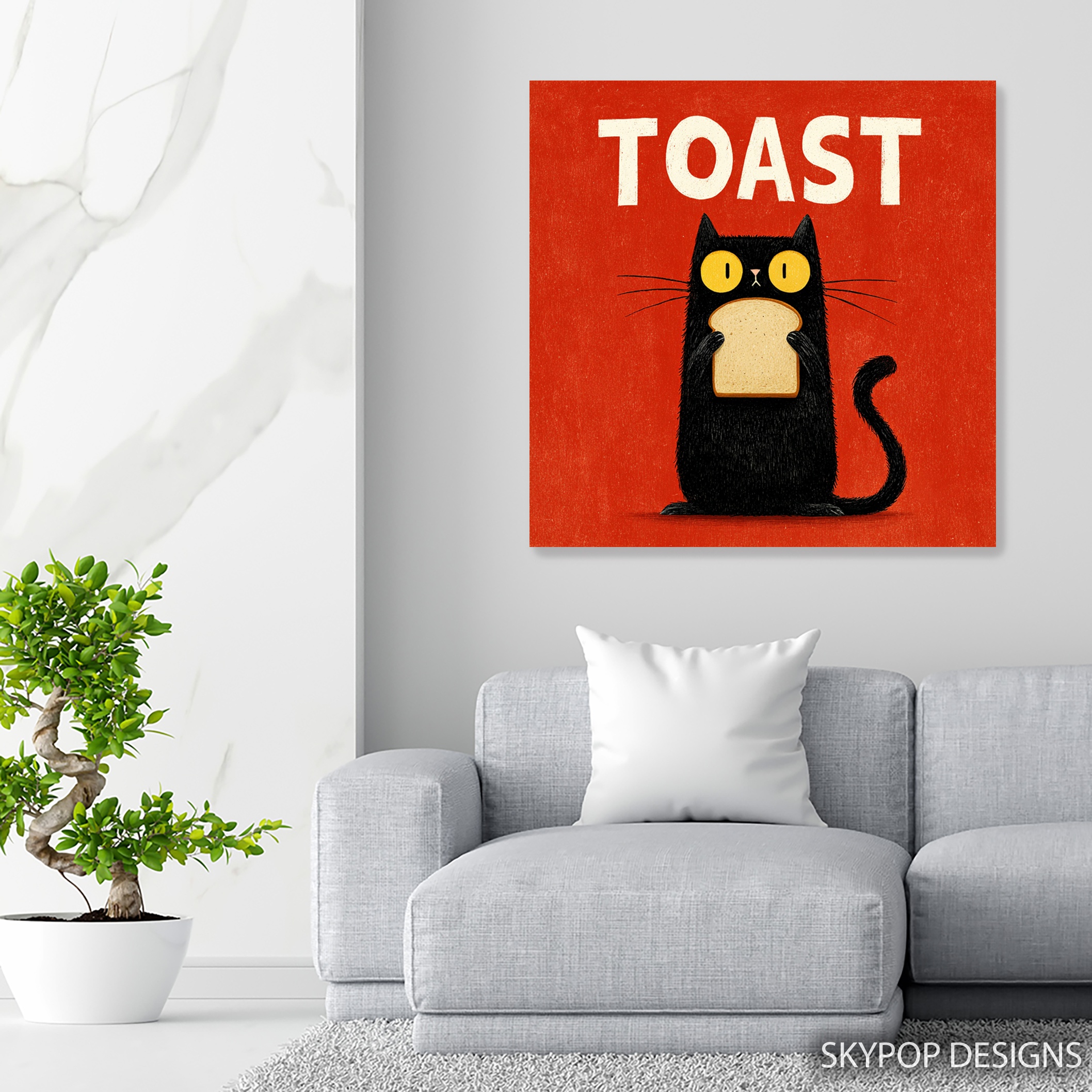 Elevate your kitchen or dining room with this charming and quirky cat toast canvas wall art. This eye-catching poster features a wide-eyed black cat humorously holding a slice of toast against a vibrant red background. Perfect for contemporary spaces, this whimsical animal art adds a pop of color and playful energy to any room. The minimalist design and bold typography make it an ideal piece for modern kitchens or cozy breakfast nooks. The striking contrast between the black cat, yellow eyes, and white toast creates a visually appealing composition that draws the eye. This unique canvas art celebrates the joy of simple pleasures, making it a great conversation starter for dinner parties or family gatherings. The retro-inspired style gives a nod to vintage advertising posters, adding a touch of nostalgia to your decor. Ideal for cat lovers or anyone with a sense of humor, this versatile artwork works well in children’s rooms, offices, or as a quirky addition to a gallery wall. The high-quality printing ensures every detail, from the cat’s whiskers to the texture of the toast, is captured beautifully. Whether you’re looking to add some personality to your kitchen or searching for a fun housewarming gift, this toast cat art is sure to bring smiles. Transform your space today with this delightful blend of humor, art, and feline charm.