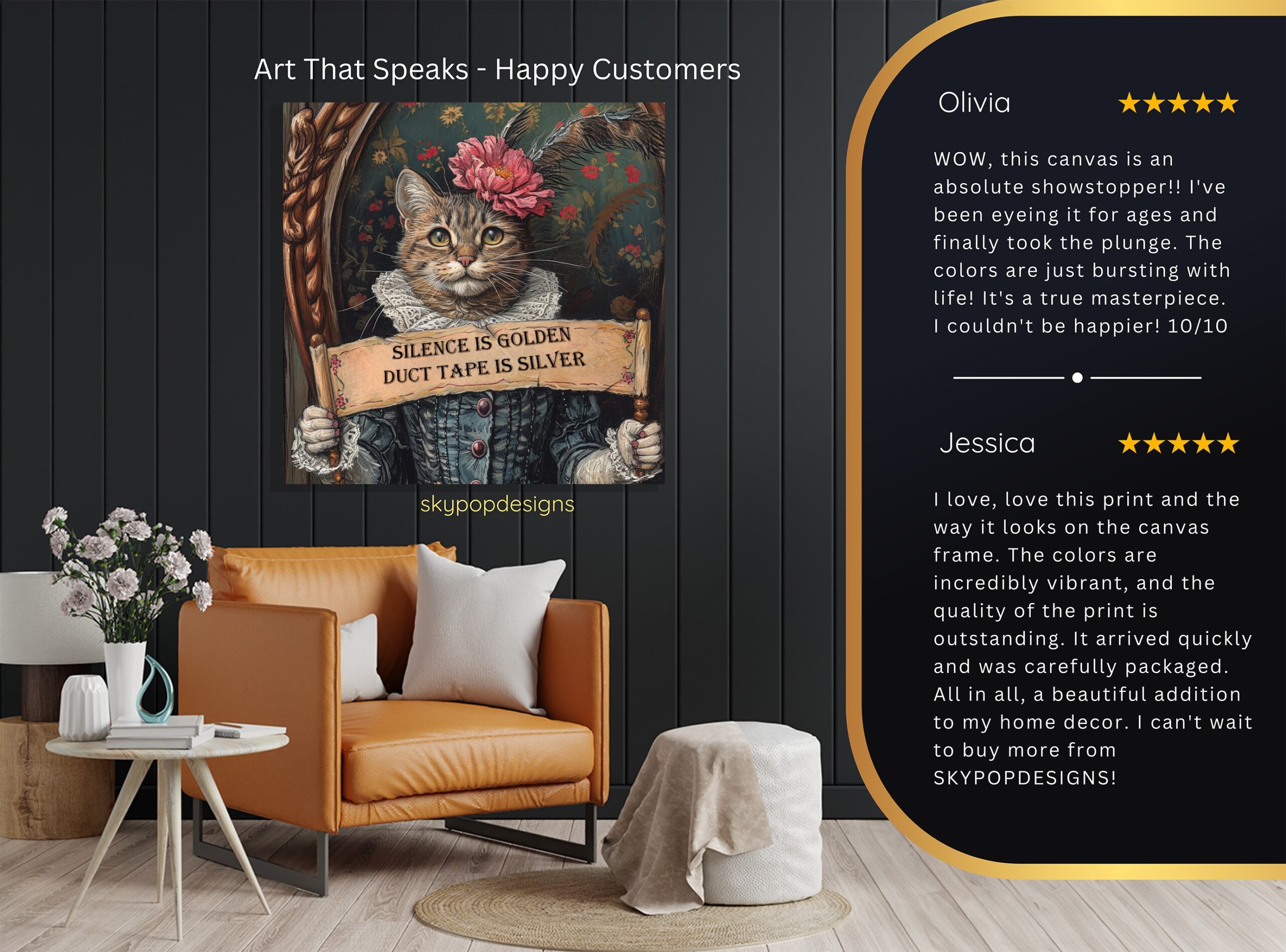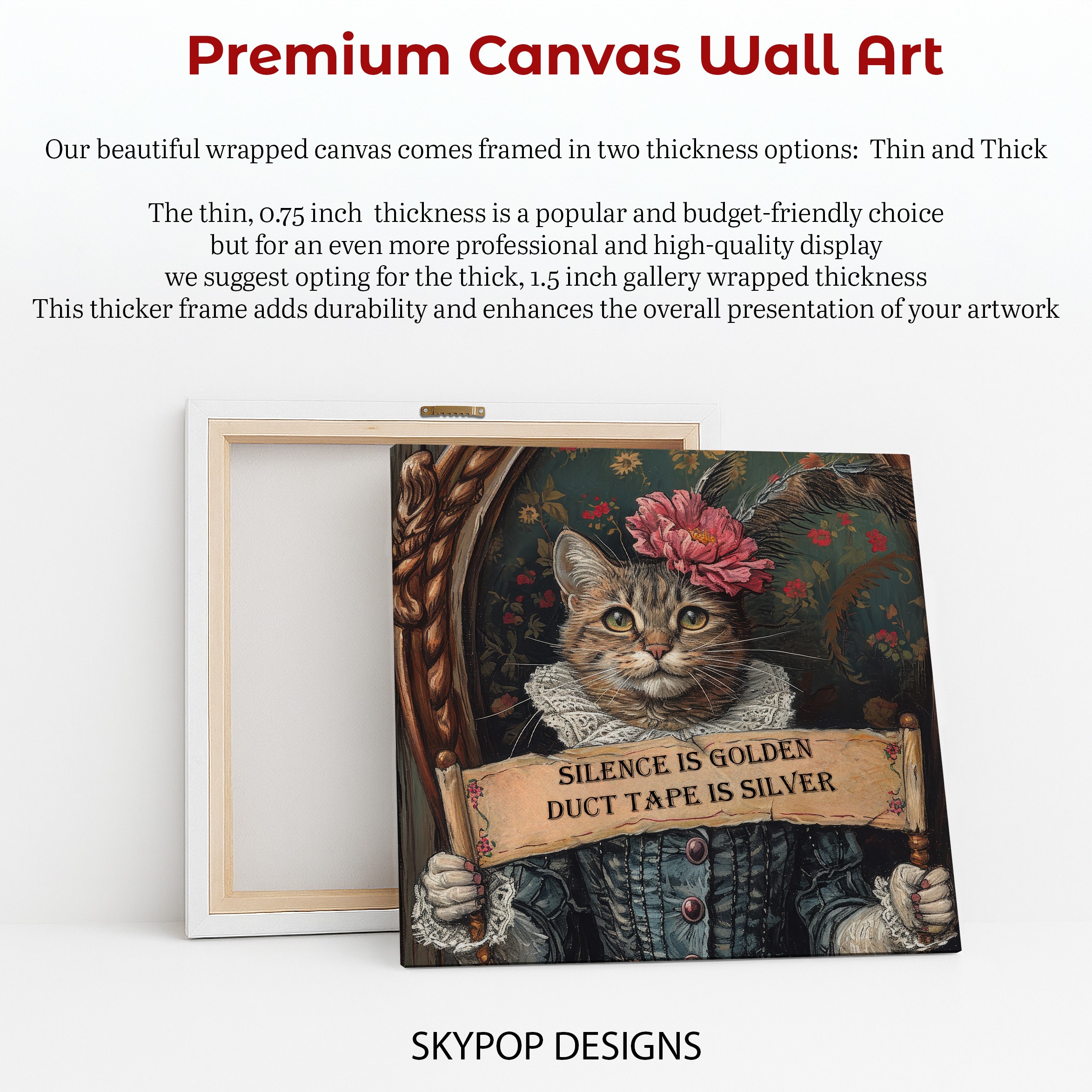 Discover this captivating cat canvas wall art that brings a touch of vintage charm and humor to your home. Featuring a distinguished cat dressed in period clothing, this piece is a conversation starter that will elevate any living room, bedroom, or office. The quote SILENCE IS GOLDEN DUCT TAPE IS SILVER adds a playful, unexpected twist to the classic art style. This striking poster or canvas wall art showcases intricate details in the cat’s expression and attire, set against a rich, dark background with floral accents. It’s perfect for those who appreciate unique animal art and eclectic decor, fitting seamlessly into bohemian or traditional settings. The blend of muted colors and bold text creates a visually engaging piece that adds personality to your walls. This artwork is ideal for anyone looking to incorporate artistic and witty elements into their home decor. Surprise a cat lover with this memorable gift for a birthday, housewarming, or any special occasion. The high-quality canvas ensures vibrant colors and sharp details, making it a stunning addition to your collection. Transform your space with this unique wall art that promises to bring smiles and charm. Add this exquisite cat artwork to your decor for an instant personality boost and a touch of timeless wit.