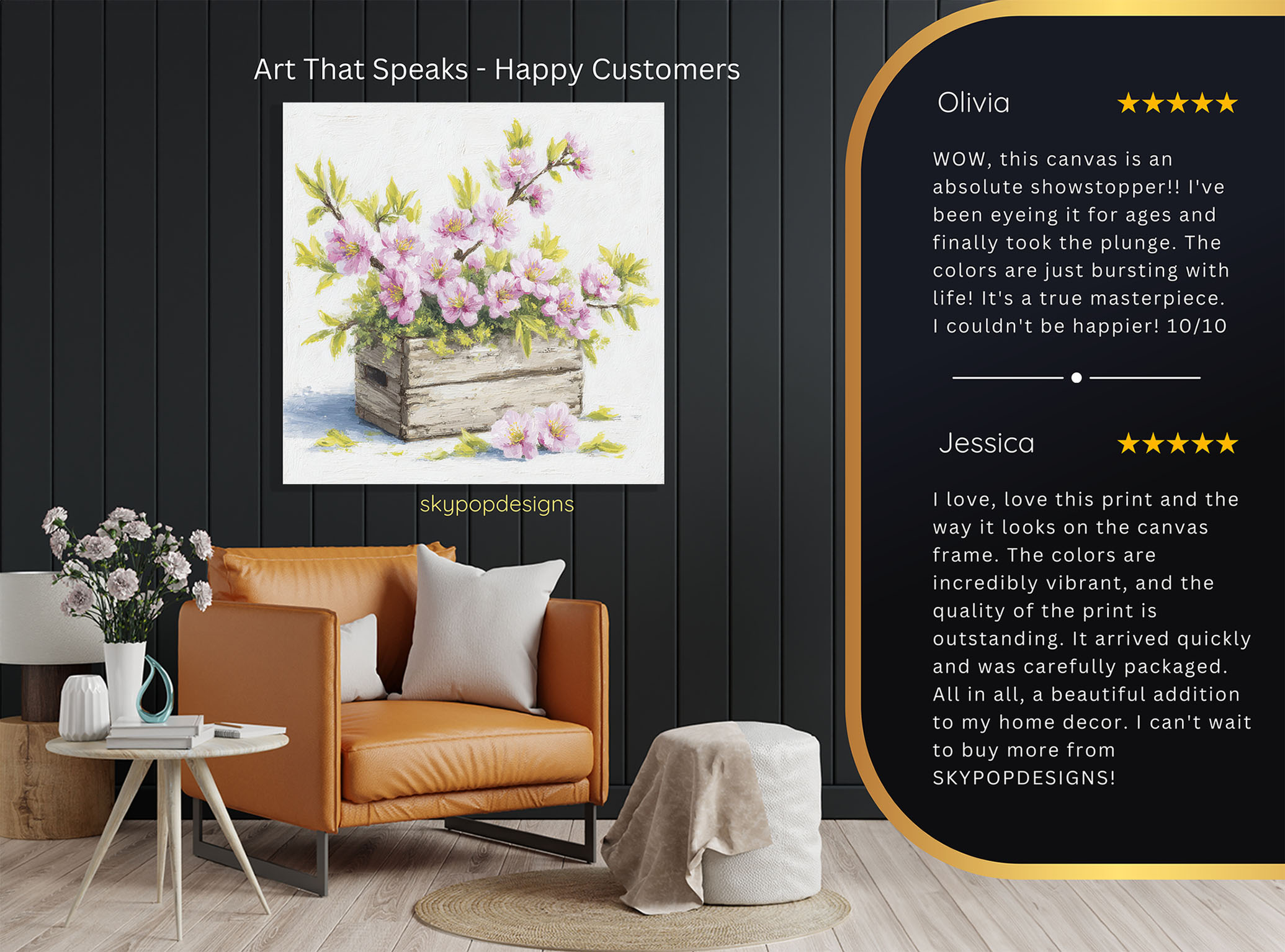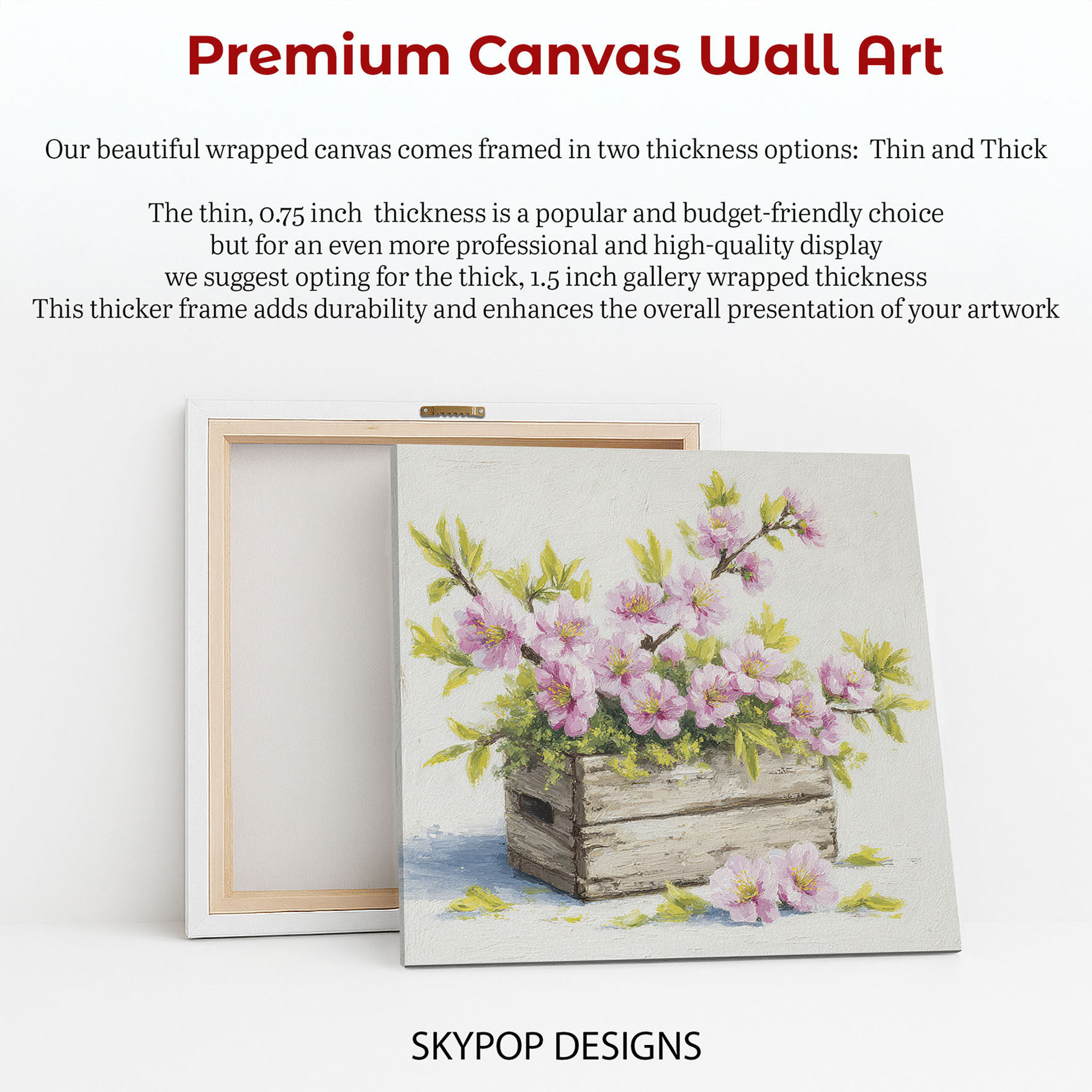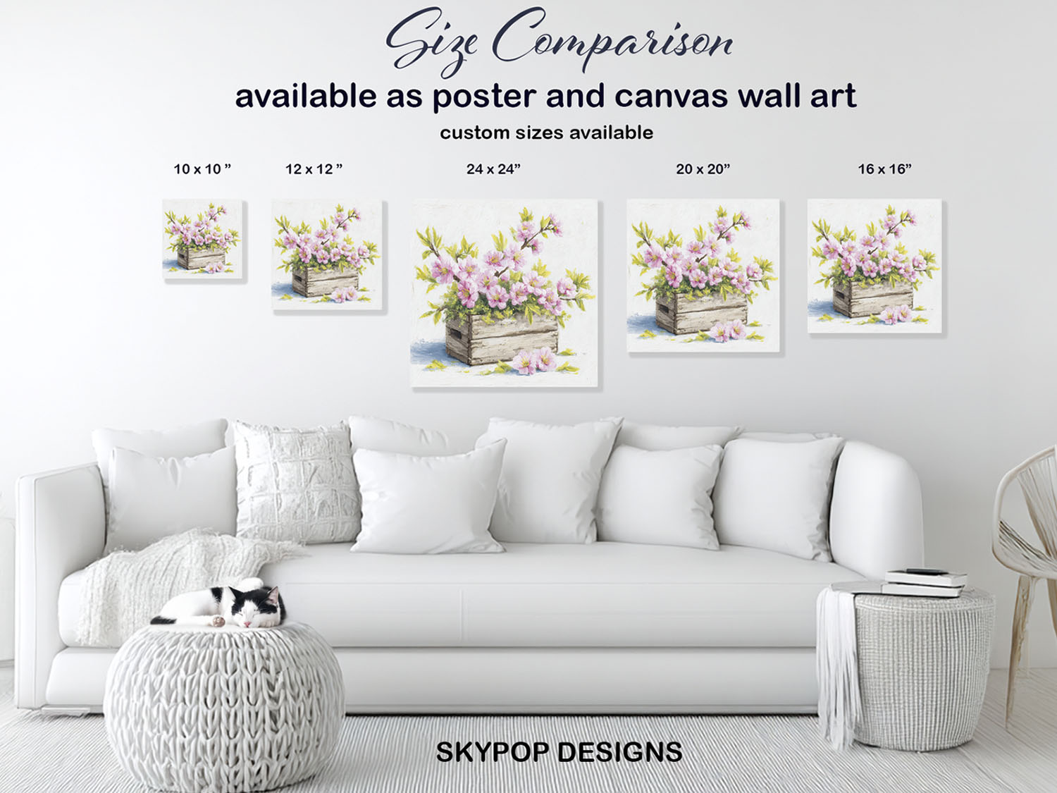 Bring the beauty of spring into your home with this exquisite Cherry Blossom canvas wall art, showcasing vibrant pink blossoms in a rustic wooden crate. This poster or canvas wall art is perfect for enhancing farmhouse or country decor, adding a touch of natural elegance to your living room or dining room. The delicate pink flowers, combined with lush green foliage and a distressed wooden crate, create a charming and timeless piece. Ideal for shabby chic and rustic interiors, this floral artwork brings a serene garden feel to any space. The artwork’s inviting palette and textured brushstrokes make this canvas wall art a captivating centerpiece, perfect for creating a focal point in a bedroom or a welcoming atmosphere in an entryway. High-quality printing ensures the vibrant colors and fine details of the cherry blossoms and crate are beautifully preserved. This versatile floral art poster is an excellent gift for housewarmings, birthdays, or any occasion, bringing enduring beauty to a loved one’s home. Elevate your decor with this stunning canvas wall art that embodies the fresh, cheerful essence of spring. Transform your walls and create a peaceful ambiance with this gorgeous Cherry Blossom Crate Art today.