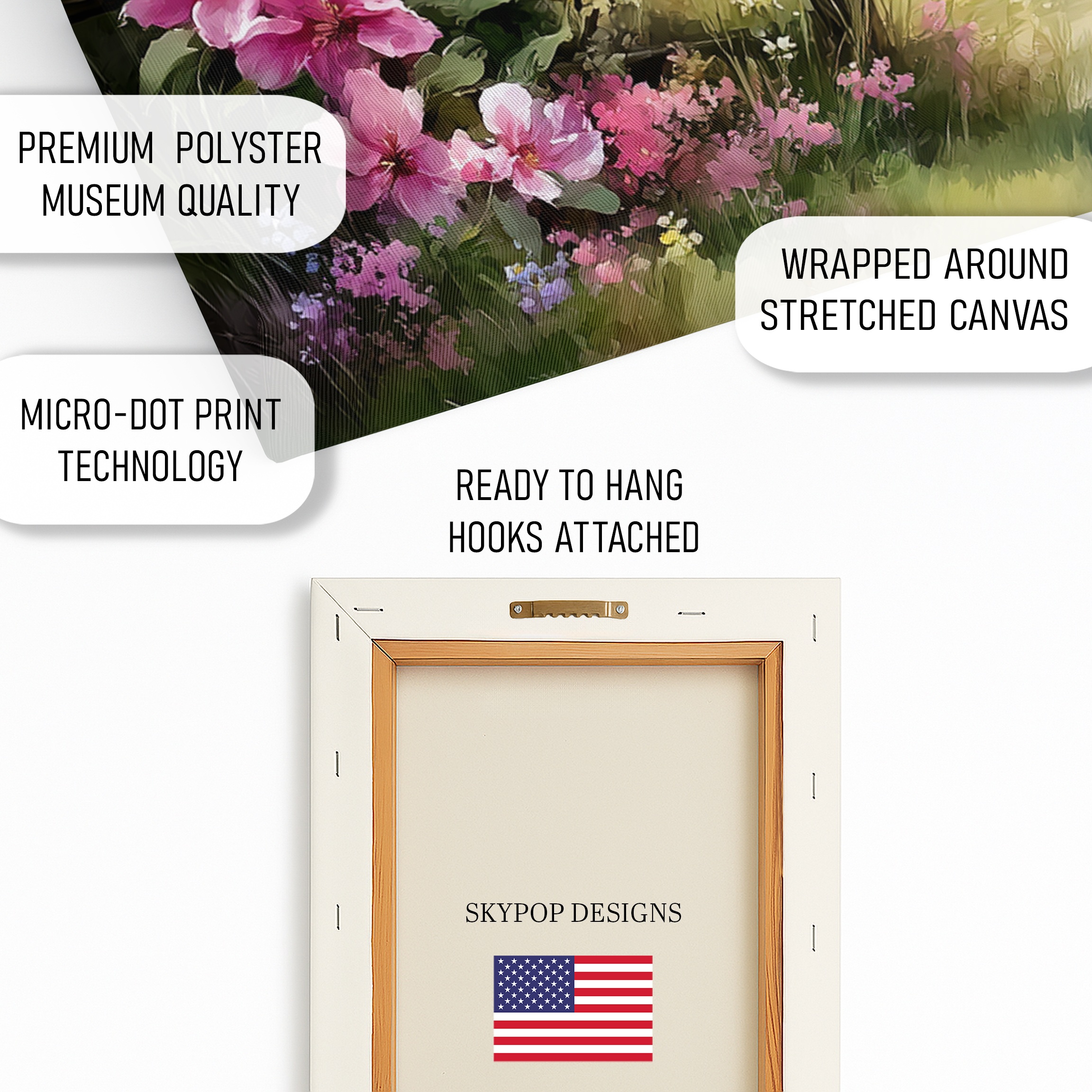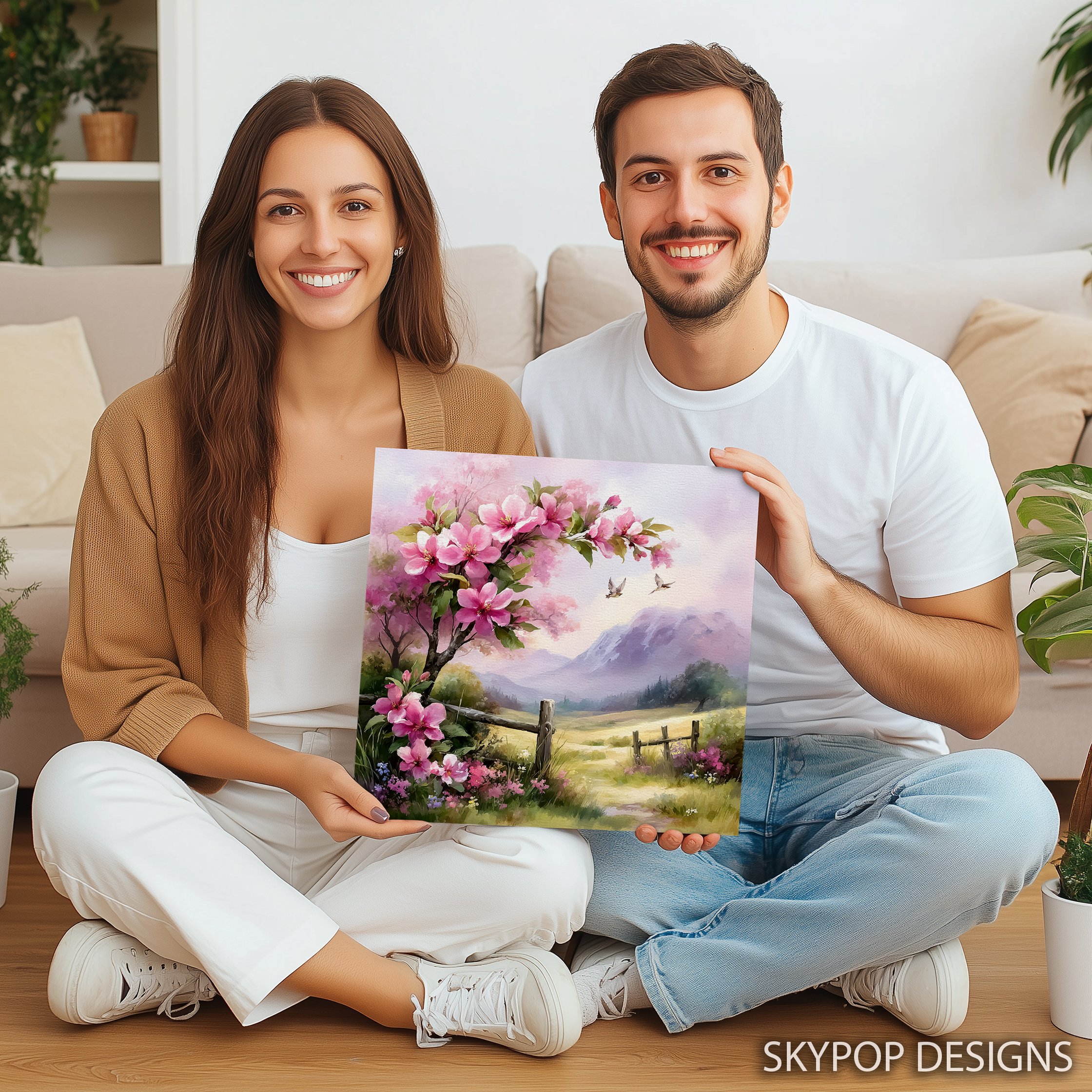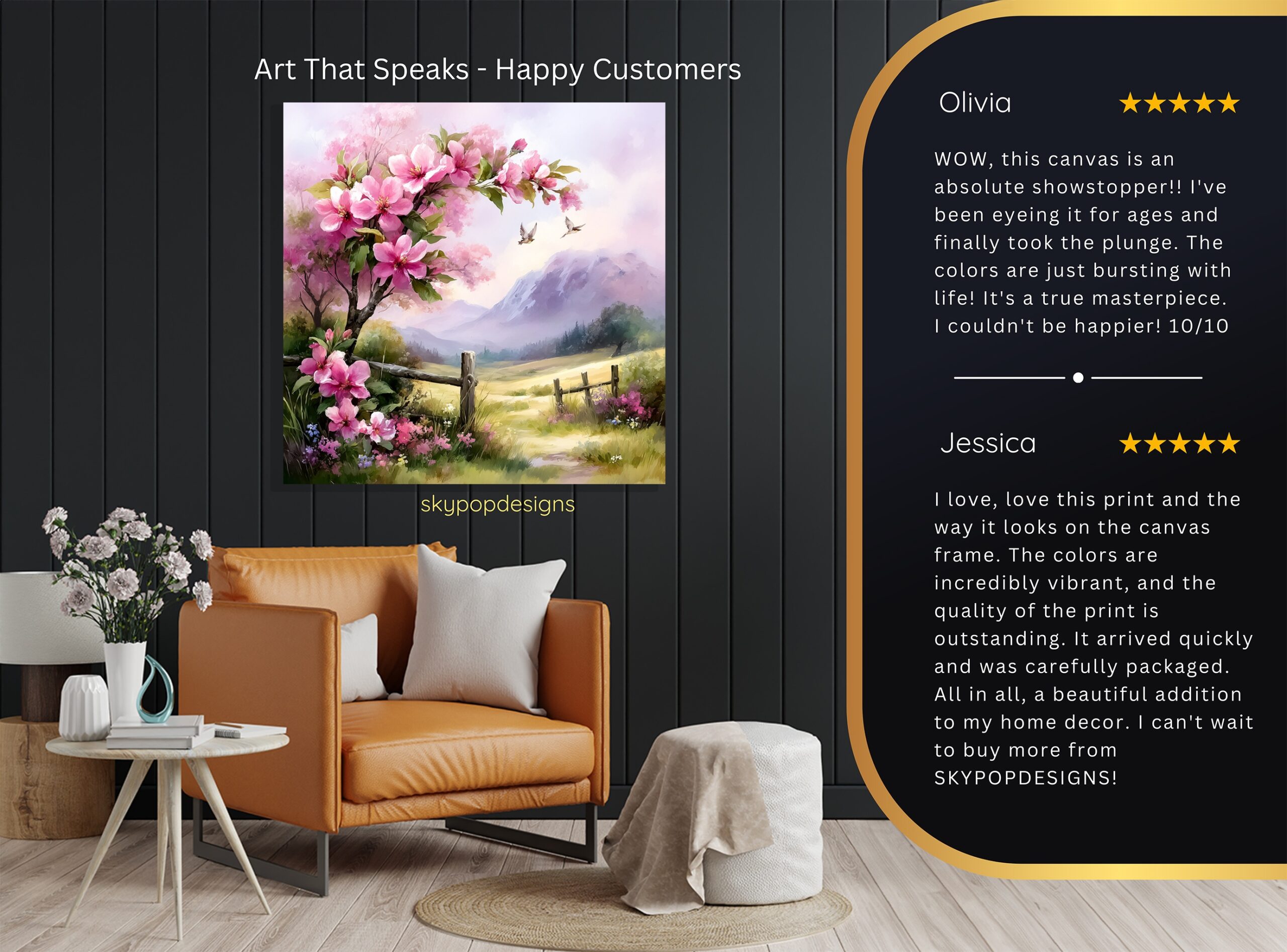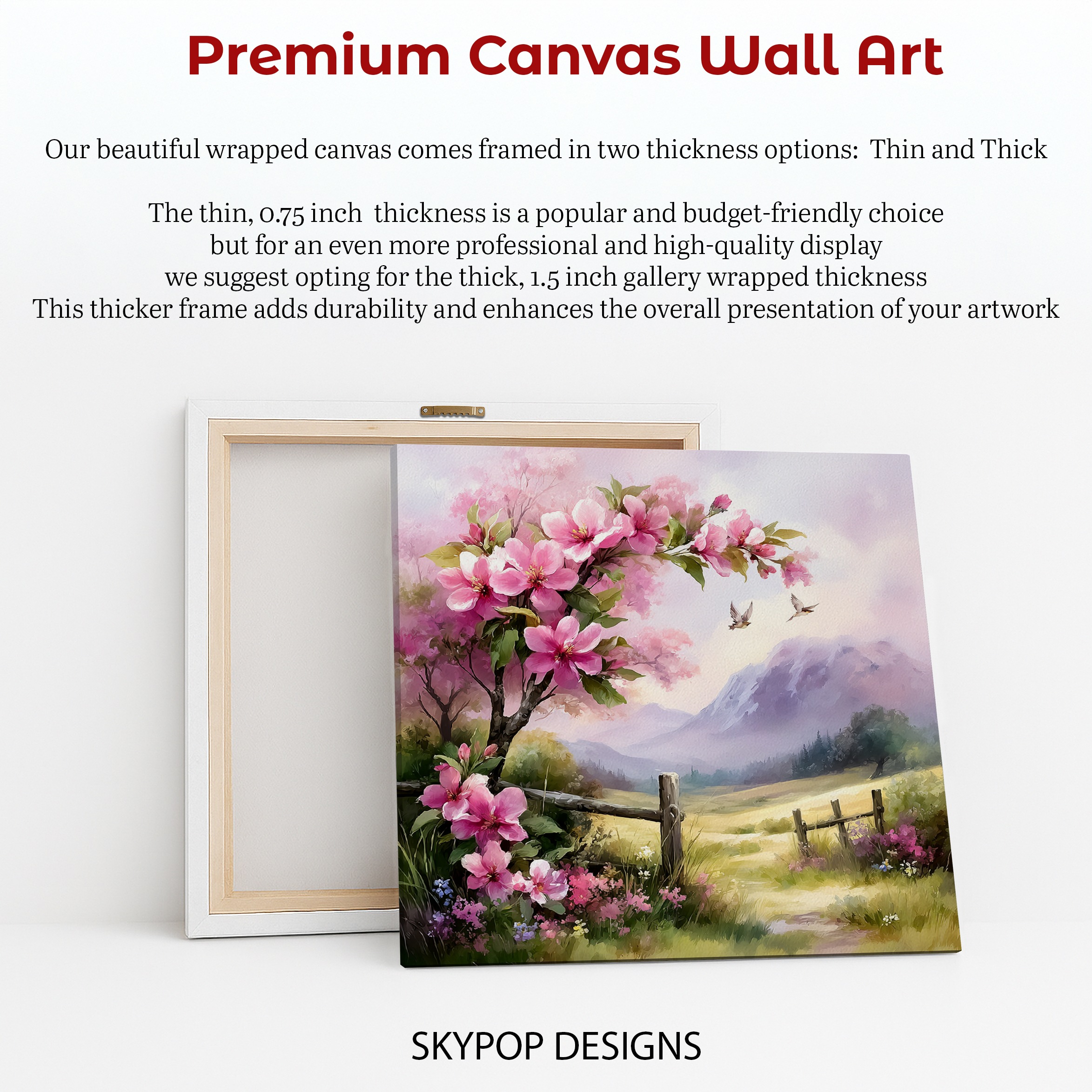 Transform your space with this breathtaking cherry blossom canvas wall art, capturing the essence of spring in a stunning landscape. This vibrant poster brings the beauty of nature indoors, featuring a majestic cherry blossom tree in full bloom against a backdrop of misty mountains. Perfect for creating a serene focal point in your living room or bedroom, this canvas wall art combines delicate pink blossoms with lush green foliage and distant purple mountains. The rustic wooden fence in the foreground adds a touch of countryside charm, making it ideal for farmhouse or country decor styles. Two birds soaring through the sky enhance the sense of freedom and tranquility. This versatile piece works beautifully as dining room wall decor or to brighten up a sunroom. The soft color palette of pinks, greens, and purples promotes a calm and uplifting atmosphere, perfect for relaxation spaces. Whether you’re looking for large statement art or a smaller accent piece, this cherry blossom poster adapts to various sizes without losing its impact. Elevate your home’s ambiance with this celebration of nature’s beauty, bringing the outdoors inside. Add a touch of springtime magic to your walls and transform your living space today with this enchanting cherry blossom mountain artwork.