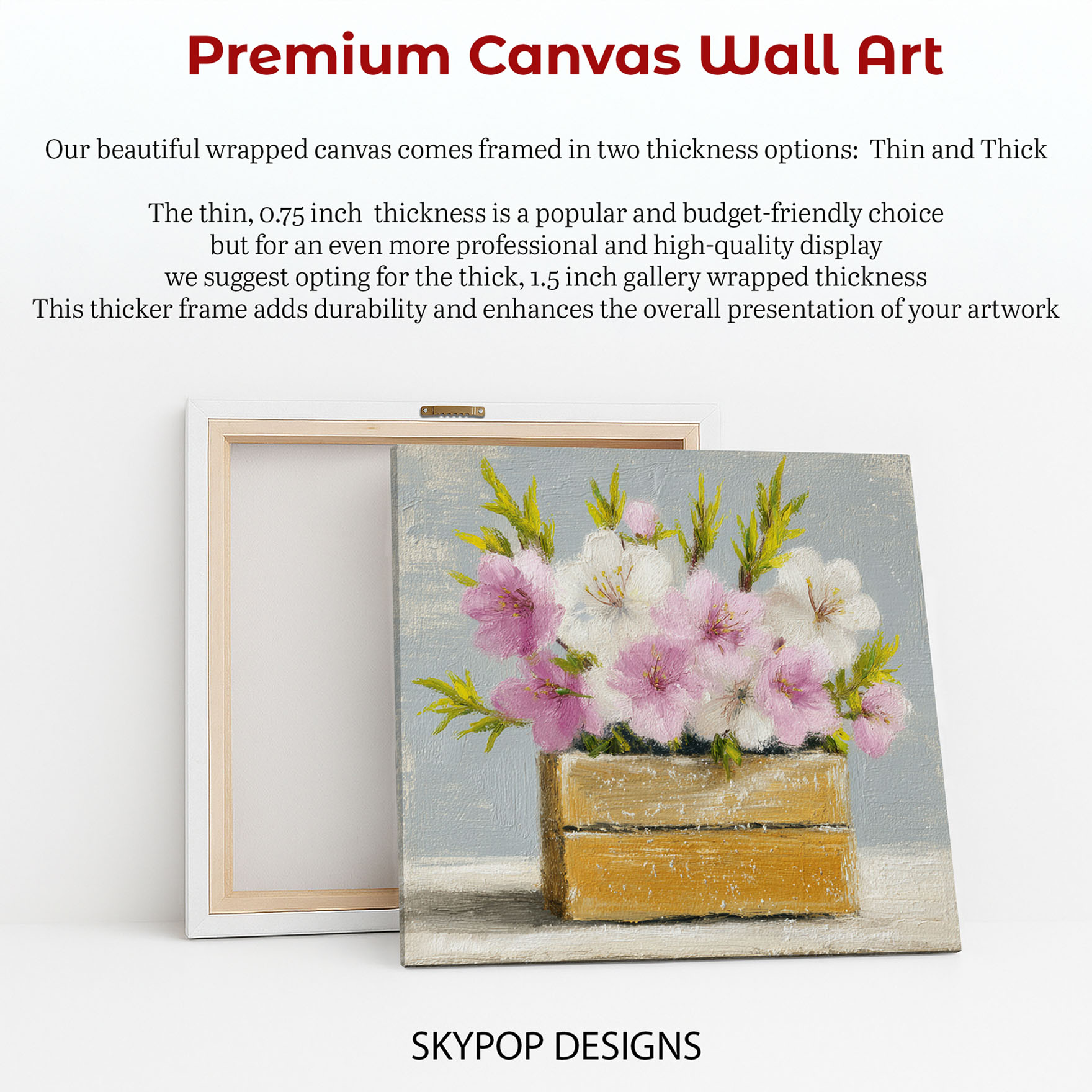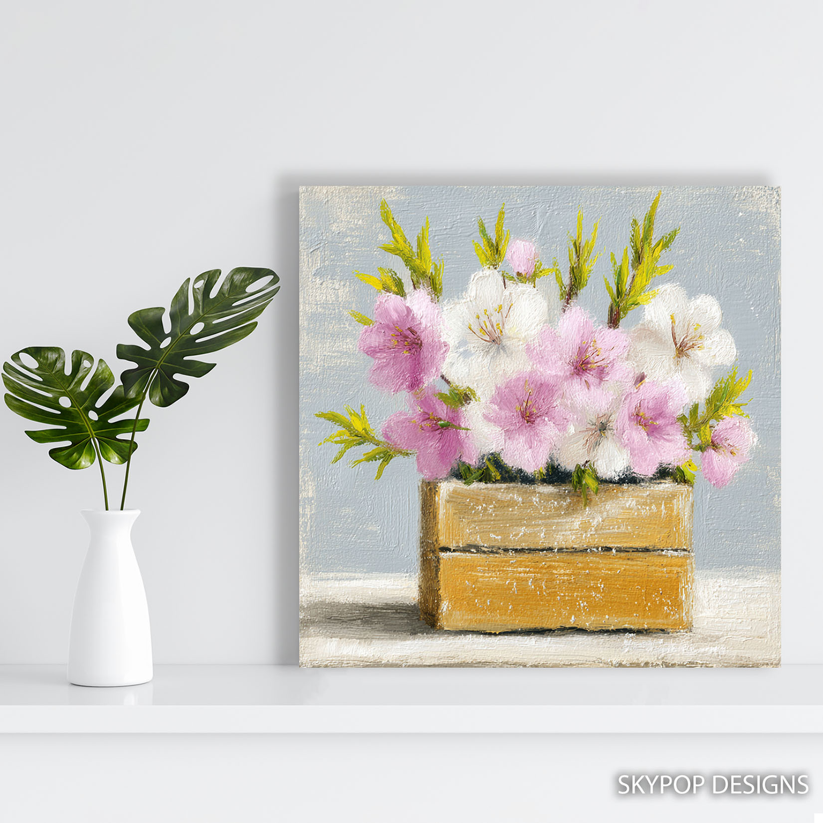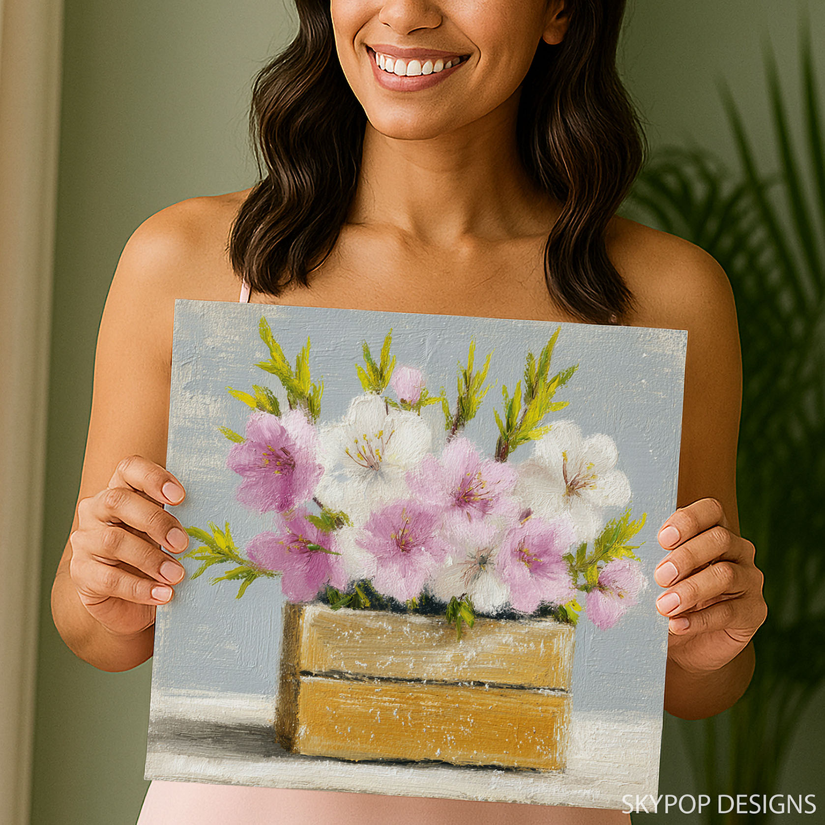 Transform your space with this delightful Cherry Blossom Crate canvas wall art, capturing the soft beauty of blooming flowers in an impressionistic style. This poster or canvas wall art is perfect for creating a fresh and inviting atmosphere in your living room decor, adding a touch of nature to your bedroom, or enhancing your dining room ambiance. The delicate pink and white blossoms, accented by vibrant green leaves, bring a sense of renewal and tranquility. Its rustic wooden crate adds a charming farmhouse or shabby chic touch, making it ideal for bohemian interiors as well. The impressionist brushstrokes lend a soft, dreamy quality to this floral artwork, creating a captivating visual that will be a focal point in any room. High-quality printing ensures the texture and depth of the paint are beautifully preserved on this canvas wall art. This striking piece is perfect for an entryway, welcoming guests with its natural beauty and serene color palette. Celebrate the changing seasons or gift a piece of lasting springtime joy with this versatile wall art, suitable for housewarmings, birthdays, or holidays. The blend of soft pastels and earthy wood tones makes this cherry blossom artwork easy to integrate into a variety of decor styles. Elevate your home with this stunning piece of floral wall art that embodies the simple elegance of nature. Add a touch of Spring to your home today with Cherry Blossom Crate Art.