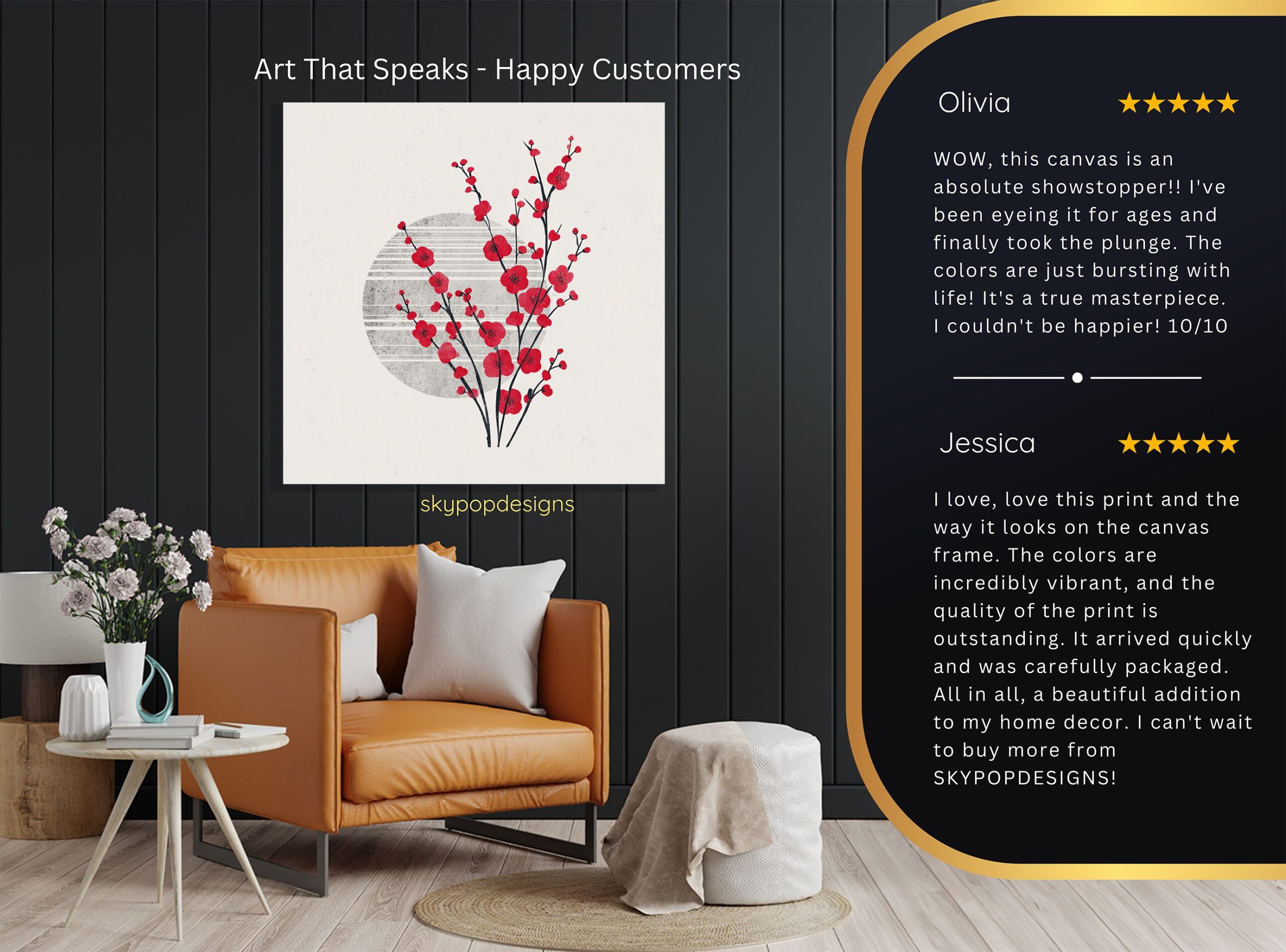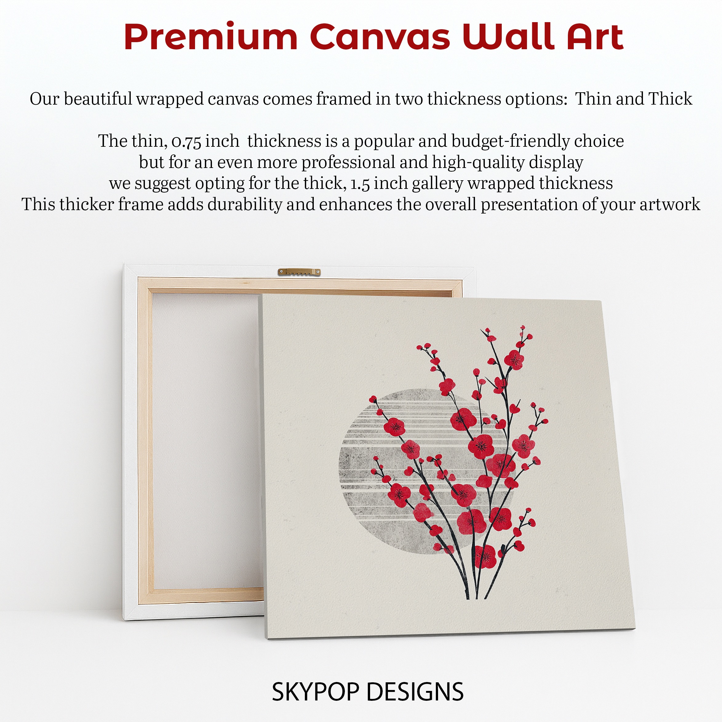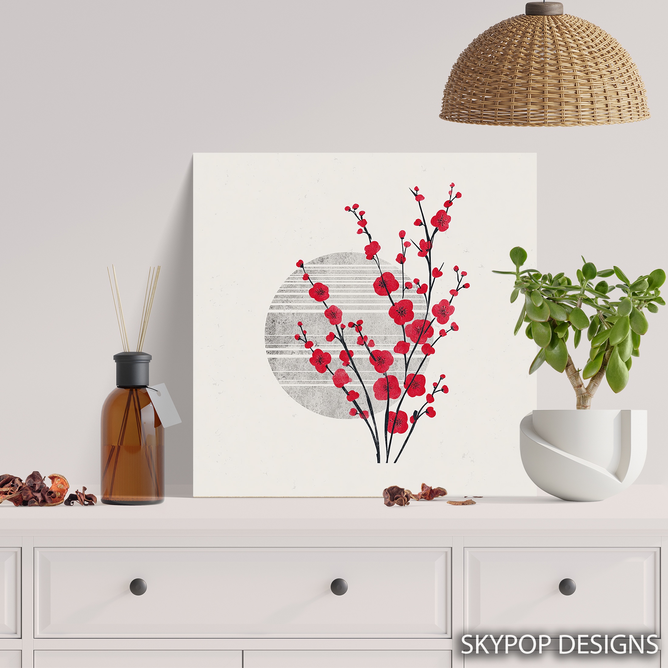 Transform your space with this striking cherry blossom canvas wall art, featuring delicate red blooms against a minimalist grey moon backdrop. This contemporary poster seamlessly blends Asian-inspired elements with modern design, creating a captivating focal point for any room. The vibrant red cherry blossoms pop against the subtle grey tones, infusing your space with energy and serenity. Perfect for enhancing living rooms, bedrooms, offices, or dining areas, this versatile wall art adapts to various decor styles. The minimalist composition evokes a sense of calm and balance, ideal for creating a zen-like atmosphere in your home or workspace. This canvas art serves as an excellent conversation starter and makes a thoughtful housewarming or holiday gift. The high-quality printing captures every intricate detail of the blossoms and the moon’s textured surface. Whether you’re looking to add a touch of nature to your urban space or create a peaceful retreat, this cherry blossom art delivers both style and tranquility. Available in various sizes, it’s easy to find the perfect fit for your wall. Elevate your interior design with this elegant blend of Eastern and Western aesthetics. Bring the beauty of cherry blossoms into your home and create a serene oasis with this stunning wall art today.