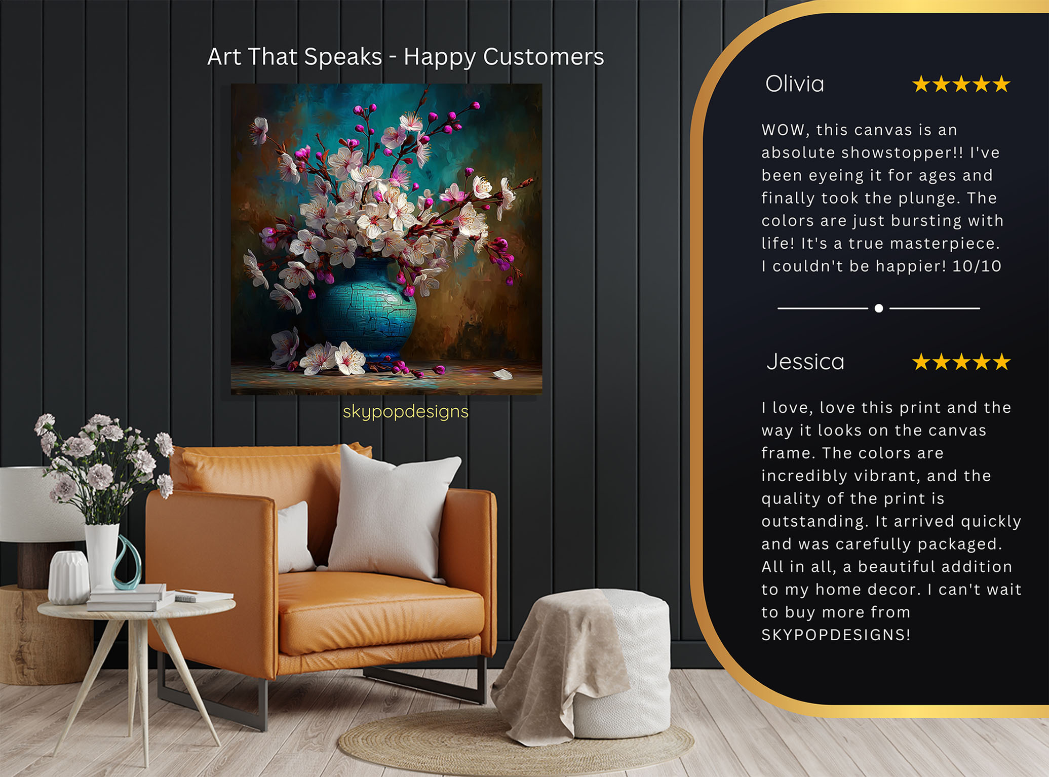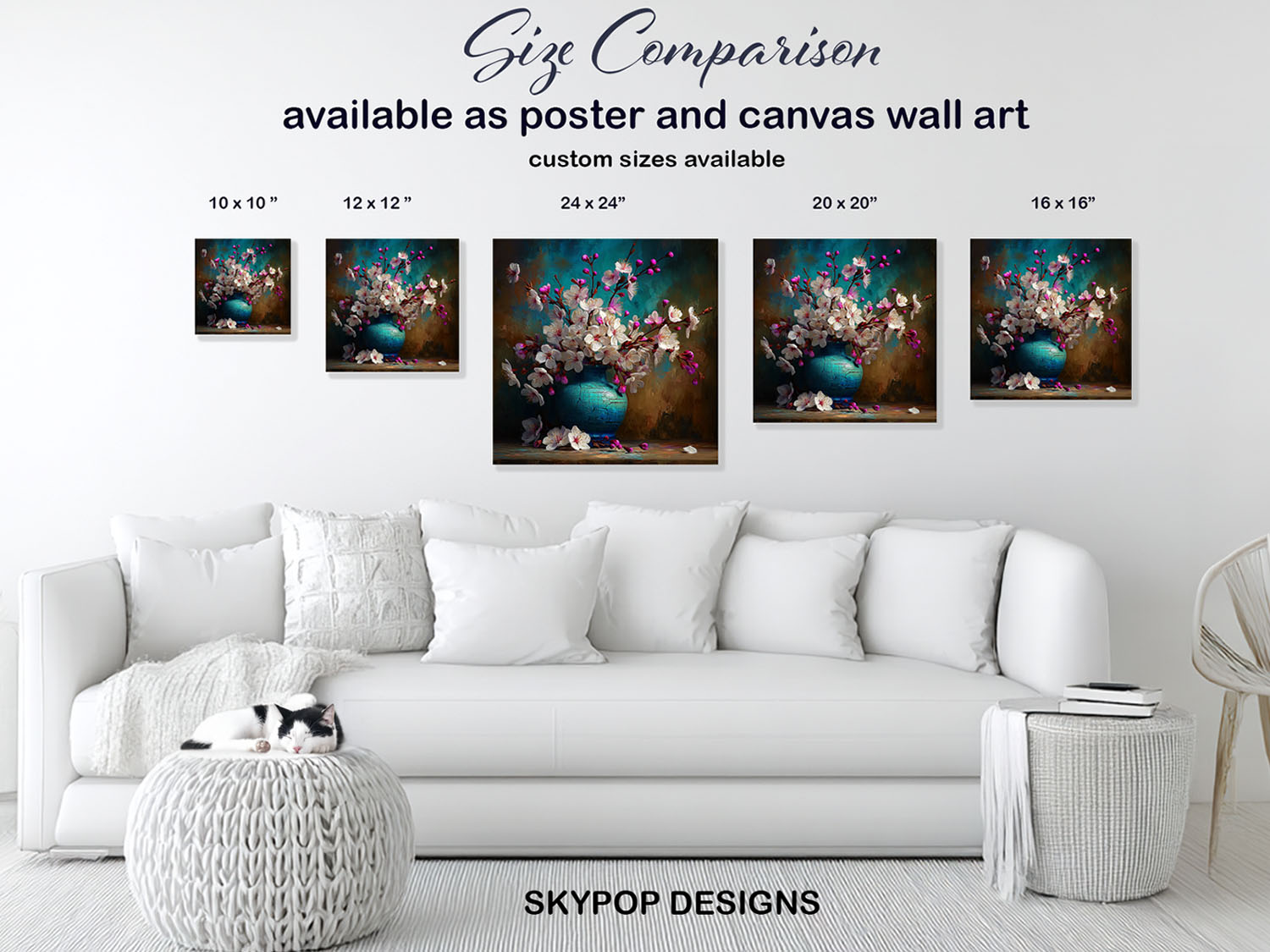 Elevate your home with this stunning Cherry Blossom canvas wall art, a vibrant still life that captures the ephemeral beauty of blooming branches. This poster or canvas wall art brings the tranquility of nature indoors, making it perfect for modern living room decor or a serene entryway. The striking teal vase pops against the rich brown and teal textured background, symbolizing tranquility and renewal. This floral artwork is ideal for creating an Asian Zen or contemporary aesthetic, bringing a refreshing and organic feel to any space. The delicate cherry blossoms, meticulously rendered, evoke feelings of peace and joy, transforming your room into a calming retreat. High-quality printing ensures the intricate details and rich colors of this canvas wall art are vividly displayed. It’s a perfect piece for dining rooms or sunrooms, adding a touch of natural elegance and sophisticated style. Gift this beautiful floral artwork for housewarmings, birthdays, or holidays to bring lasting beauty and serenity to someone’s home. The multicolor palette harmonizes with various interior designs, offering a versatile and captivating addition to your wall decor collection. Experience the calming influence of nature-inspired art and celebrate the freshness of spring all year round with this exquisite cherry blossom canvas. Transform your space today with this captivating piece of floral art.