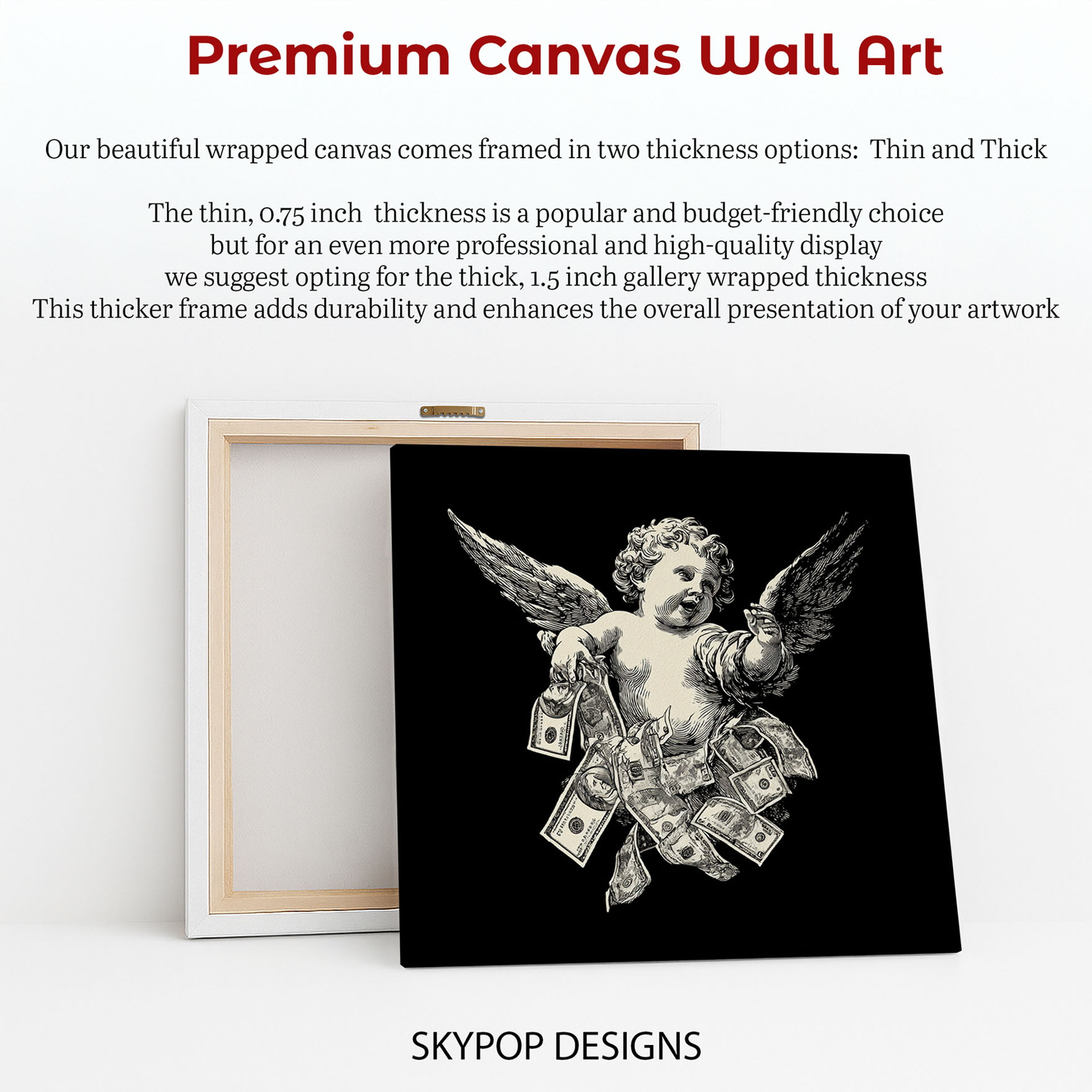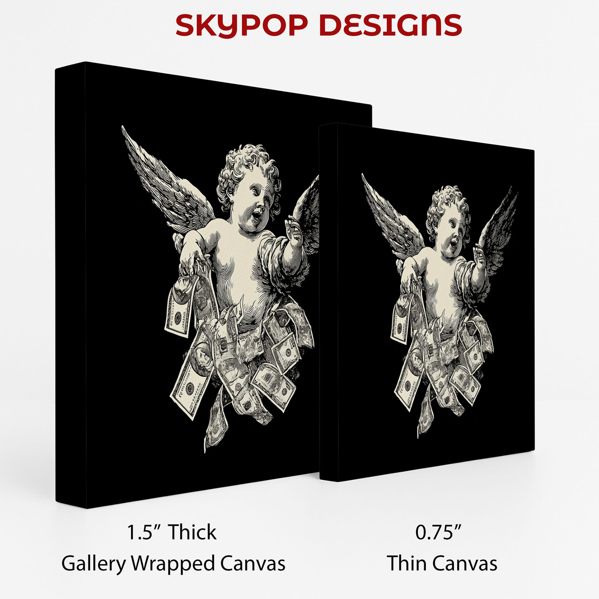 Transform your space with this striking Cherub Money Shower canvas wall art, a powerful statement piece that blends classic cherub imagery with modern financial themes. This unique poster or canvas wall art is perfect for adding a bold touch to contemporary office decor or creating an eye-catching focal point in a modern living room. The black and white color scheme, accented with hints of gold from the money, creates a dramatic and sophisticated look that complements any urban-themed interior. This artwork is ideal for game rooms or home theaters, sparking conversation and adding a touch of playful opulence. The detailed engraving style of the cherub contrasts with the contemporary abundance of cash, symbolizing ambition and success. High-quality printing ensures every detail, from the cherub’s wings to the intricate designs on the dollar bills, is vividly captured, making this canvas wall art a true masterpiece. This versatile poster or canvas wall art works wonderfully to enhance modern decor, bringing a touch of edgy elegance to your home. It makes a fantastic gift for entrepreneurs, art lovers, or anyone who appreciates bold and thought-provoking wall art. Elevate your space with this captivating blend of classical art and pop culture that celebrates prosperity and aspiration. Make this dynamic Cherub Money Shower artwork the centerpiece of your collection today.