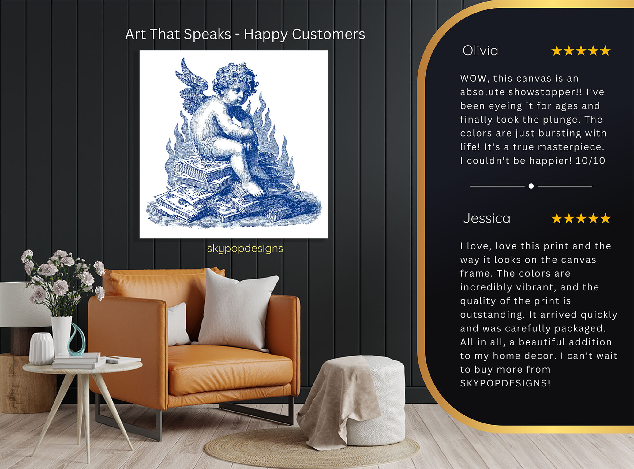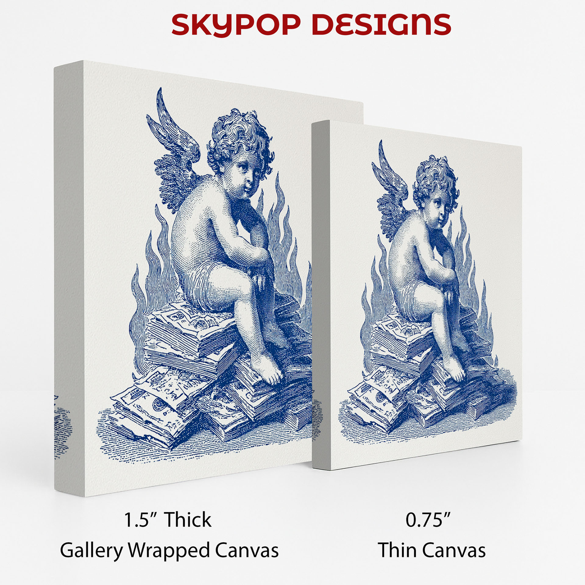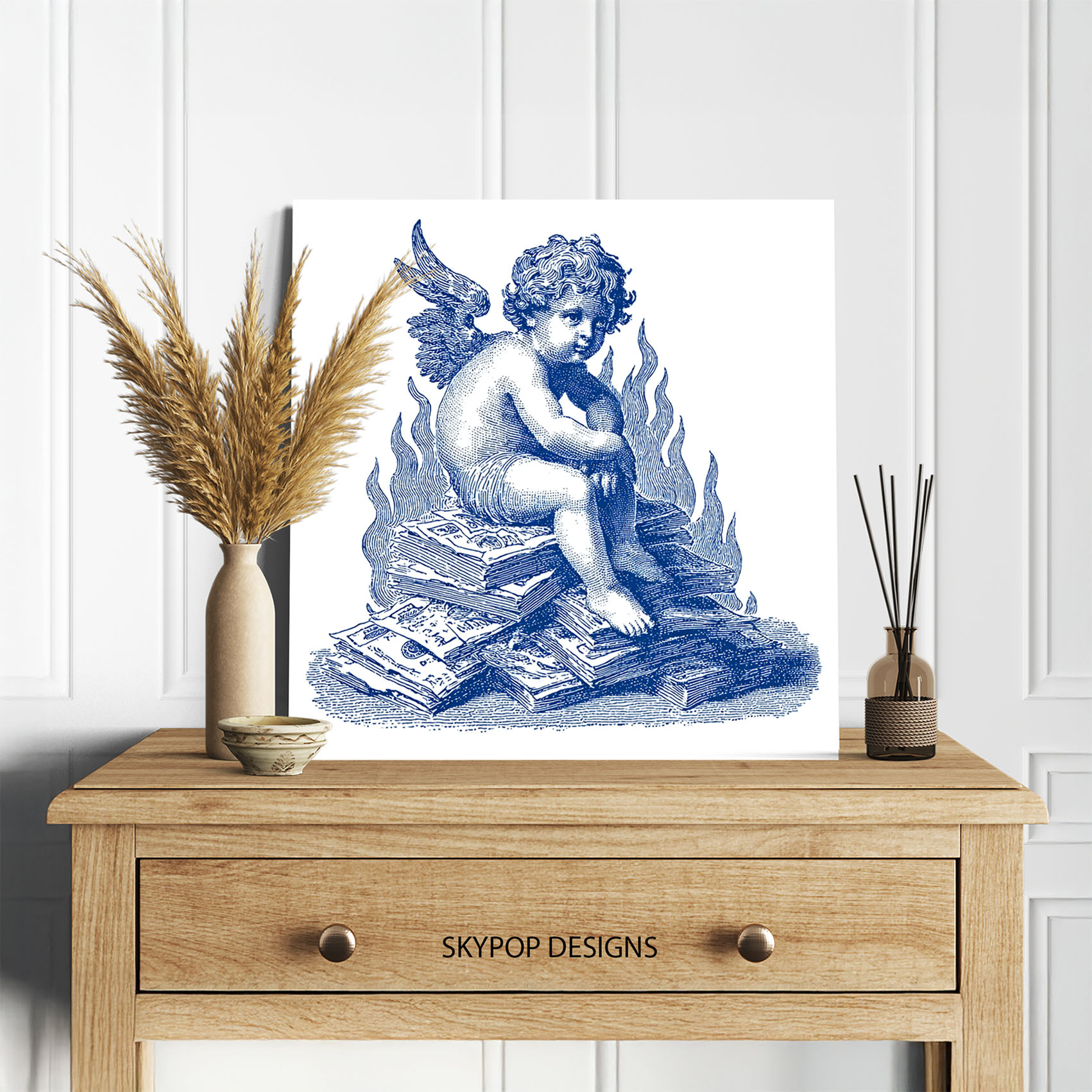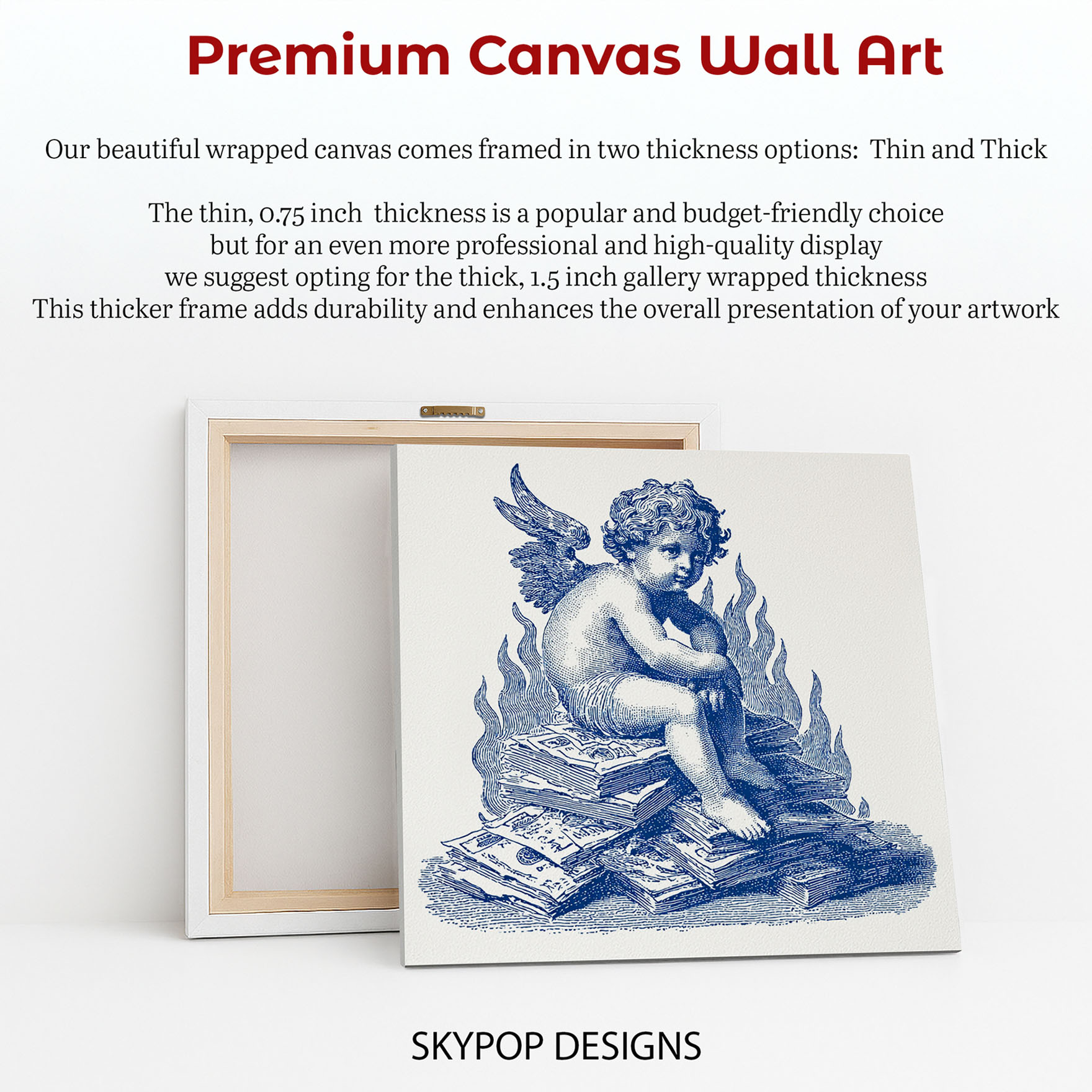 Transform your space with this striking cherub canvas wall art presenting a classical illustration of a winged child perched upon stacks of books, engulfed in stylized flames.