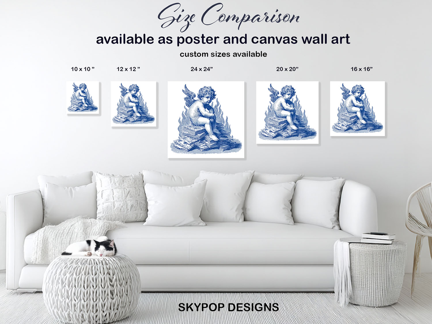 Cherub On Books With Flames Art, Canvas or Poster, Classic Victorian Gothic Decor, Living Room Library Office Dining Room Wall Art, Blue White and Black